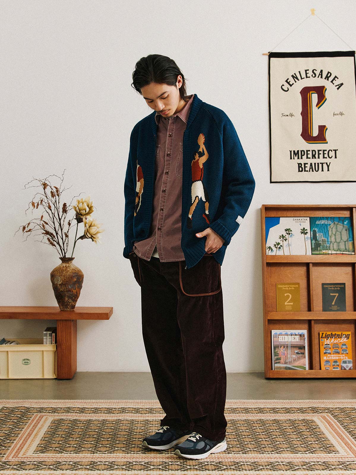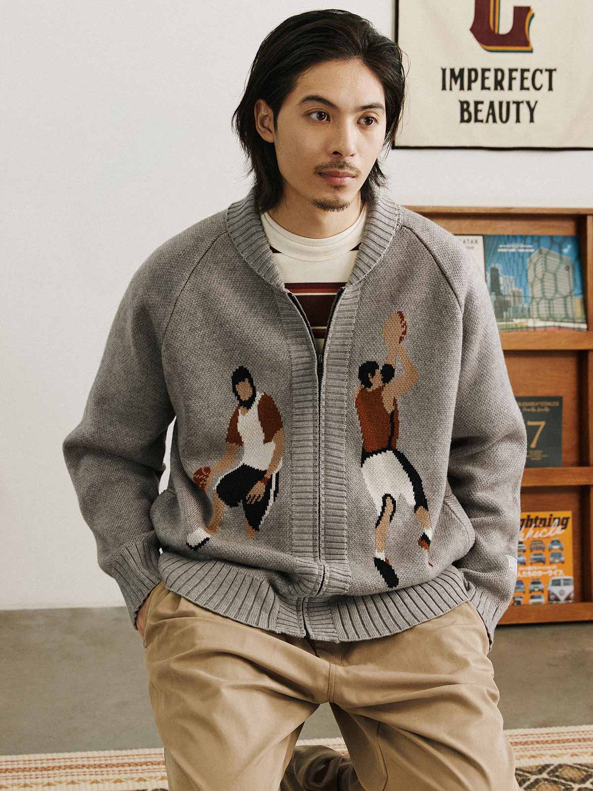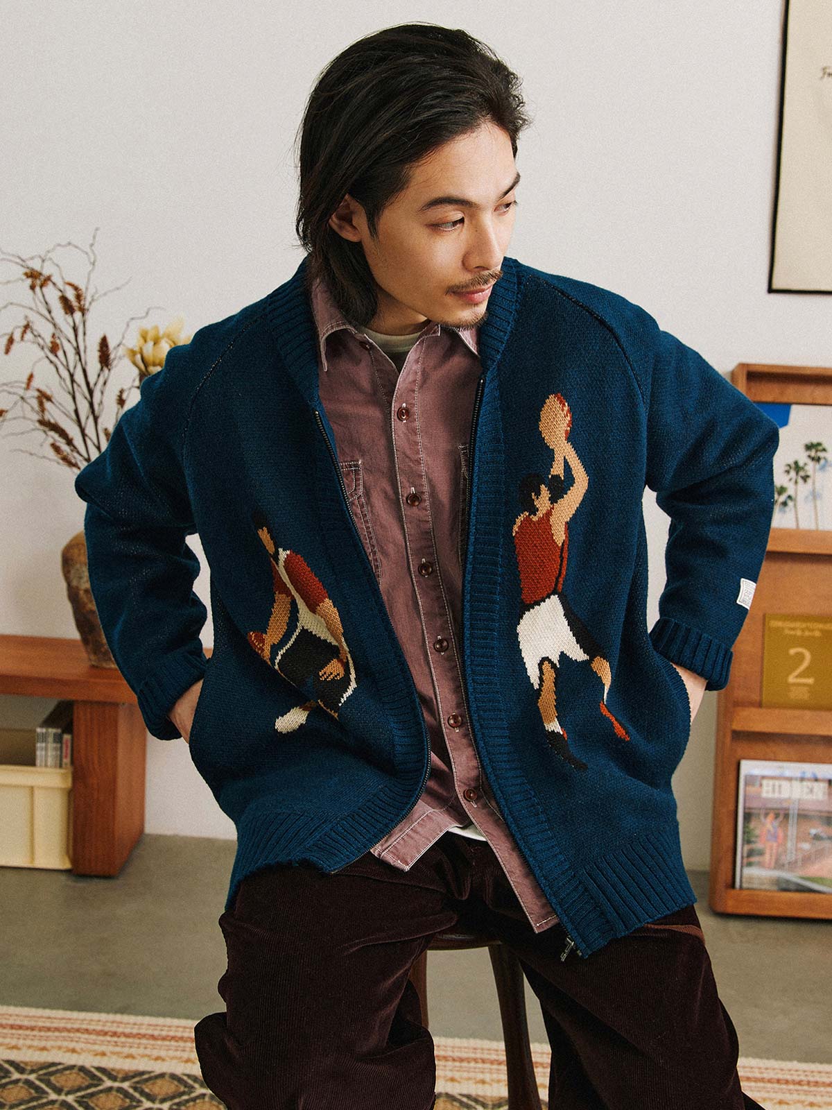 このセーターは、レトロなコーウィッチンスタイルと現代のバスケットボール要素を融合させ、独特のファッション体験を提供する。