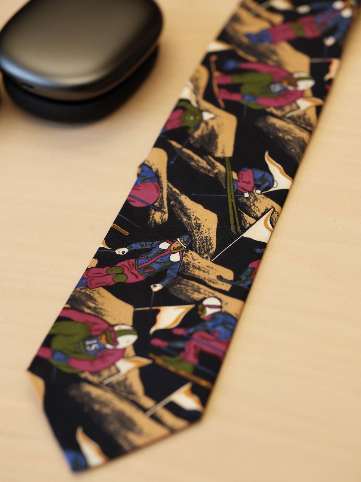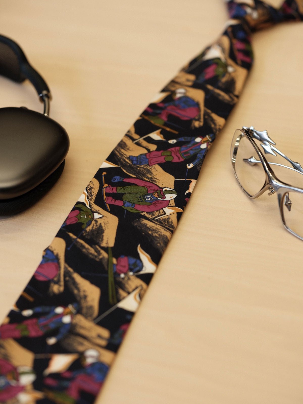 このシルクネクタイは、クロスカントリースキーのプリントが施され、60年代の紳士的なエレガンスを表現します。