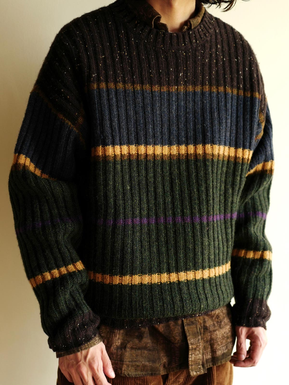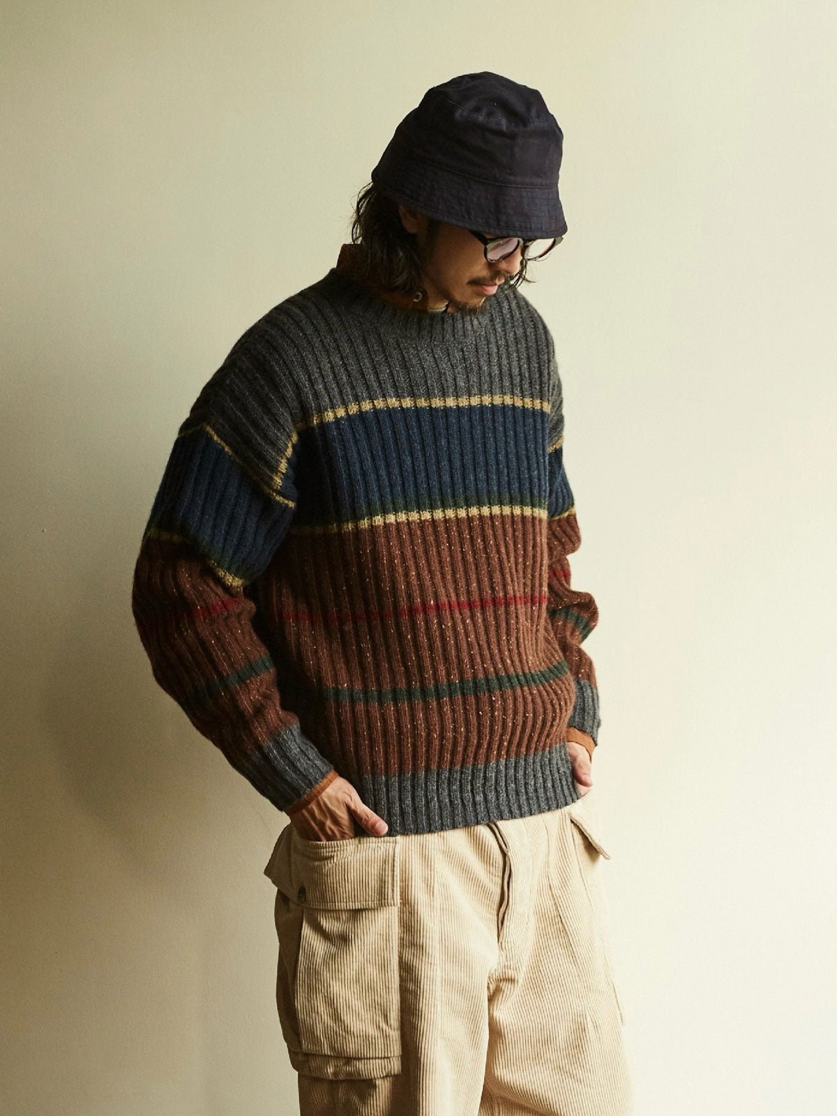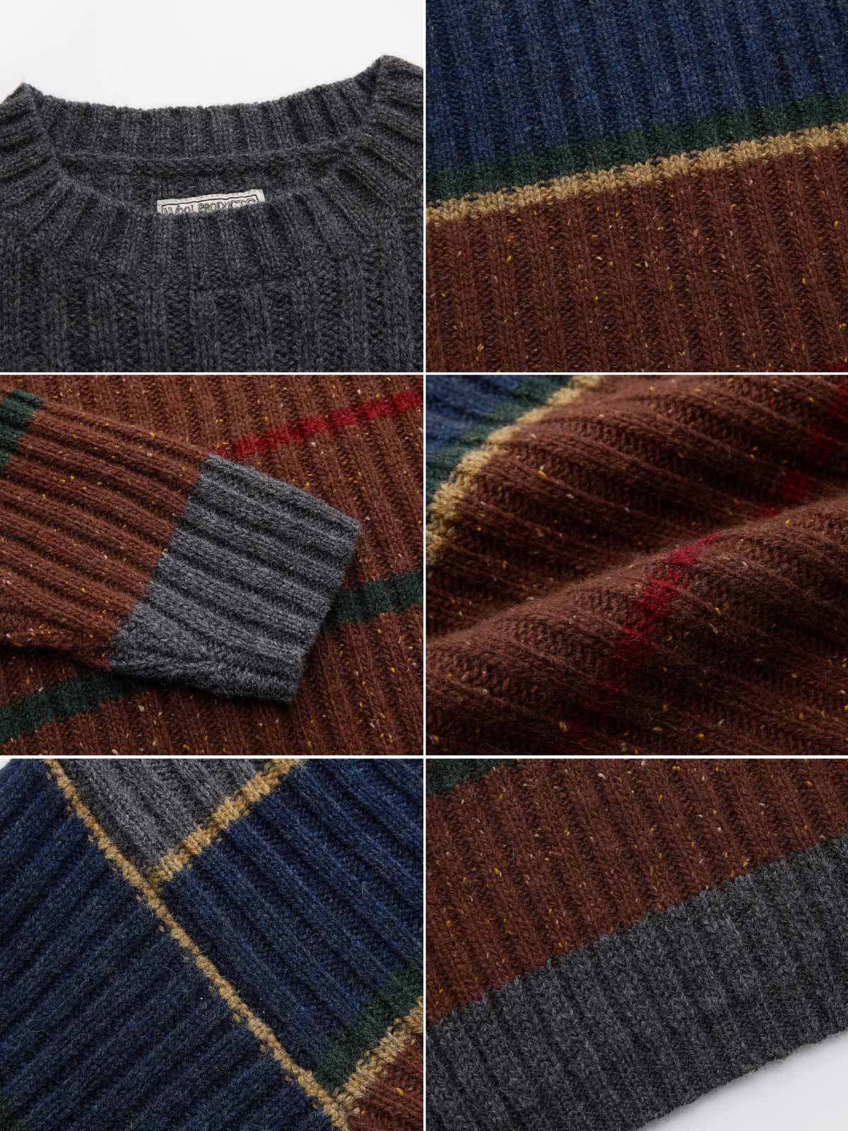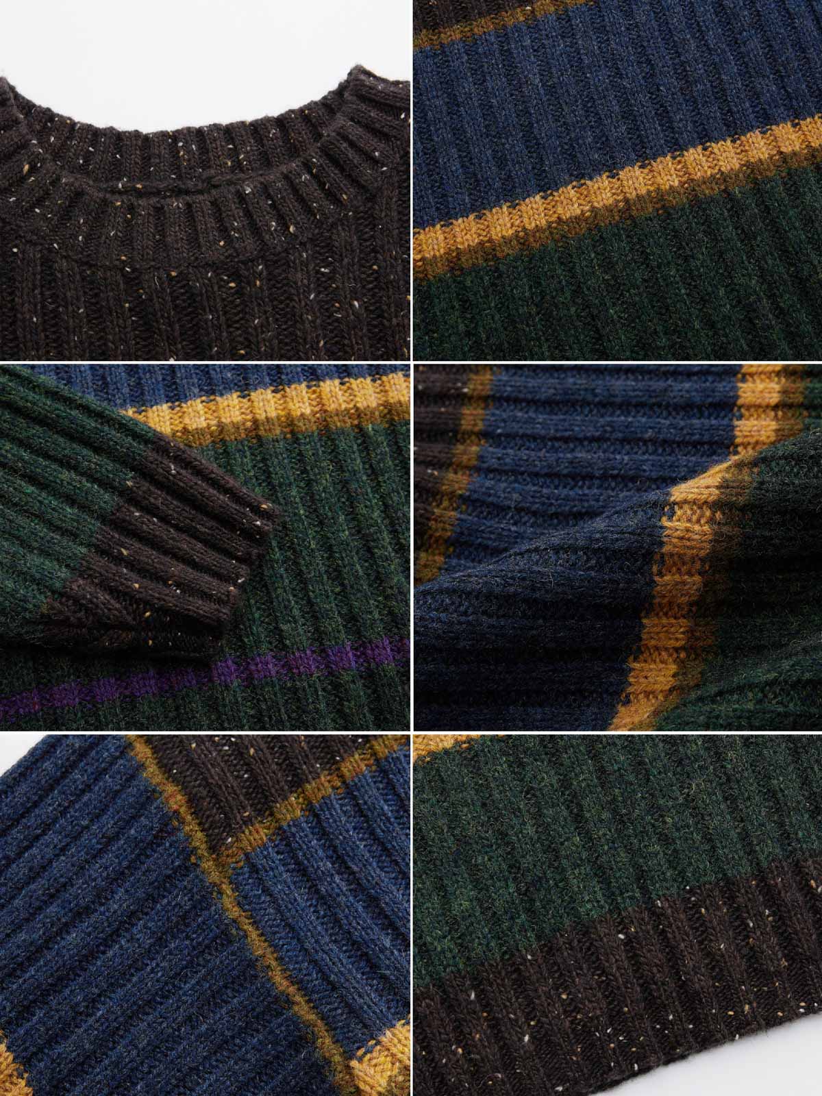 このセーターはシェットランドウールとラムウールのブレンド糸を使用しています。シェットランドウールは、そのふんわりとした柔らかさと優れた保温性で知られています。伝統的なストライプスタイルを維持しつつ、カラーブロッキングの技術を用いて現代的な感触を加えています。