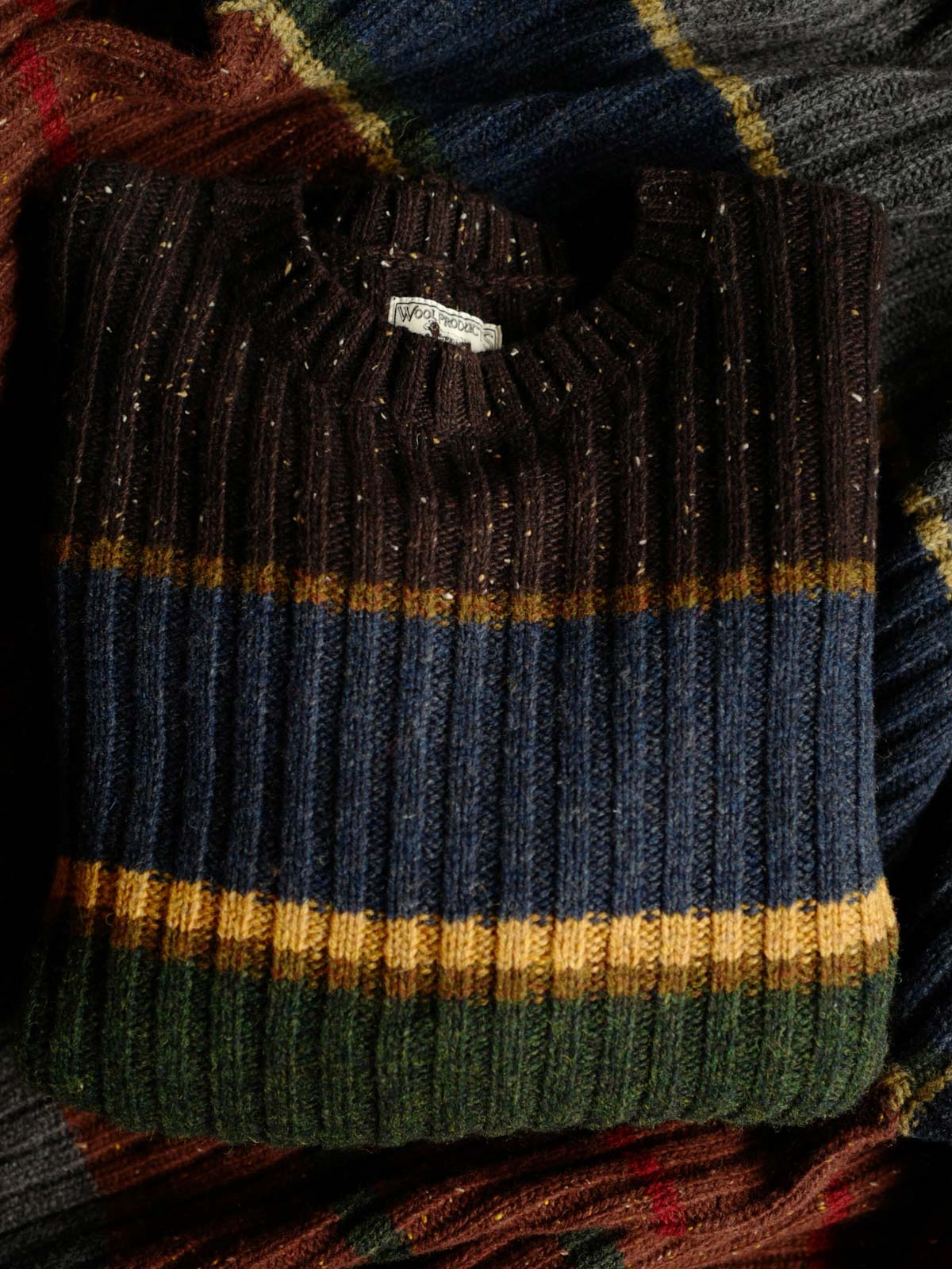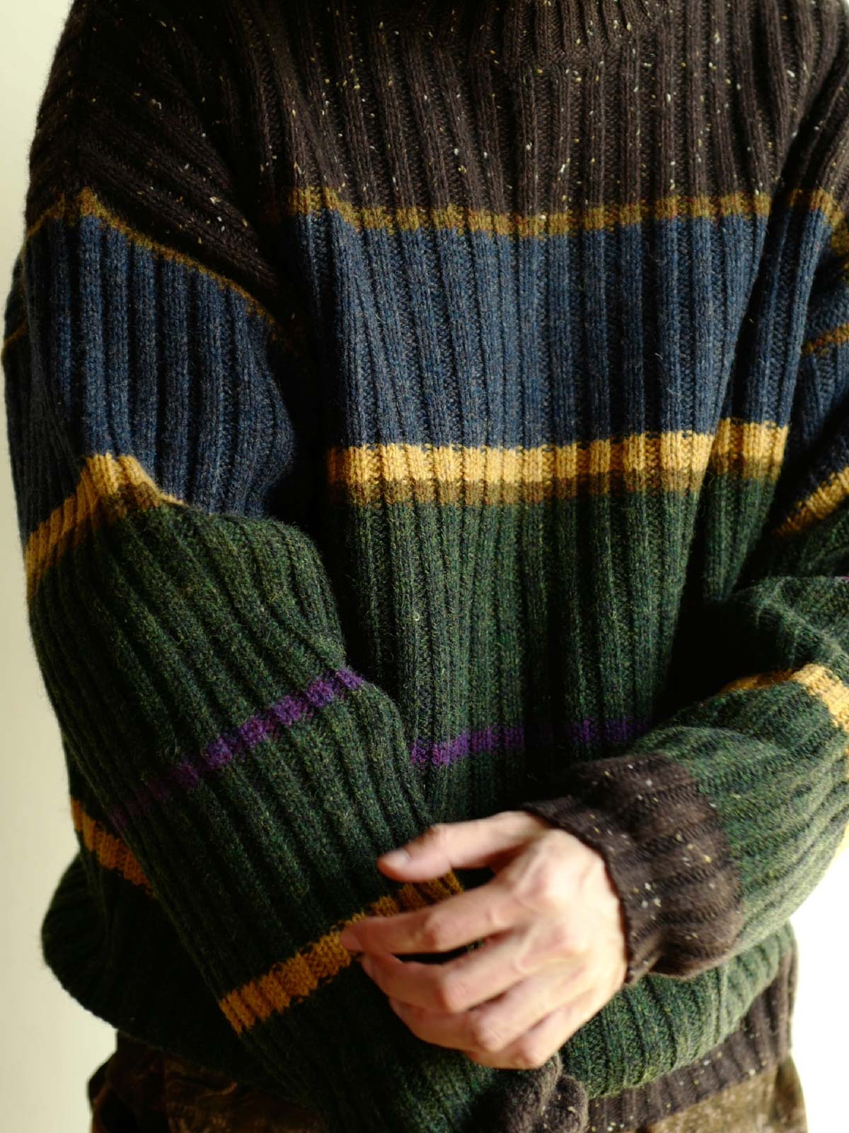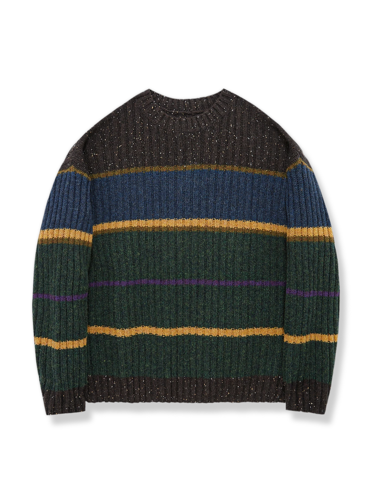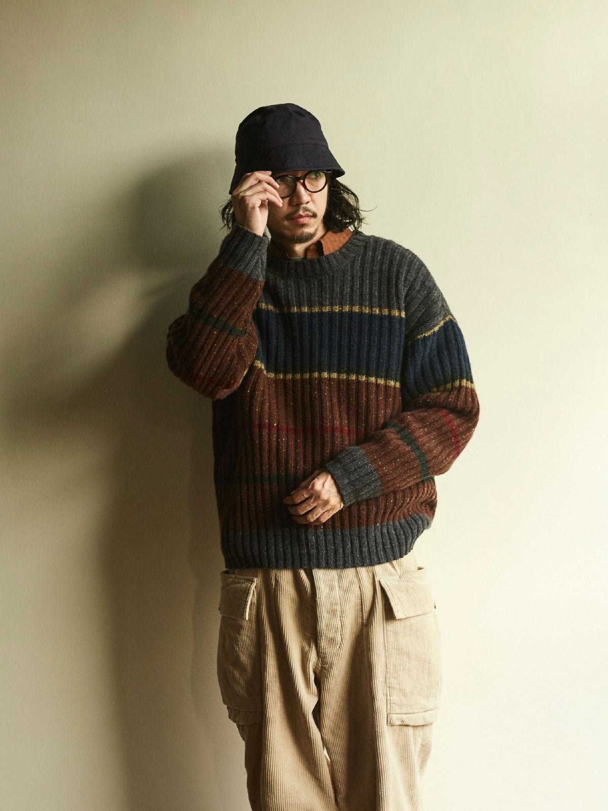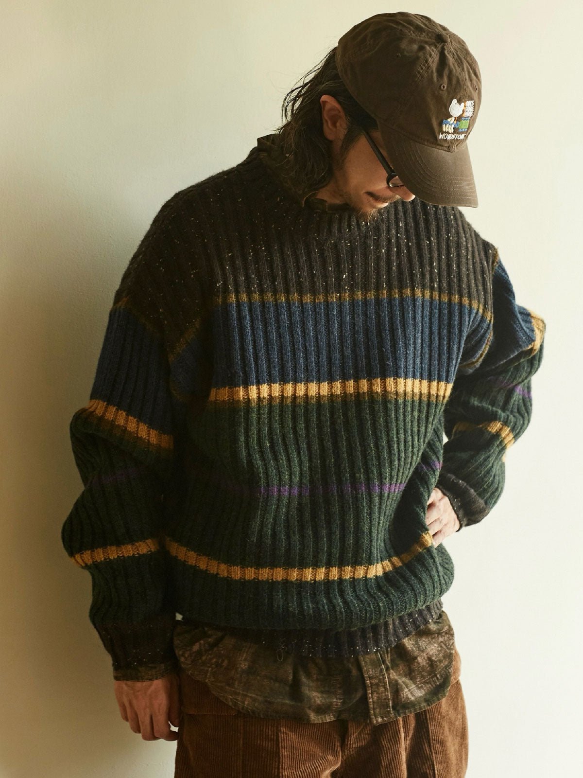 このセーターはシェットランドウールとラムウールのブレンド糸を使用しています。シェットランドウールは、そのふんわりとした柔らかさと優れた保温性で知られています。伝統的なストライプスタイルを維持しつつ、カラーブロッキングの技術を用いて現代的な感触を加えています。