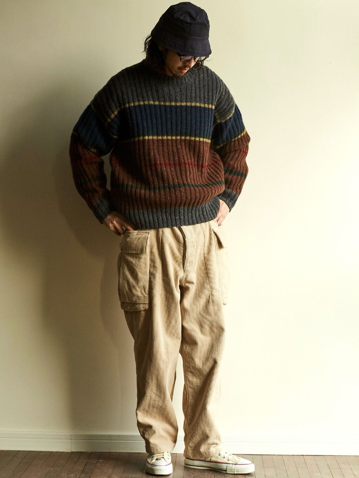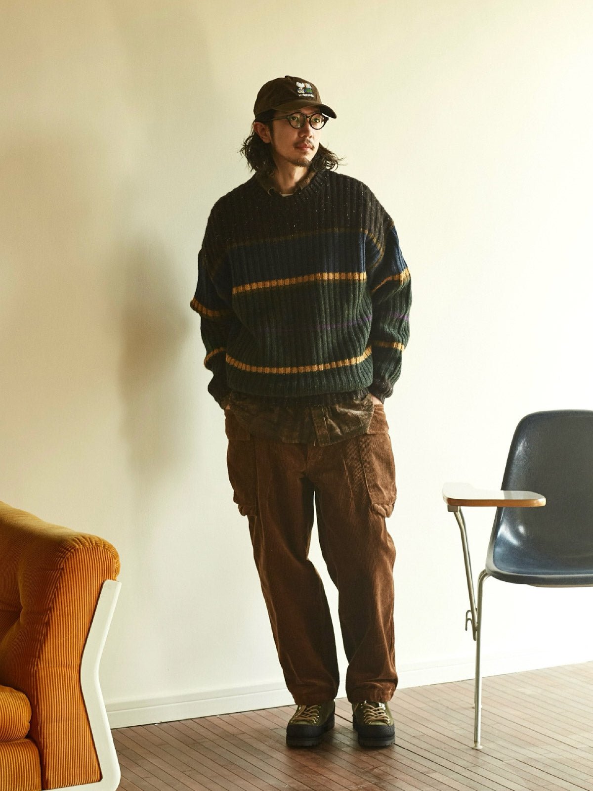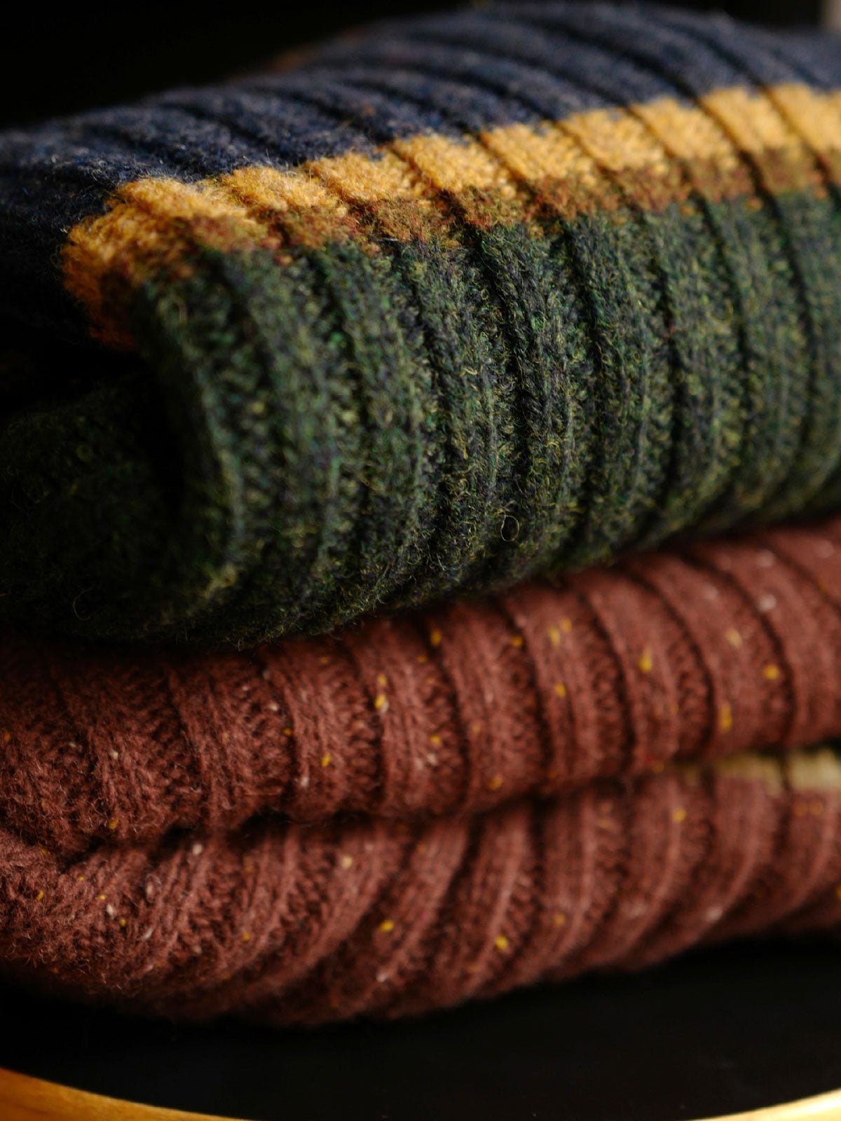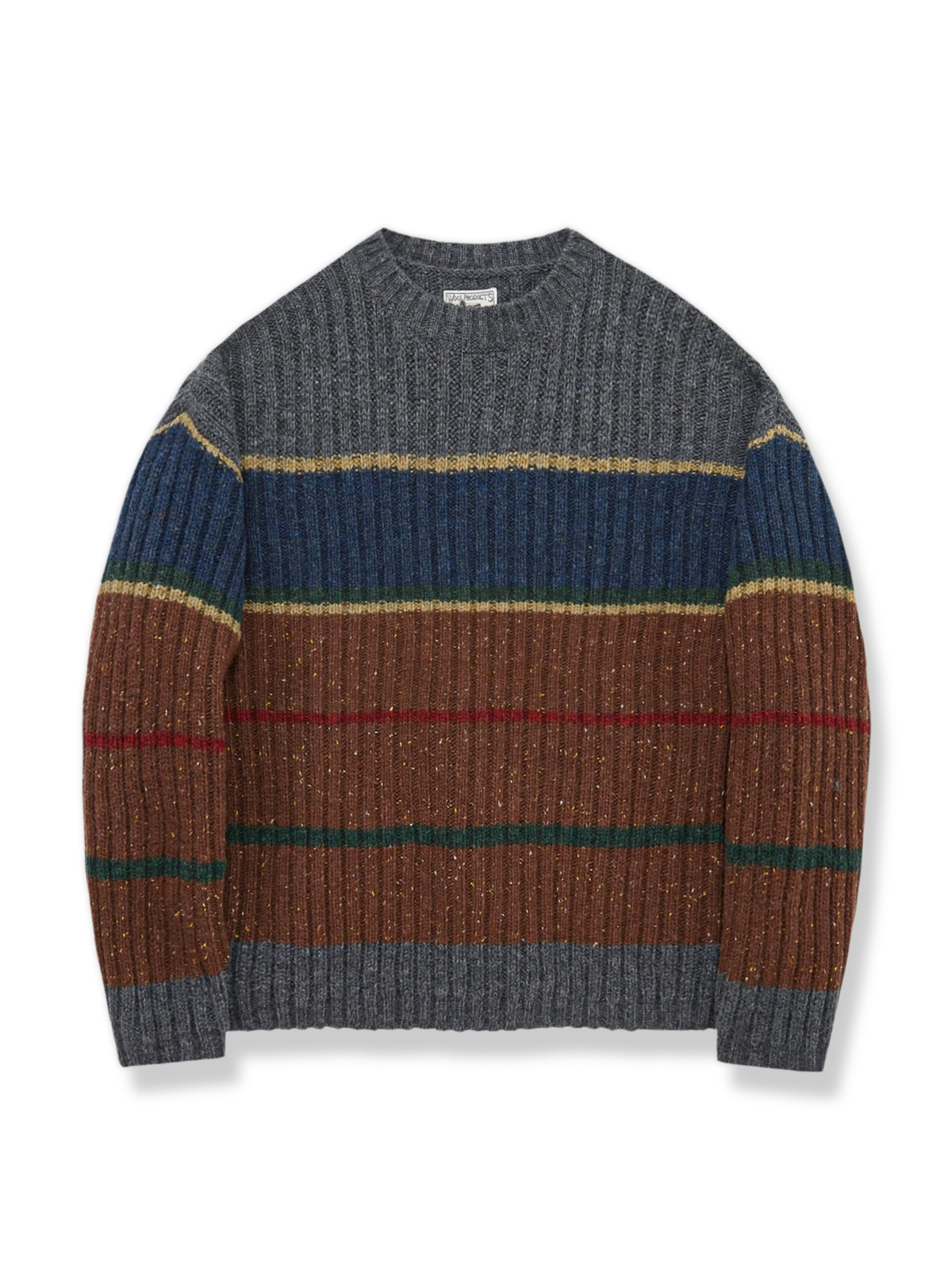 このセーターはシェットランドウールとラムウールのブレンド糸を使用しています。シェットランドウールは、そのふんわりとした柔らかさと優れた保温性で知られています。伝統的なストライプスタイルを維持しつつ、カラーブロッキングの技術を用いて現代的な感触を加えています。