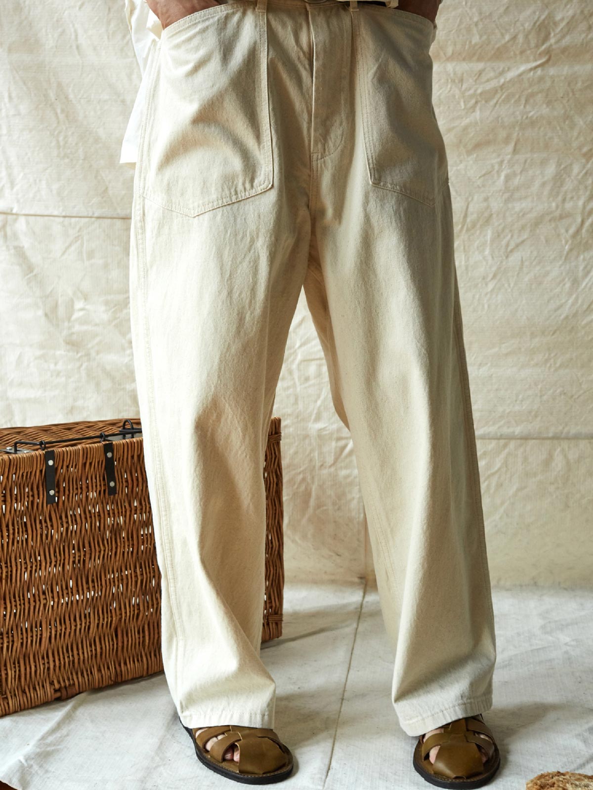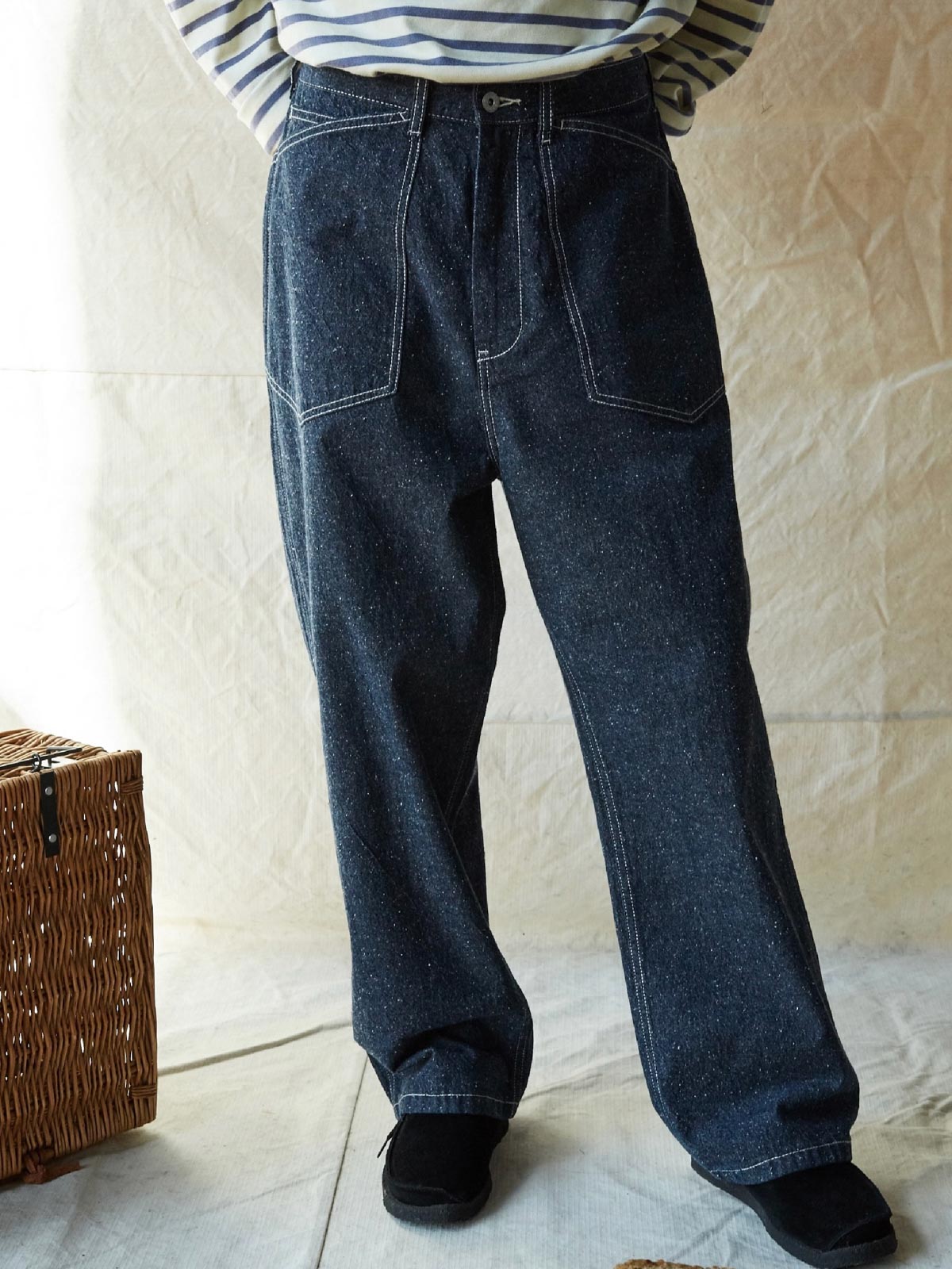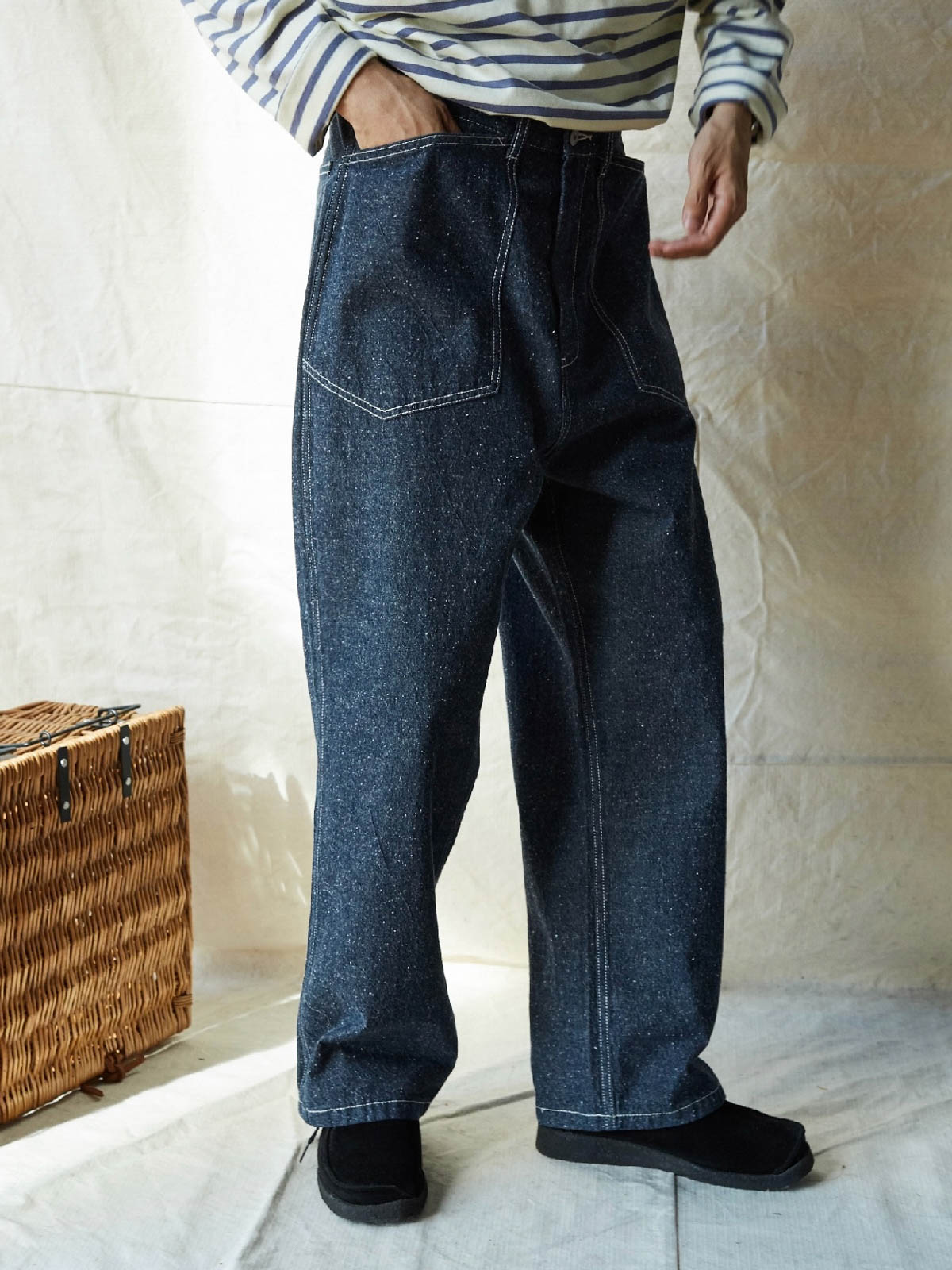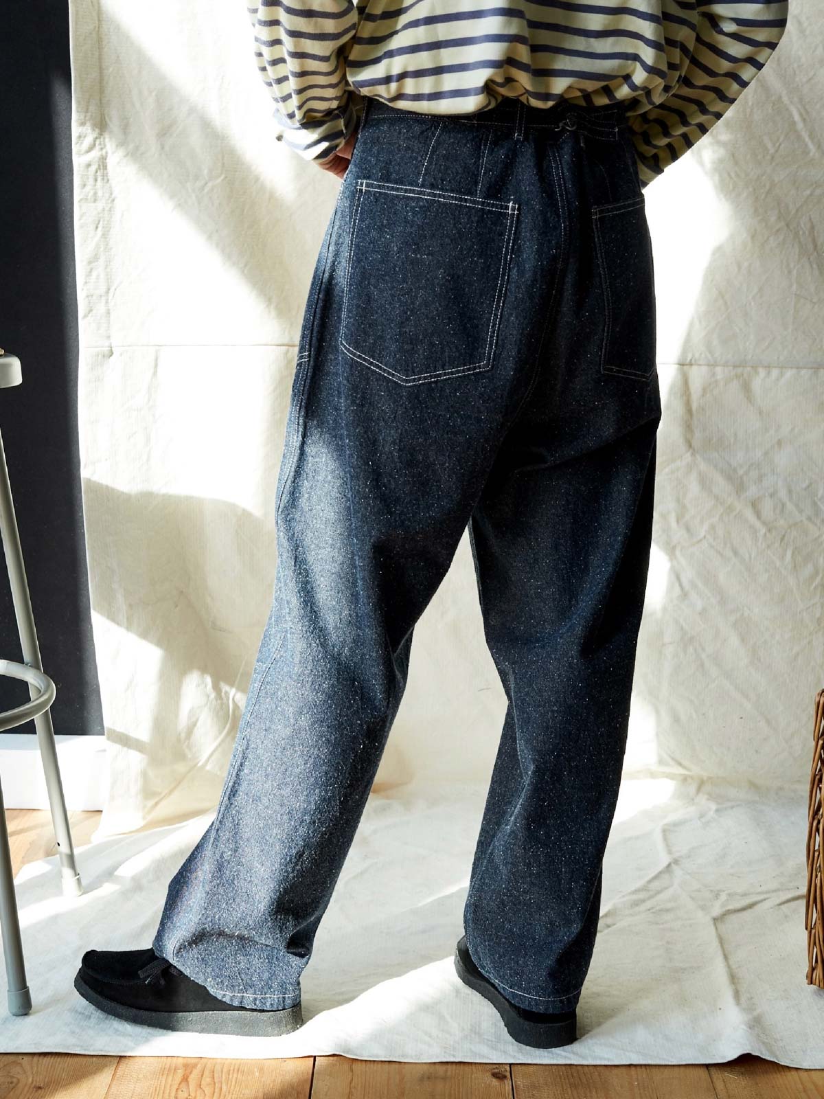 1935年のM35軍パンをデザインインスピレーションにしており、シグネチャーのストレートカットやデザインディテールを受け継いでいます。両側の大きなパッチポケット、金属ボタン、後部の調整可能なクロッチなど、独自の高密度なコットン糸を使用し、布地の色合いが豊かで色落ちしにくい特徴があります。酵素洗浄加工により、独特のテクスチャー感とヴィンテージ感が生まれました。ロウデニムバージョンにはコットンスラブ糸が追加され、生地に粒状感と立体感を与えています。アイボリーカラーのバージョンは、高密度のコットン素材で、自然で快適な着心地を提供します。パンツの型は初期のM35軍パンのゆったりとしたストレートカットを採用し、フロントの大きなパッチポケットで実用性を高め、右前ポケット内には小さなポケットを配置しています。後腰には調整可能なループと金属バックルがあり、フィット感とスタイル感を向上させています。縫製は内側の縫い目にフラットシームステッチを採用し、ディテールにこだわった仕上がりです。ヴィンテージスタイルからモダンなカジュアルコーディネートまで、このデニムパンツは多様なスタイルに対応します。