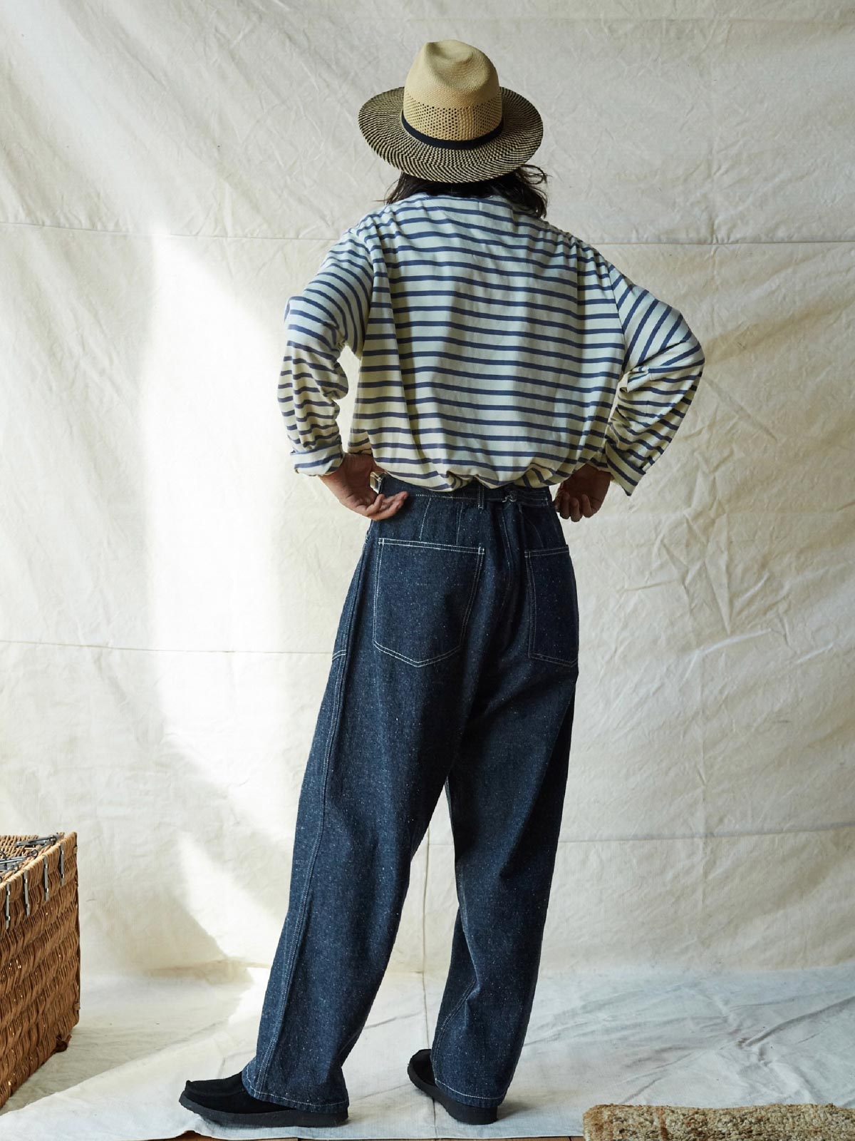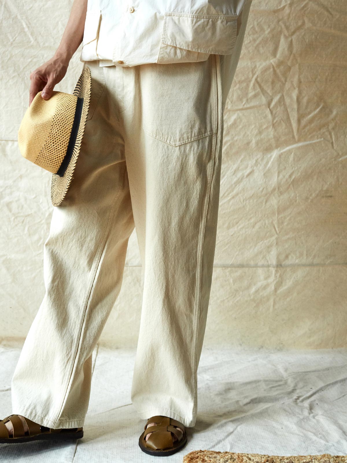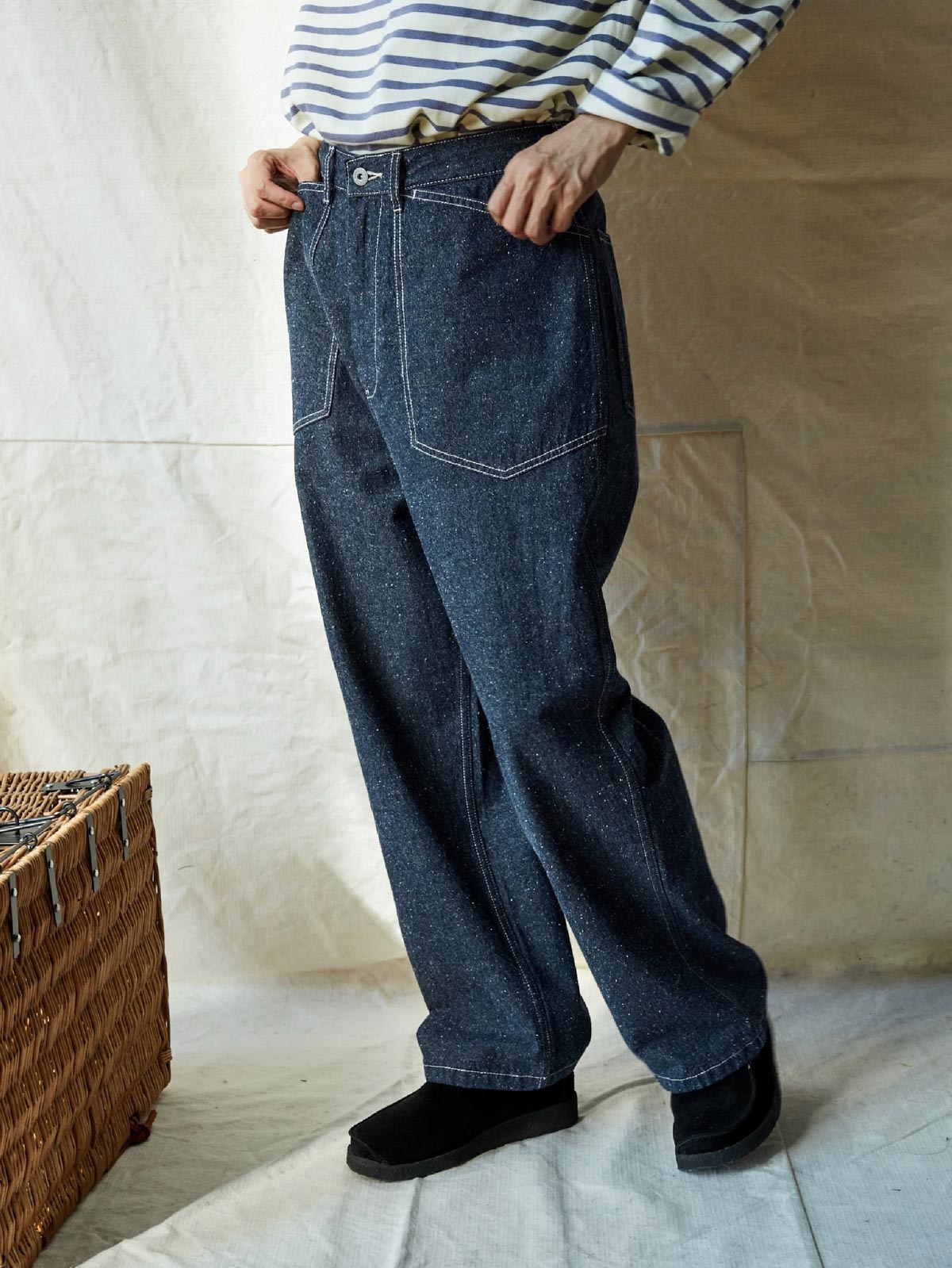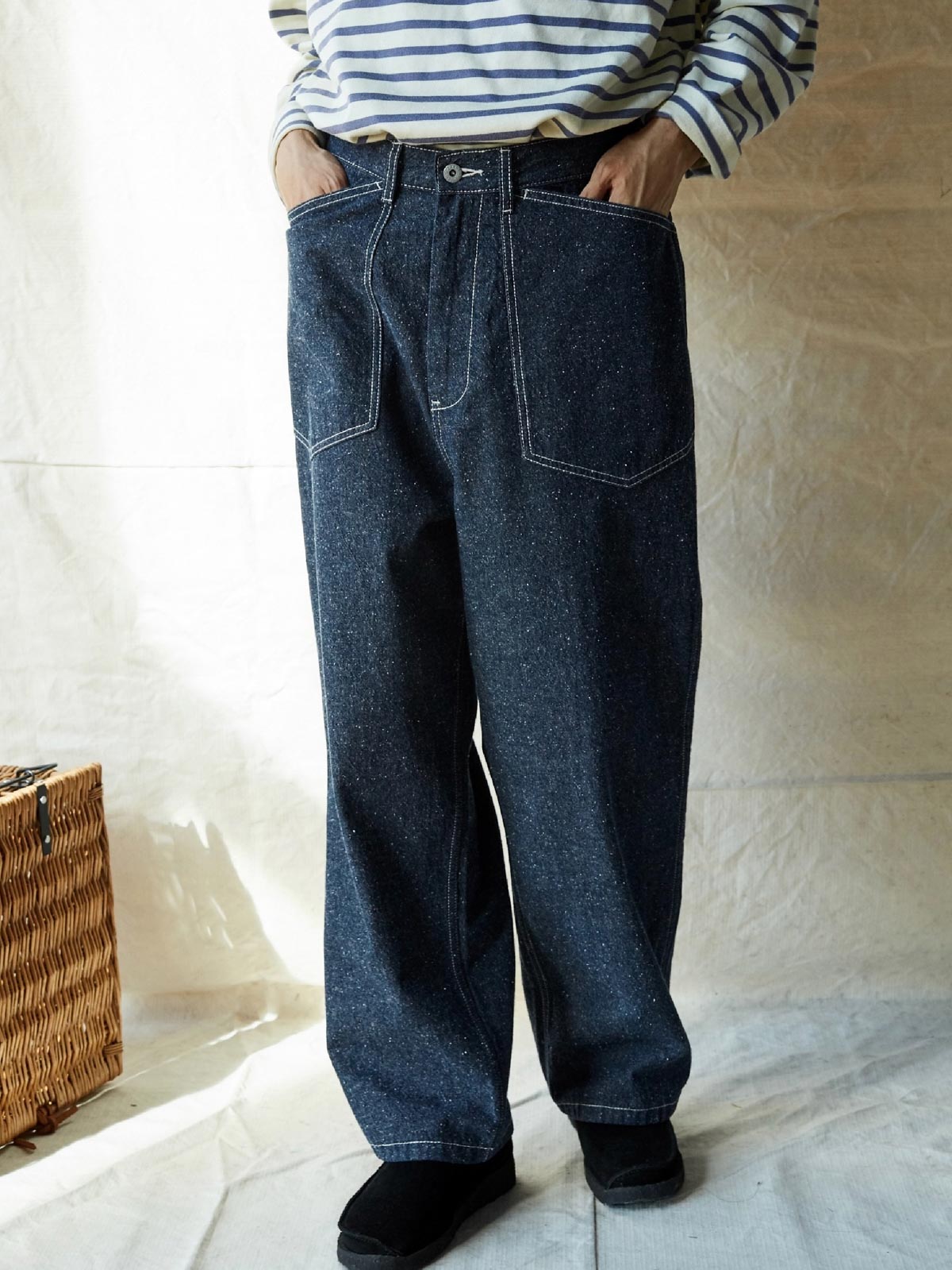 1935年のM35軍パンをデザインインスピレーションにしており、シグネチャーのストレートカットやデザインディテールを受け継いでいます。両側の大きなパッチポケット、金属ボタン、後部の調整可能なクロッチなど、独自の高密度なコットン糸を使用し、布地の色合いが豊かで色落ちしにくい特徴があります。酵素洗浄加工により、独特のテクスチャー感とヴィンテージ感が生まれました。ロウデニムバージョンにはコットンスラブ糸が追加され、生地に粒状感と立体感を与えています。アイボリーカラーのバージョンは、高密度のコットン素材で、自然で快適な着心地を提供します。パンツの型は初期のM35軍パンのゆったりとしたストレートカットを採用し、フロントの大きなパッチポケットで実用性を高め、右前ポケット内には小さなポケットを配置しています。後腰には調整可能なループと金属バックルがあり、フィット感とスタイル感を向上させています。縫製は内側の縫い目にフラットシームステッチを採用し、ディテールにこだわった仕上がりです。ヴィンテージスタイルからモダンなカジュアルコーディネートまで、このデニムパンツは多様なスタイルに対応します。