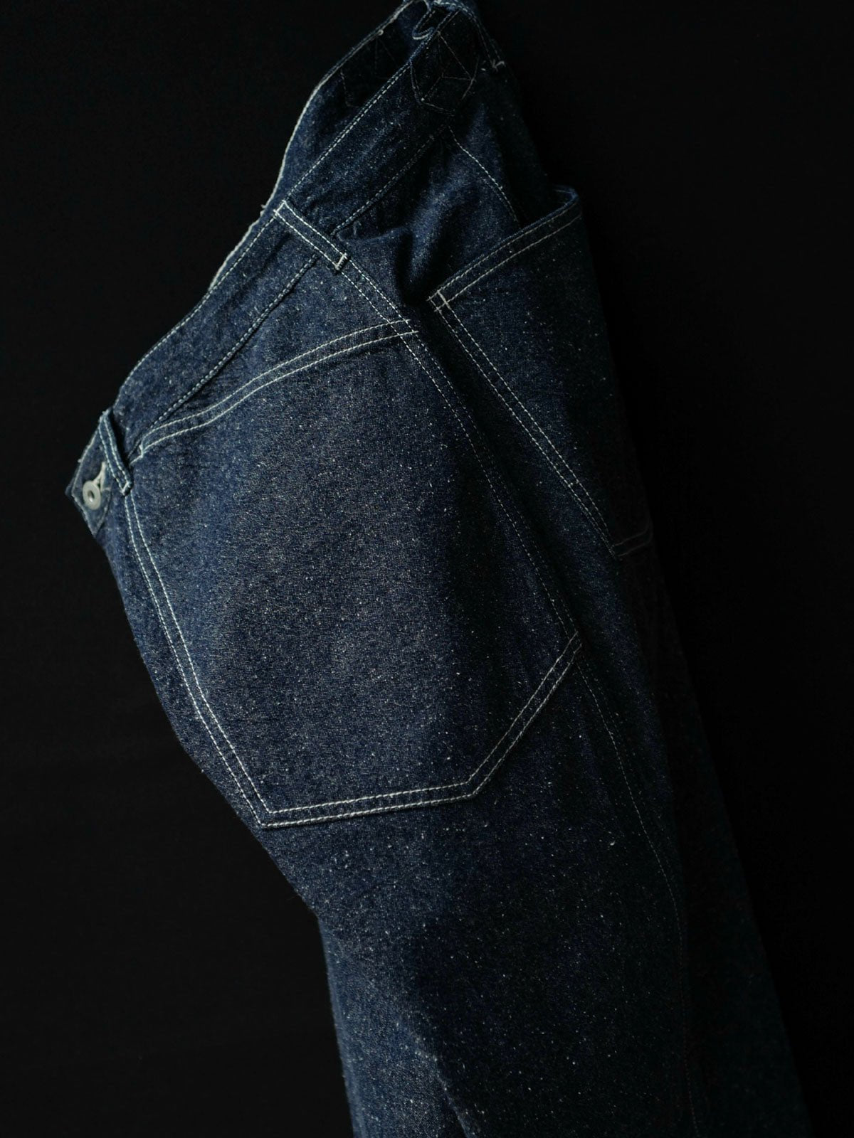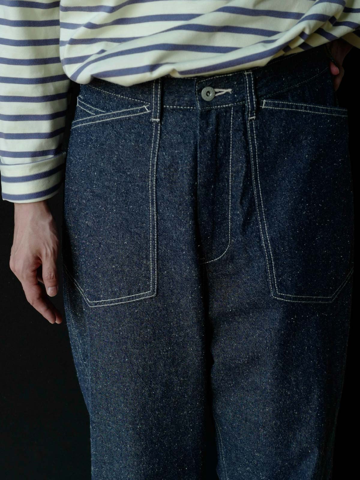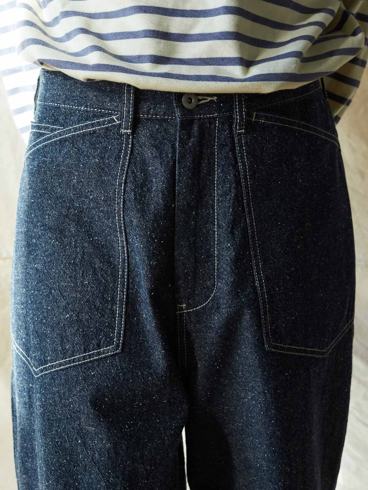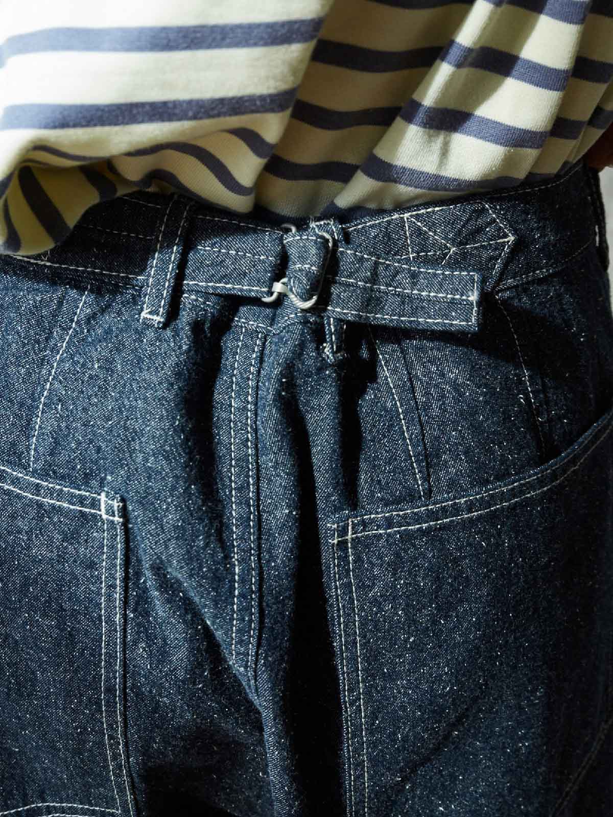 このデニムパンツは、M35軍パンのクラシックなデザインと高密度コットンデニム素材を組み合わせ、ヴィンテージ感とモダンな実用性を兼ね備えたファッションアイテム。