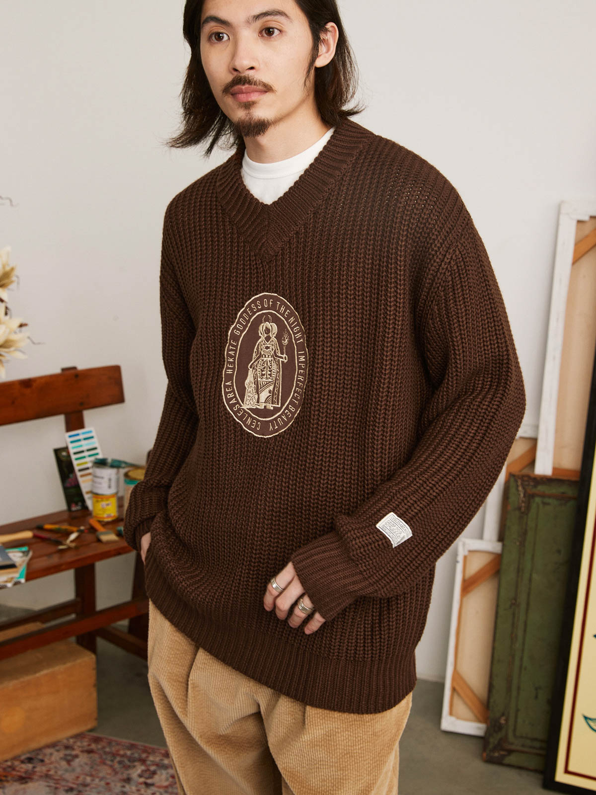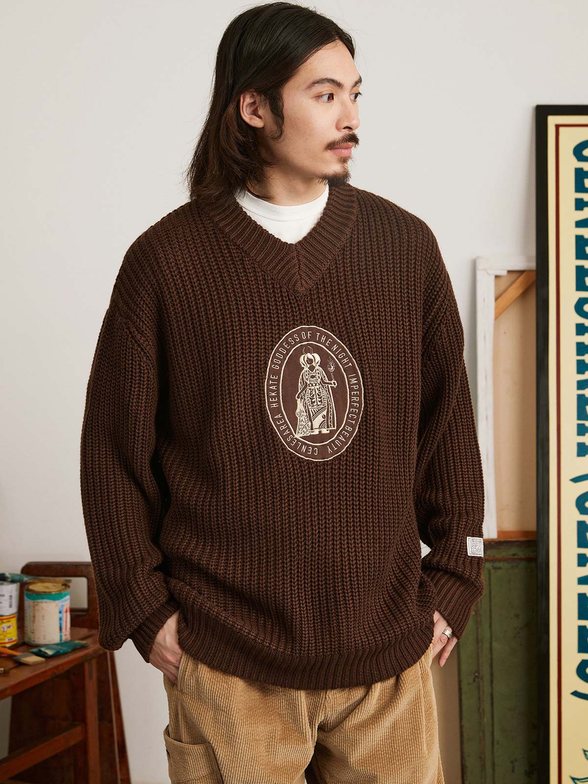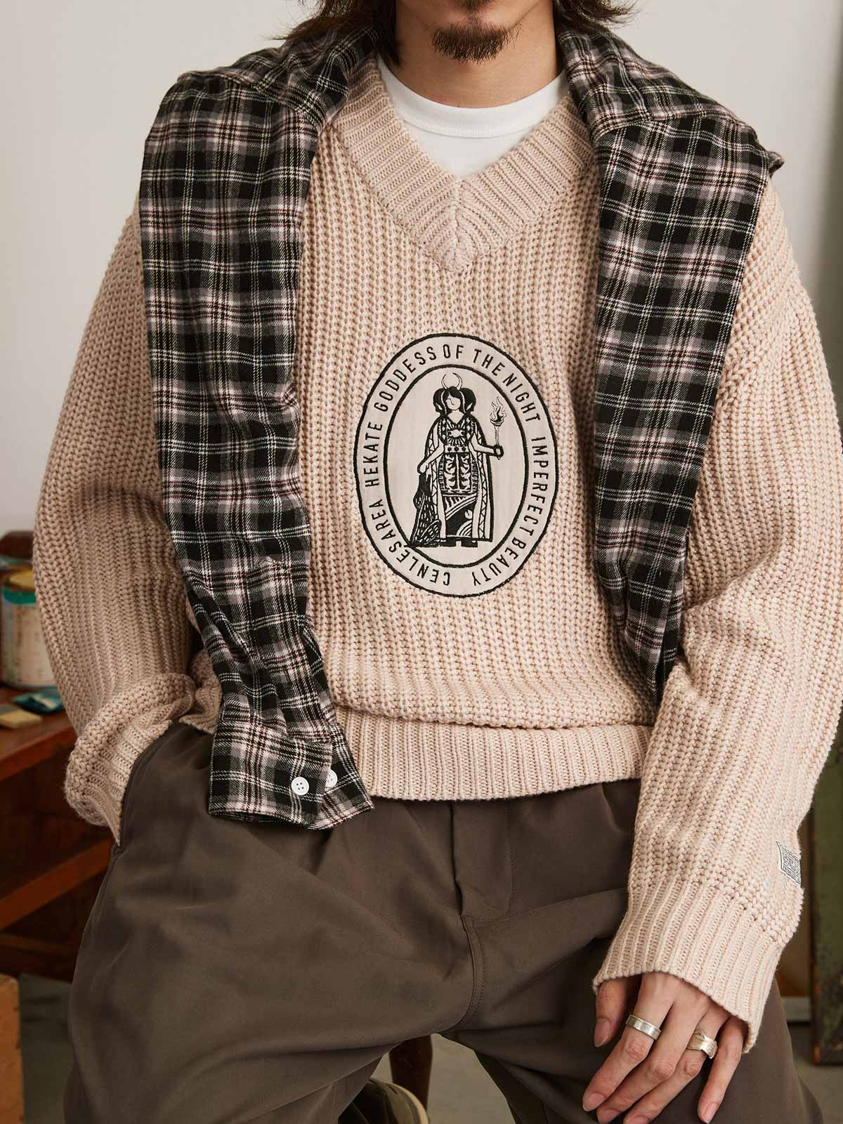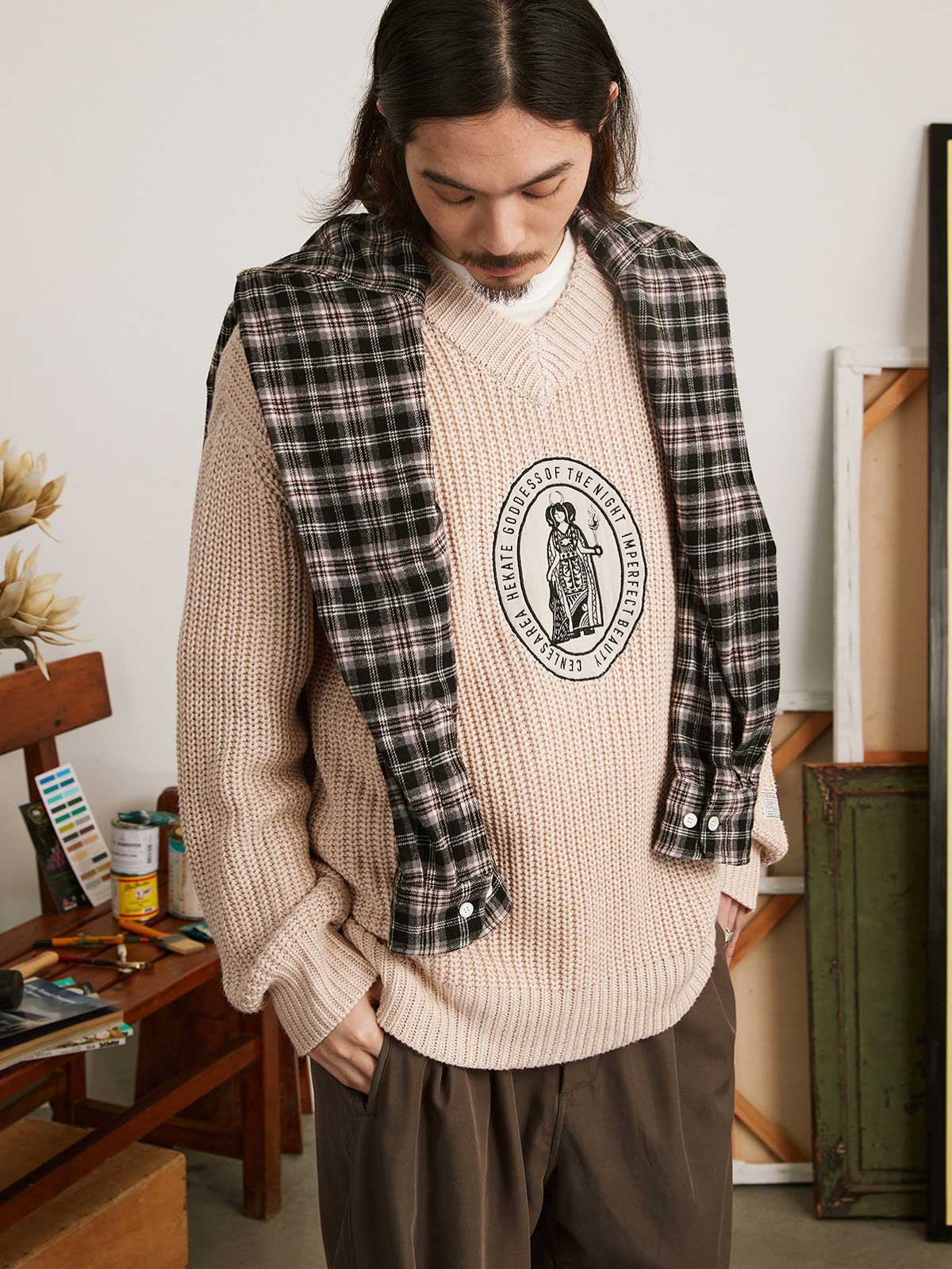 このレトロなウールVネックニットセーターは、抗ピリングウール混紡糸を使用しており、6%ウール、30%アクリル、20%ナイロン、44%ポリエステルで構成されています。優れた保温性能と柔らかな質感を持ち、日常の着用に最適です。生地表面はフランネルのように柔らかく、抗ピリング設計により耐久性があります。3針のパールステッチ技術を用いた編み方で、立体的で厚みのある質感を実現しています。Vネックデザインはクラシックな古着スタイルを踏襲し、独特の個性を演出します。セーターの前面には「夜の女神」のパッチ刺繍が施され、タロットカードとギリシャ神話からインスピレーションを得たデザインで、信念と希望を象徴しています。袖にはブランドタグが付いており、細部までこだわったデザインです。ブラウンとベージュの2色展開で、多様なコーディネートに対応します。