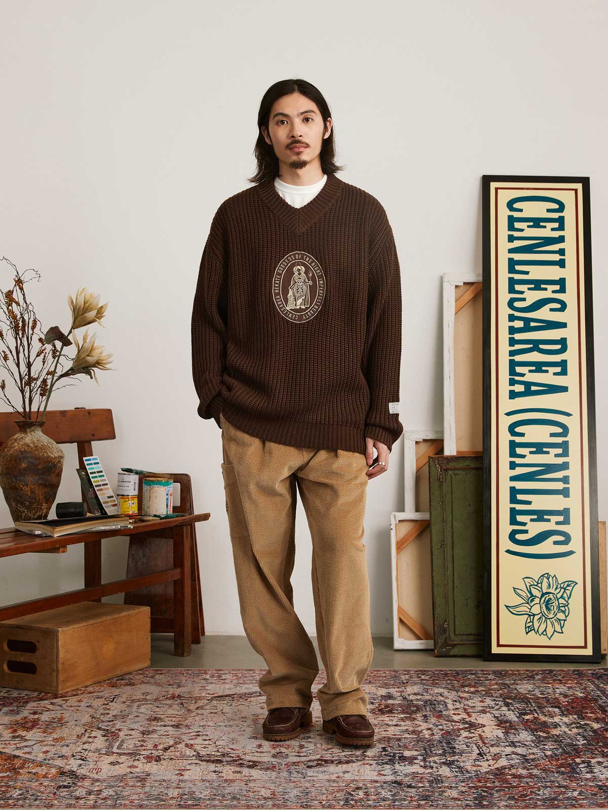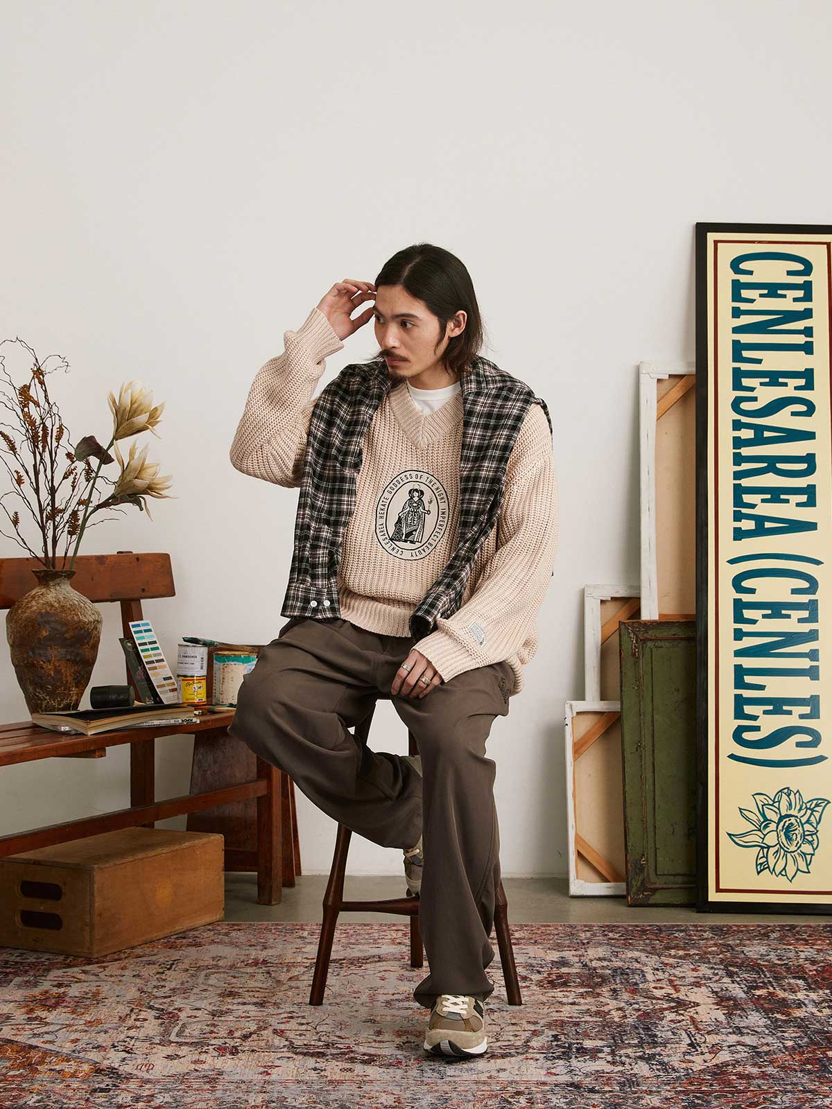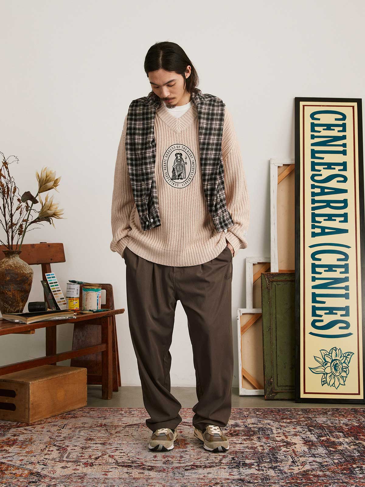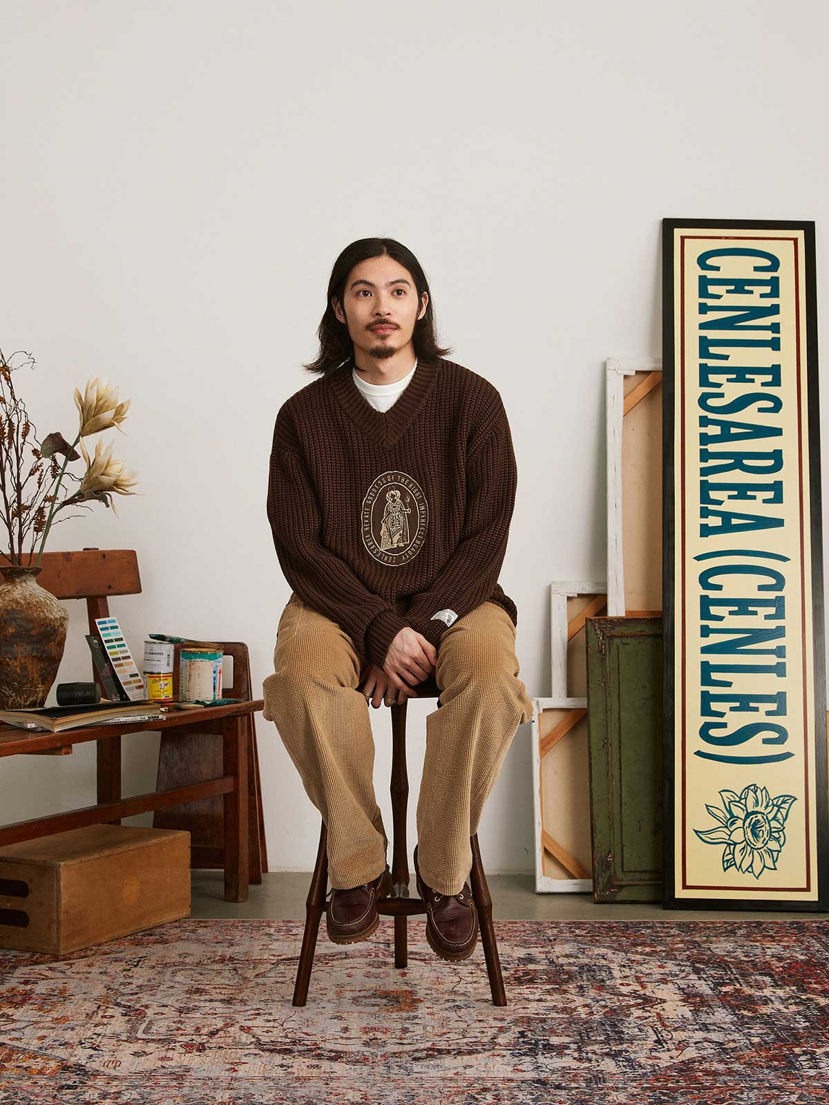 このレトロなウールVネックニットセーターは、抗ピリングウール混紡糸を使用しており、6%ウール、30%アクリル、20%ナイロン、44%ポリエステルで構成されています。優れた保温性能と柔らかな質感を持ち、日常の着用に最適です。生地表面はフランネルのように柔らかく、抗ピリング設計により耐久性があります。3針のパールステッチ技術を用いた編み方で、立体的で厚みのある質感を実現しています。Vネックデザインはクラシックな古着スタイルを踏襲し、独特の個性を演出します。セーターの前面には「夜の女神」のパッチ刺繍が施され、タロットカードとギリシャ神話からインスピレーションを得たデザインで、信念と希望を象徴しています。袖にはブランドタグが付いており、細部までこだわったデザインです。ブラウンとベージュの2色展開で、多様なコーディネートに対応します。