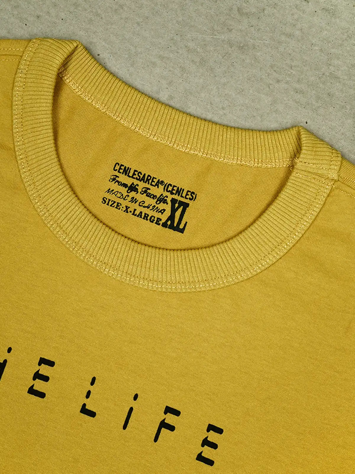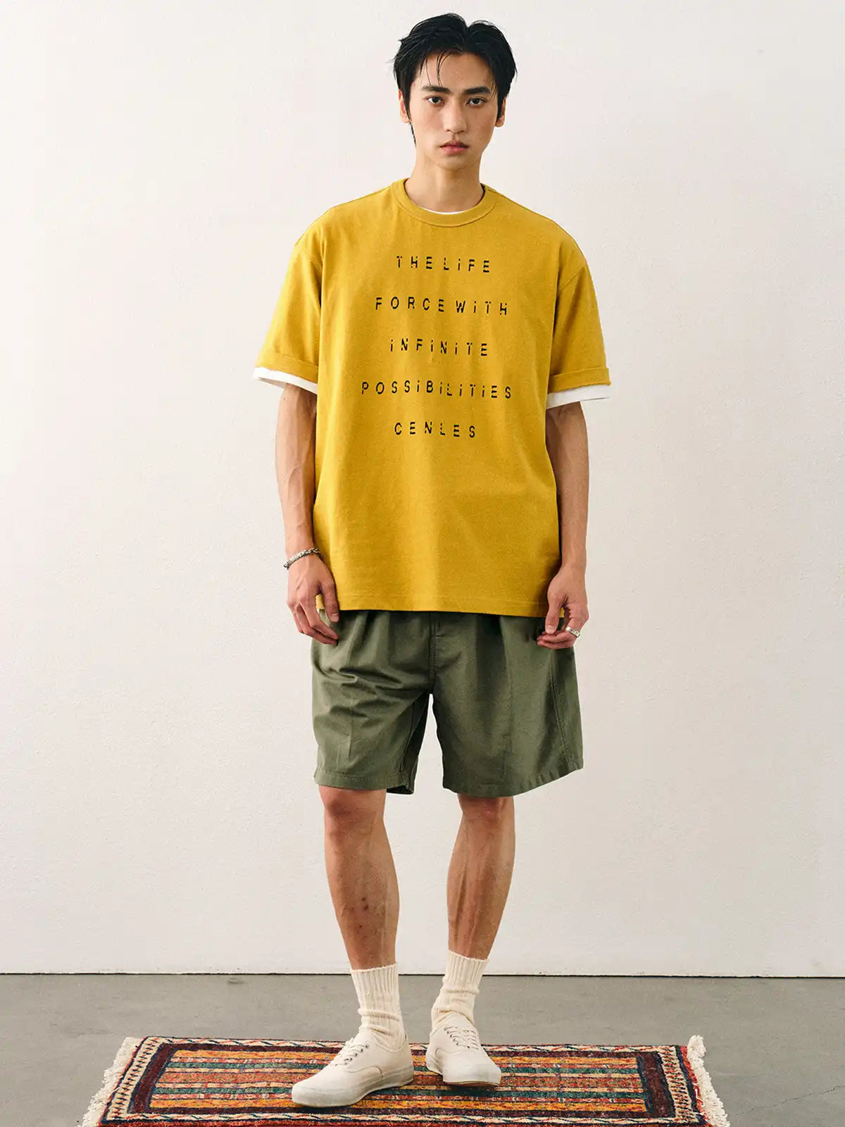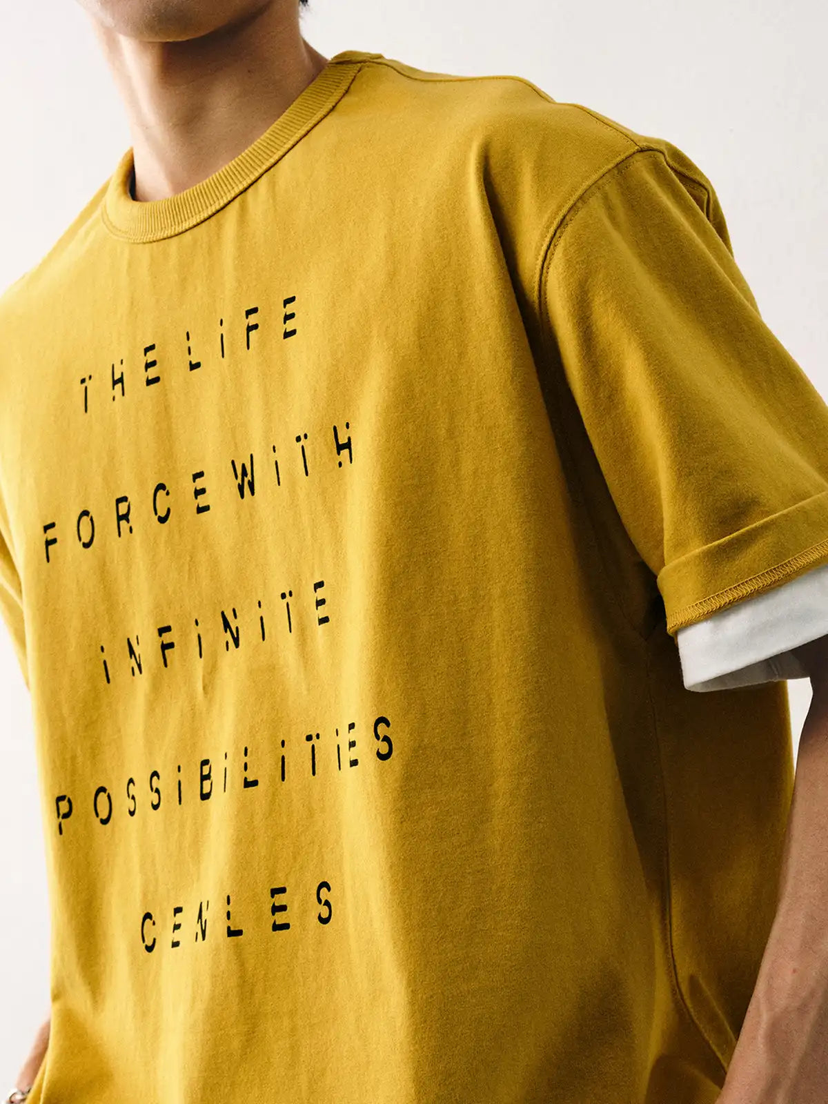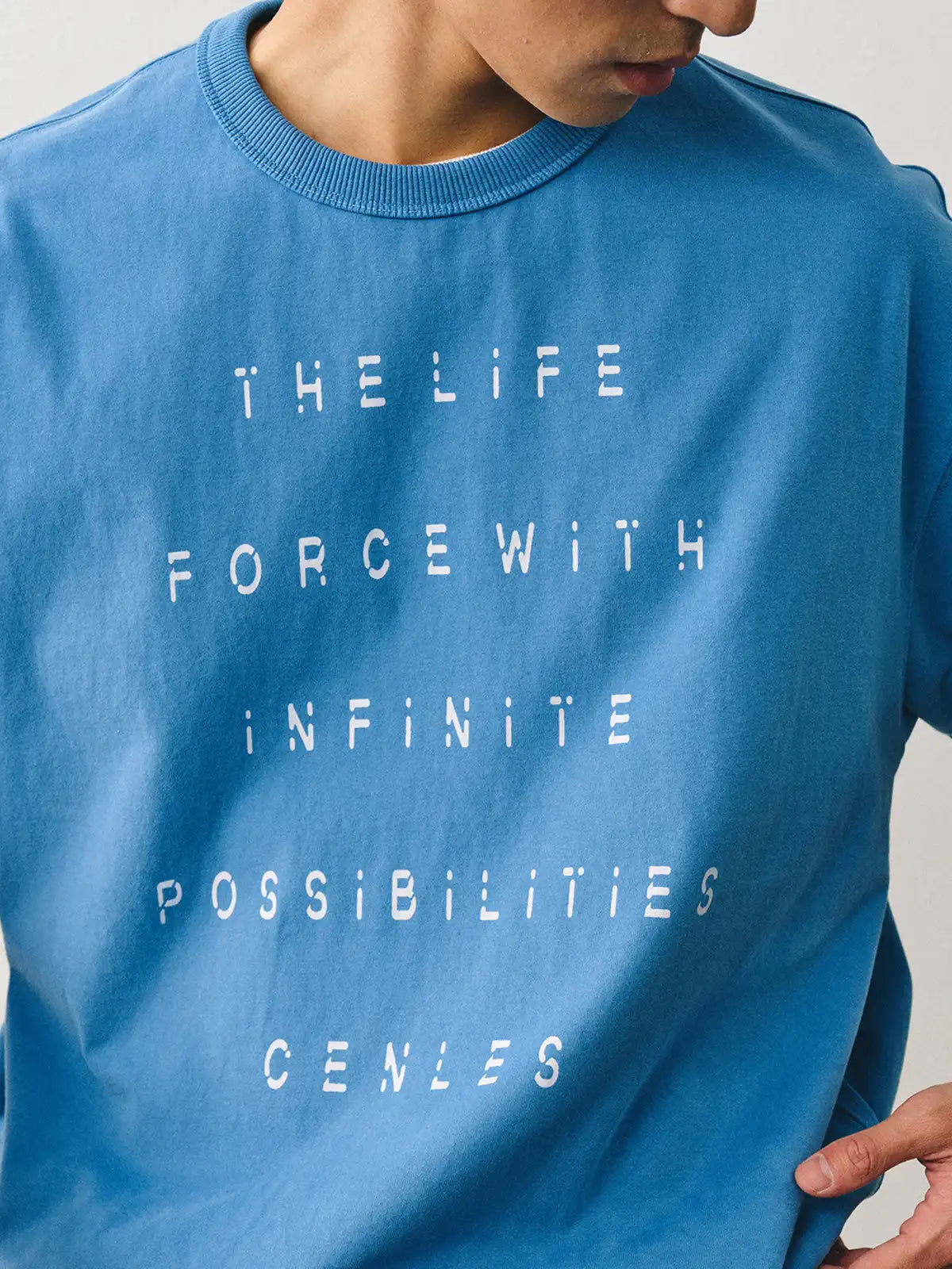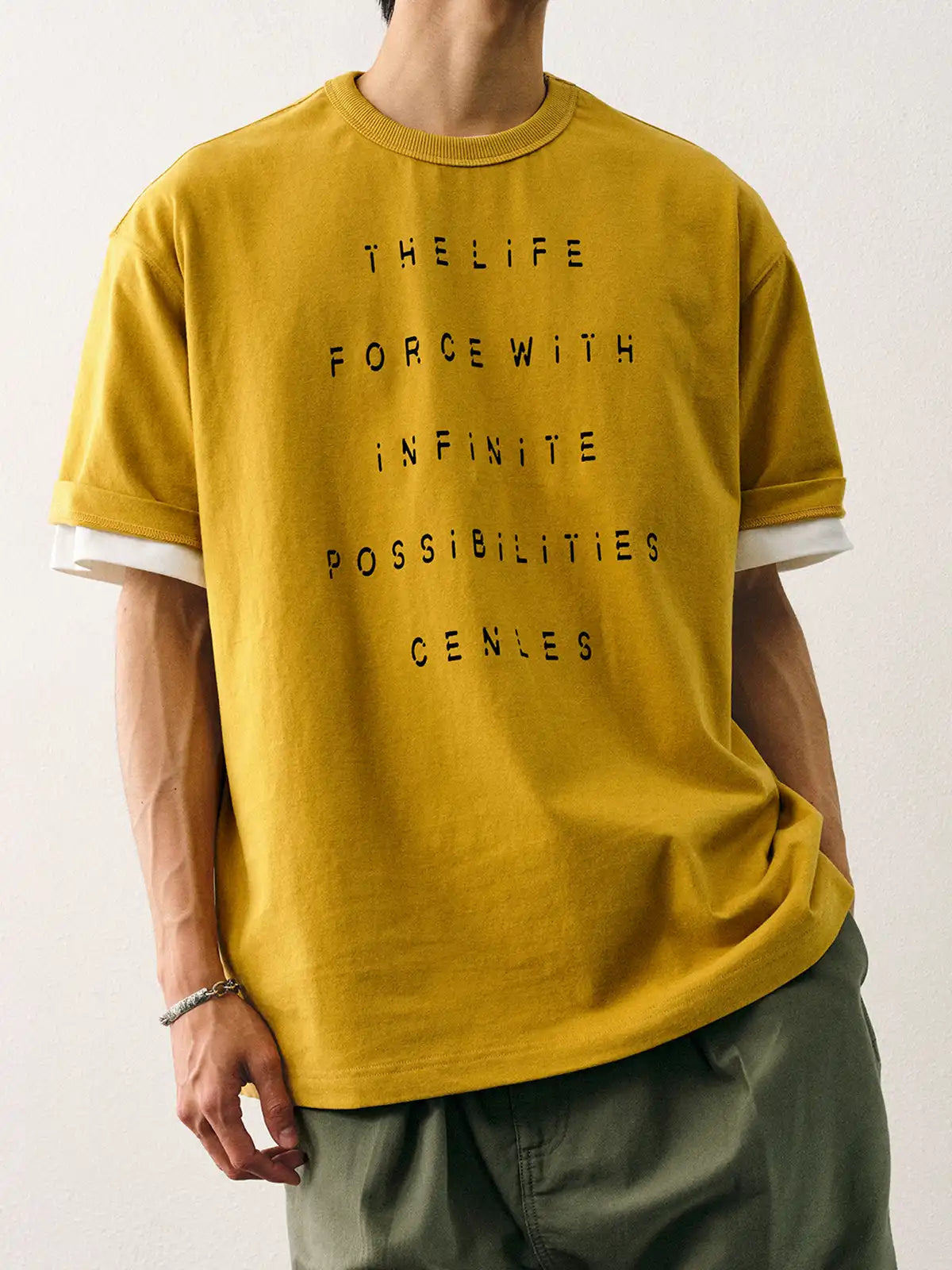 270g純綿生地と破損・摩耗風スローガンプリントが融合し、時の経過を感じさせるヴィンテージ感と生命力を放つレトロなショートスリーブTシャツです。