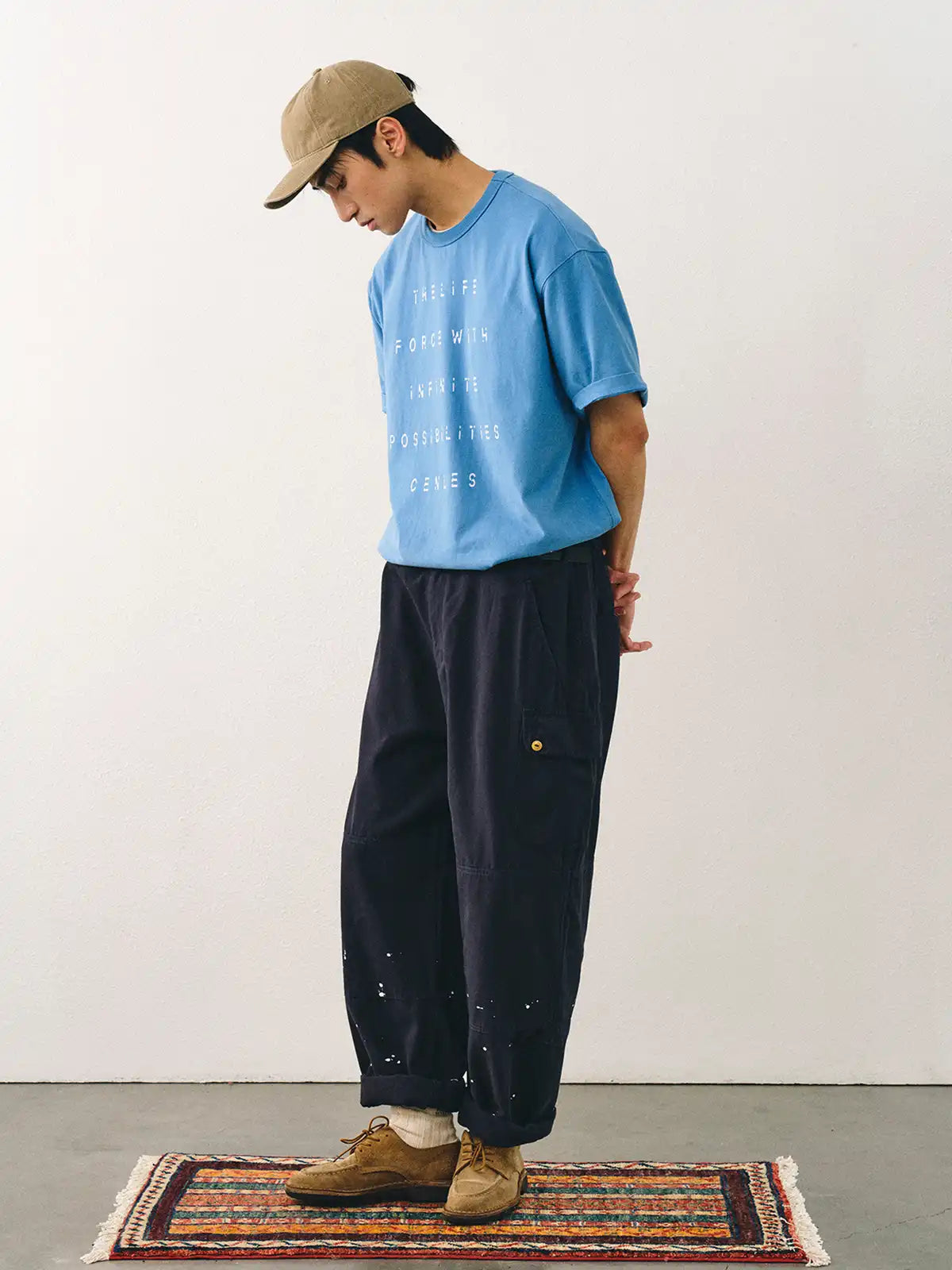 本Tシャツは、ブランド新シーズンのスローガン「THE LIFE FORCE WITH INFINITE POSSIBILITIES.」にインスパイアされ、無感触プリント技術で加工されたロゴが、まるで長年使用された古着のような破損・摩耗の風合いを表現しています。270gの100%コットン生地は、柔らかさと耐久性を兼ね備え、ほのかな起毛感と抜群の通気性を実現。さらに、ゆったりとしたドロップショルダーと控えめなネックラインのデザインが、カジュアルでリラックスした雰囲気を醸し出します。デニムやワークショーツとの組み合わせで、レトロなストリートスタイルと独自の個性を際立たせる一着です。