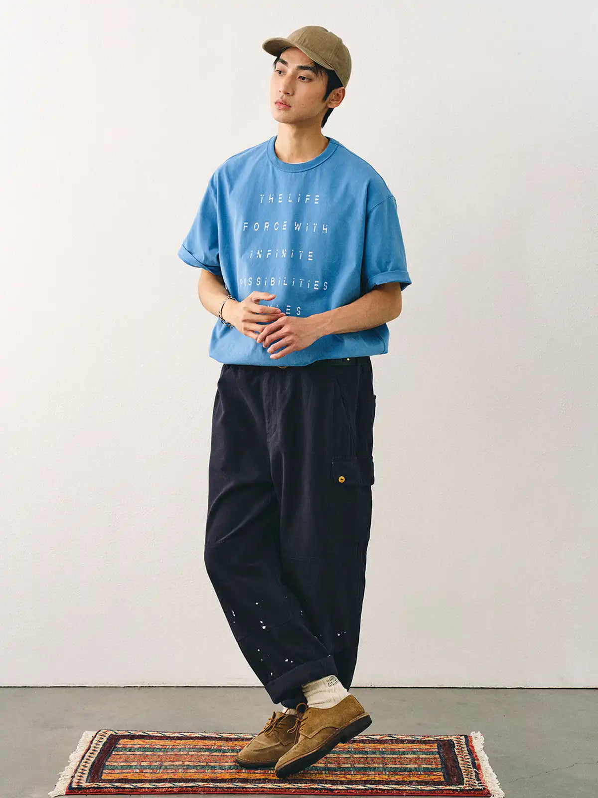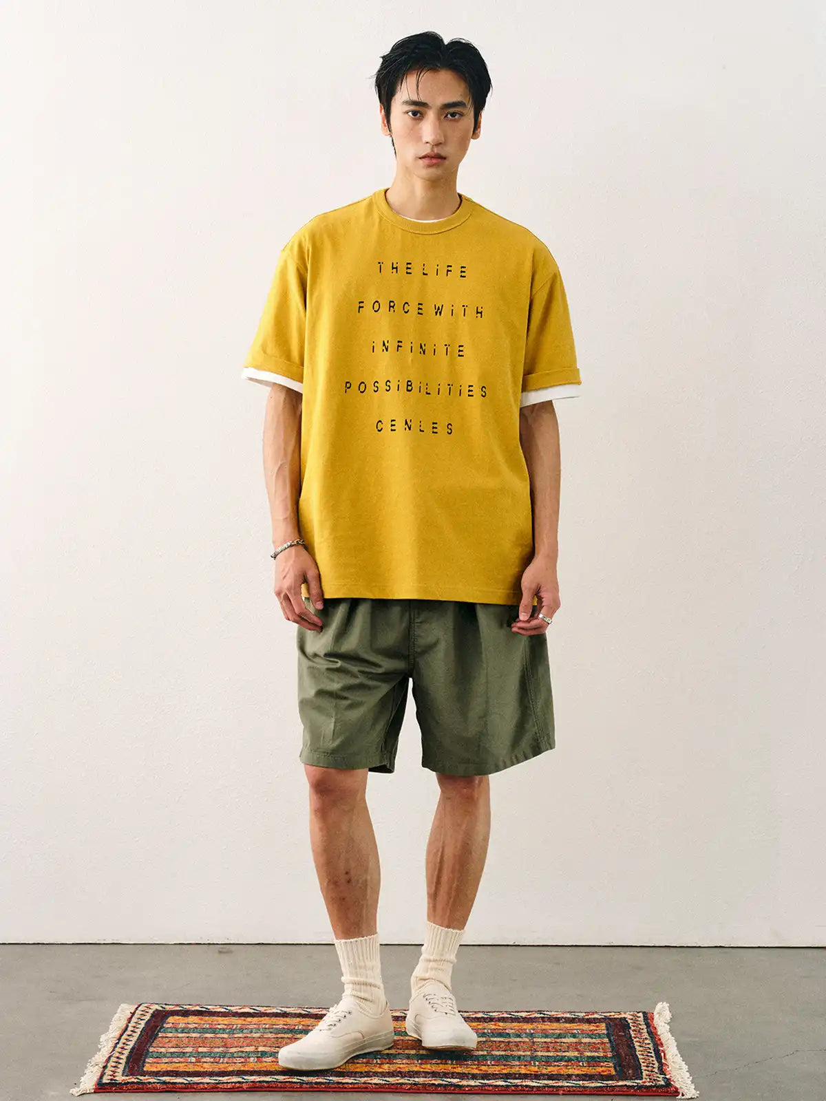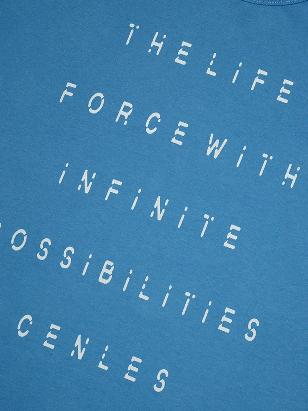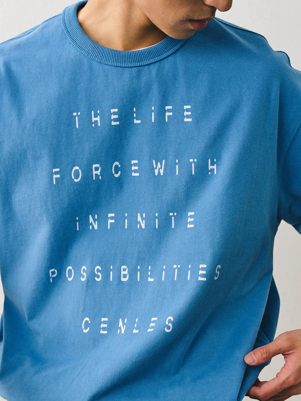 ブランド新シーズンのスローガン「THE LIFE FORCE WITH INFINITE POSSIBILITIES.」を、あえて割れ・擦れたビンテージ風に再現したプリントが特徴。手触りを感じさせない無手感プリント技法で、長年着込んだような色褪せやヒビ割れを忠実に再現。270gの厚手コットン天竺は程よい重みと立体感がありつつ、表面にうっすら起毛感が残って肌あたりが柔らかく快適。小さめのリブ襟とドロップショルダーのゆったりシルエットが、リラックス感ある着心地を実現し、シンプルなデザインながら強いメッセージ性を放つ一着。