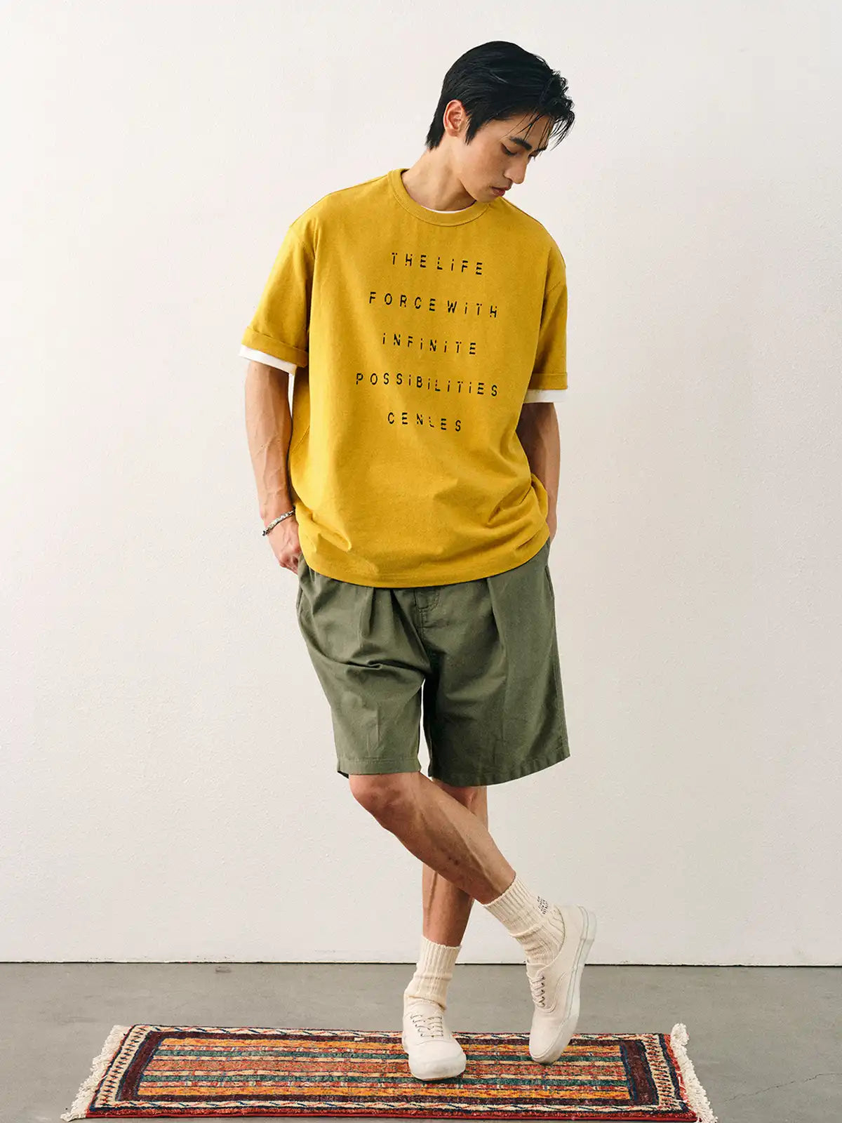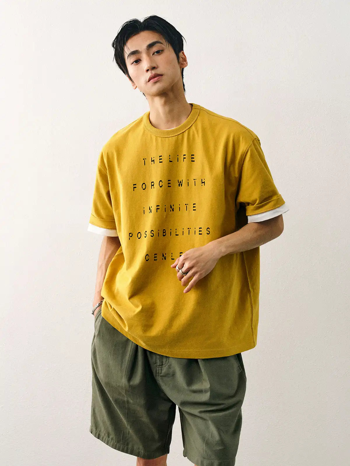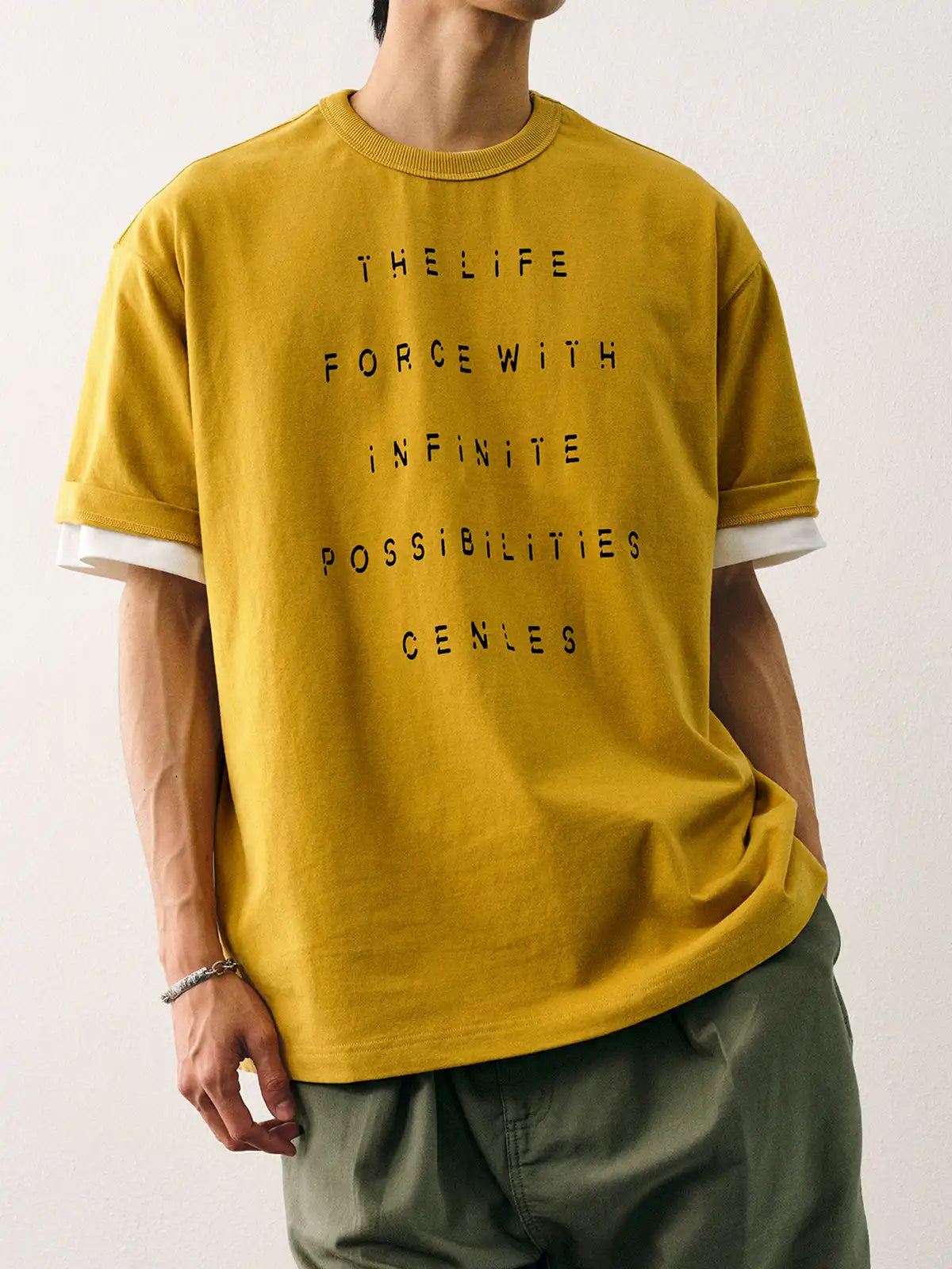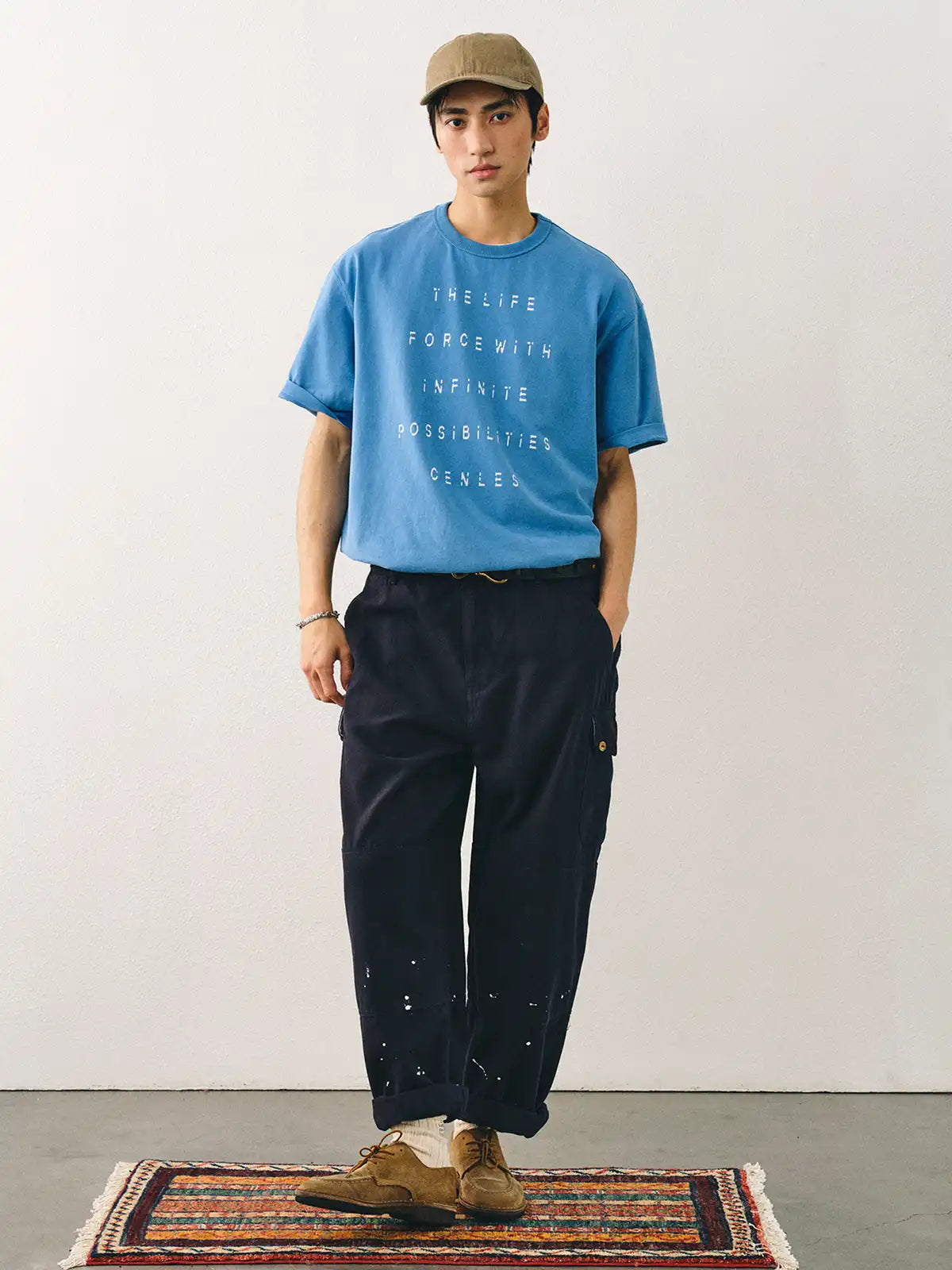 ブランド新シーズンのスローガン「THE LIFE FORCE WITH INFINITE POSSIBILITIES.」を、あえて割れ・擦れたビンテージ風に再現したプリントが特徴。手触りを感じさせない無手感プリント技法で、長年着込んだような色褪せやヒビ割れを忠実に再現。270gの厚手コットン天竺は程よい重みと立体感がありつつ、表面にうっすら起毛感が残って肌あたりが柔らかく快適。小さめのリブ襟とドロップショルダーのゆったりシルエットが、リラックス感ある着心地を実現し、シンプルなデザインながら強いメッセージ性を放つ一着。