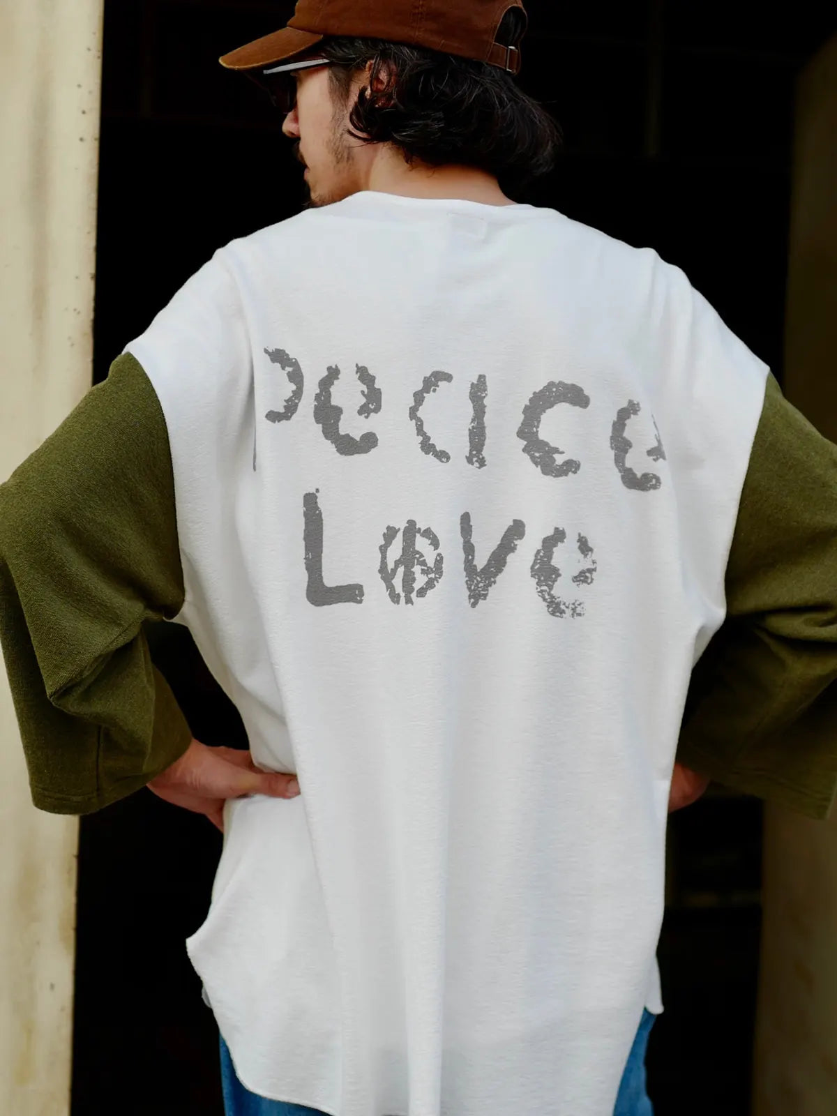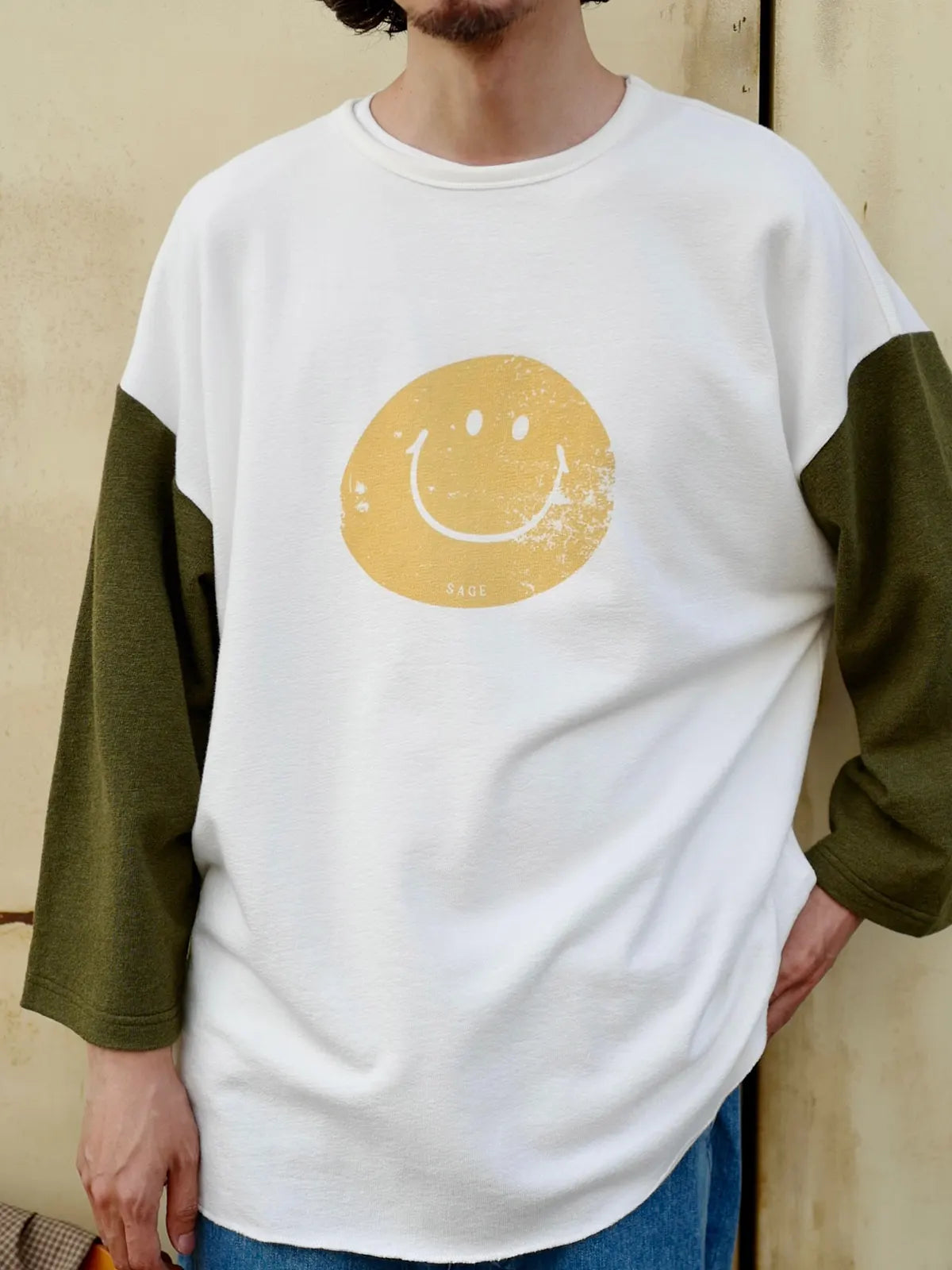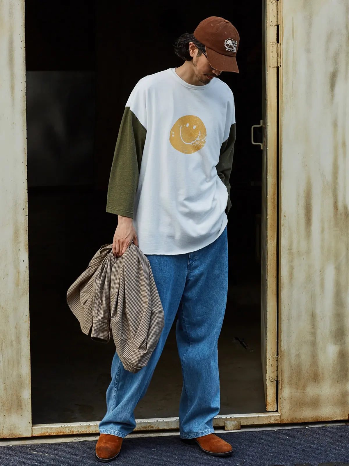 1963年生まれのSmileyロゴを胸に手刷りプリントし、背面には「Peace Love」の文字を配したレトロデザイン。230gの色織りコットンジャージーは竹節のような凹凸感としなやかなドレープ性を併せ持ち、吸湿通気性に優れる。七分袖と前短後長の弧形ヘム、肩&袖の切り替え配色がクラシカルな野球シャツ風シルエットに軽快さをプラス。裾はフリーカット仕様で自然なヴィンテージ感を演出。親子で楽しめるキッズサイズ展開も魅力。