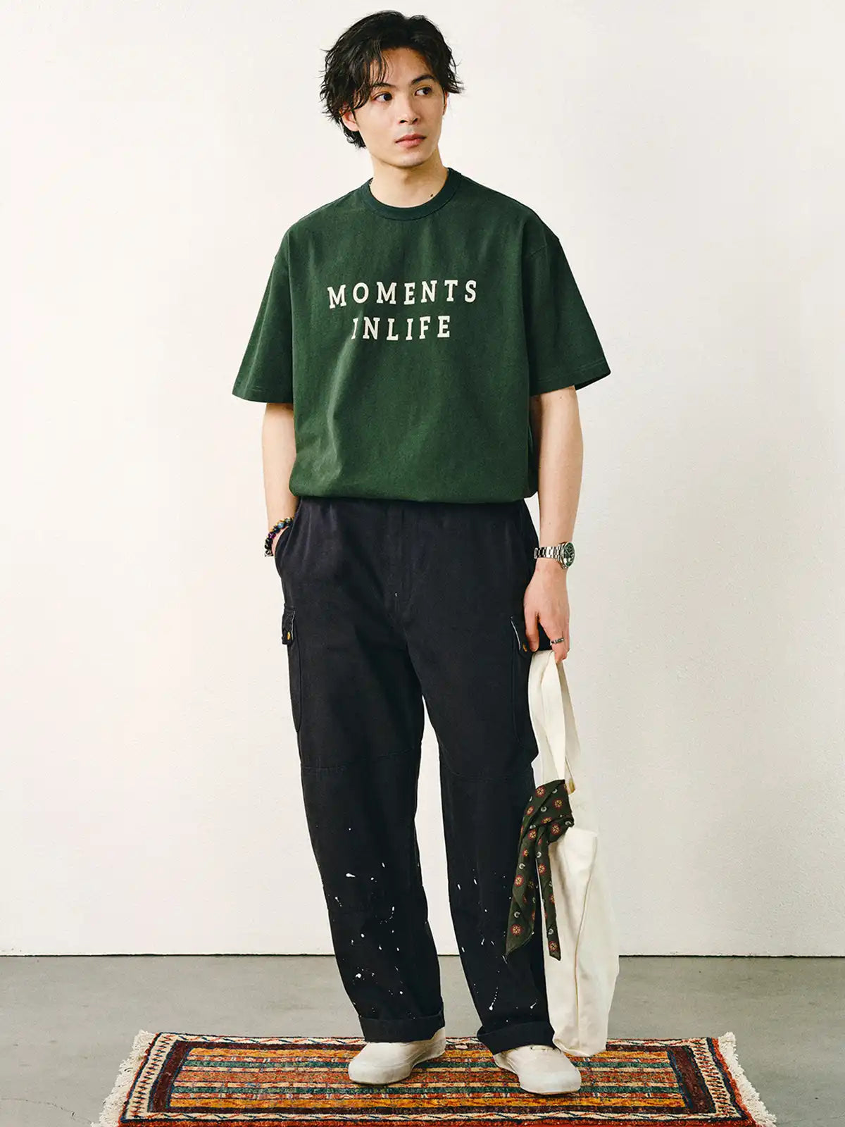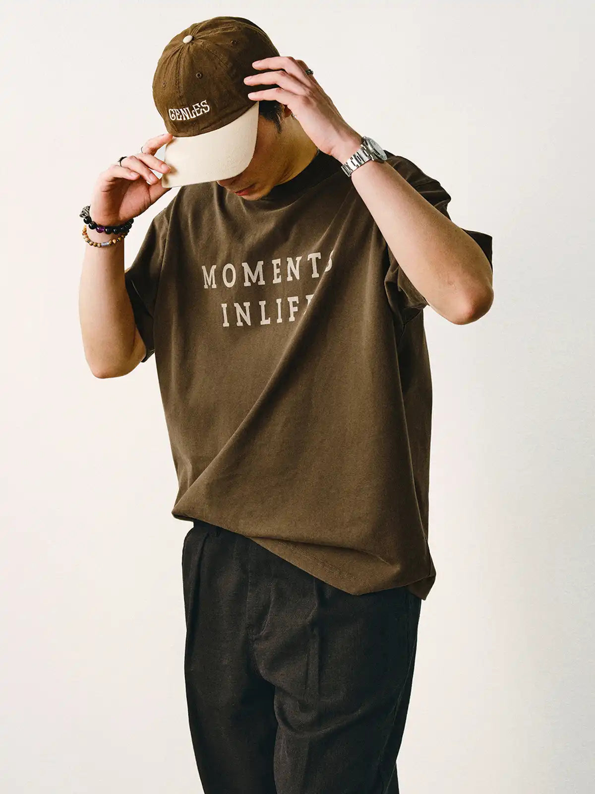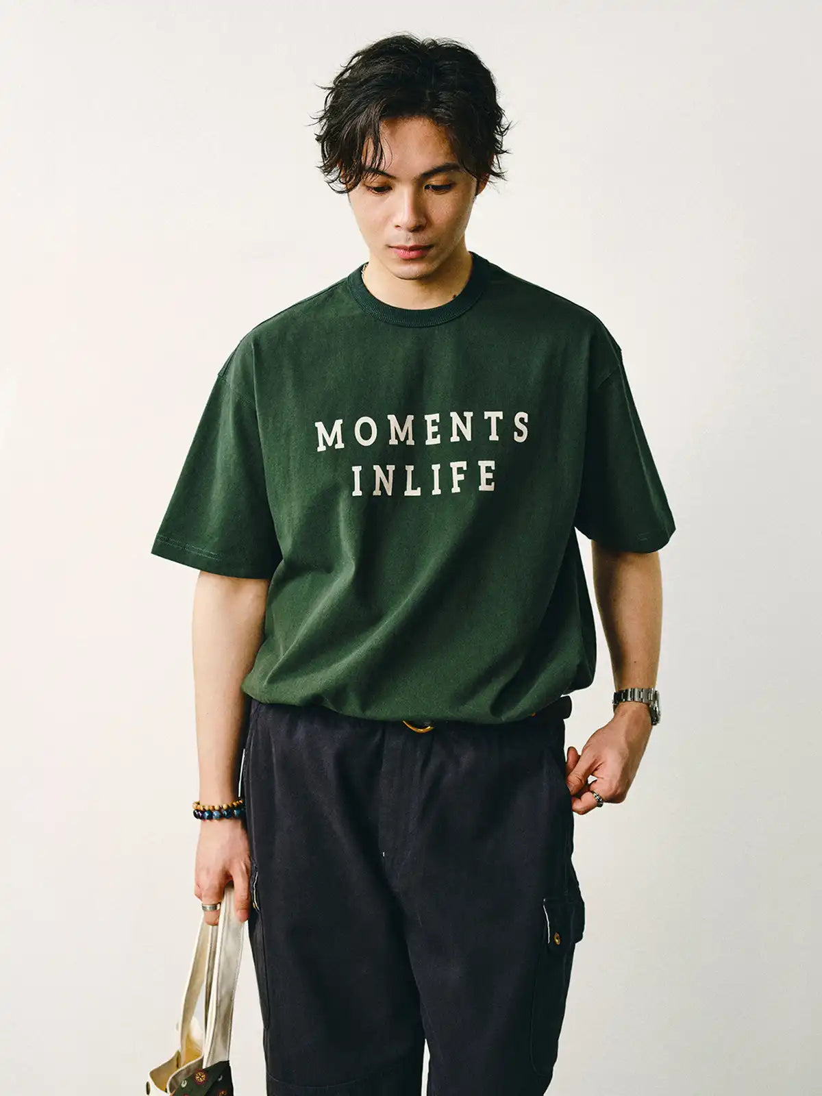 三つの異なるシーンの『ワンフレーム』が人生の刹那を表現するヴィンテージプリントTシャツは、厚手の純綿生地とリラックスシルエットで快適さと感情の共鳴を実現します。