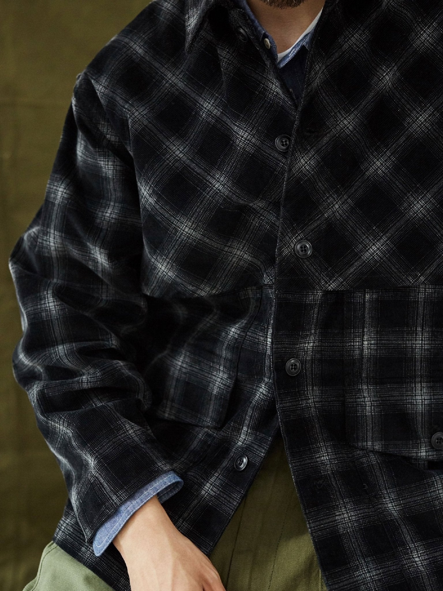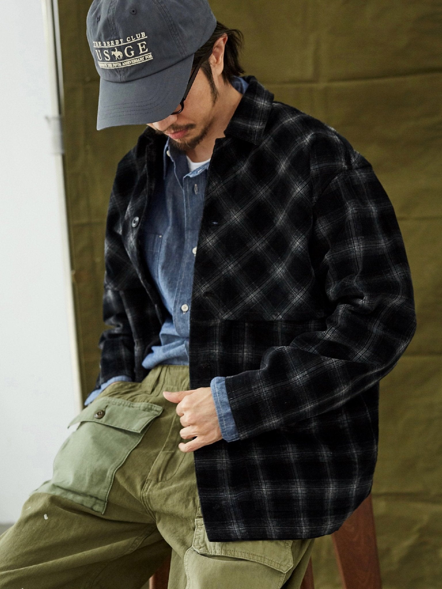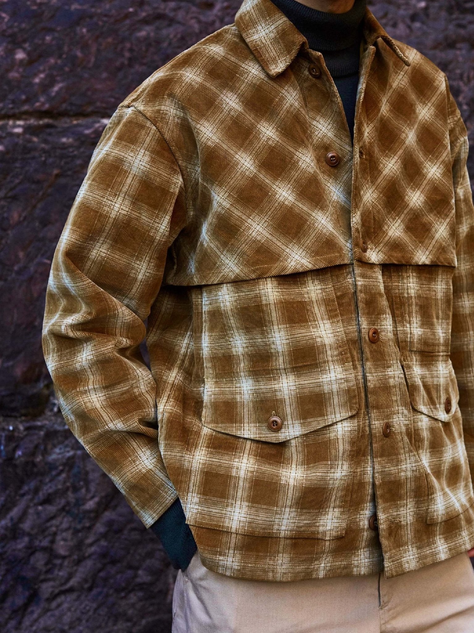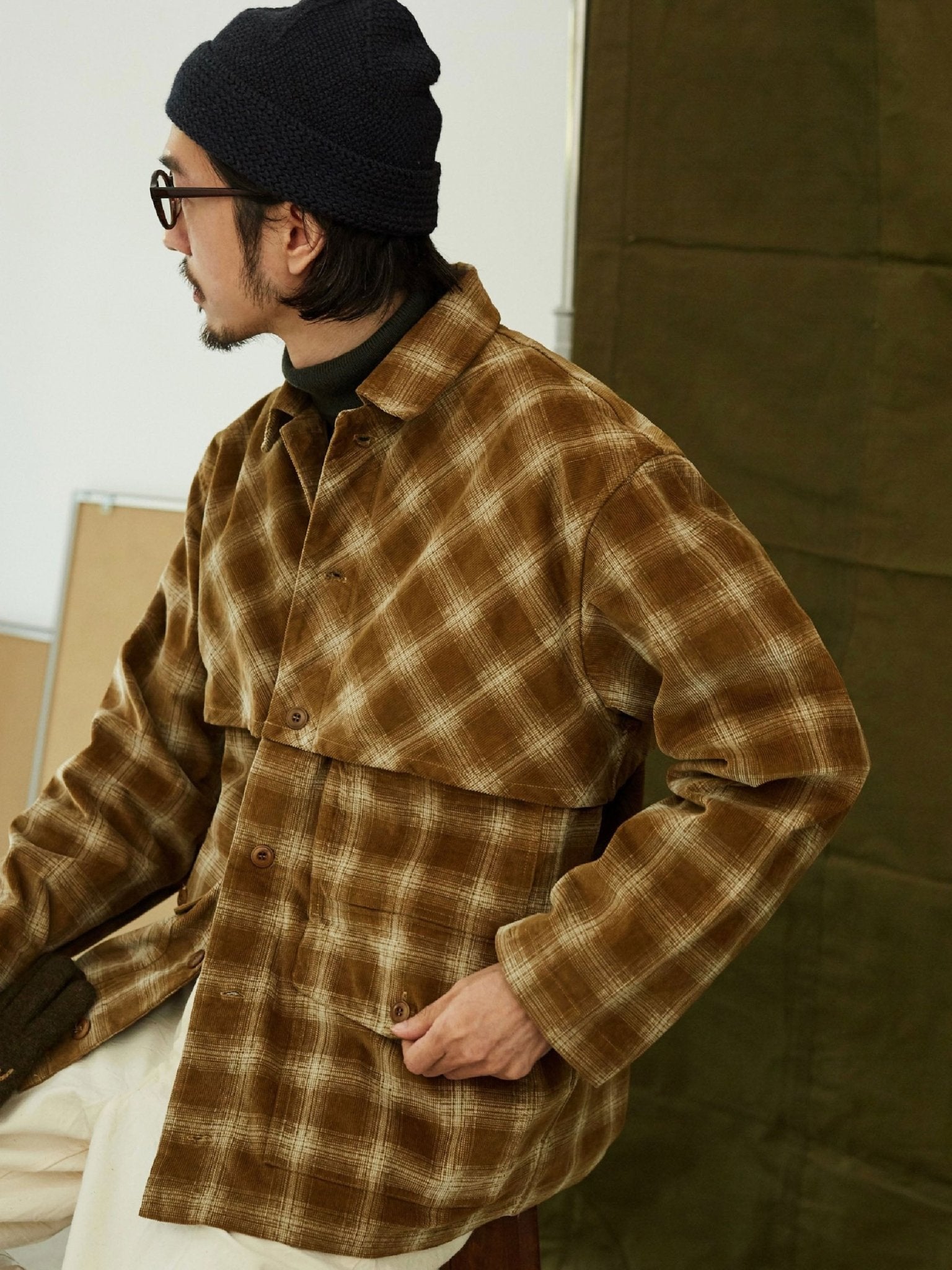 このマルチポケットチェック柄ジャケットは、アメリカンスタイルに深く影響を受け、20世紀80年代のDouble Cruiser Jacketに由来しています。二重構造の前面は胸元に伸び、ポケットのフラップとして機能性を高めています。ジャケットの格子柄は視覚的に面白い対比を形成し、カーキとブラックグレーの格子柄の組み合わせは、着用者に豊かなレイヤー感とレトロな雰囲気を提供します。