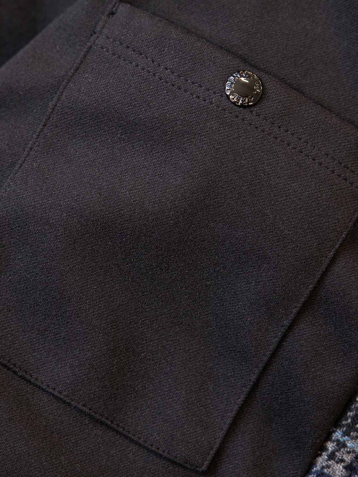 50%ウールの混紡生地を用いたカスタムダブルレイヤー加工は、このジャケットに優れた吸湿性と暖かさ、そして厚みのある手触りを提供します。新しいタイプのベルベットフィールのポリエステル混紡布は、カシミアのような手触りで、柔らかく肌に優しいです。襟、袖口、ポケットに施されたパッチワークデザインは、美しさを加えるだけでなく、追加の保温性と快適さも提供します。