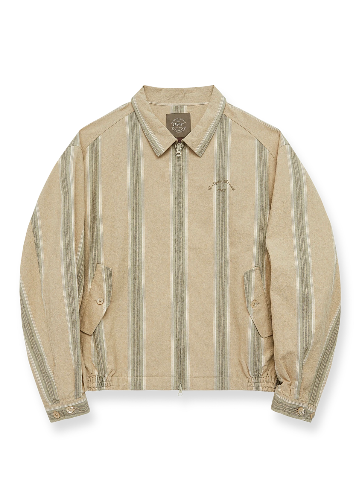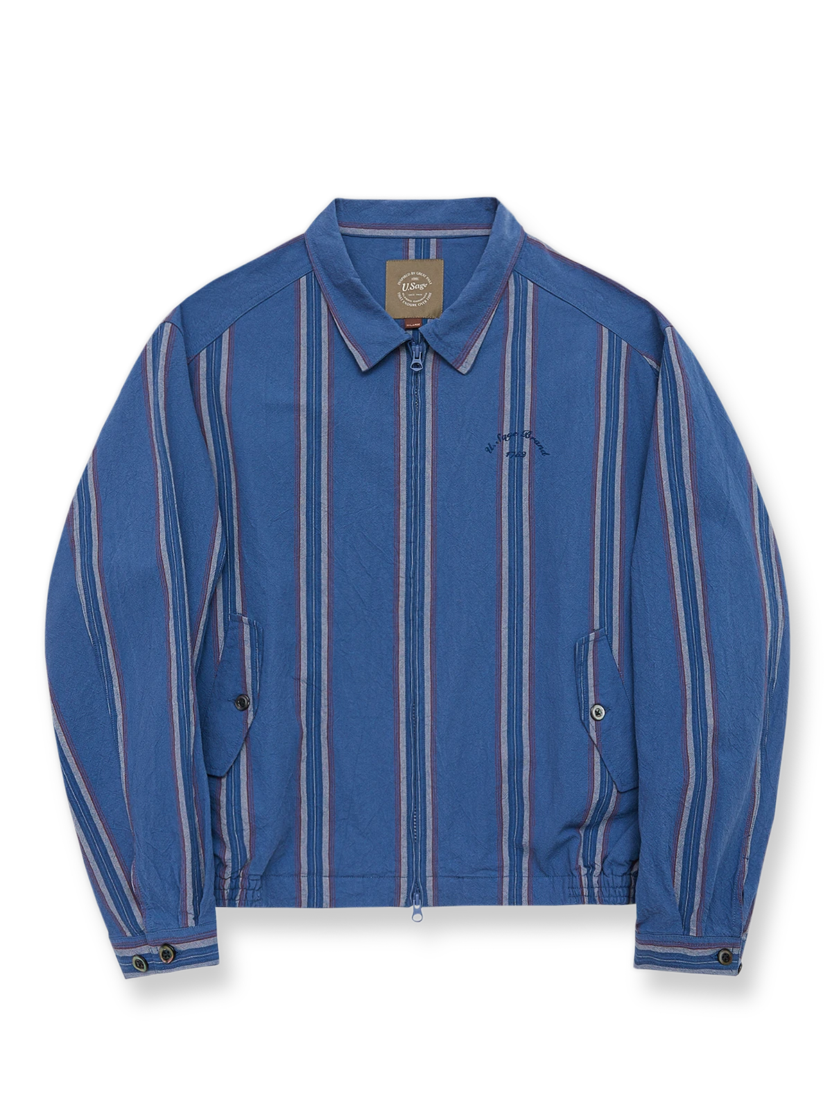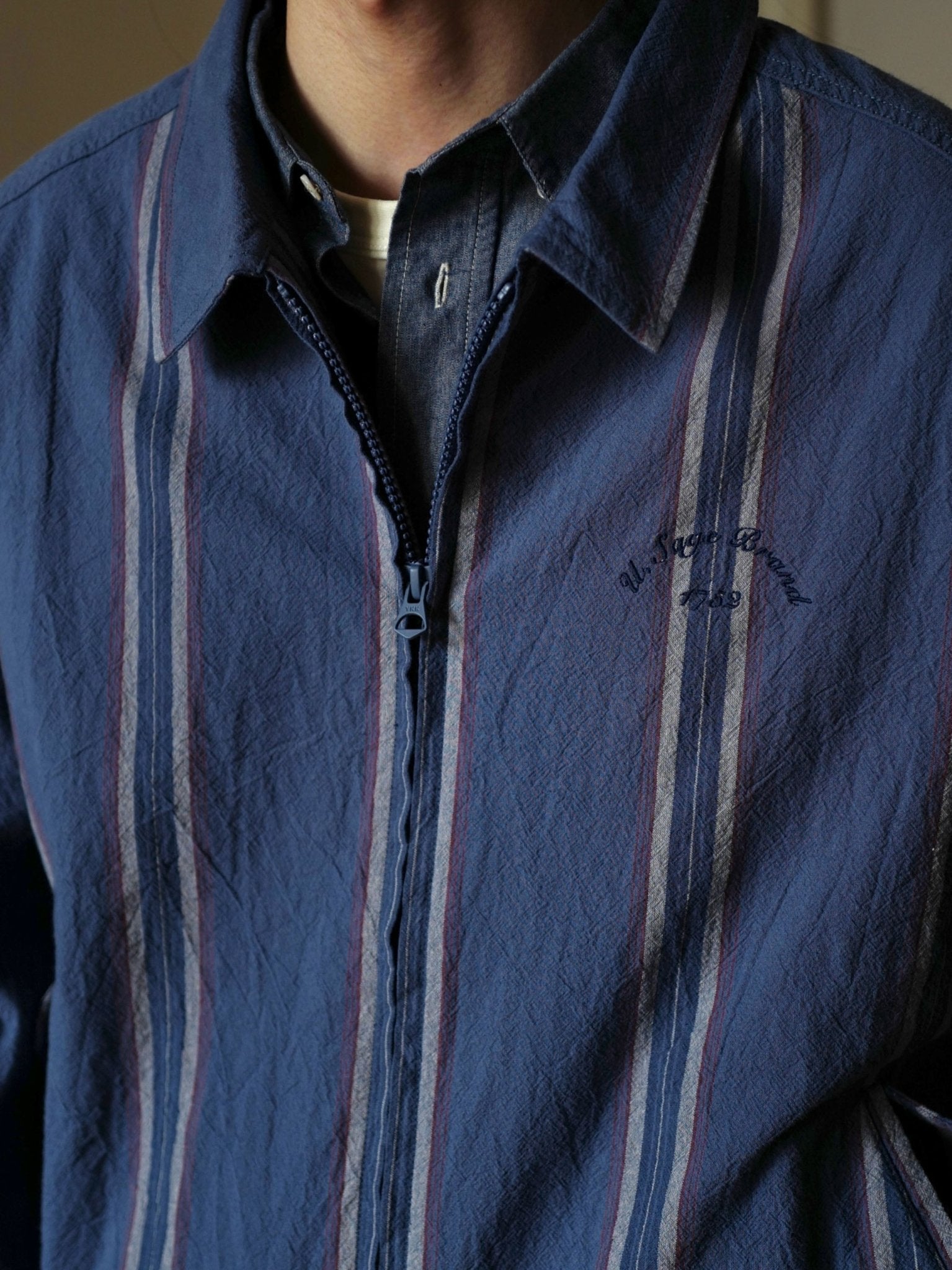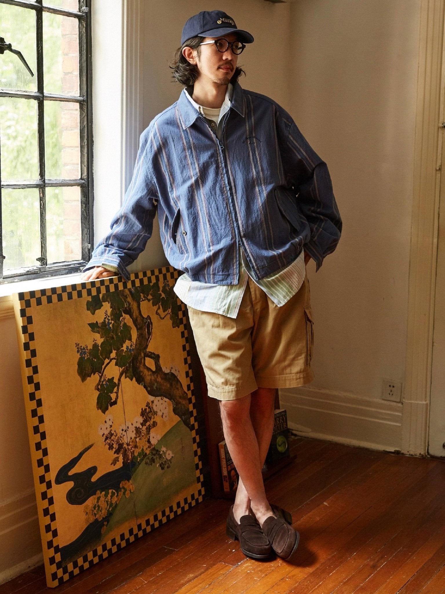 このジャケットは、ヴィンテージ風のショート&ワイドなカッティングを取り入れており、トレンディなスタイルに最適です。胸部にはマットな高密度刺繍が施されており、カーキとデニムブルーの組み合わせが、初秋の装いに特有のヴィンテージな紳士風を醸し出しています。
