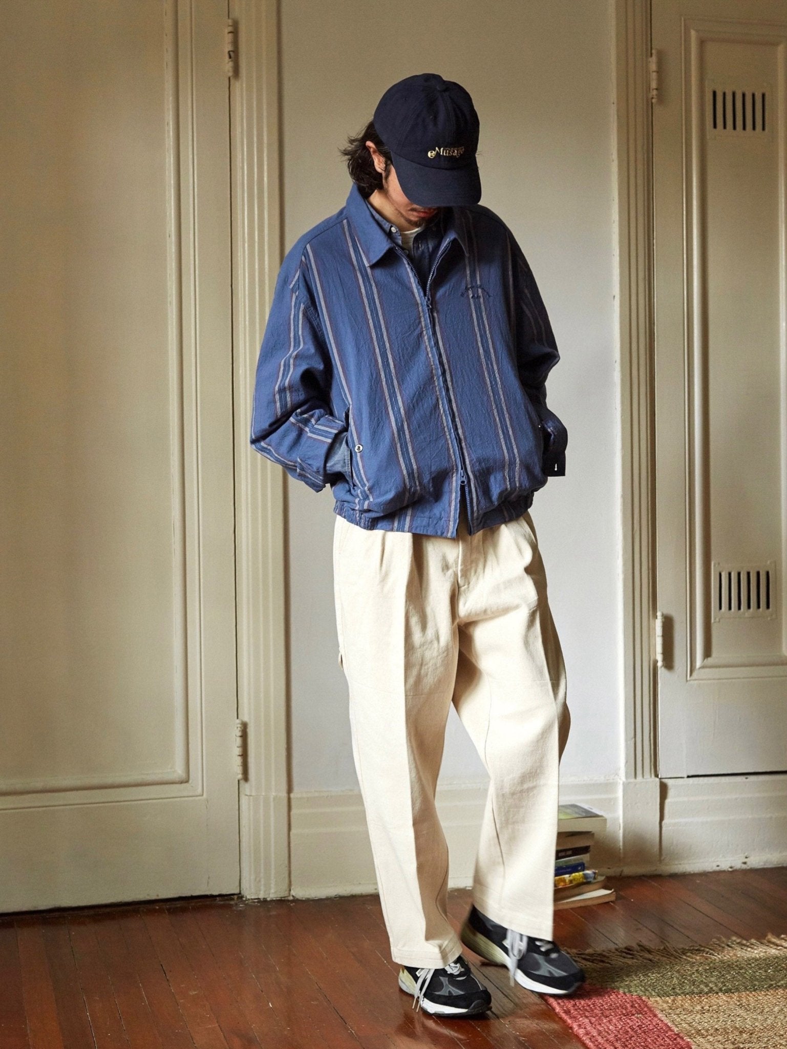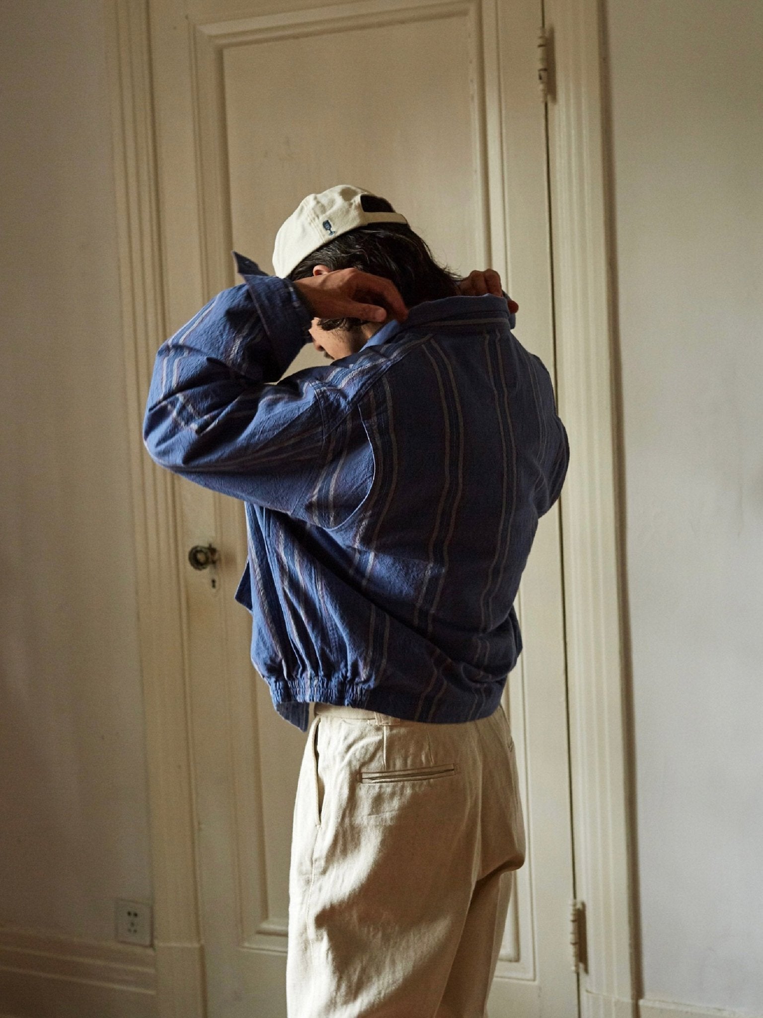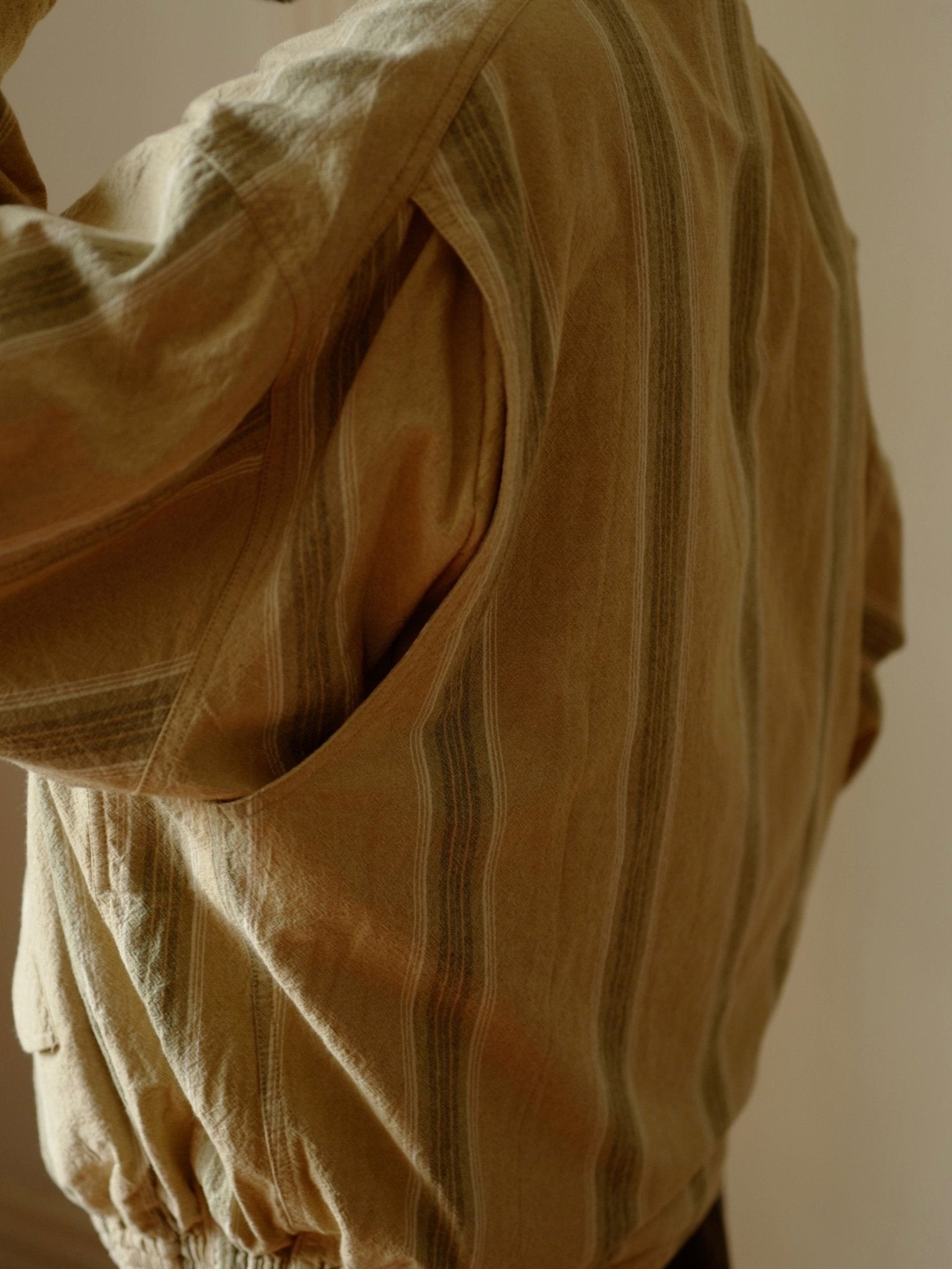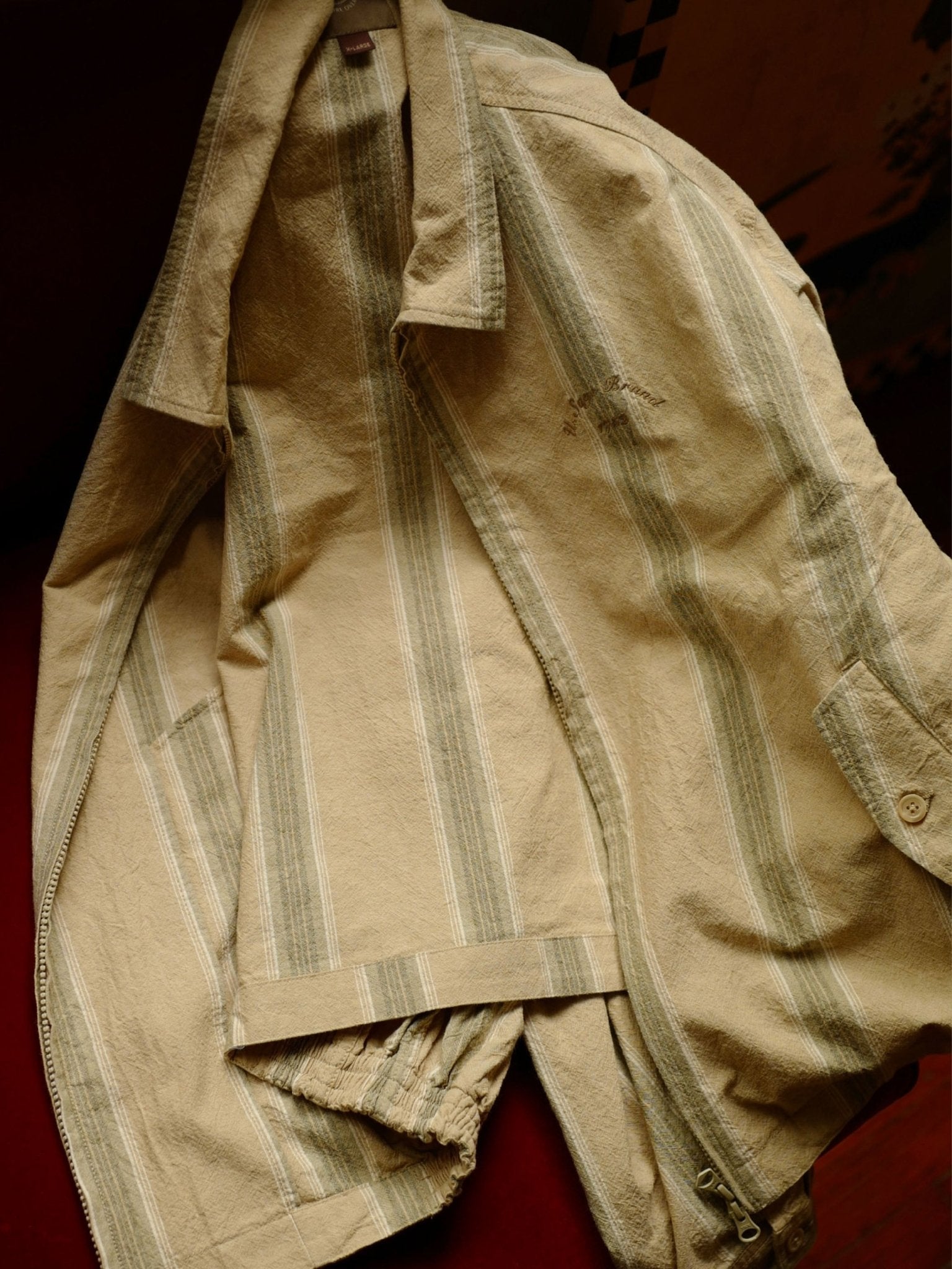 色の異なる太さの糸によるストライプ効果とウォッシュ加工によって、生地は古風なテクスチャを持ち、しっかりとした質感を保ちながらも層次感を増加させています。