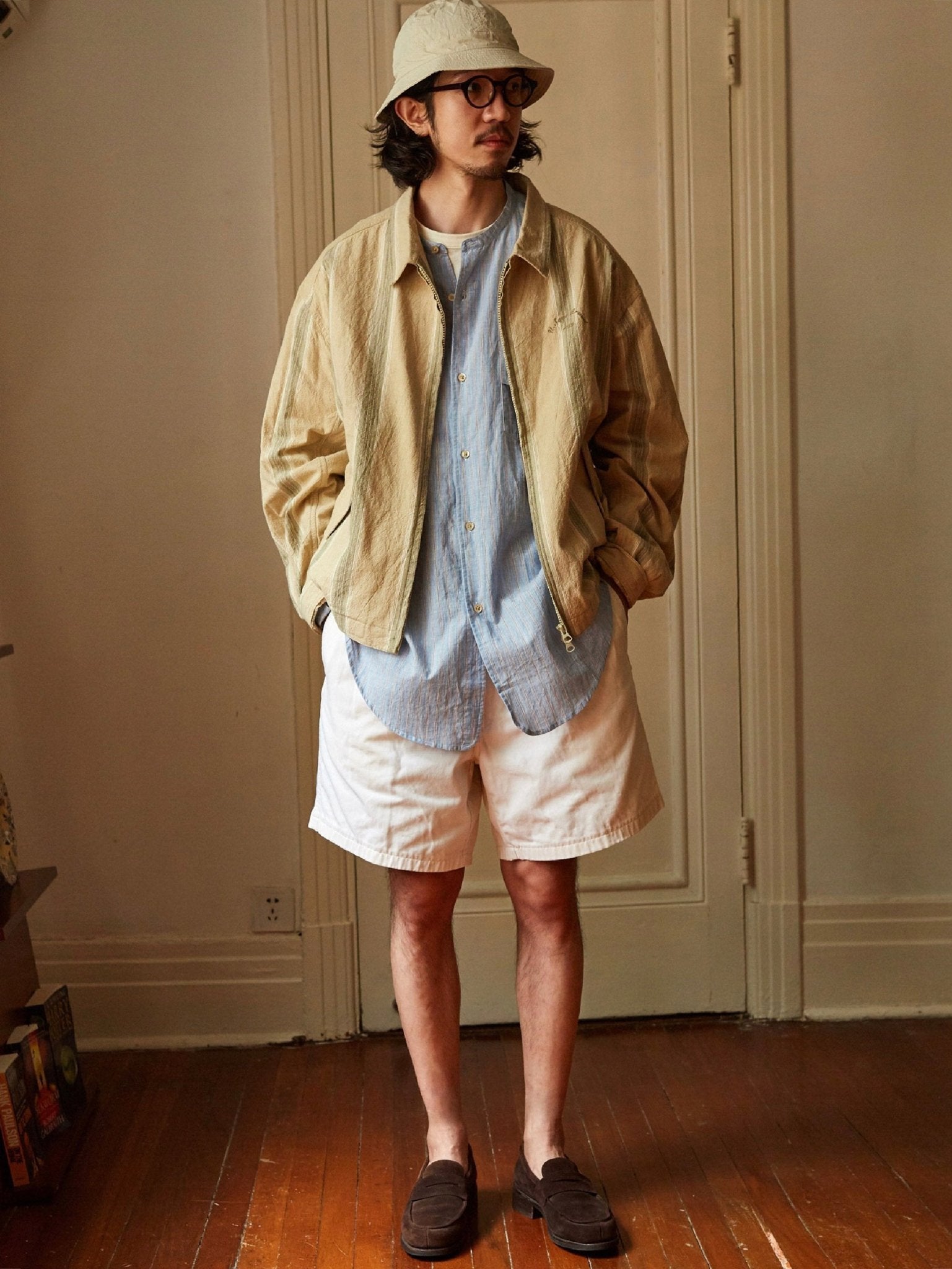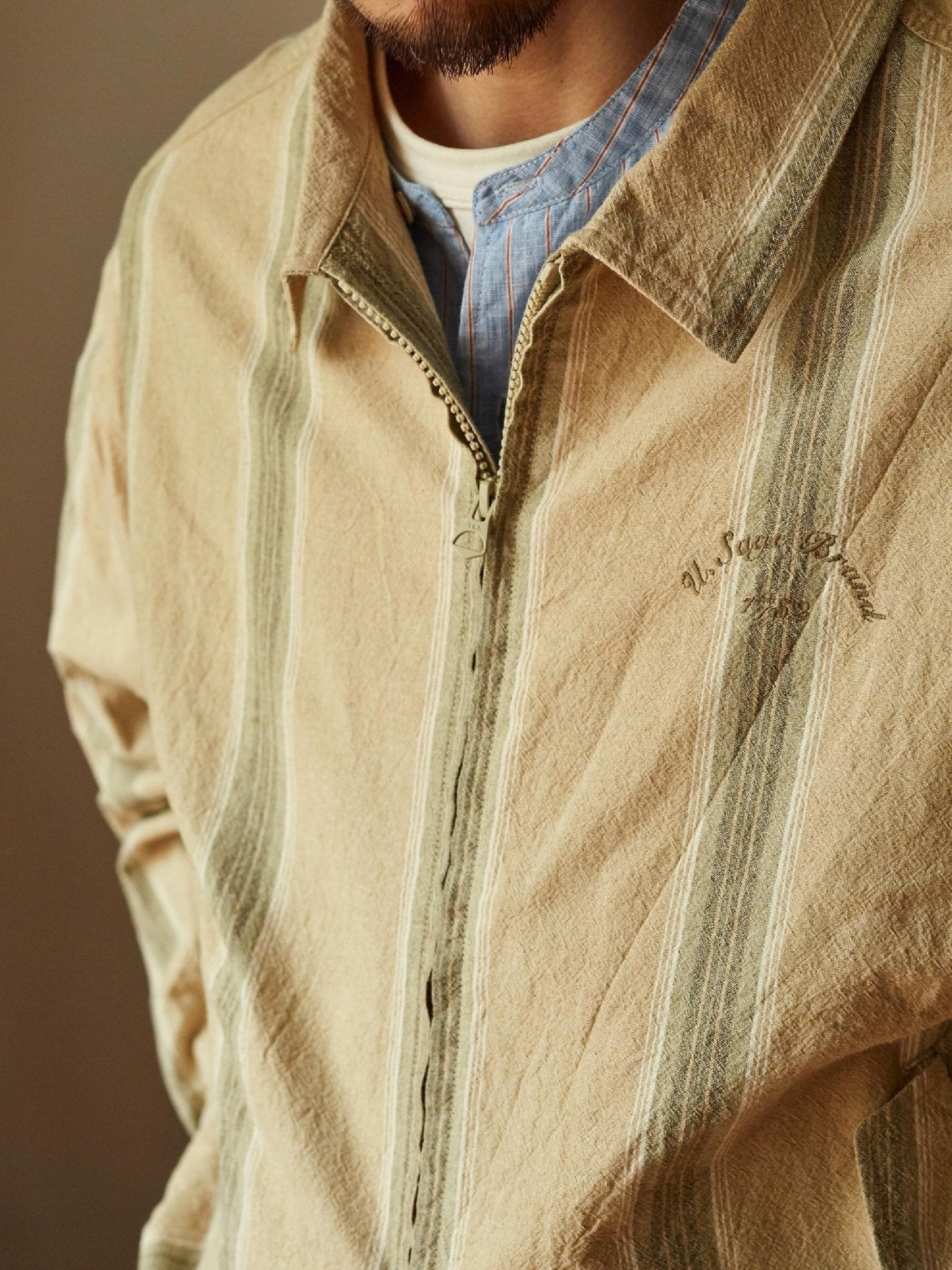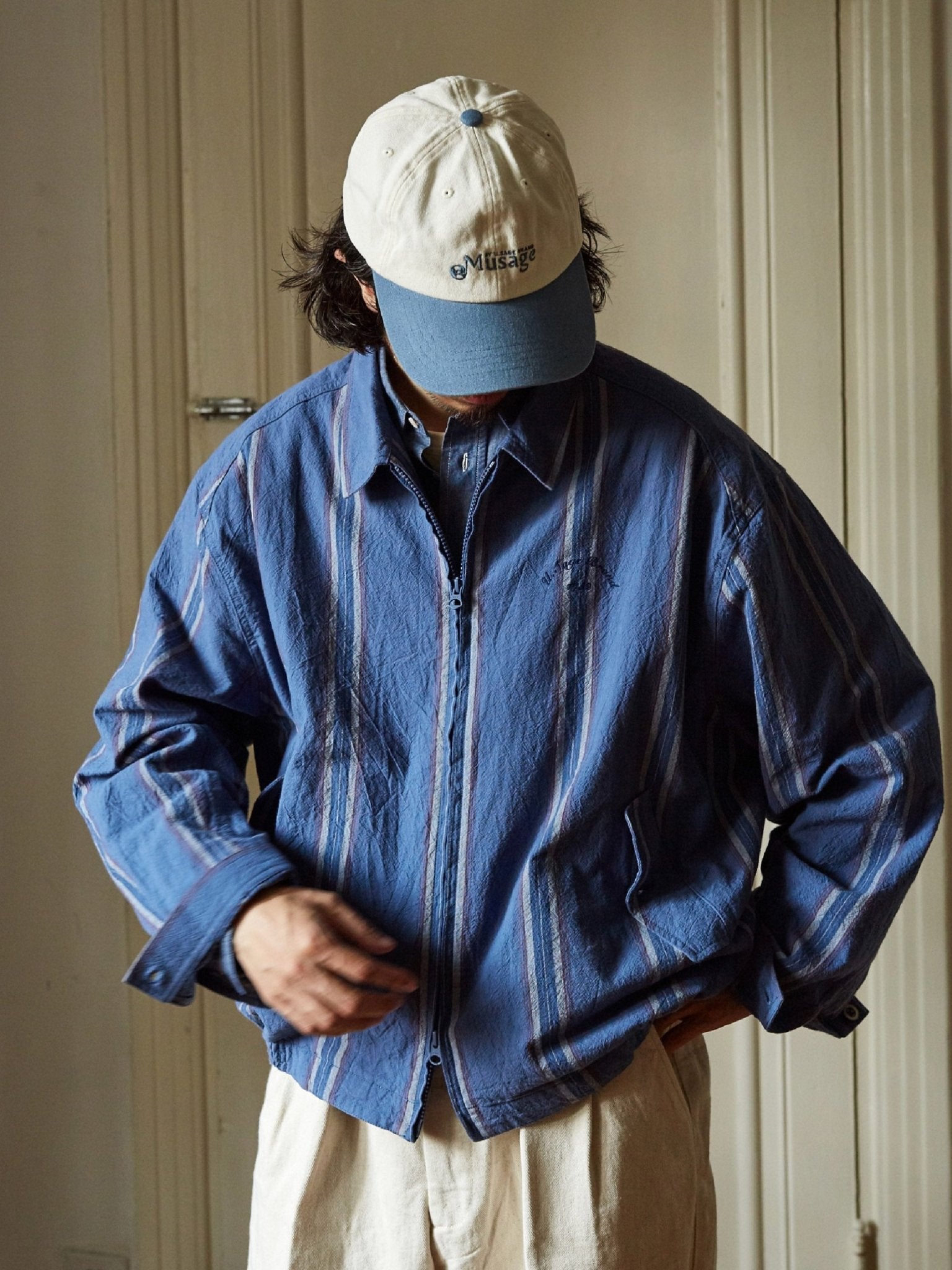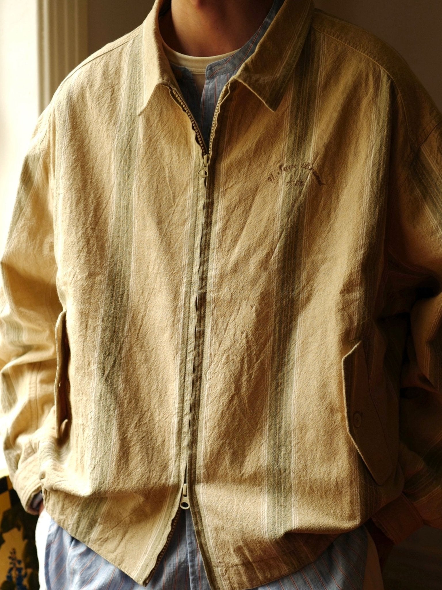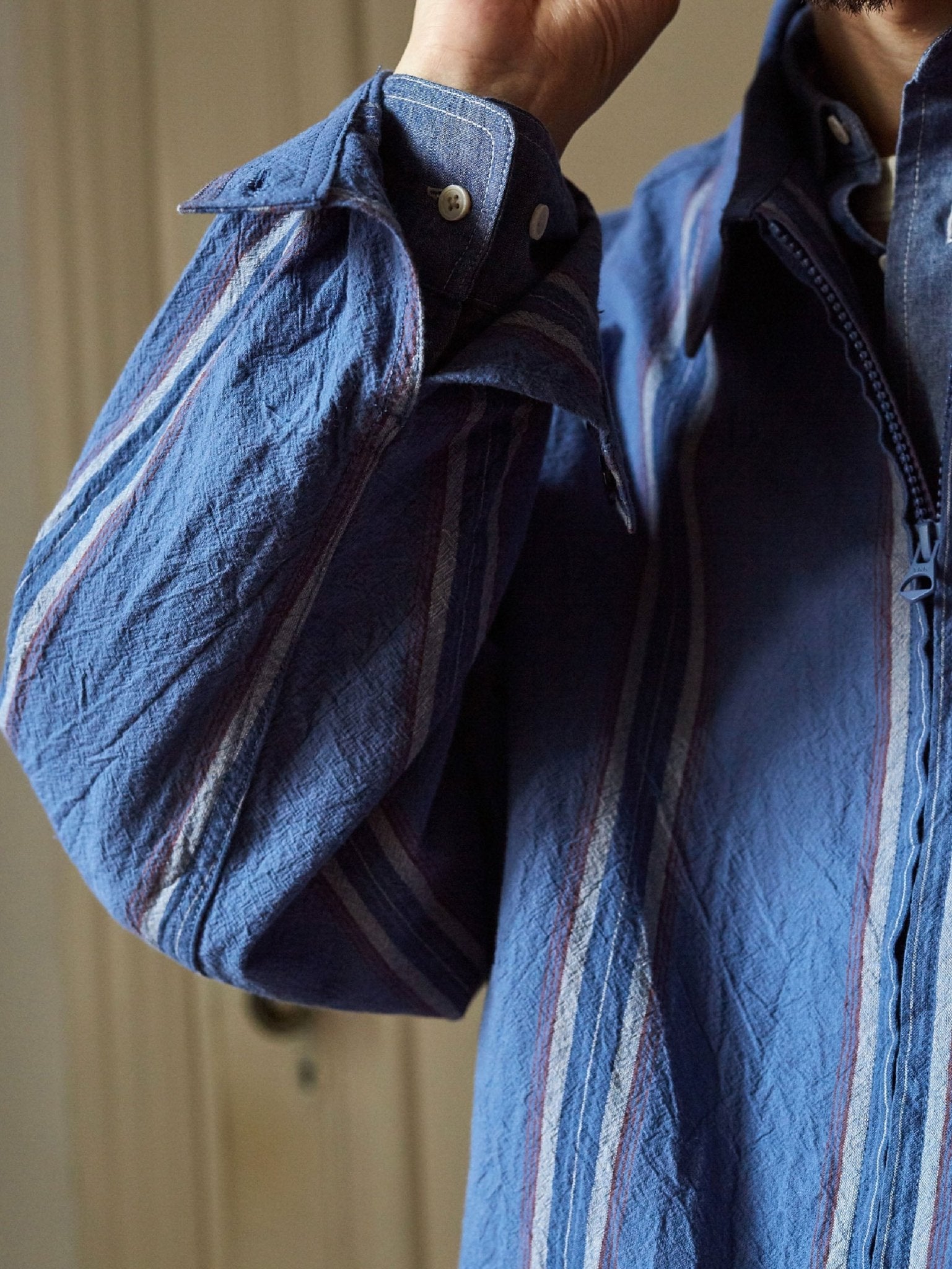 色の異なる太さの糸によるストライプ効果とウォッシュ加工によって、生地は古風なテクスチャを持ち、しっかりとした質感を保ちながらも層次感を増加させています。
