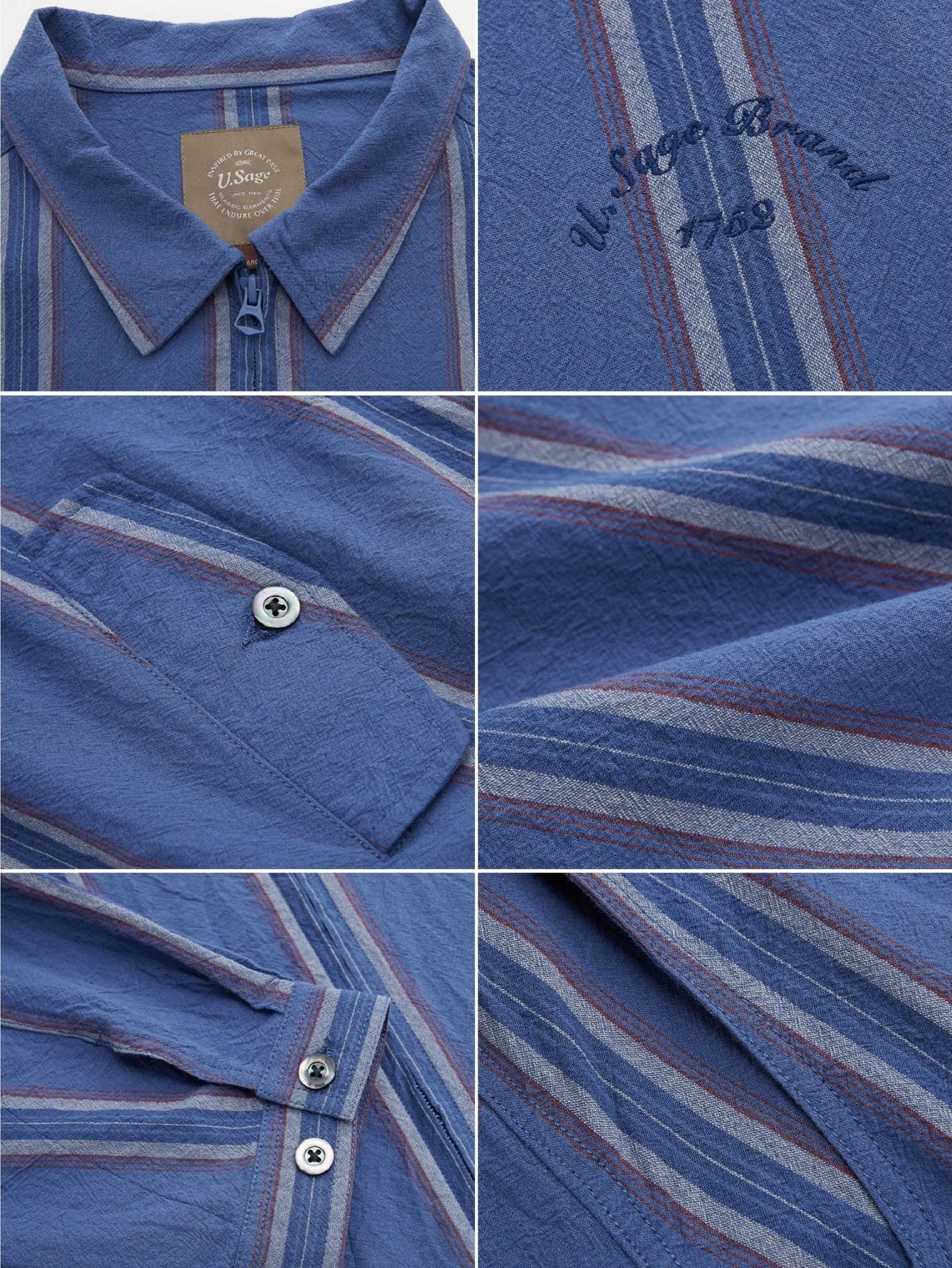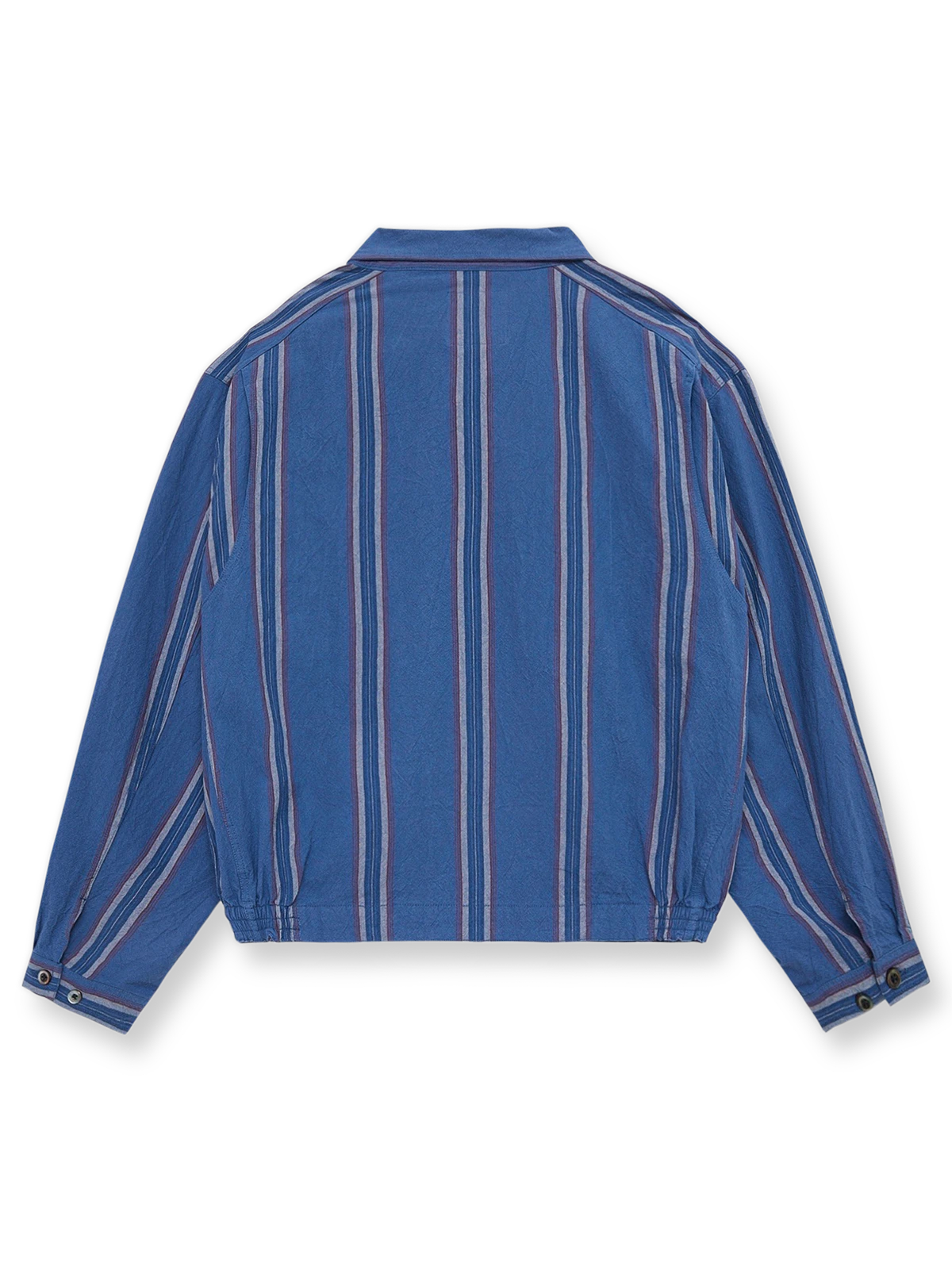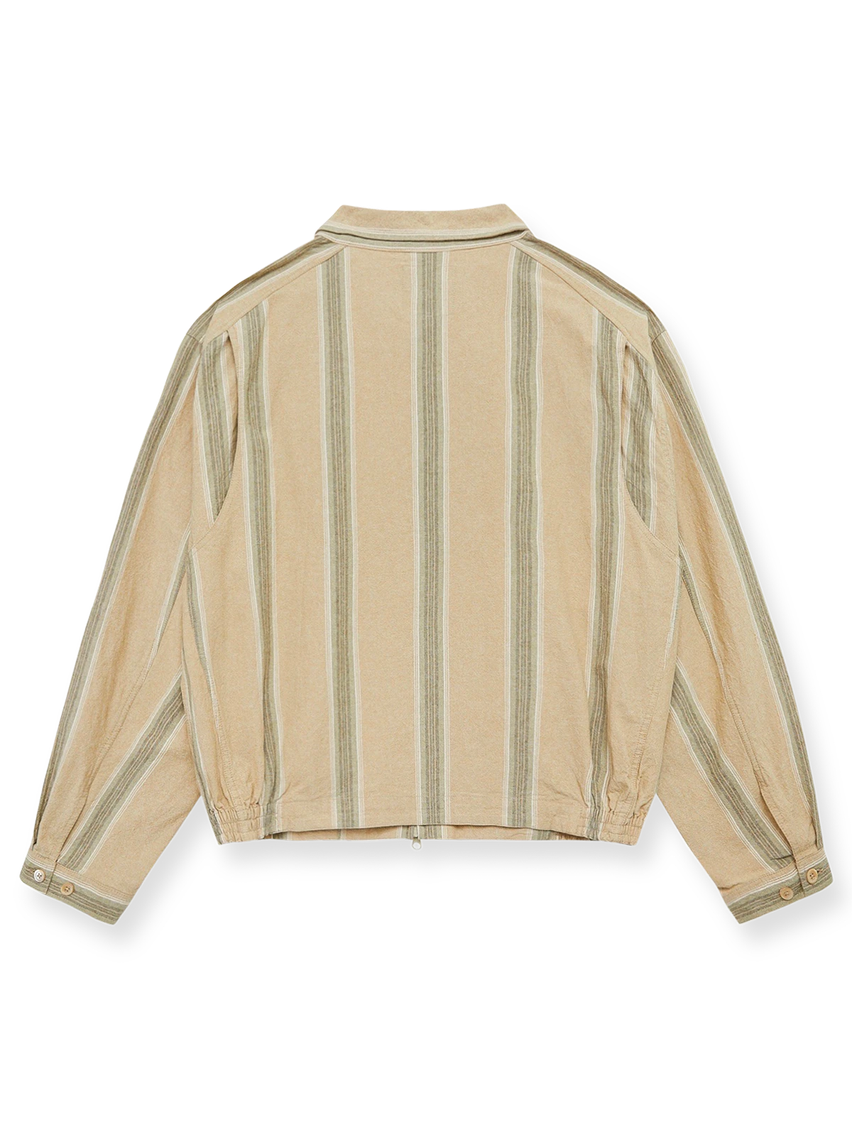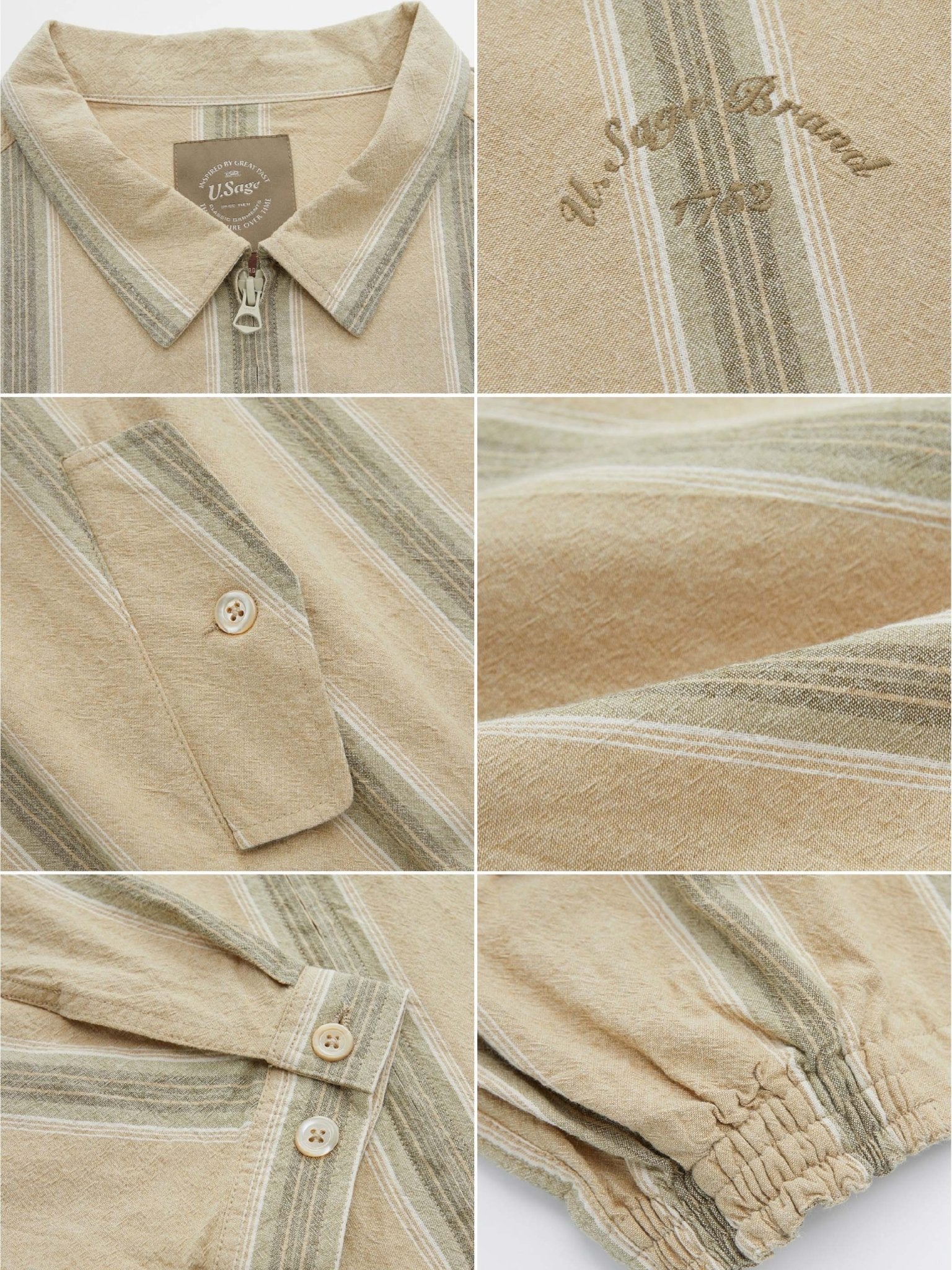 色の異なる太さの糸によるストライプ効果とウォッシュ加工によって、生地は古風なテクスチャを持ち、しっかりとした質感を保ちながらも層次感を増加させています。