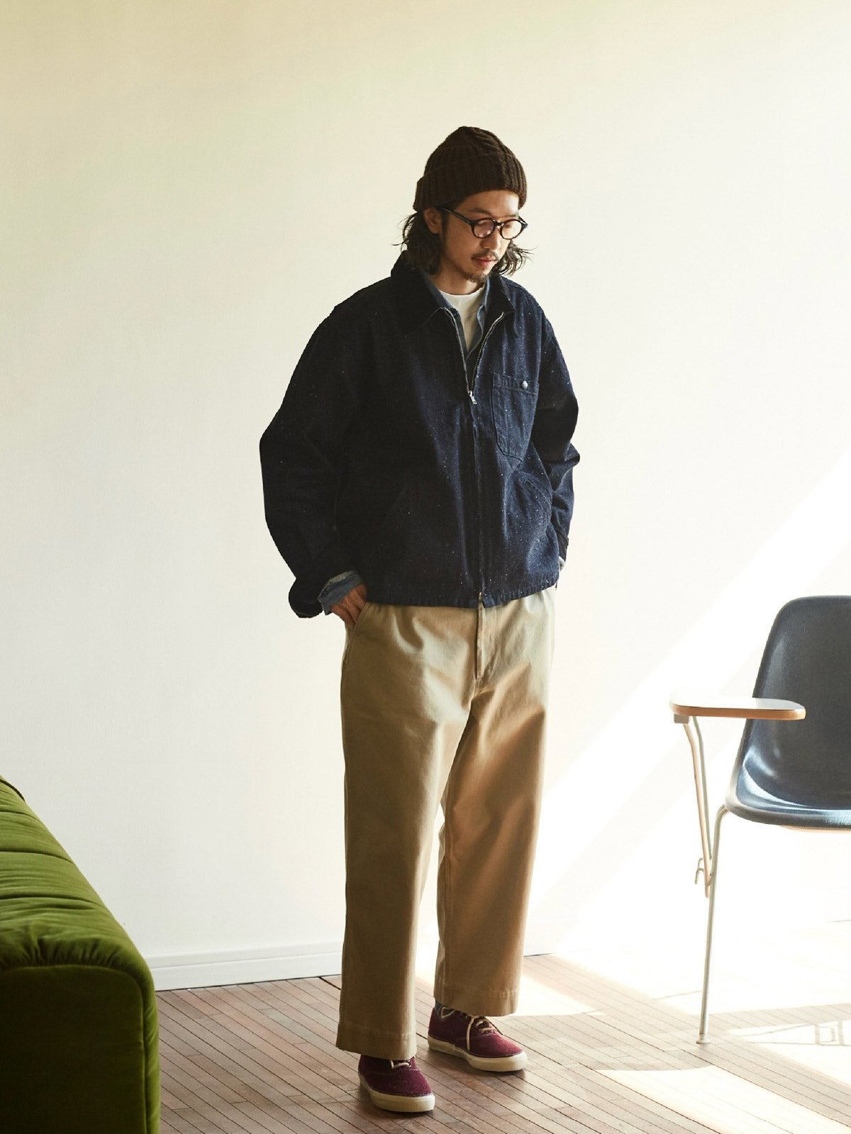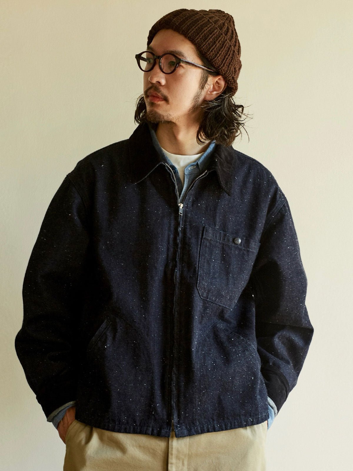 このジャケットは、1929年から1970年代の91-Bジャケットからインスピレーションを得て、PESSOAが伝統的なワークジャケットの要素を取り入れて新たな命を吹き込みました。斜めのジップポケットと斜めのパッチポケットのクラシックなデザインを保持し、Conmarジッパーを使用したフロントはレトロで実用的です。