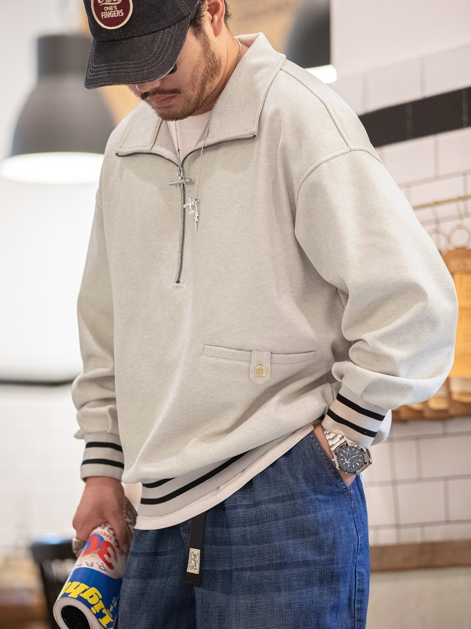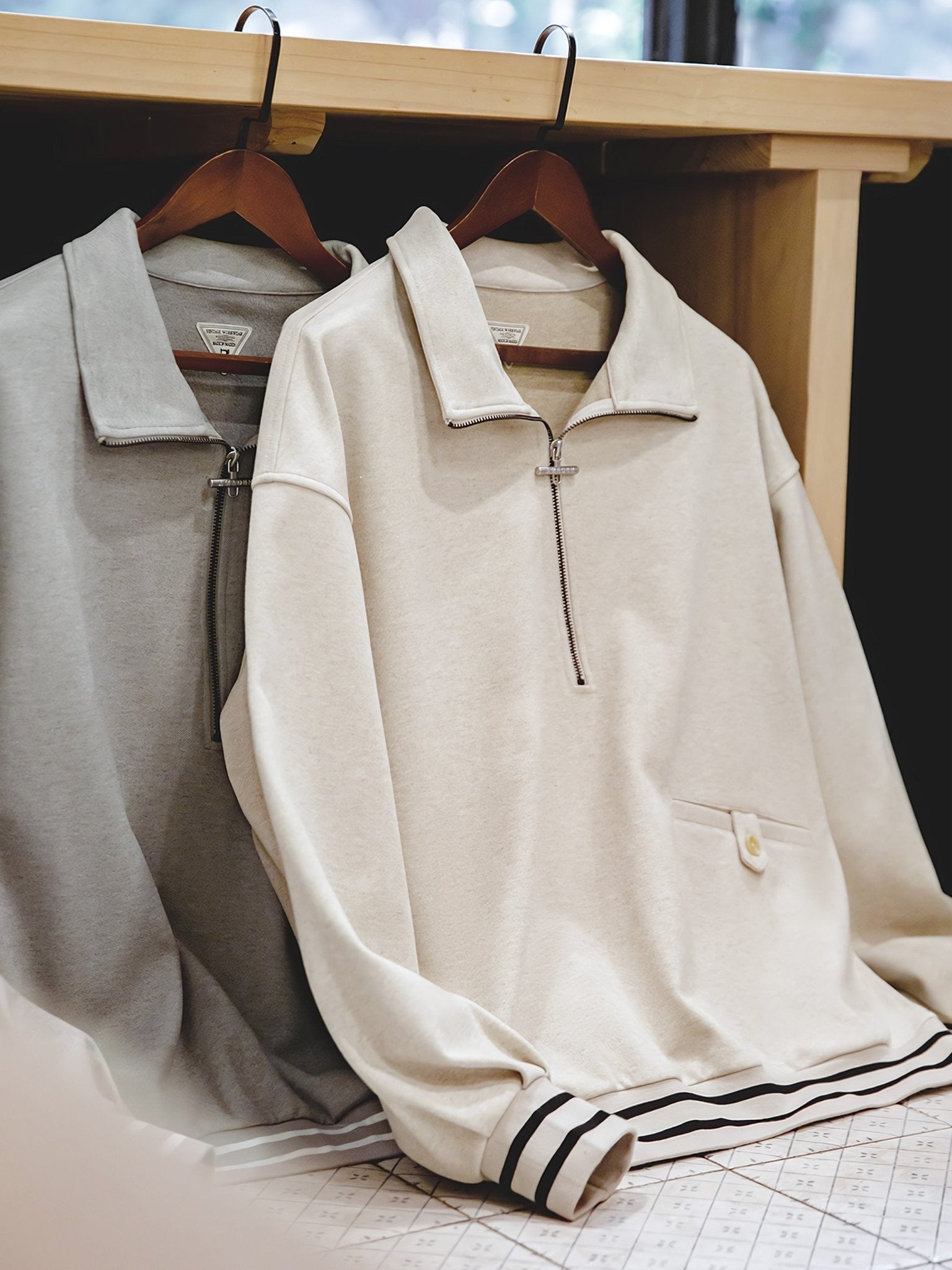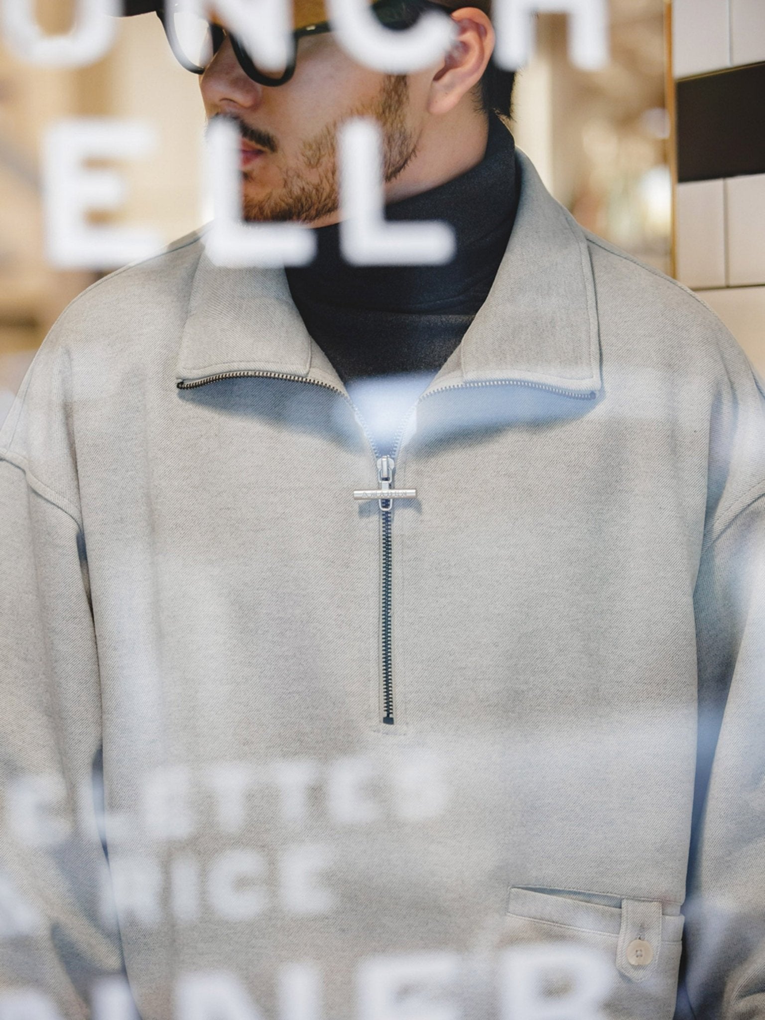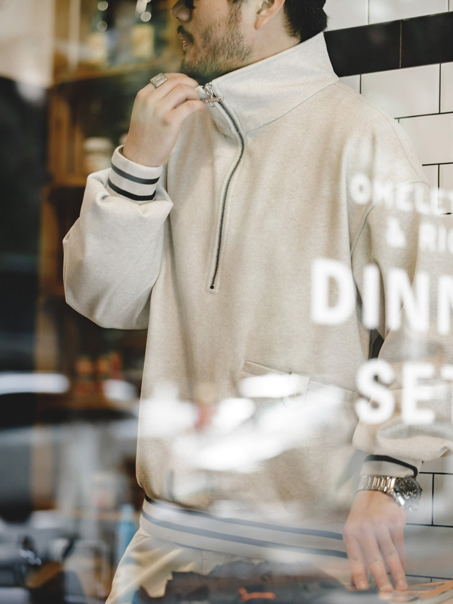 ハーフジップ襟開きのフーディは快適なシルエットデザインを採用し、襟を立てたり畳んだりと異なる着こなしを楽しめます。