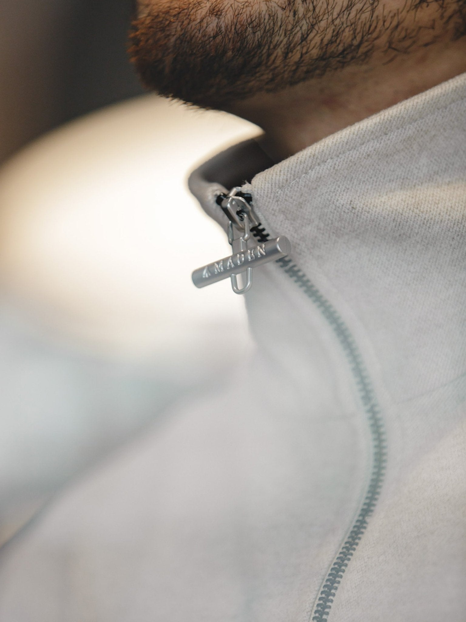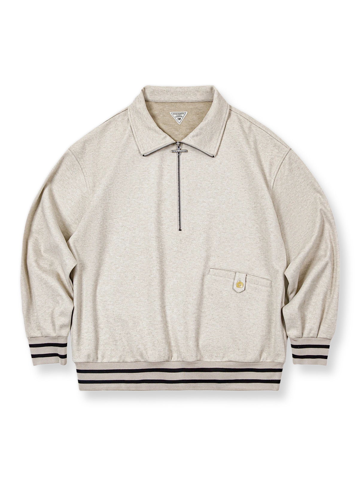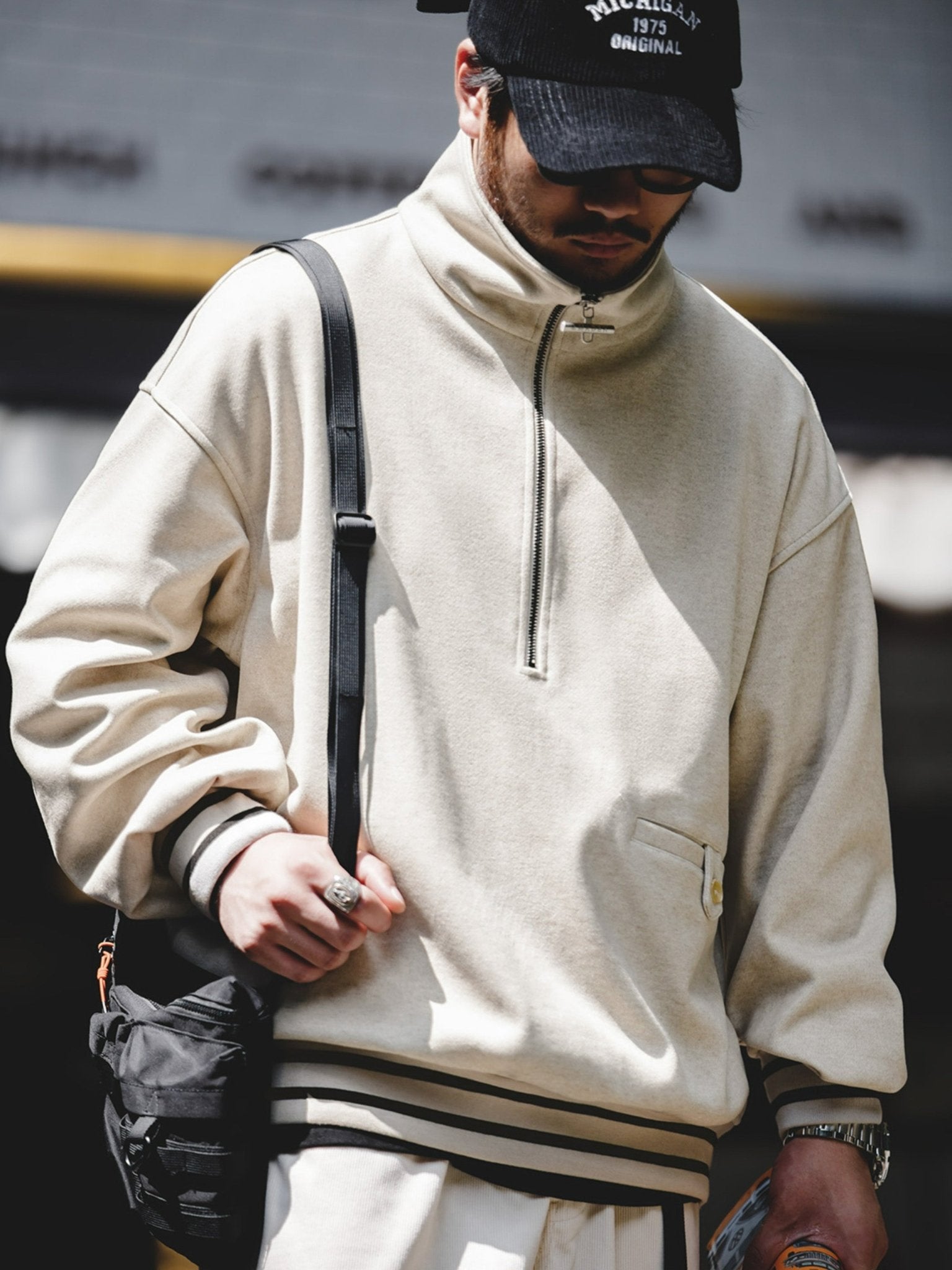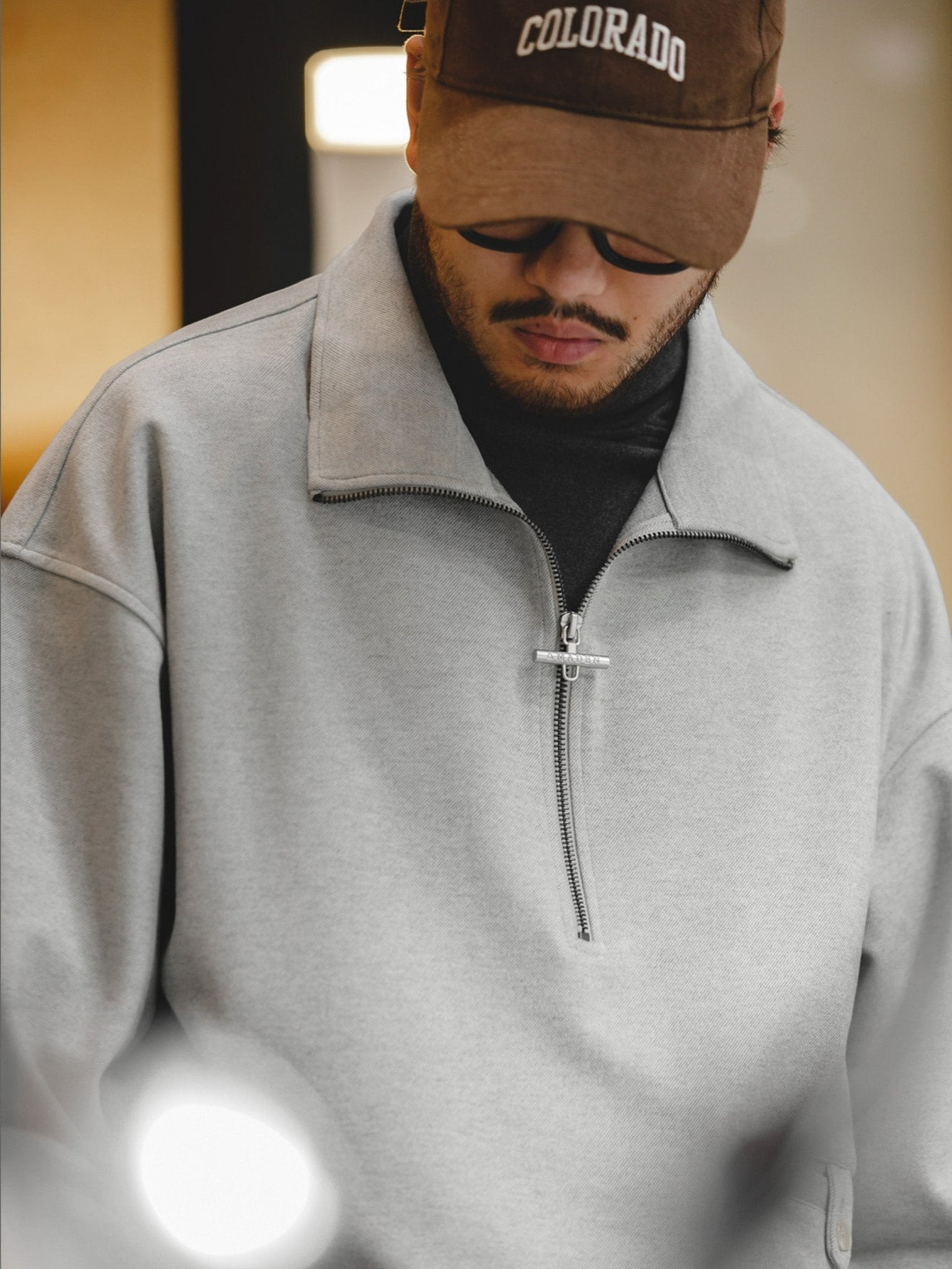 ハーフジップ襟開きのフーディは快適なシルエットデザインを採用し、襟を立てたり畳んだりと異なる着こなしを楽しめます。