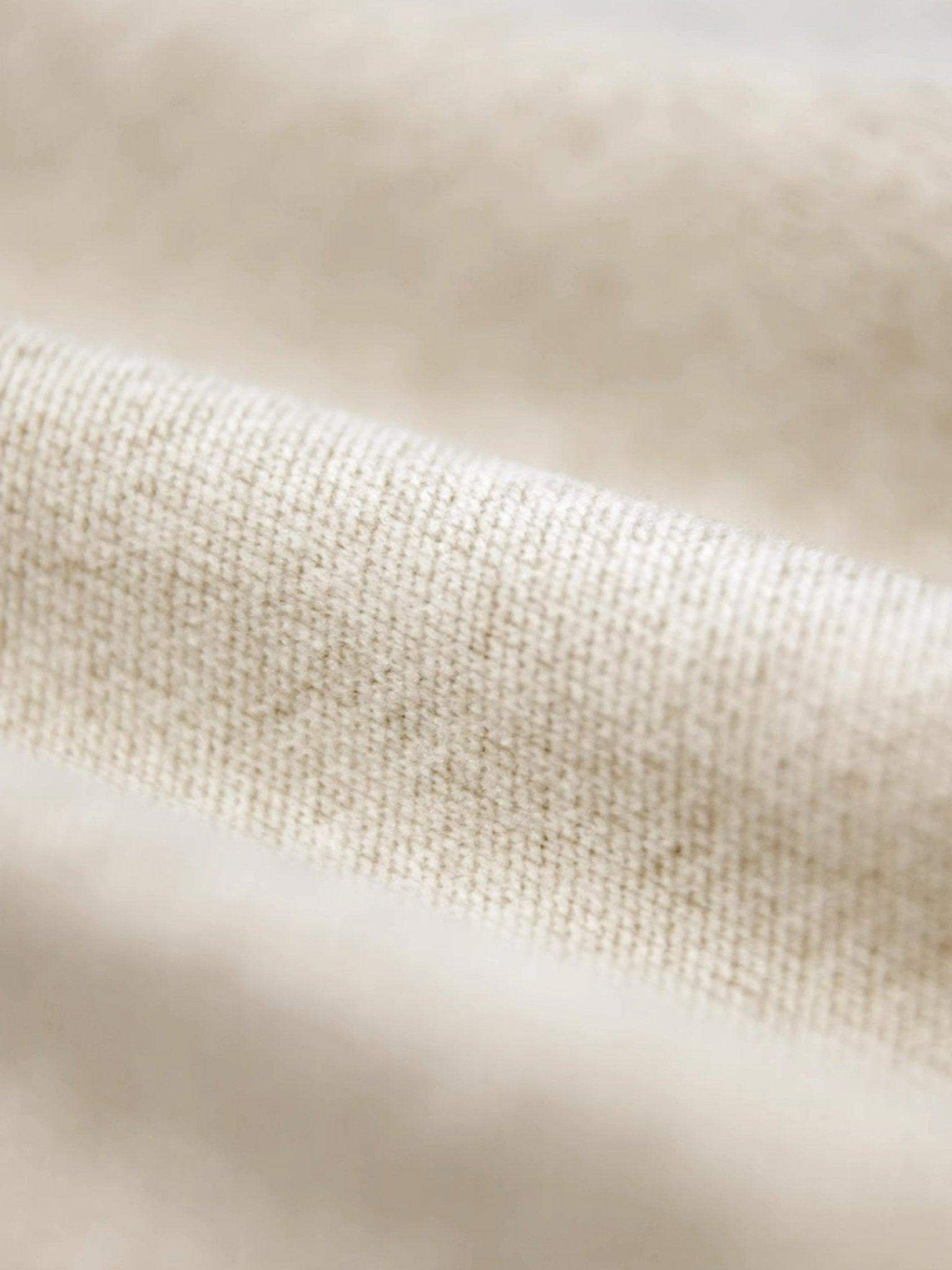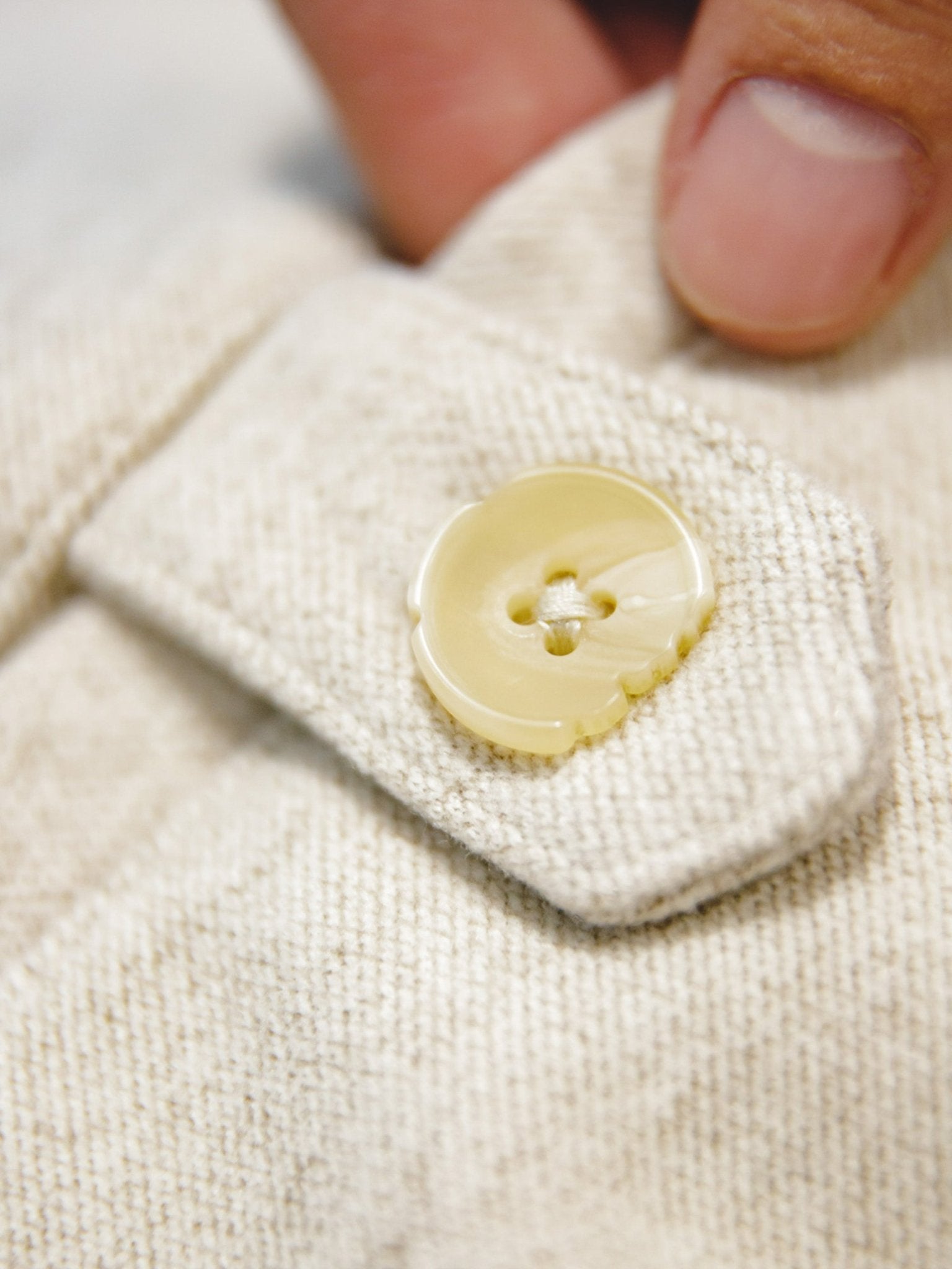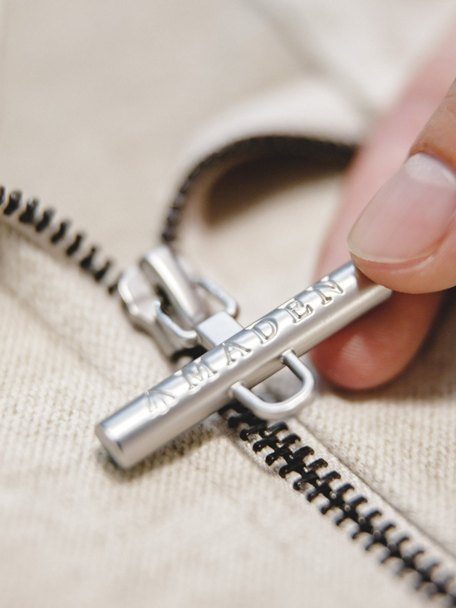 カスタムのヴィンテージ風ファスナーヘッドがワークウェア感を増し、不規則なカットの樹脂ボタンがフーディにユニークな質感をもたらします。