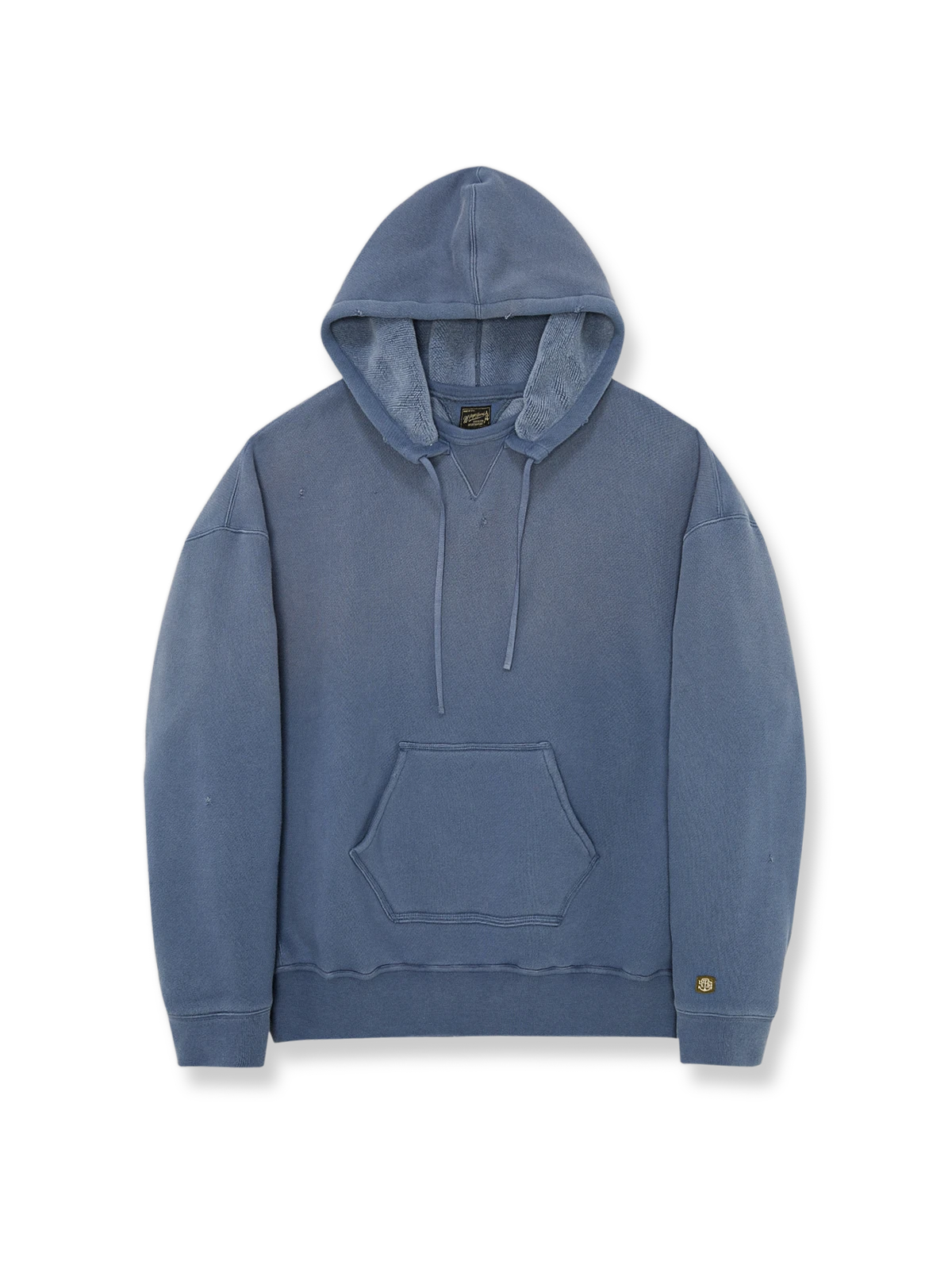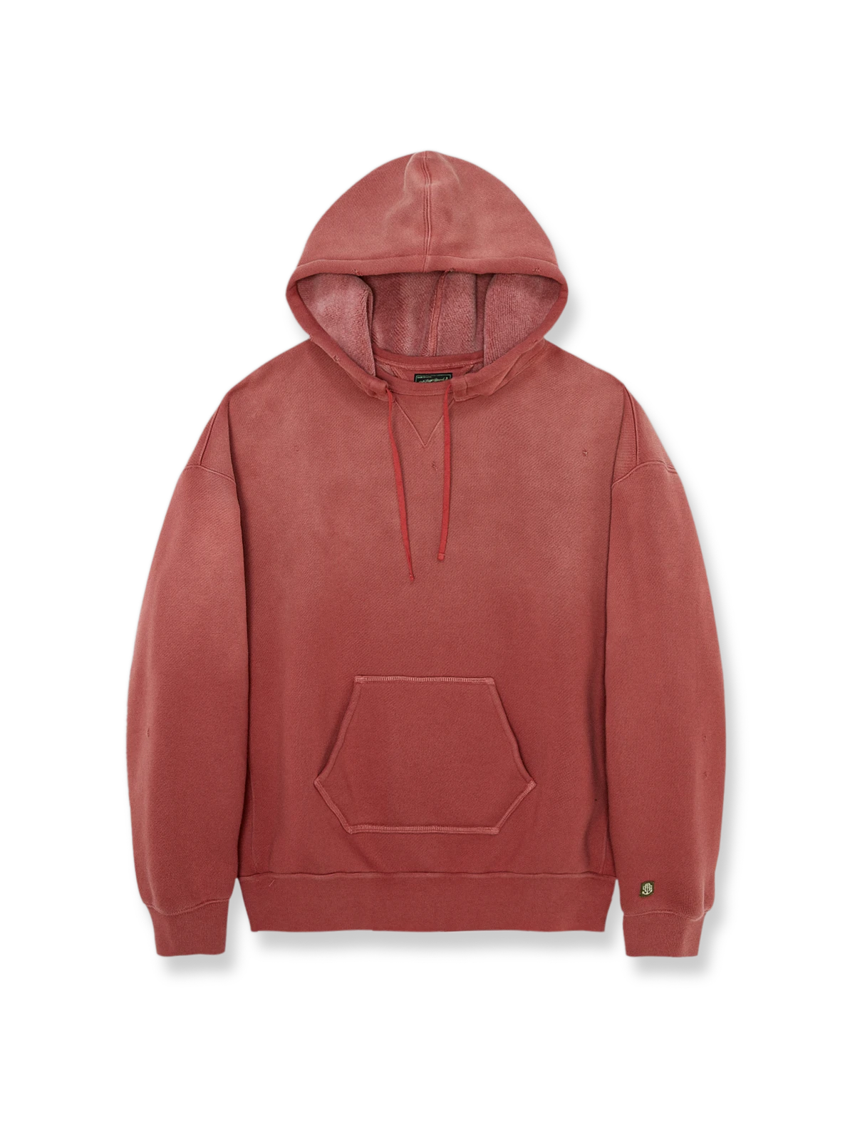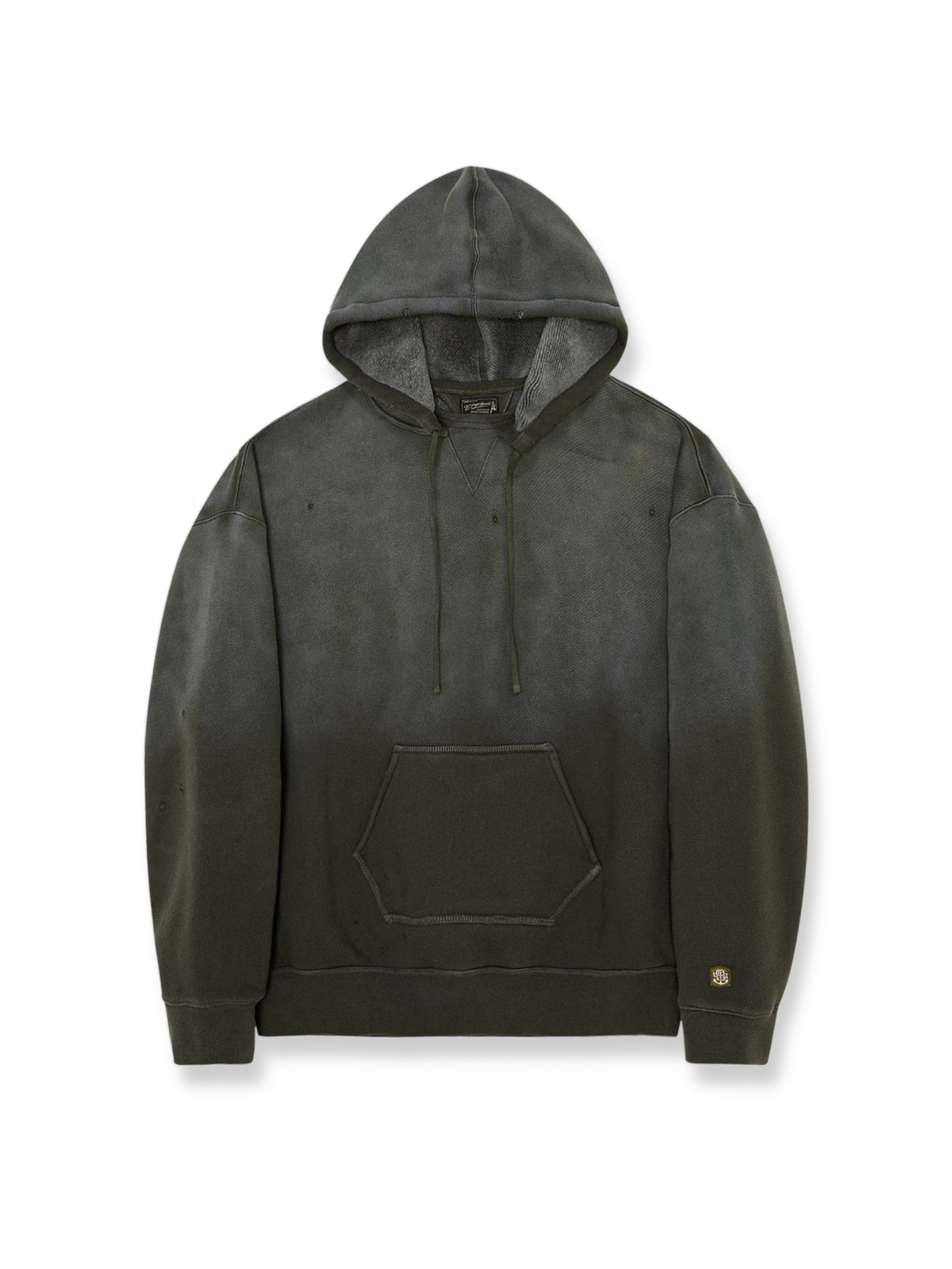 このスウェットは、アンティーク風の古着風デザインで、徐々に色あせるエフェクトが特徴で、レトロな要素と現代のカジュアルスタイルを融合させています。グラデーションのフェード効果は、自然な摩耗と時の経過によく見られるレトロファッションの美学に対応しています。
