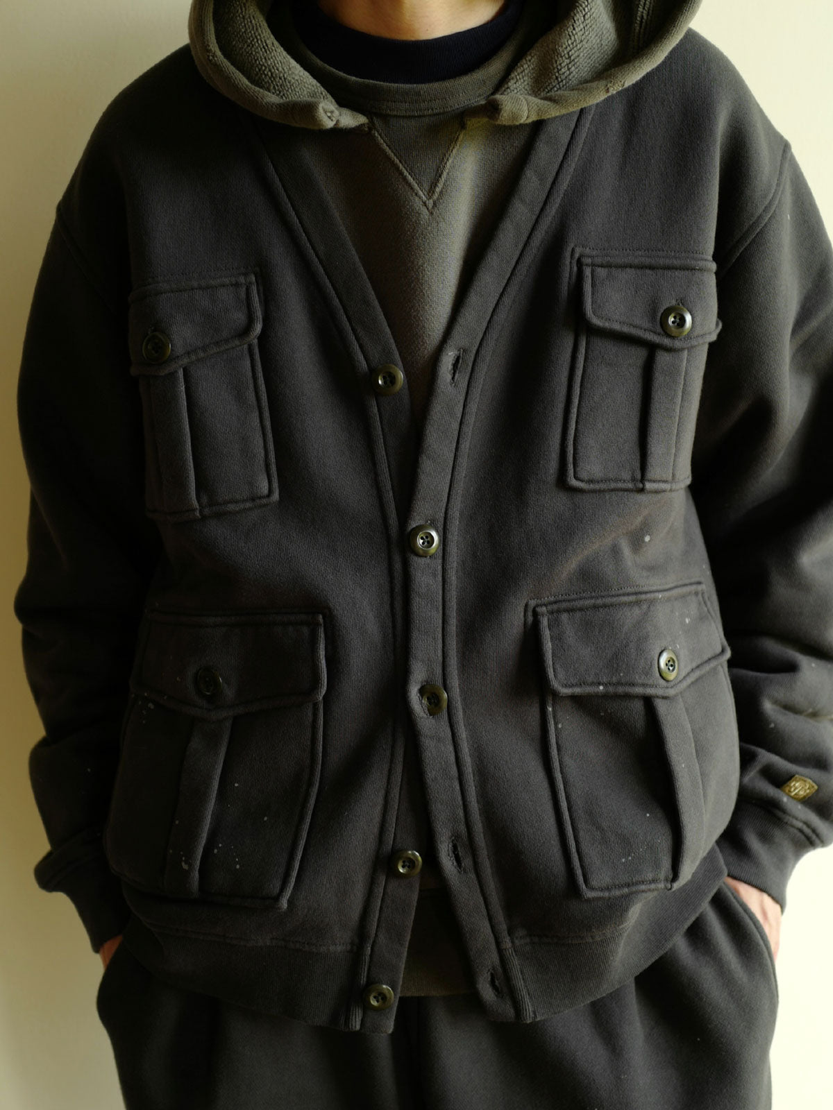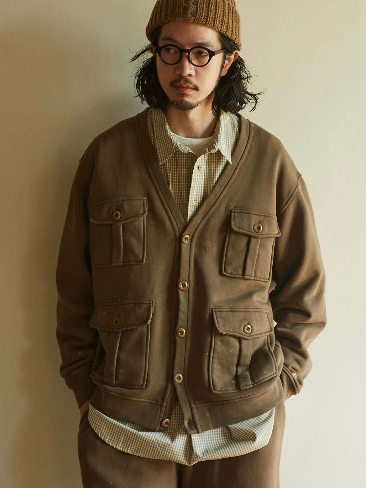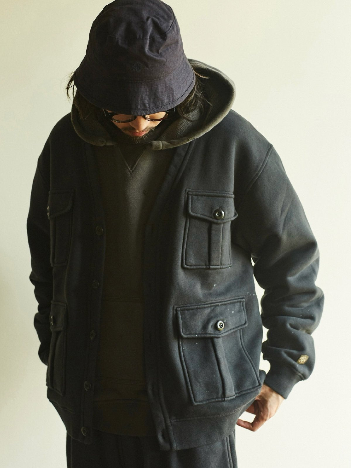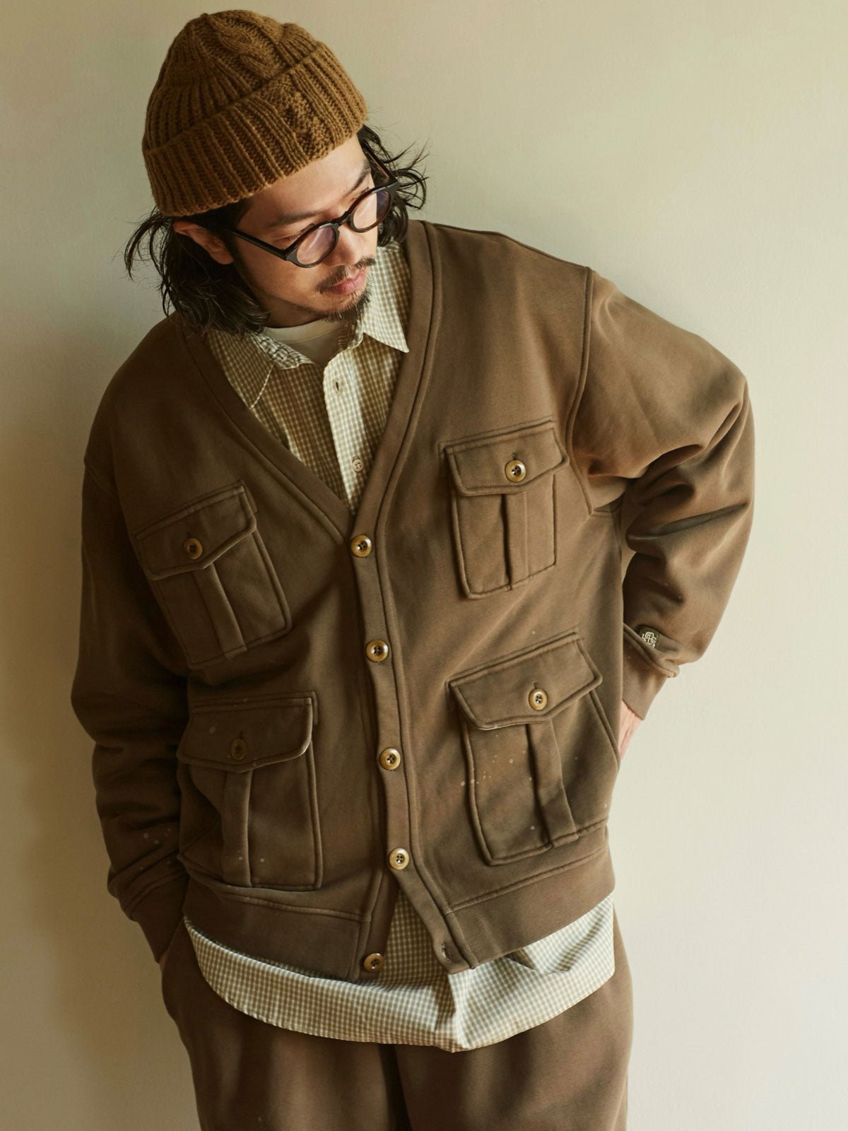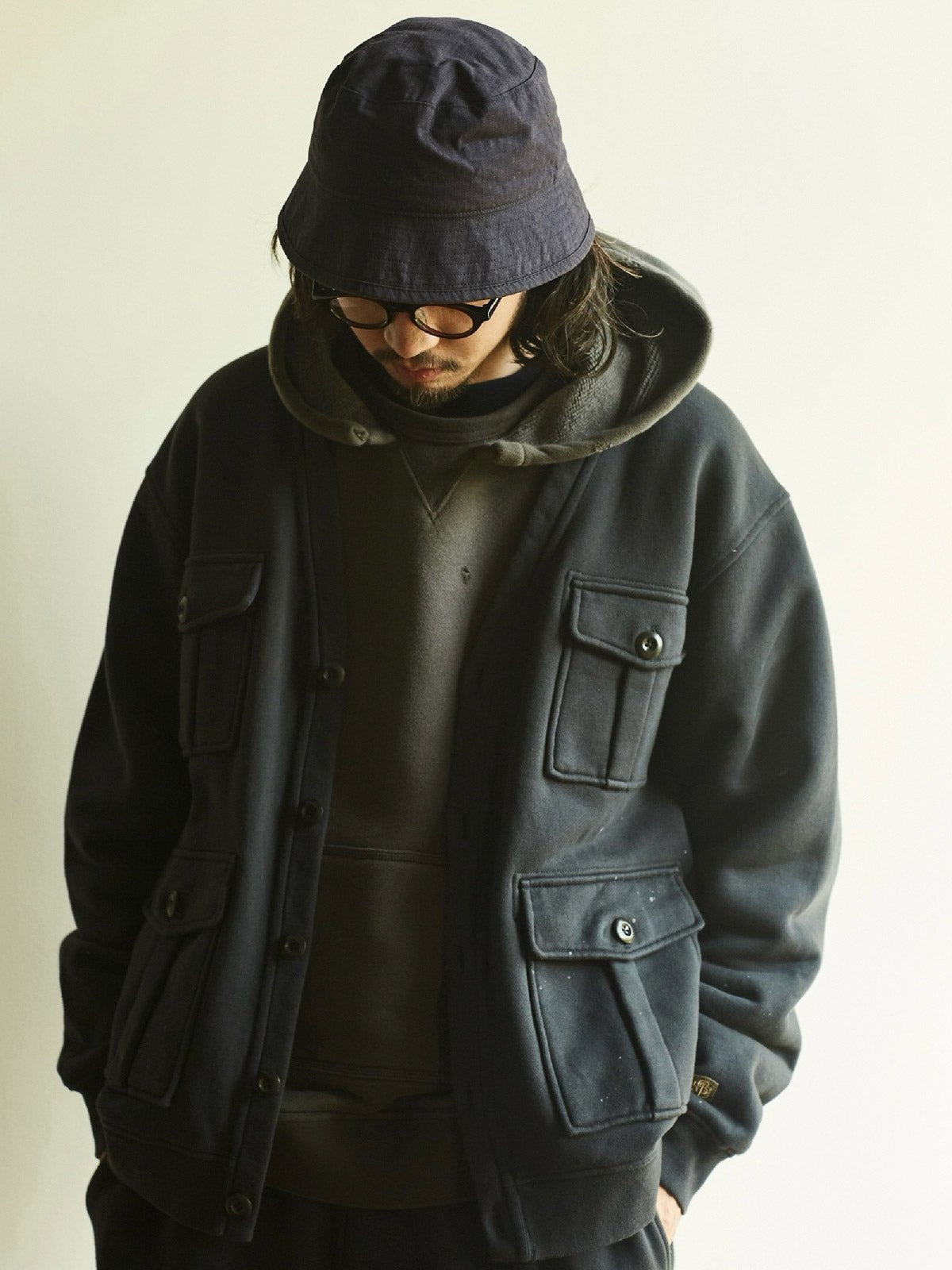 このオープンカーディガンスウェットは、伝統的な英国の軍官用ウールニットベストからインスピレーションを得ており、「Cardigan」という名前はウェールズの「Ceredigion」に由来しています。PESSOAはスウェット生地とハンティングスタイルを融合させ、タフな外観のオープンカーディガンを作り出しました。