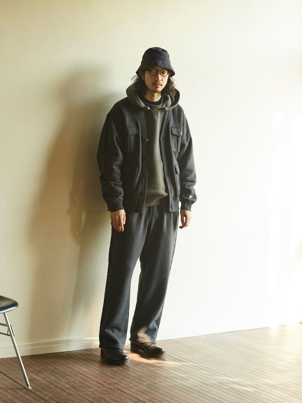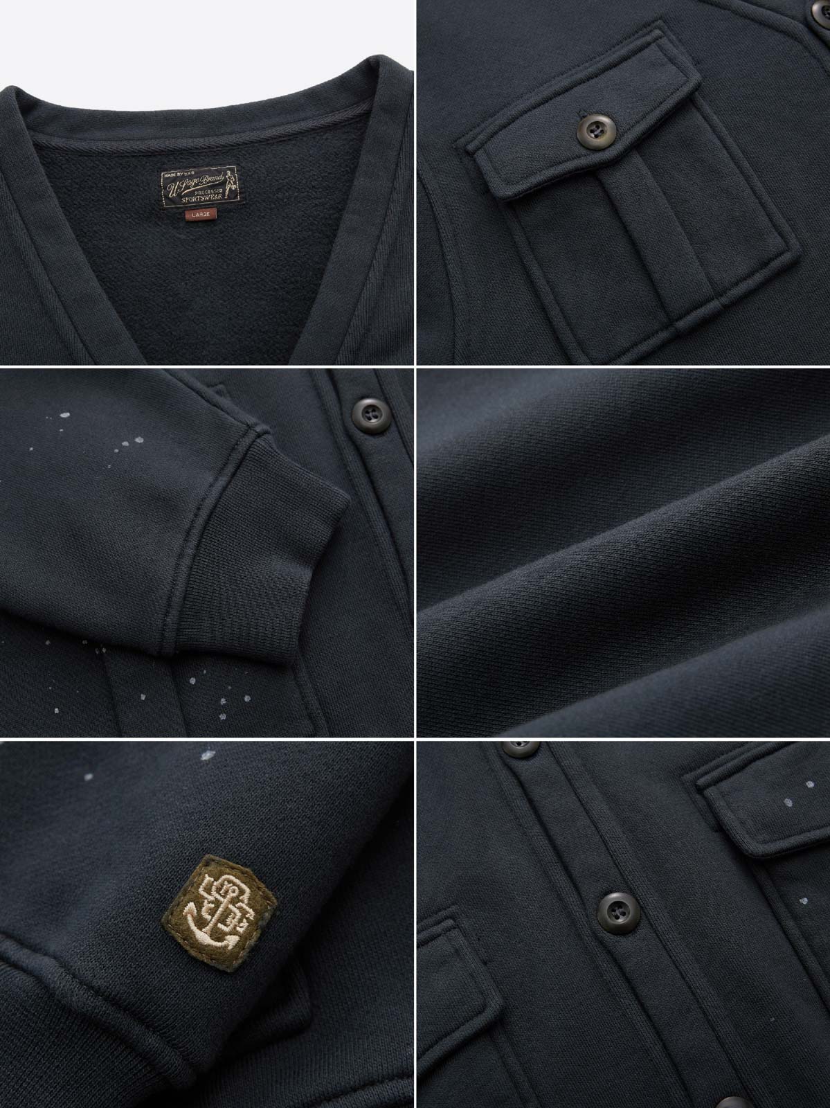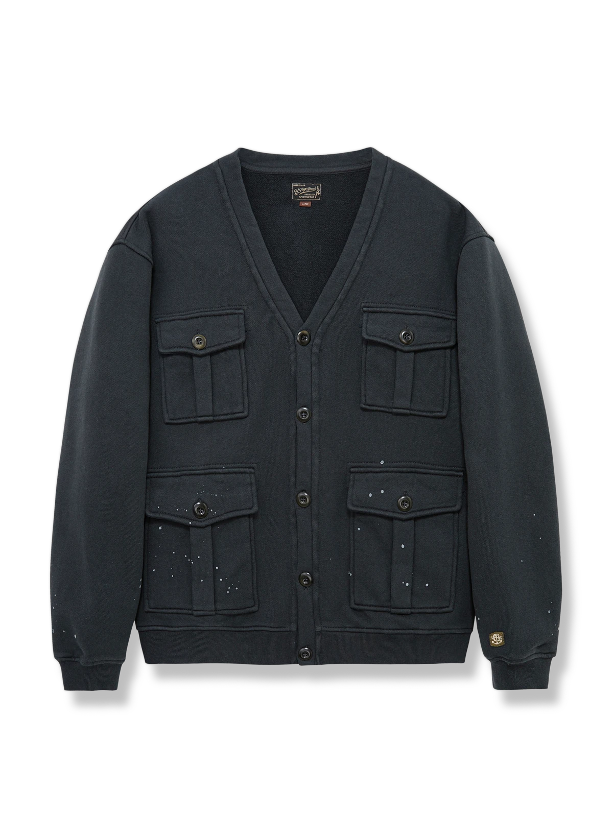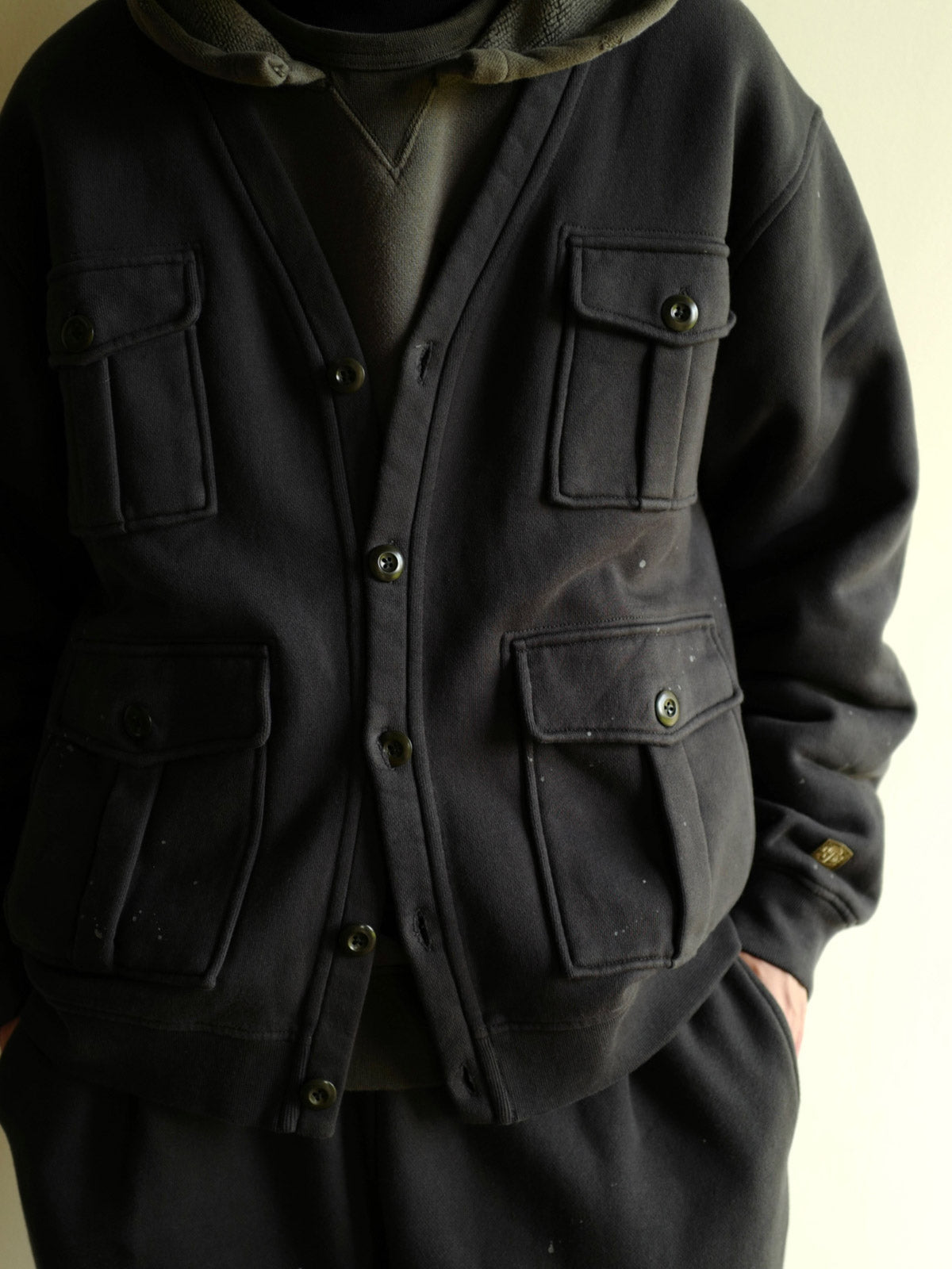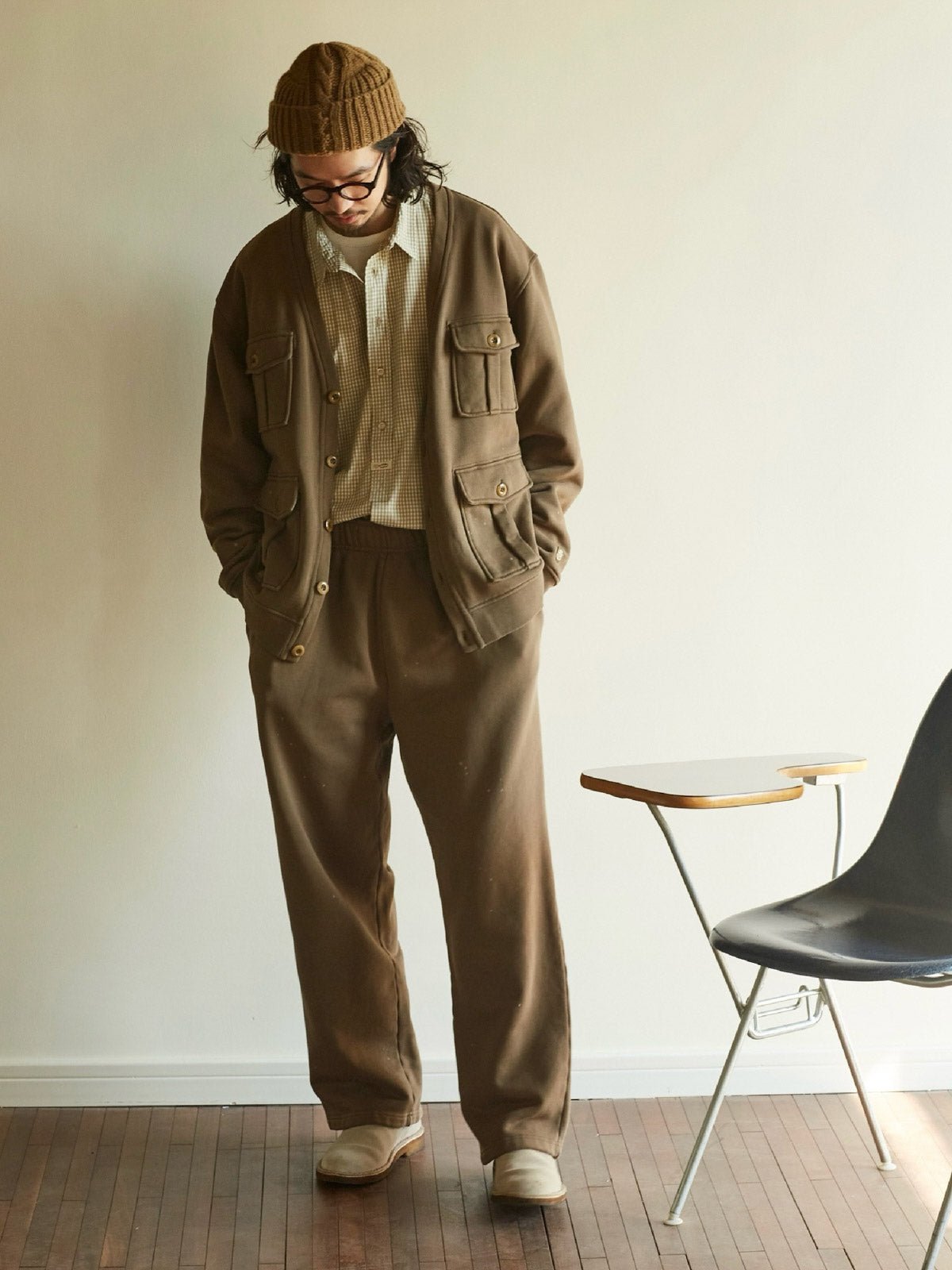 このオープンカーディガンスウェットは、伝統的な英国の軍官用ウールニットベストからインスピレーションを得ており、「Cardigan」という名前はウェールズの「Ceredigion」に由来しています。PESSOAはスウェット生地とハンティングスタイルを融合させ、タフな外観のオープンカーディガンを作り出しました。