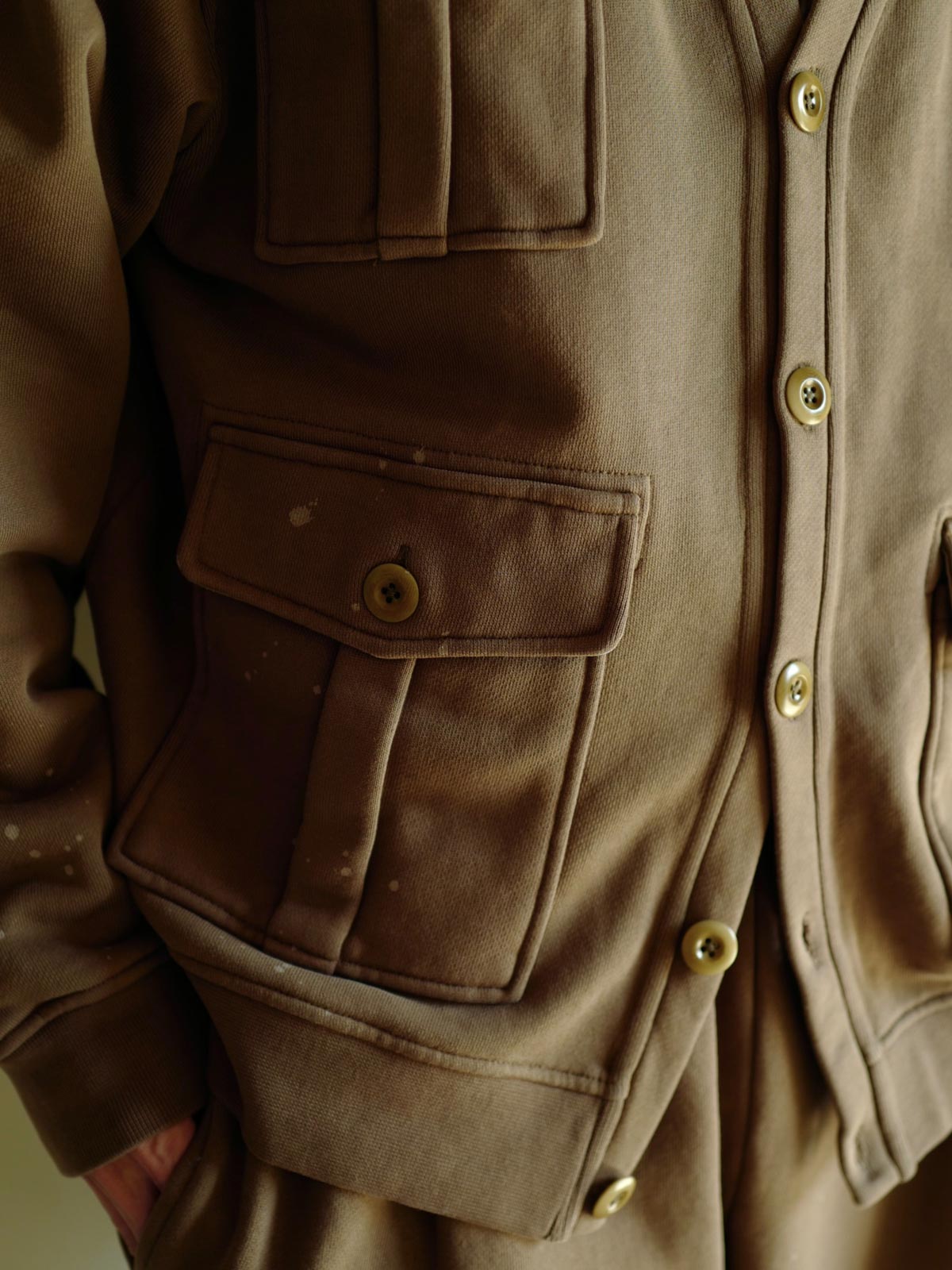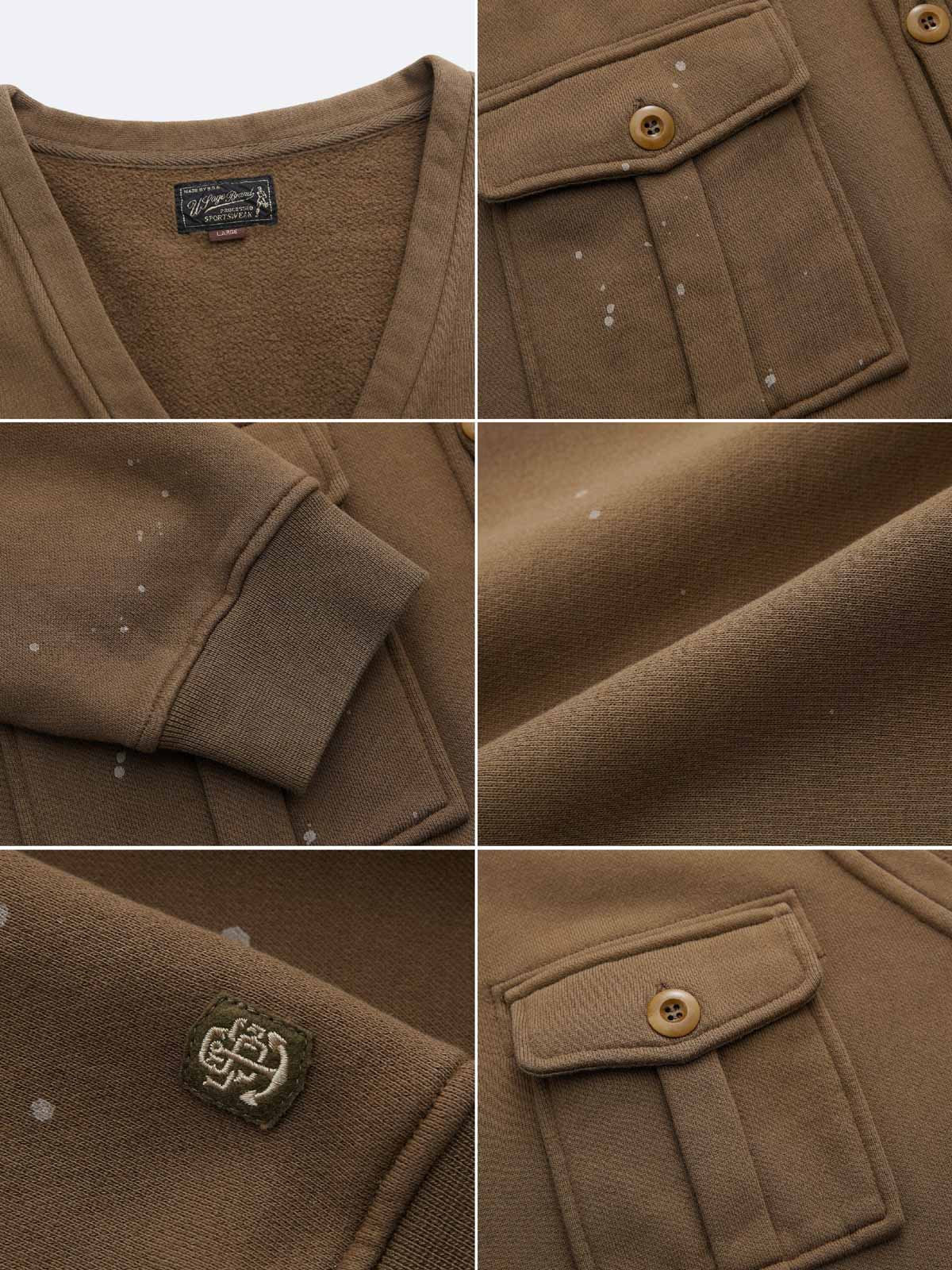 スウェットはニット織り技術で精密に作られ、耐久性と快適性を保証しています。フロント部分にはカスタムメイドの同色果実ボタンを使用し、ディテールの美しさを高めています。フロントの4つの立体ポケットデザインはハンティングジャケットから着想を得ており、カーキグリーンとブルーグレーの選択、衣服上の自然なスプラッシュプリント、そしてガーメントウォッシュのエイジング効果が素朴な雰囲気を演出しています。