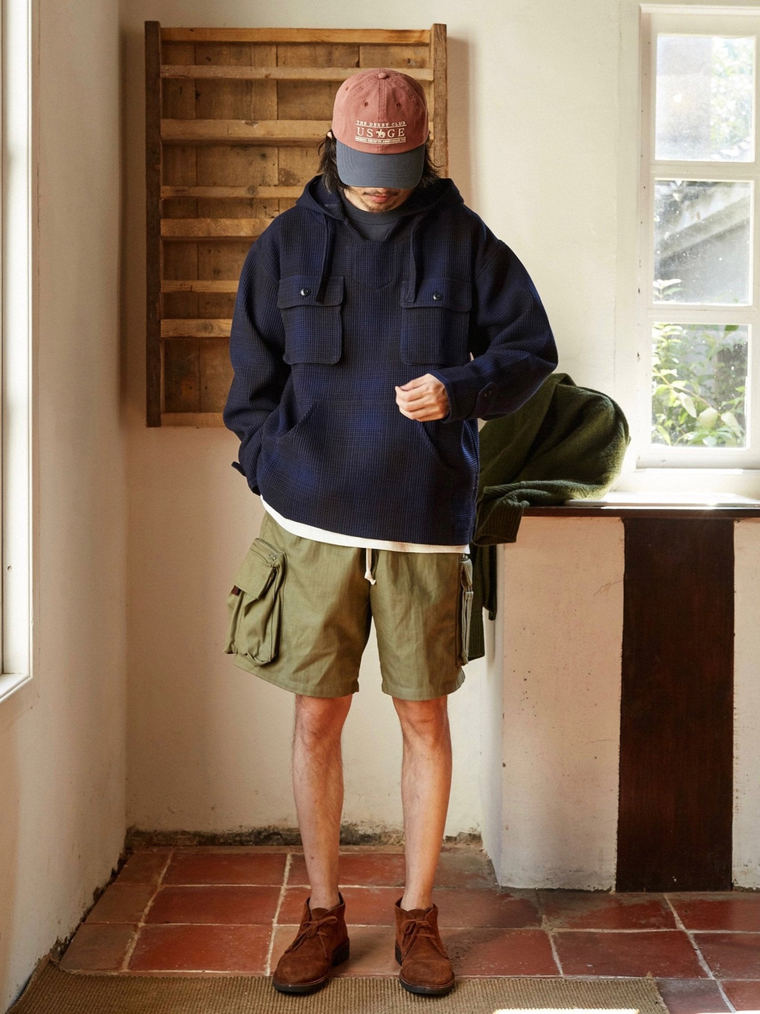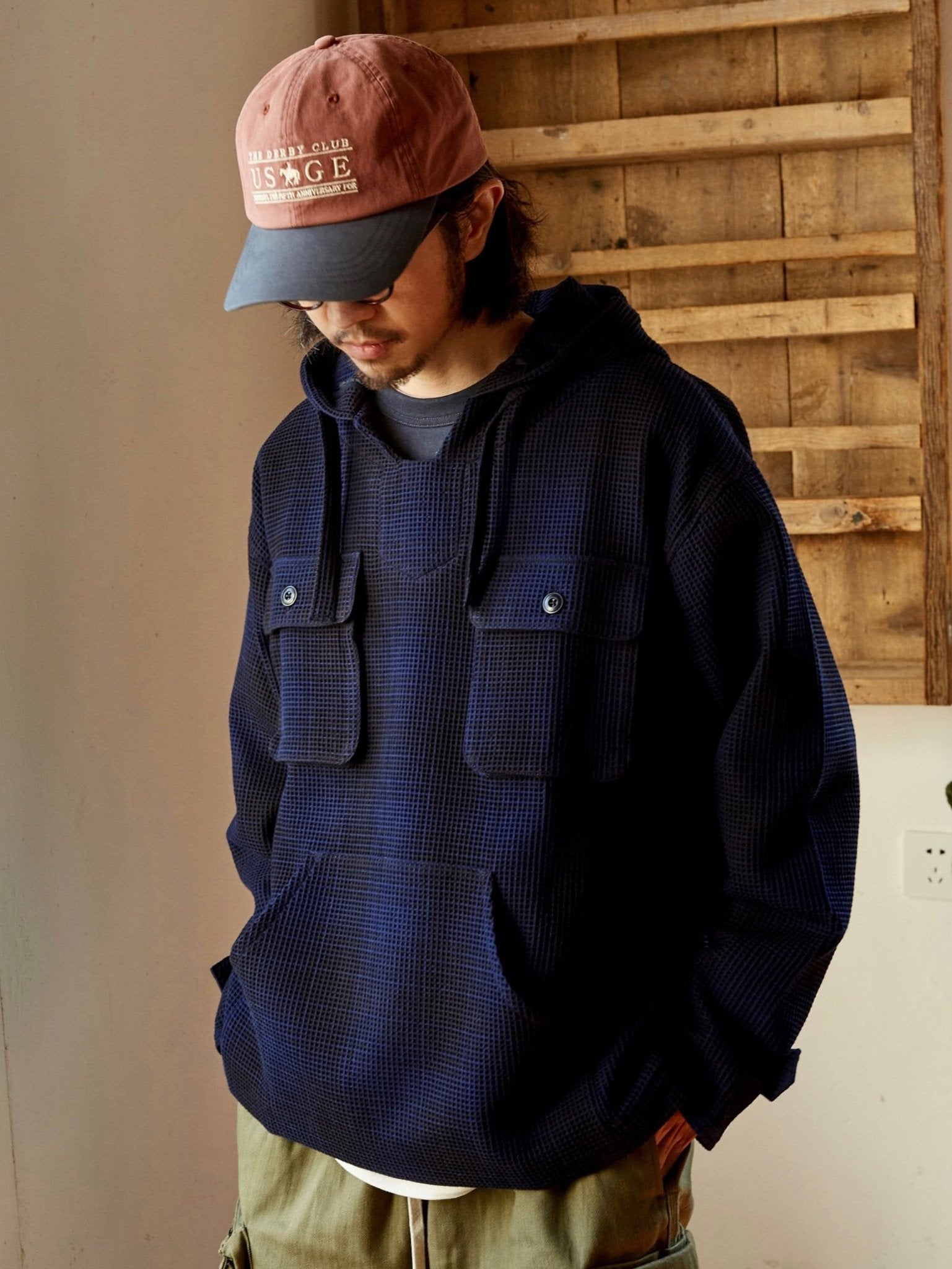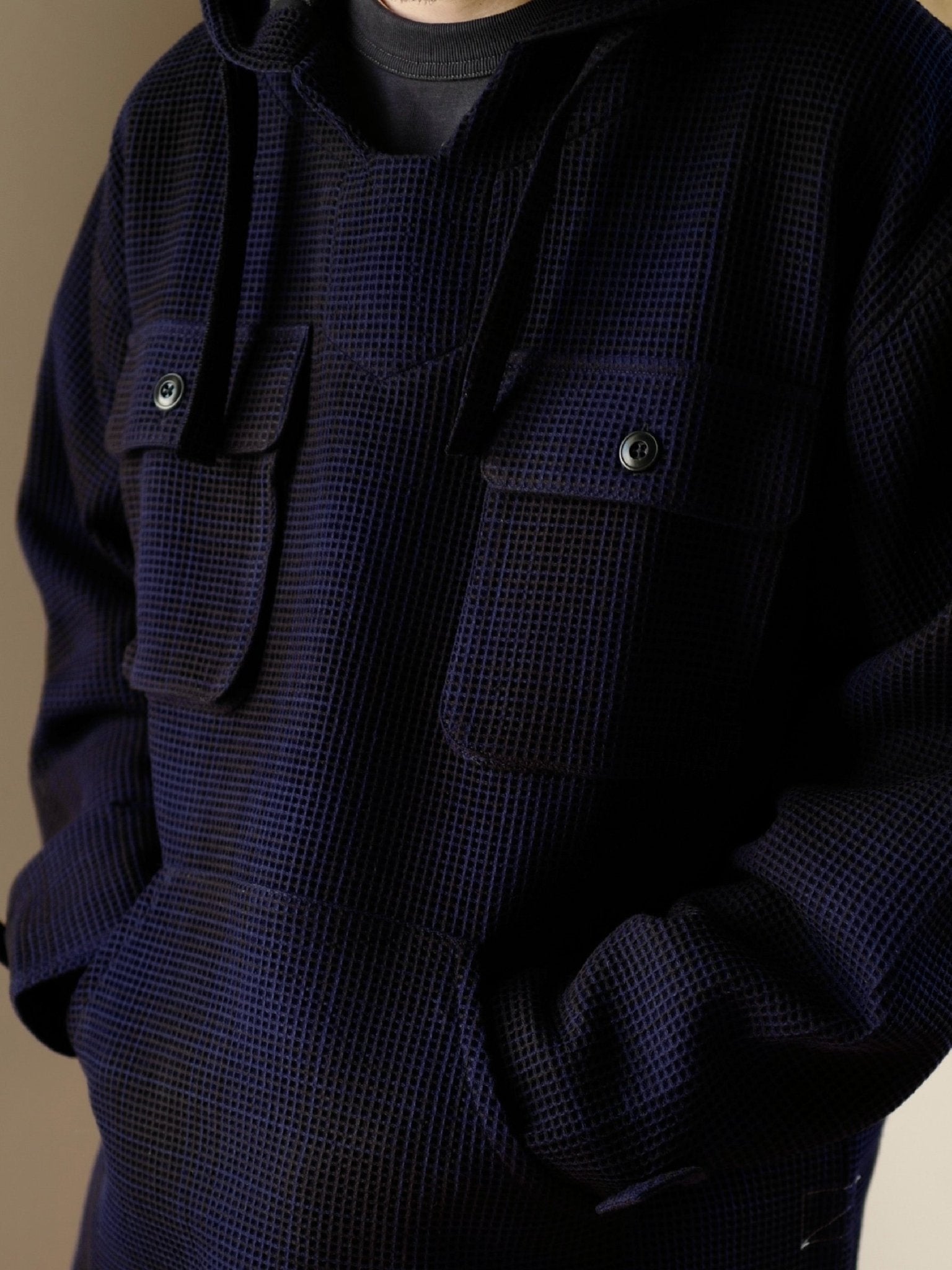 このアイテムは、228gの日本製コットンウォッフル生地を使用し、ウォッフル模様が布地上にかすかに浮かび上がる効果を持っています。