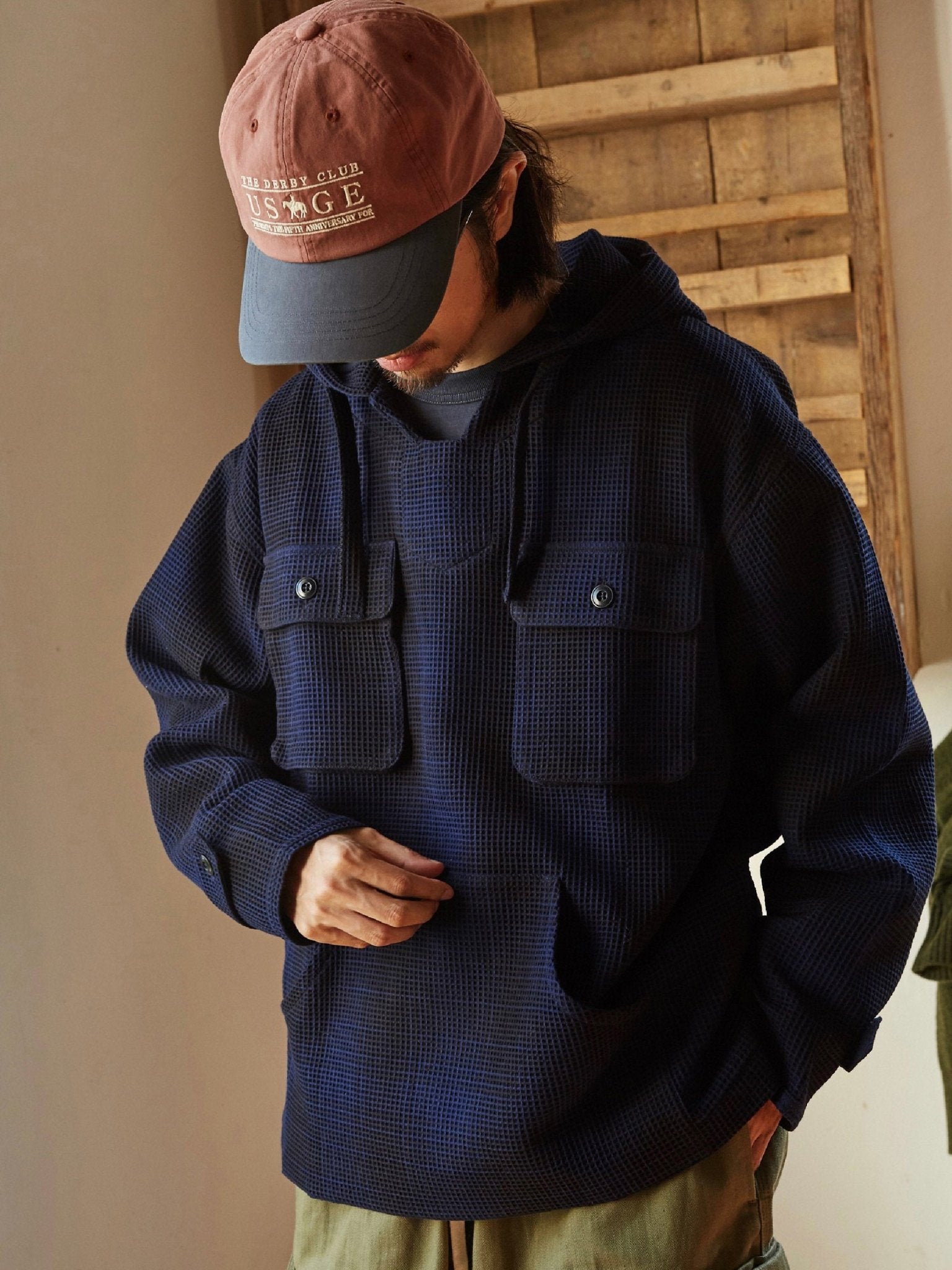 前面には大きなハンドポケットが残され、胸部には2つのフラップボタンポケットが追加され、ワークウェアの要素が加わっています。