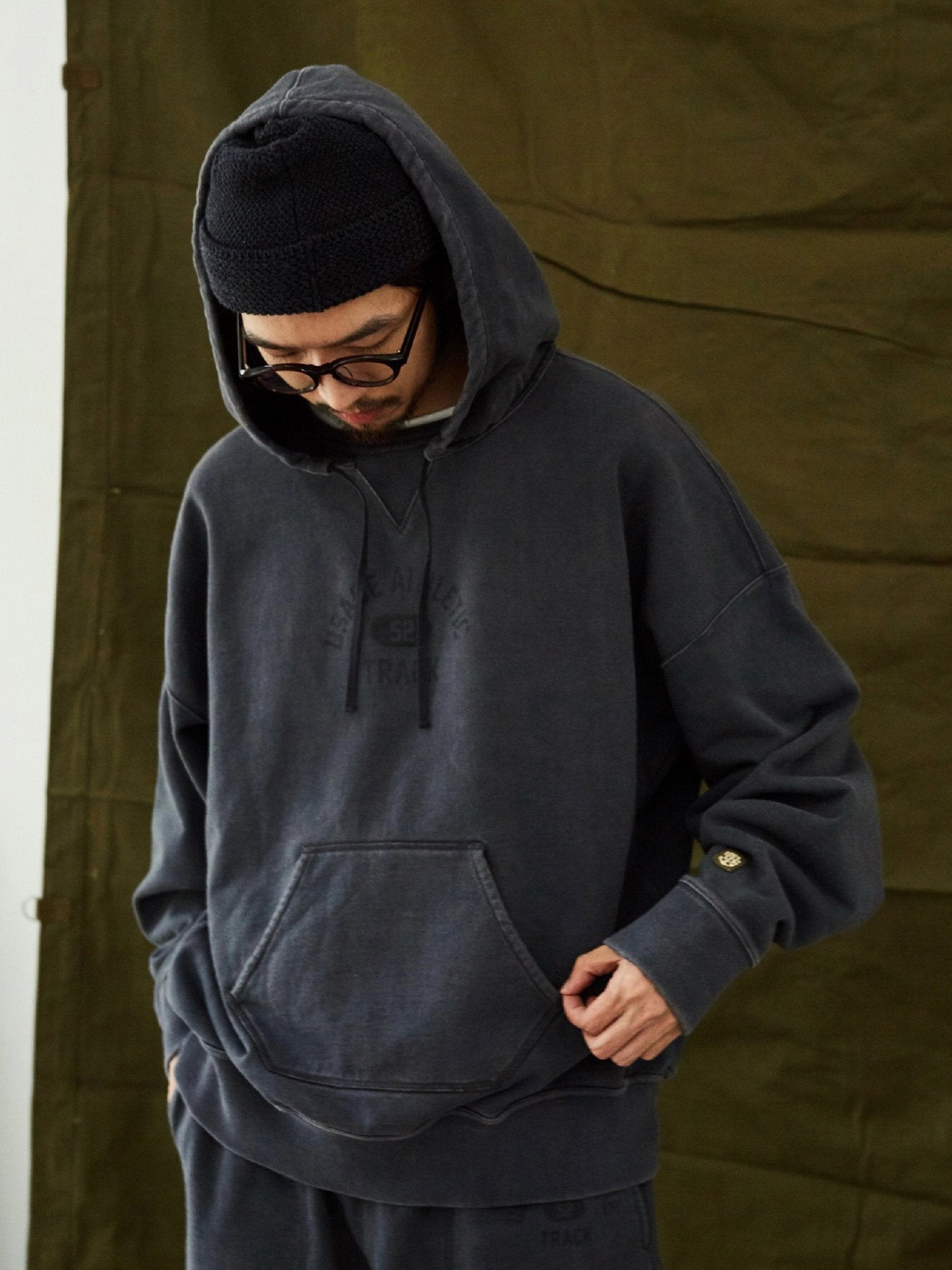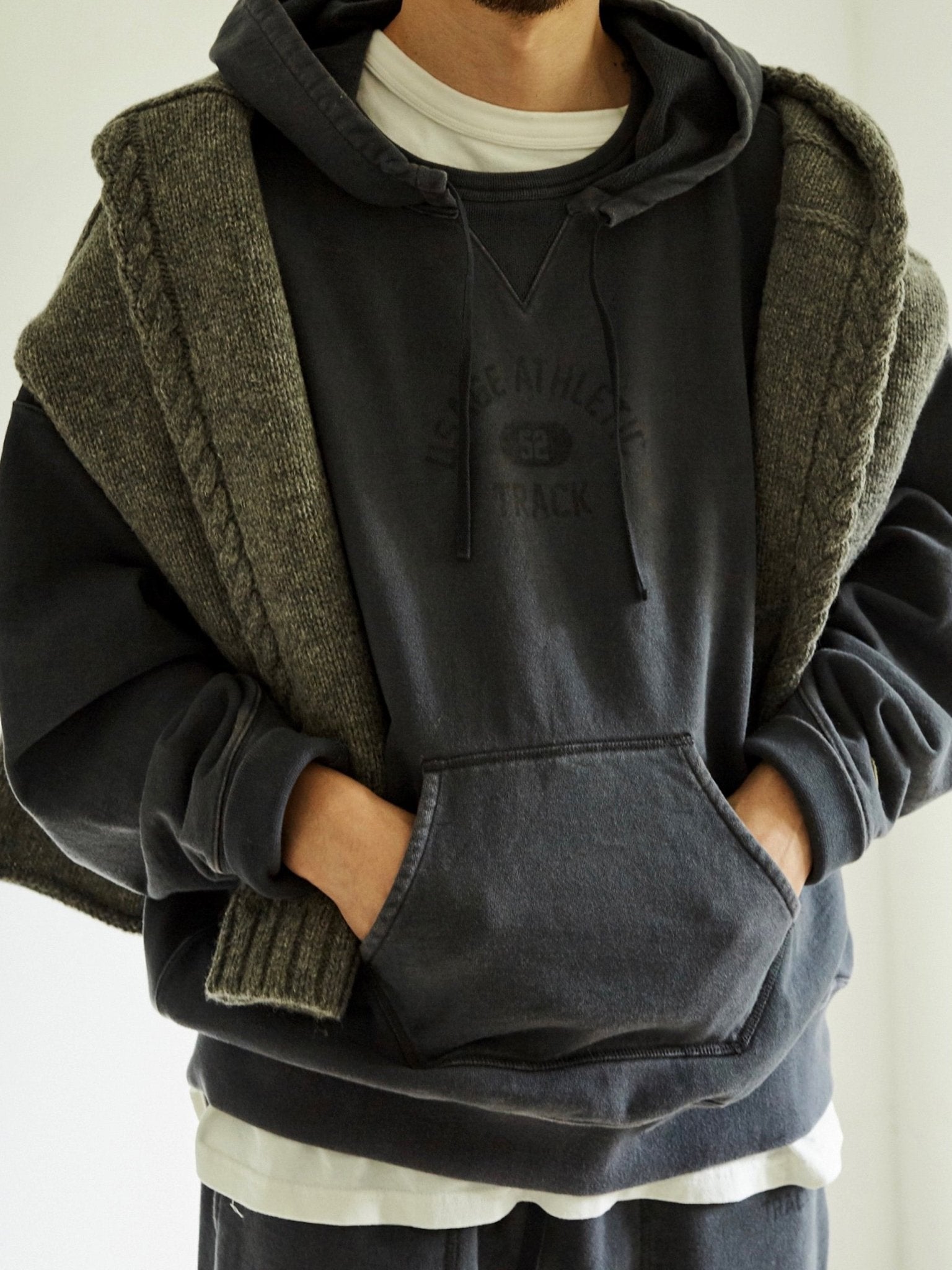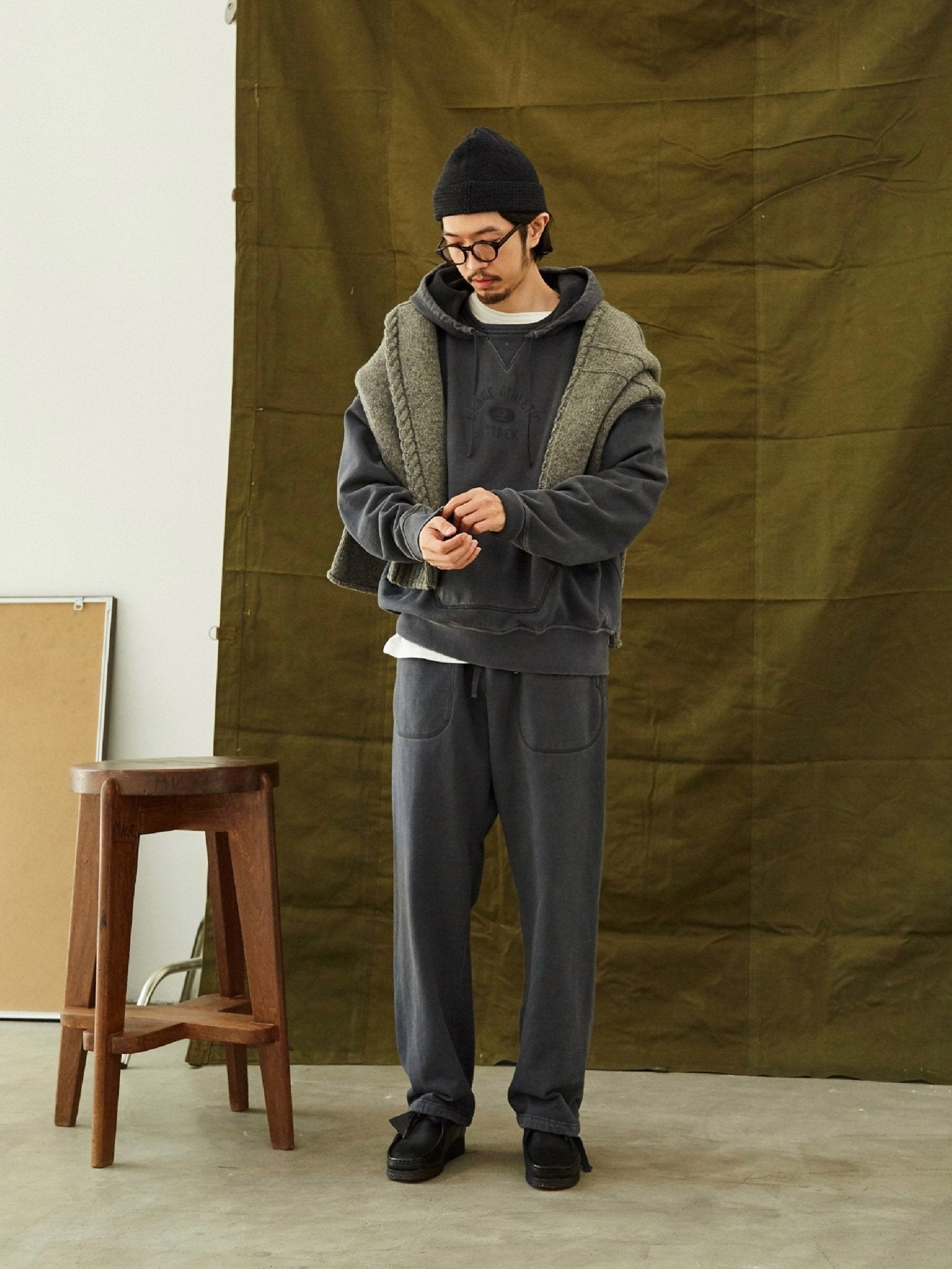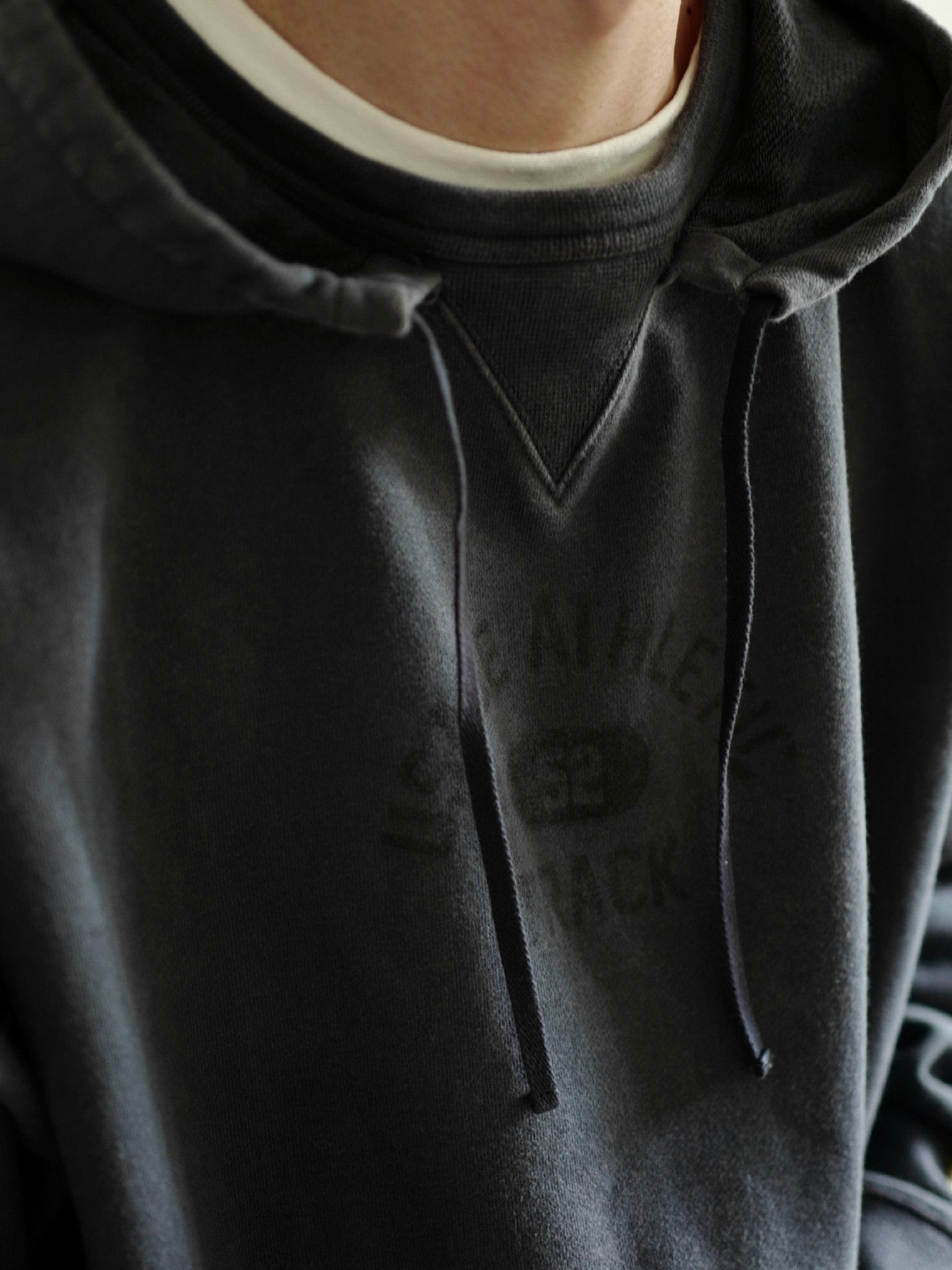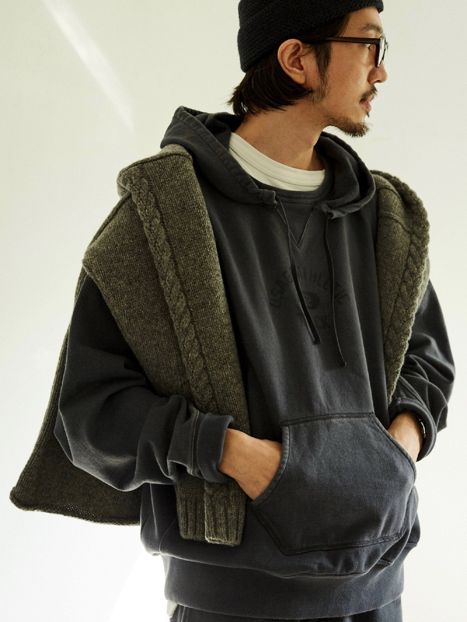 胸元には無地のアンティークな水性プリントが施されて、何年もの着用や洗濯を経て淡くなった古着のプリント効果を再現しています。首元、袖、裾にはリブが施され、耐久性があります。正面には手を暖めるためのポケットがあり、冬季に便利です。