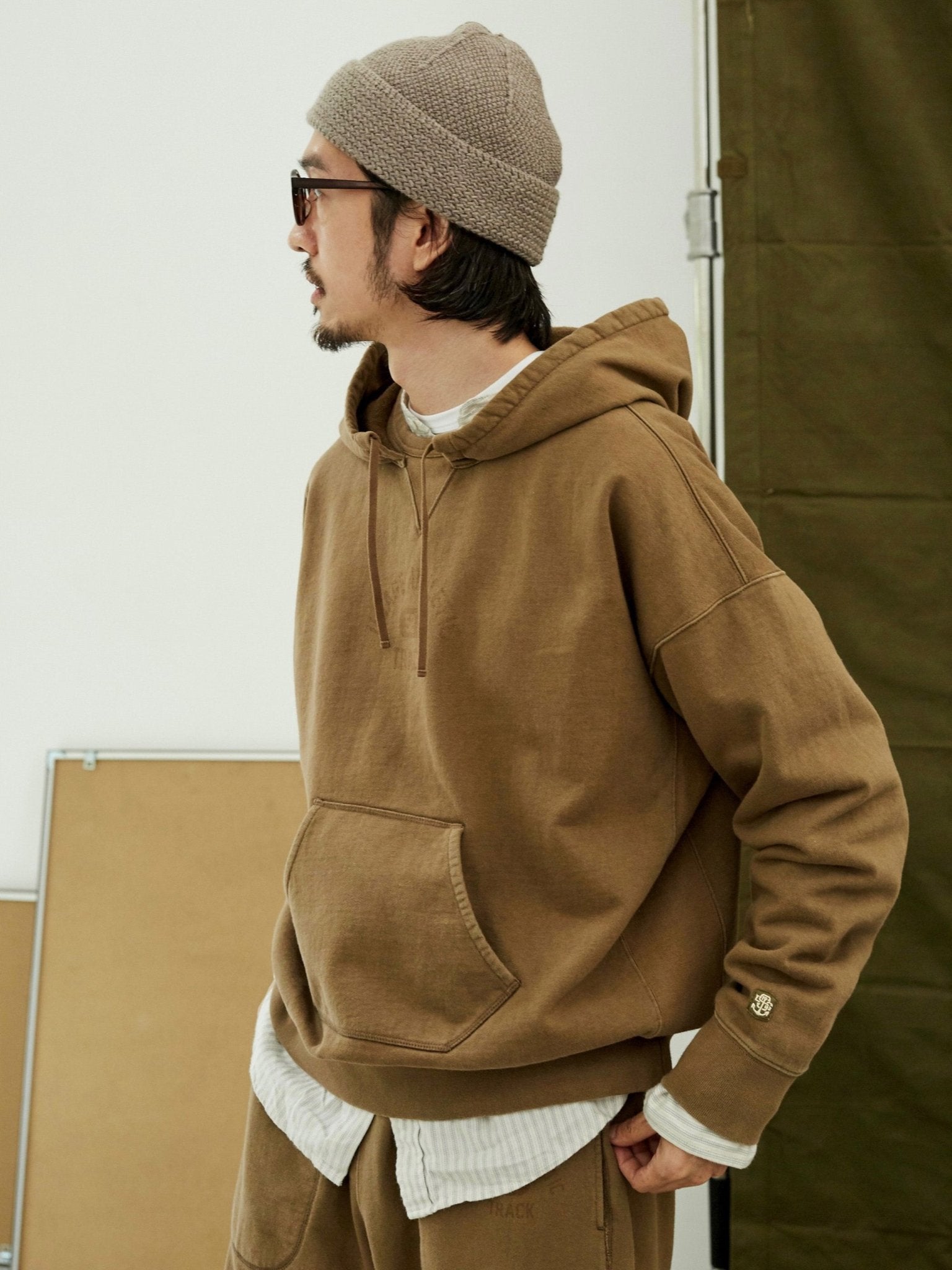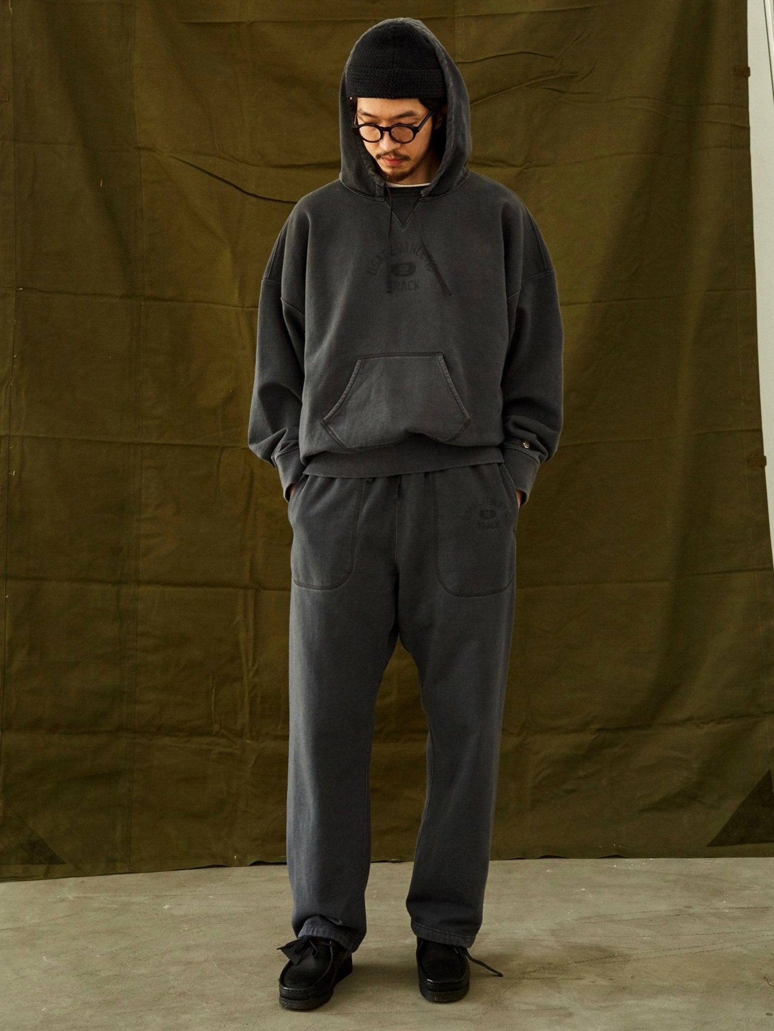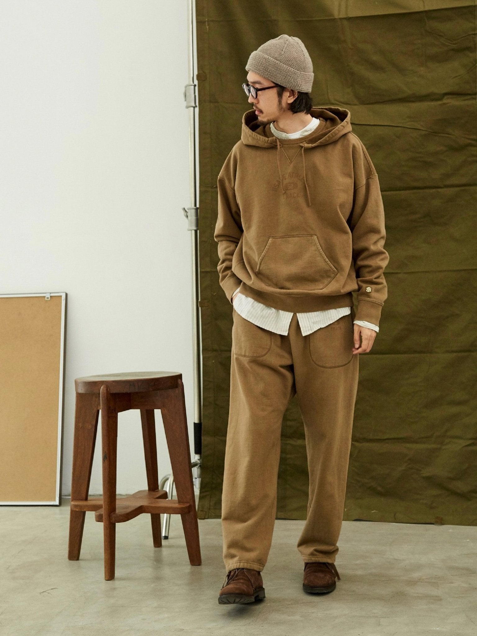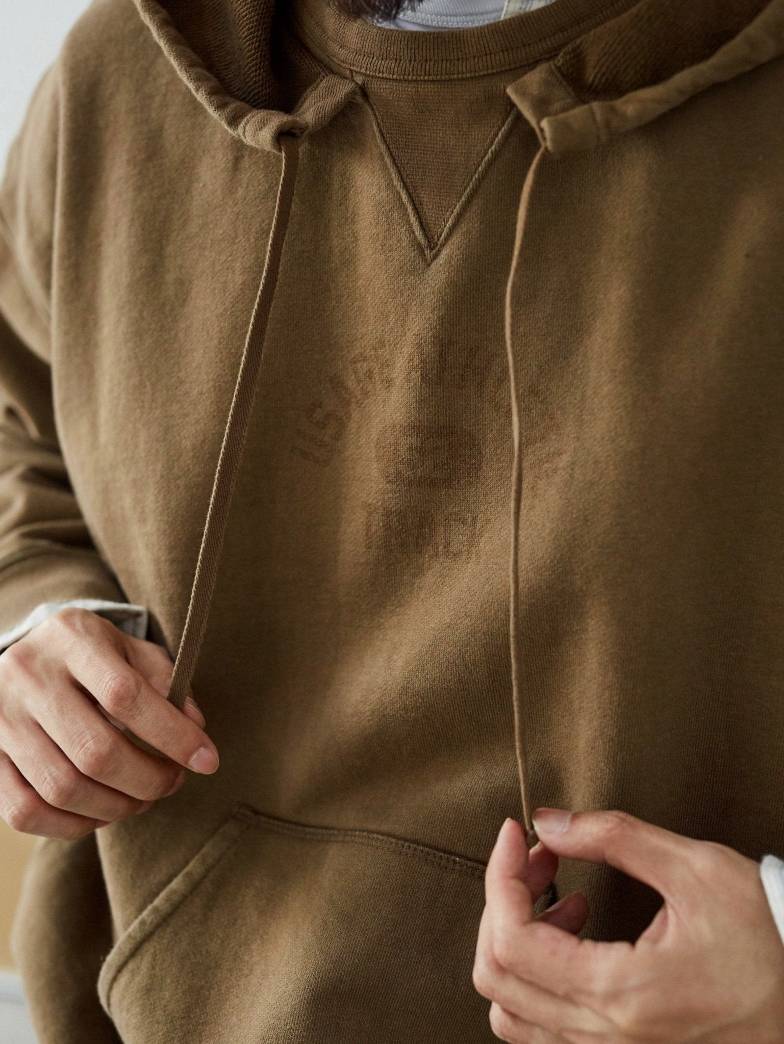 胸元には無地のアンティークな水性プリントが施されて、何年もの着用や洗濯を経て淡くなった古着のプリント効果を再現しています。首元、袖、裾にはリブが施され、耐久性があります。正面には手を暖めるためのポケットがあり、冬季に便利です。
