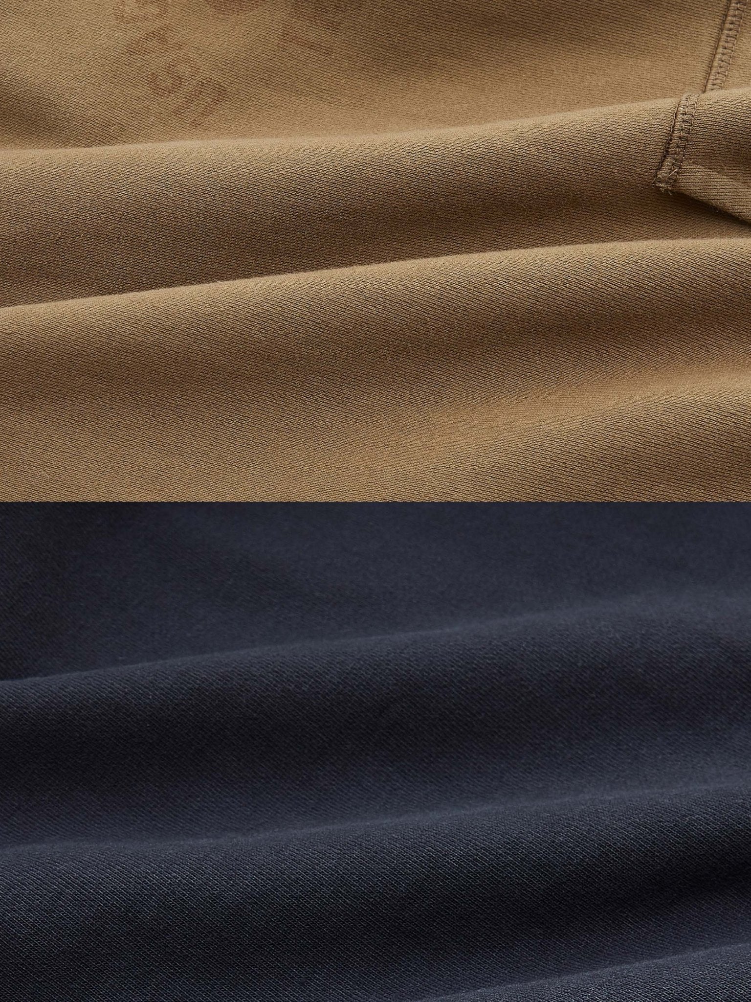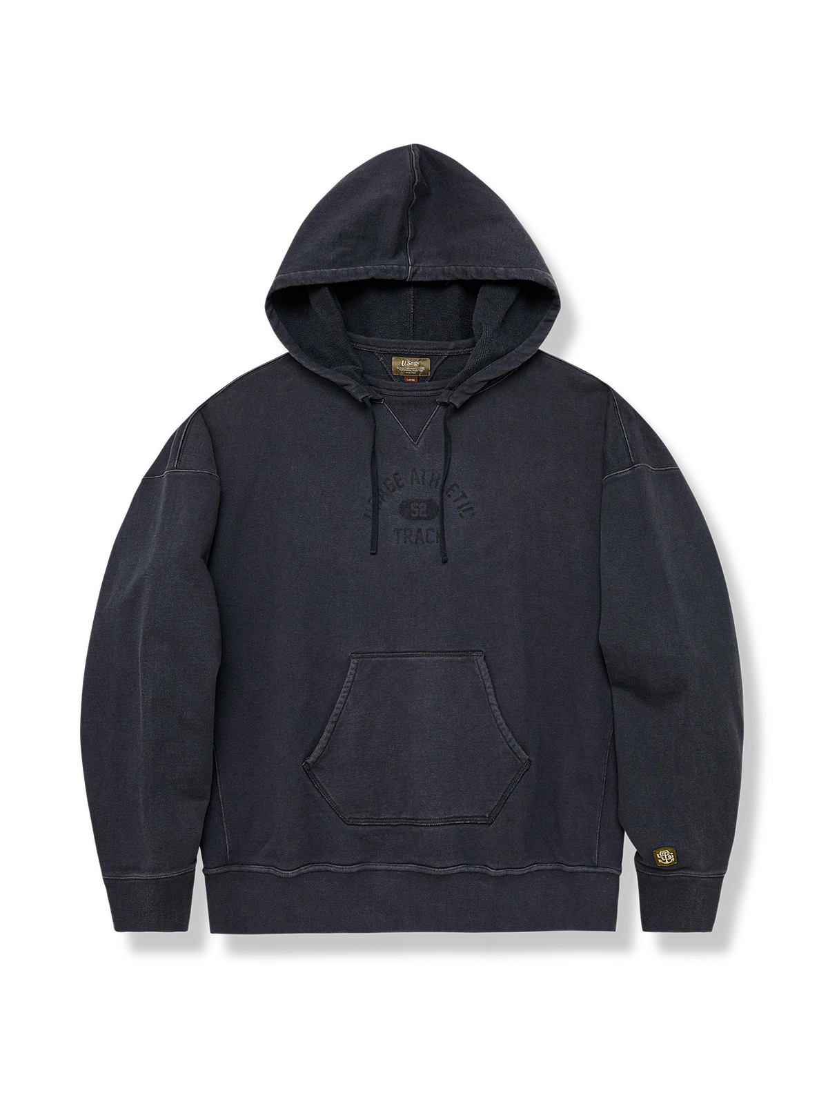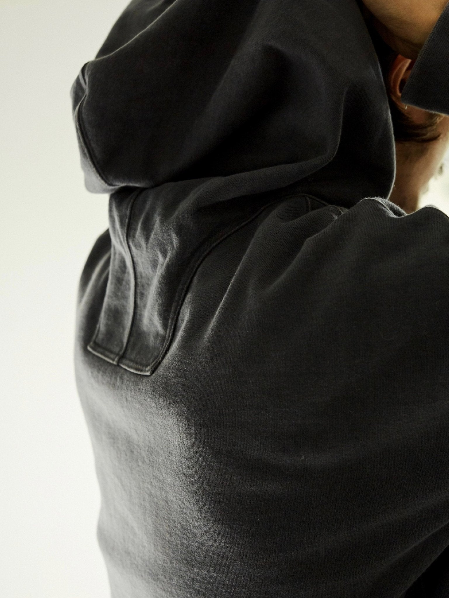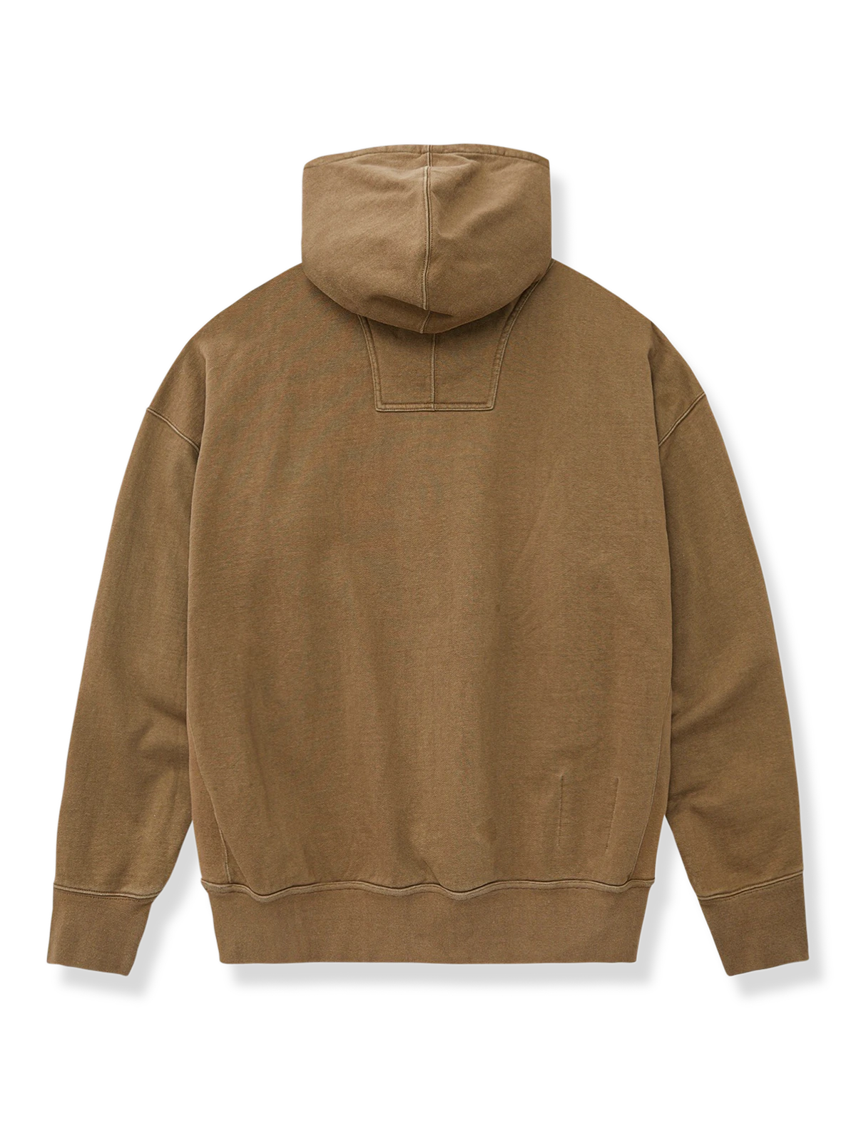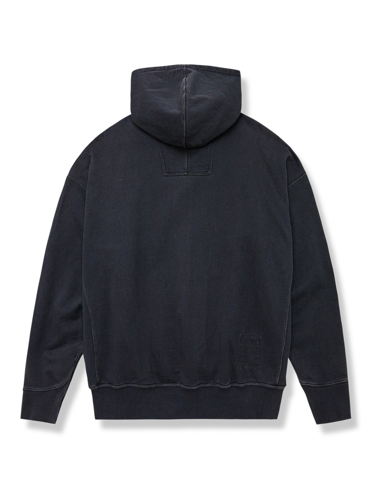 胸元には無地のアンティークな水性プリントが施されて、何年もの着用や洗濯を経て淡くなった古着のプリント効果を再現しています。首元、袖、裾にはリブが施され、耐久性があります。正面には手を暖めるためのポケットがあり、冬季に便利です。