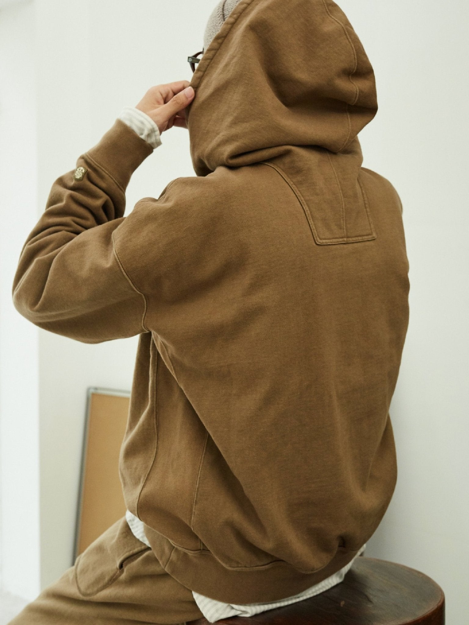 1930年代のスタイルを取り入れて、首元にフードを取り付ける形となっており、全体のシルエットはゆったりとしており、適度な着丈で上半身をすっきりと見せるデザインとなっています。