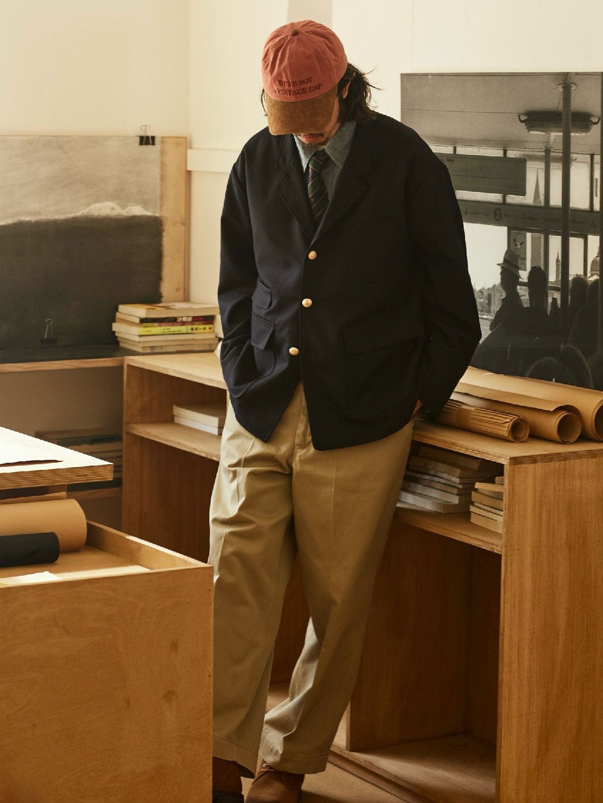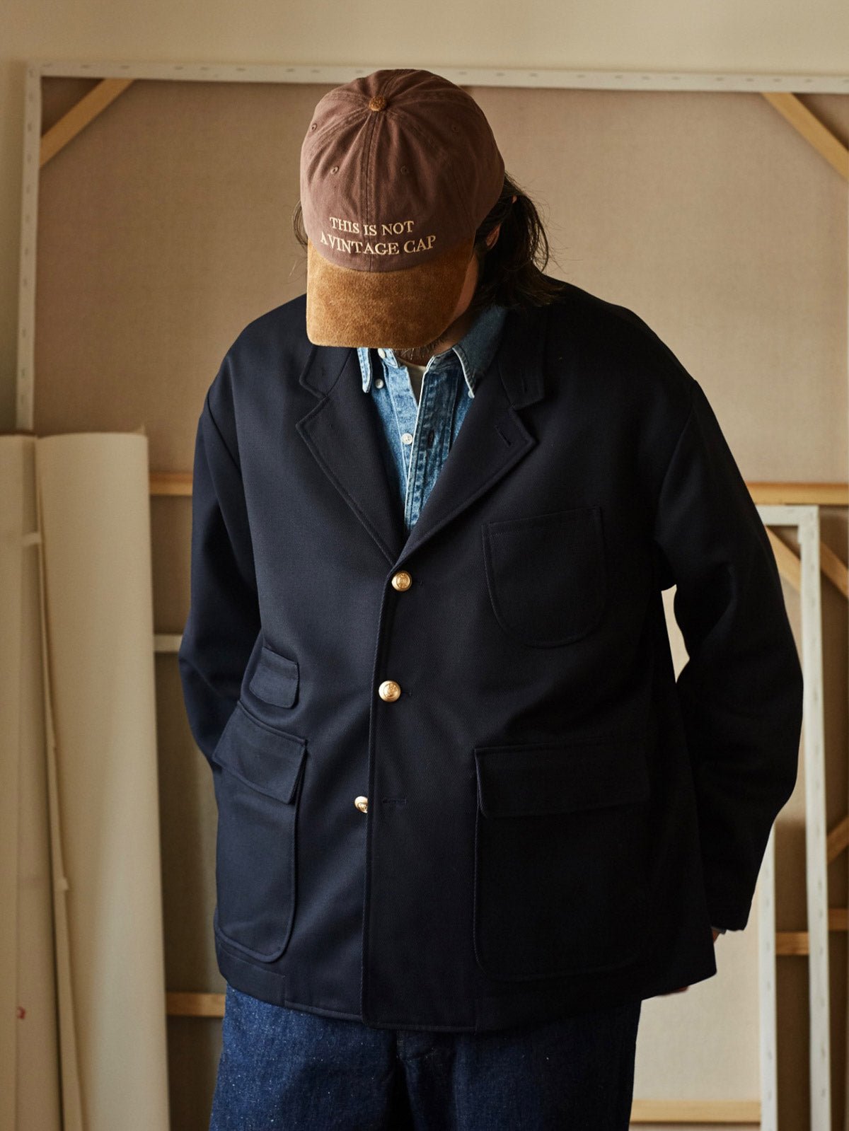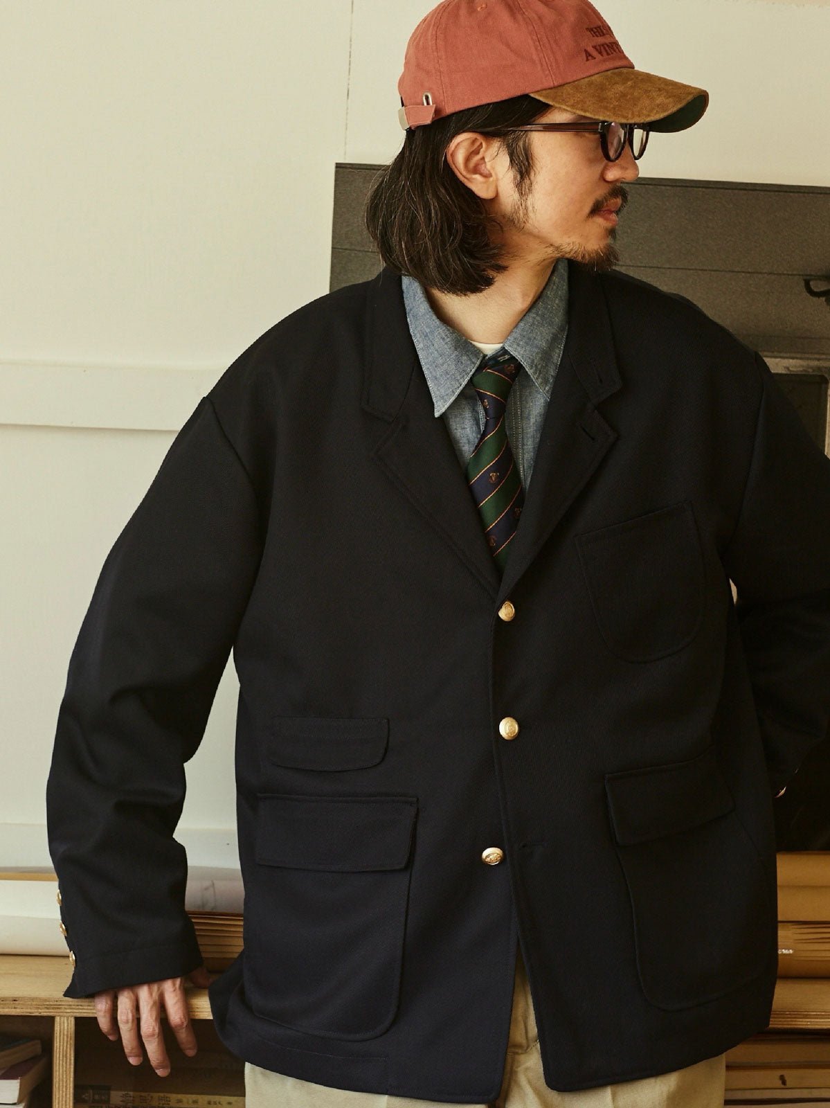 このネイビーブルーのスーツジャケットは、アイビースタイルのクラシックな表現であり、19世紀の航海制服からインスピレーションを得ています。深い青の生地と真鍮のボタンの組み合わせは、初期のスーツの伝統的な要素を継承しつつ、このジャケットに洗練されたエレガントな気質をもたらしています。