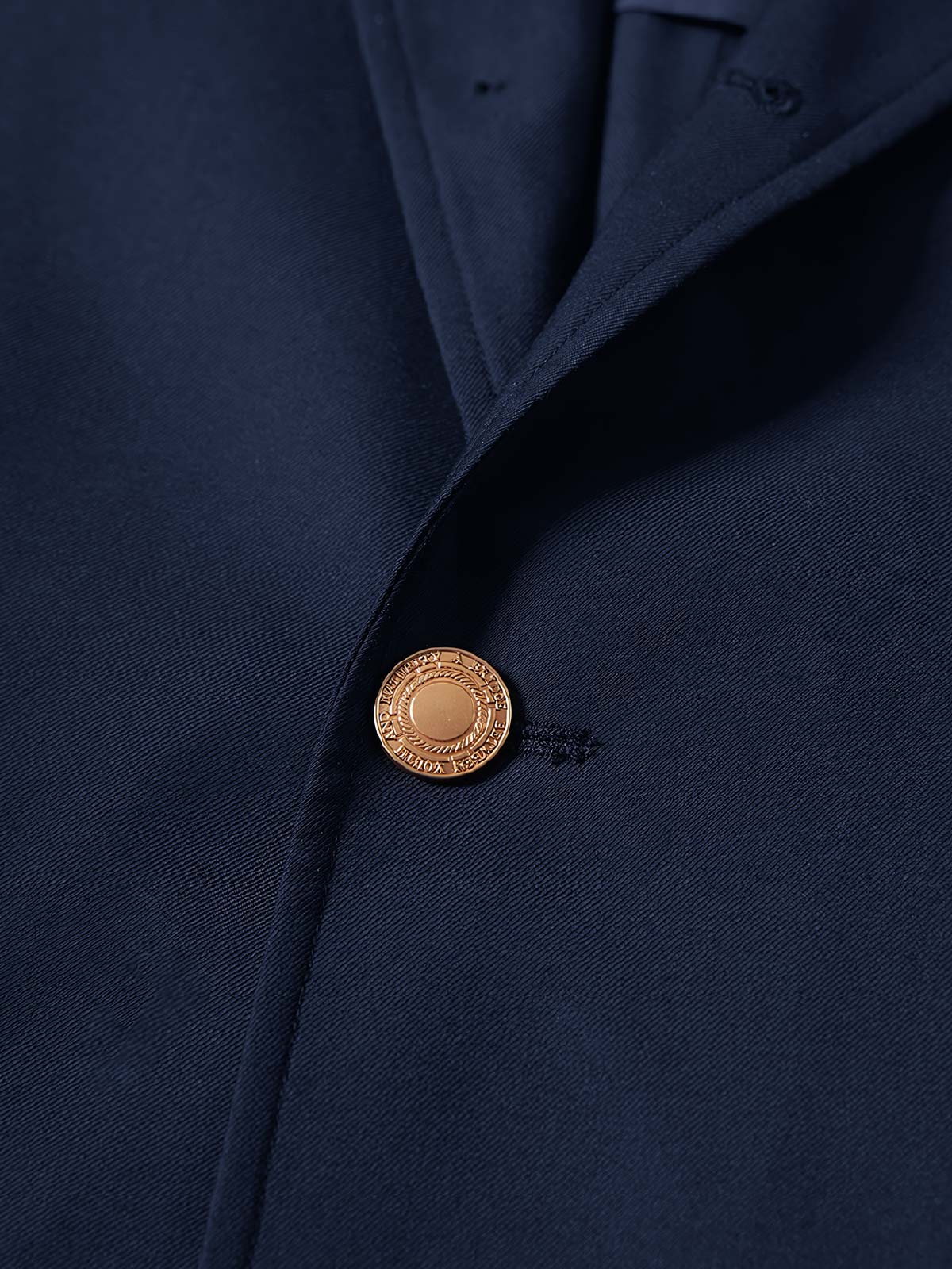 選ばれた混紡生地は、スーツの耐久性を高めるとともに、着心地も向上させます。ゴールドのボタンは、海軍ブルーの生地と対照的に、控えめな豪華さを際立たせています。また、ディテールのカッティングや縫製技術は、ブランドが品質への追求を示しています。
