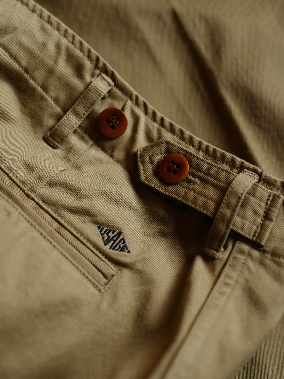 オーダーメイドで開発されたカーキ色の斜め布地を使用しており、この布地は高捻り綿で織られており、布の密度が高くしっかりしているため、快適性と通気性を兼ね備えています。柔らかい光沢感とサラッとした触感の組み合わせにより、長時間着用しても良い外観と感触を保ちます。