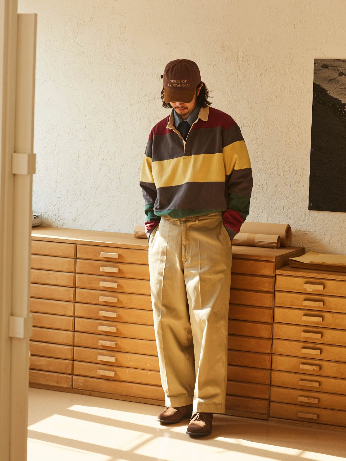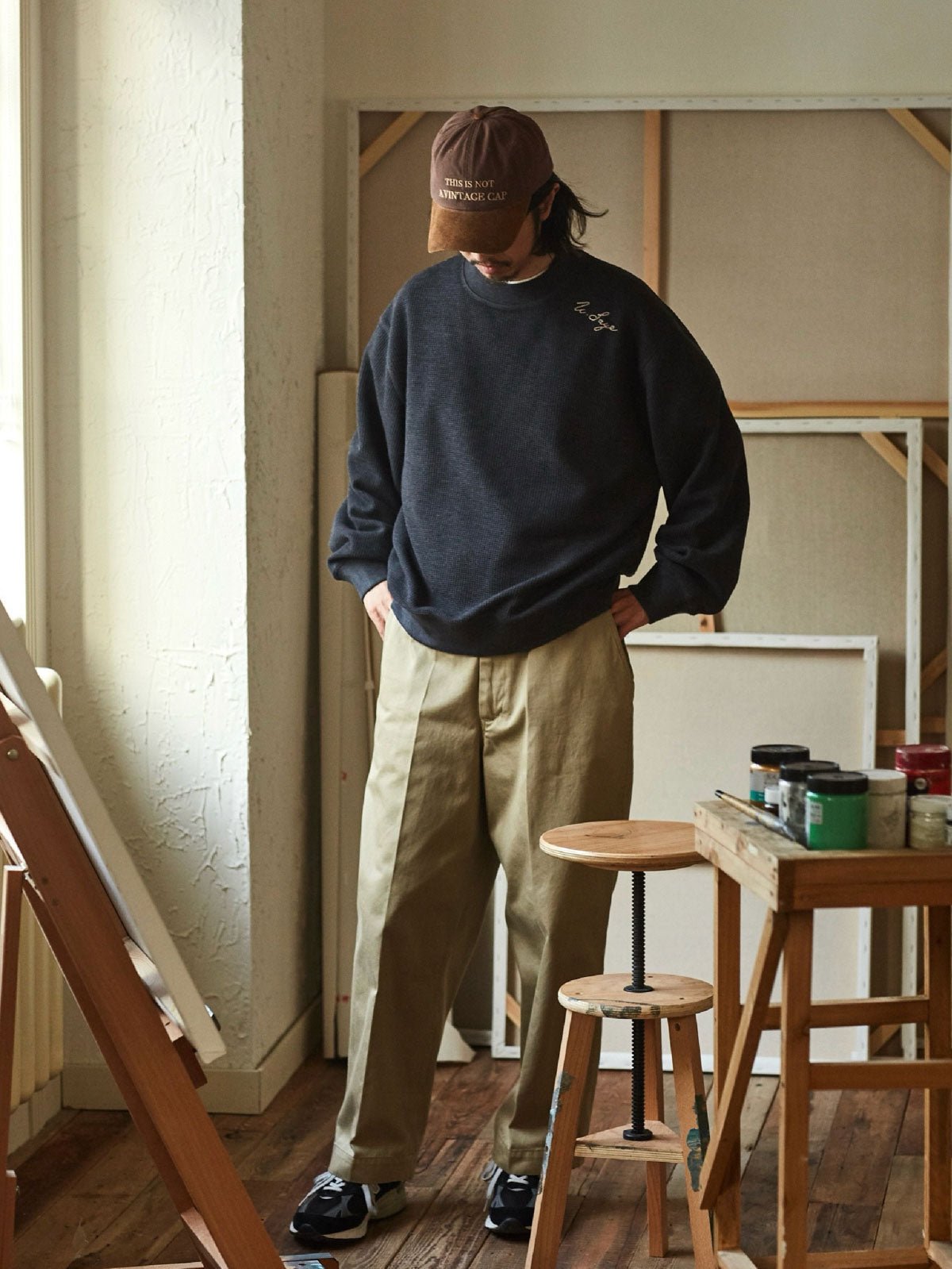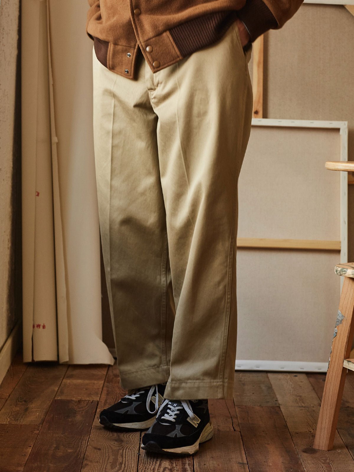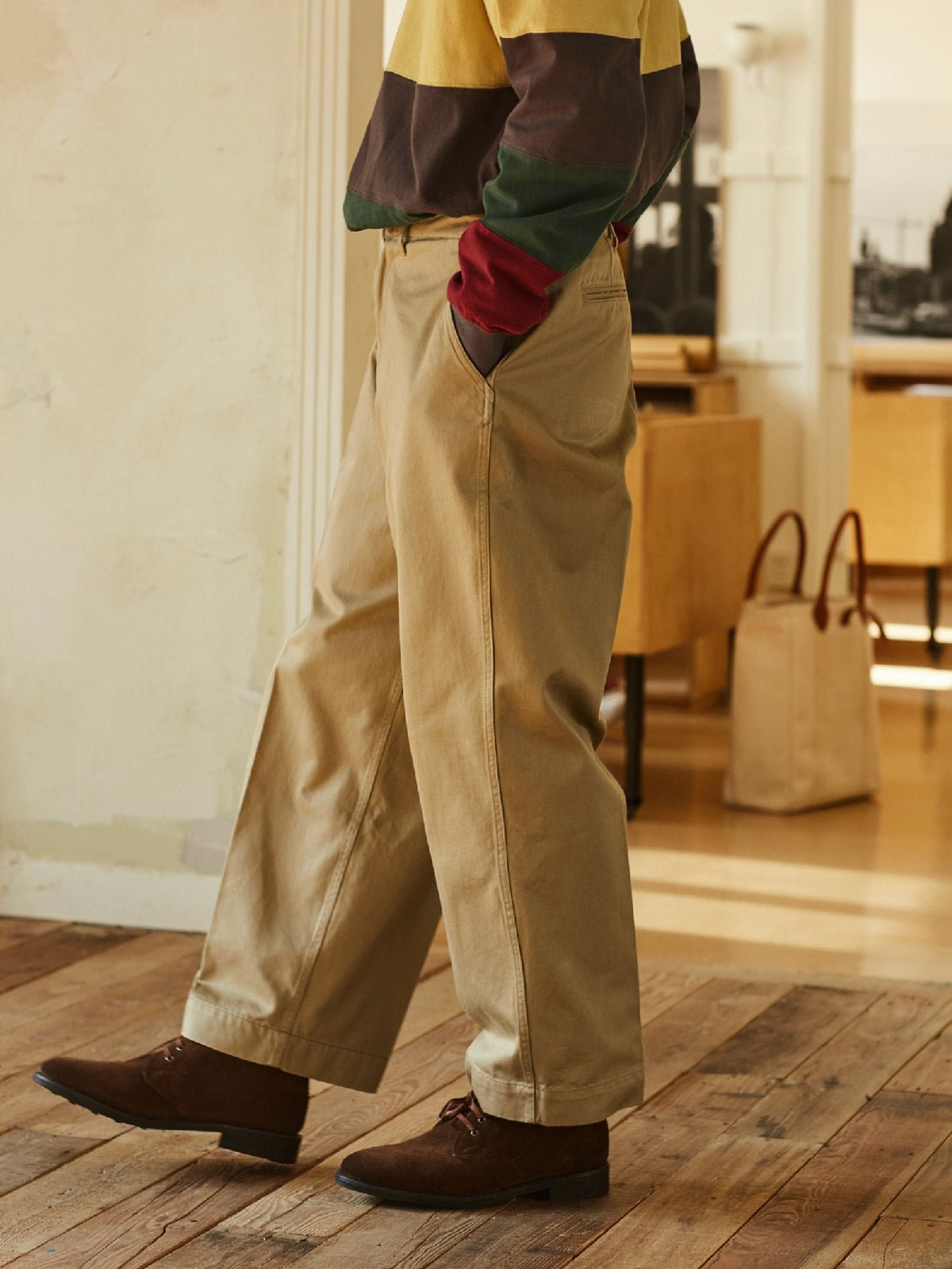 このチノパンツのクラシックなカーキ色は、白いシャツからカラフルなポロシャツまで、さまざまな色のトップスと簡単に合わせることができます。靴選びも非常に柔軟で、正式な雰囲気を出すために革靴を選ぶか、ローファーやスニーカーでカジュアルなスタイルを演出するか、どちらも完璧にマッチします。