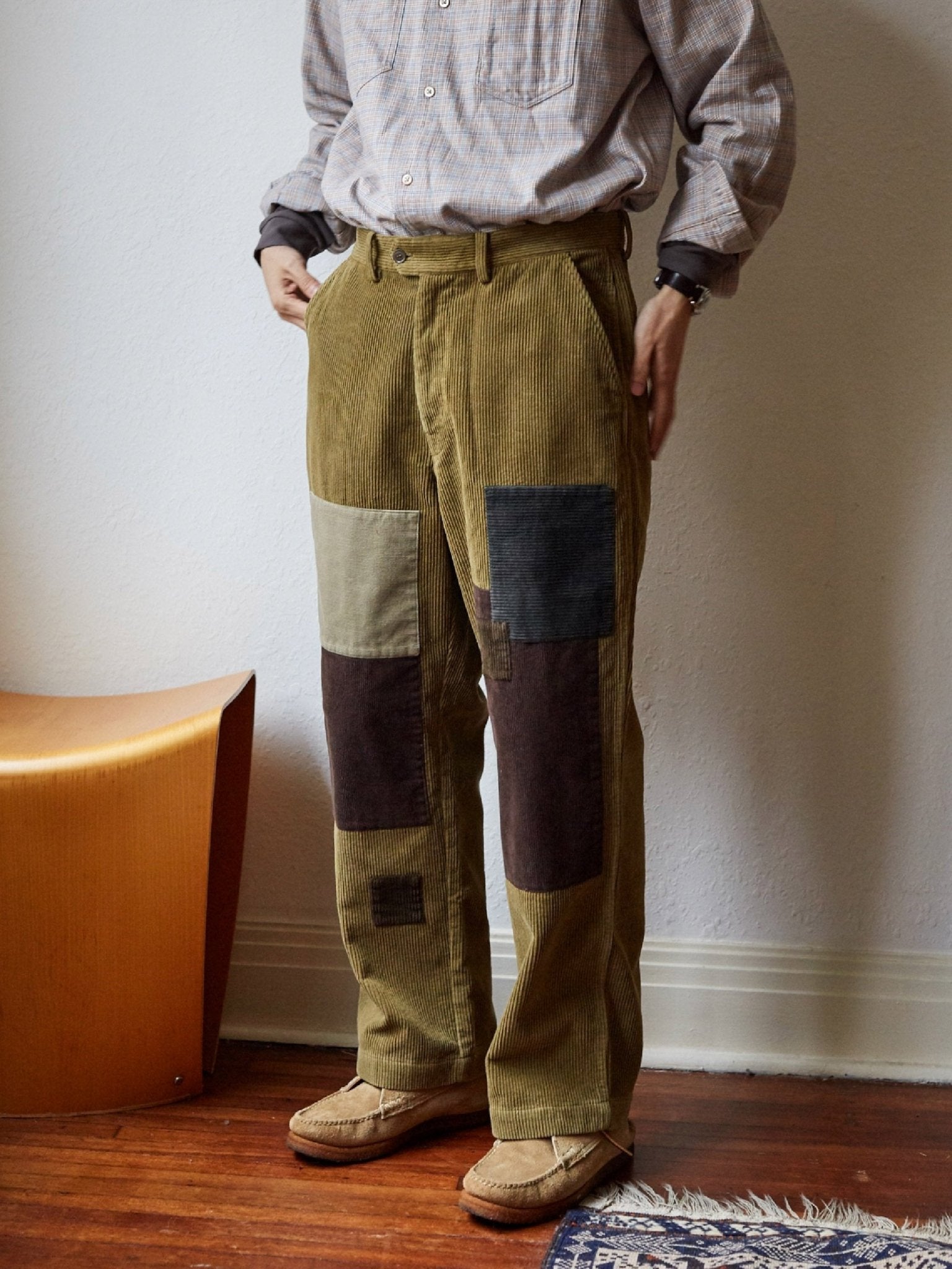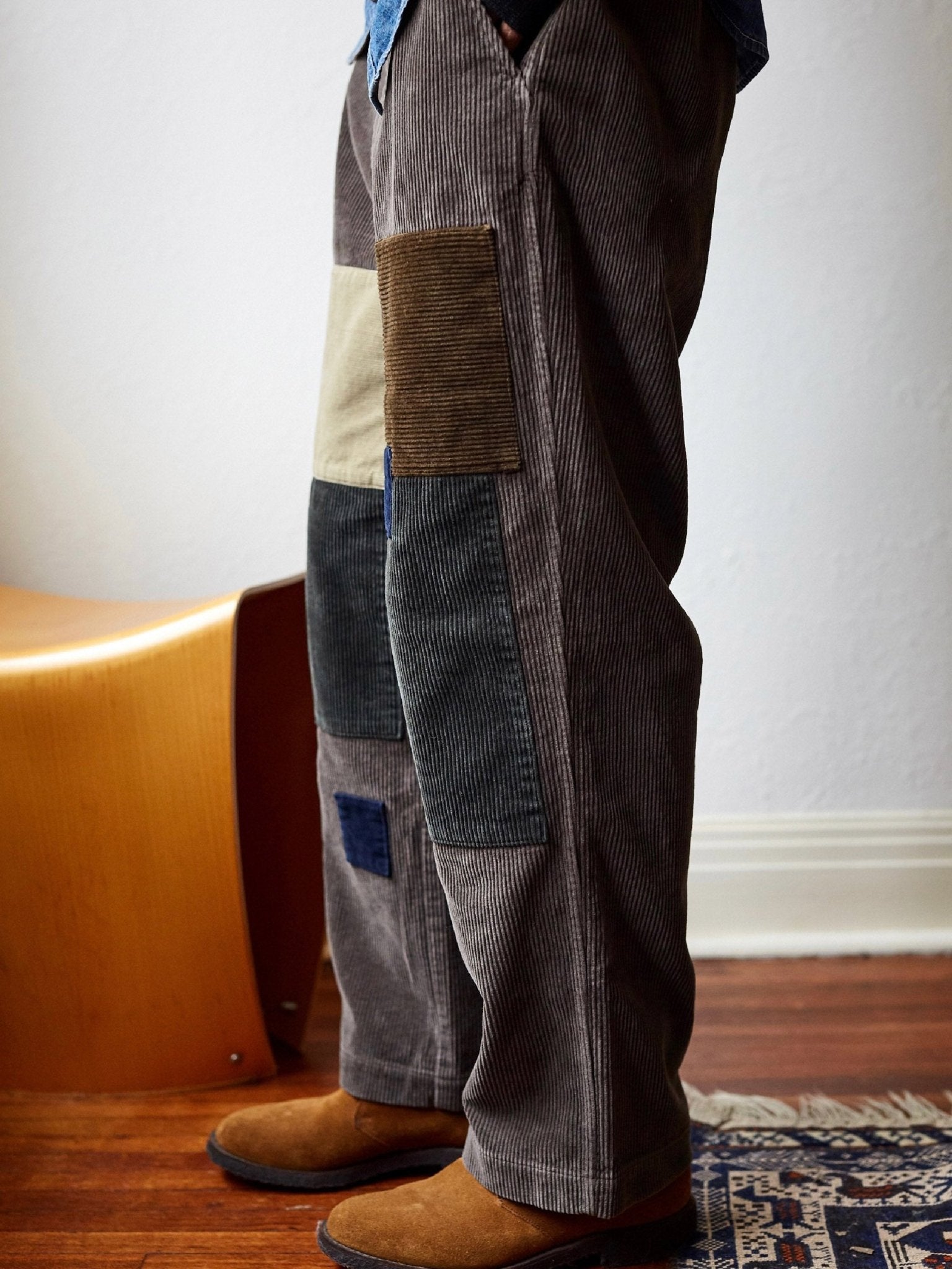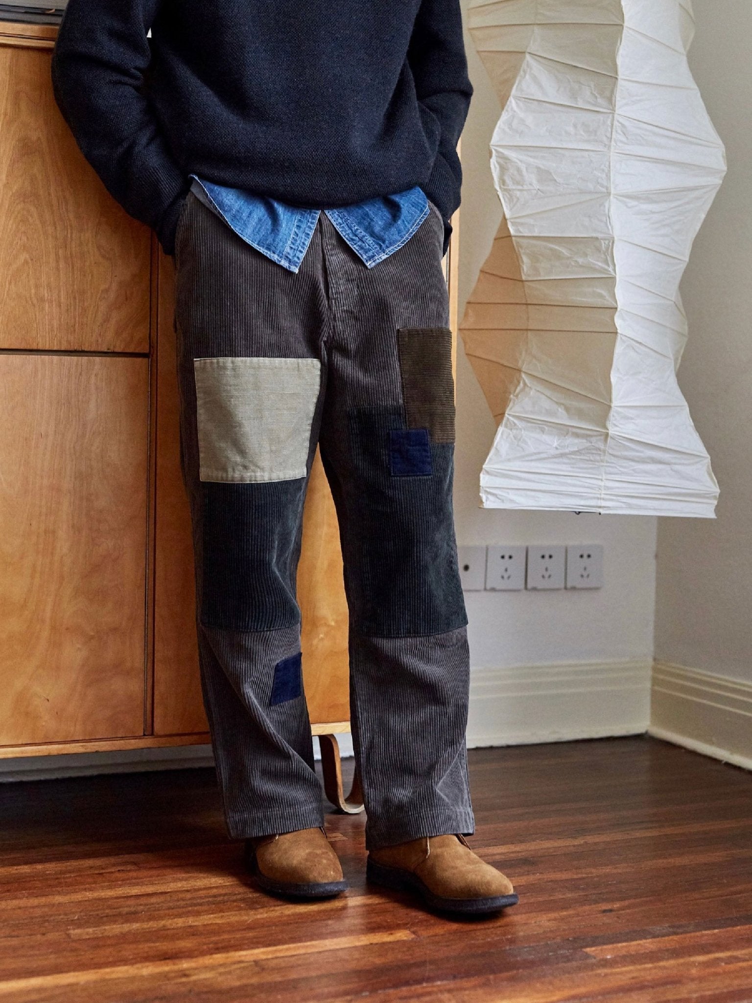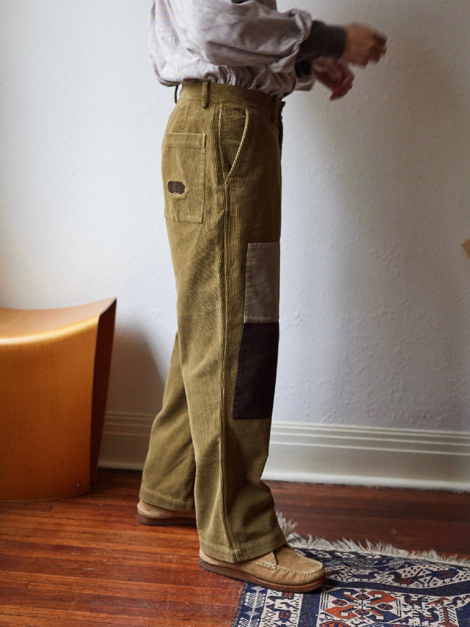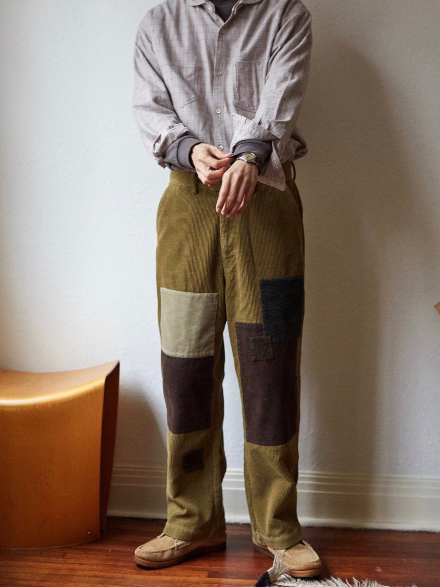 このパンツには、早期の作業服パンツのパッチ要素が取り入れられており、異なる色、サイズ、位置、およびコードバン生地の変化を組み合わせ、非対称のパッチワーク、重ね縫いなどの手法を使用して、独特なディテールを表現しています。また、カーキ色のデザインが古風なワークウェアのスタイルを演出しています。