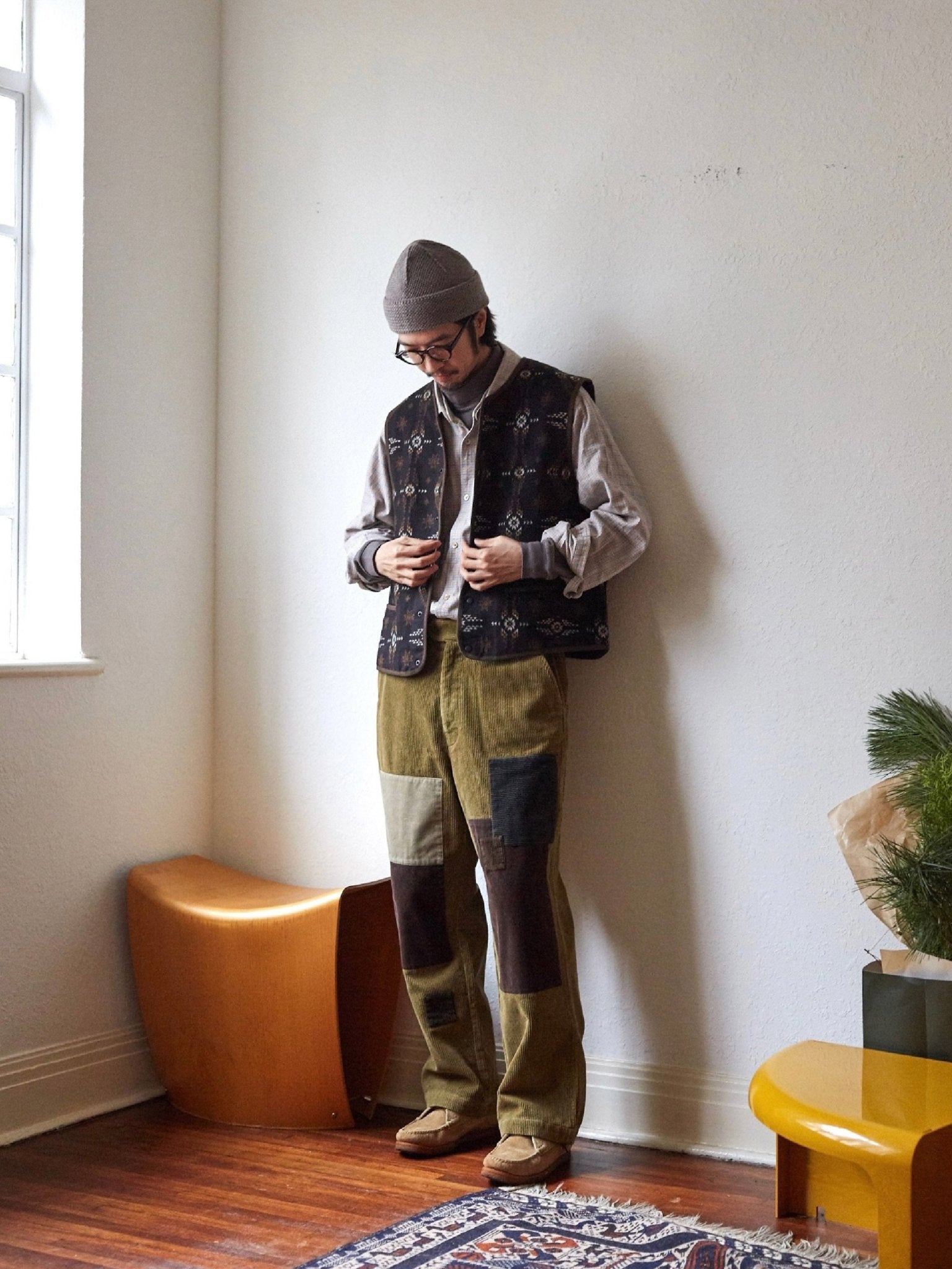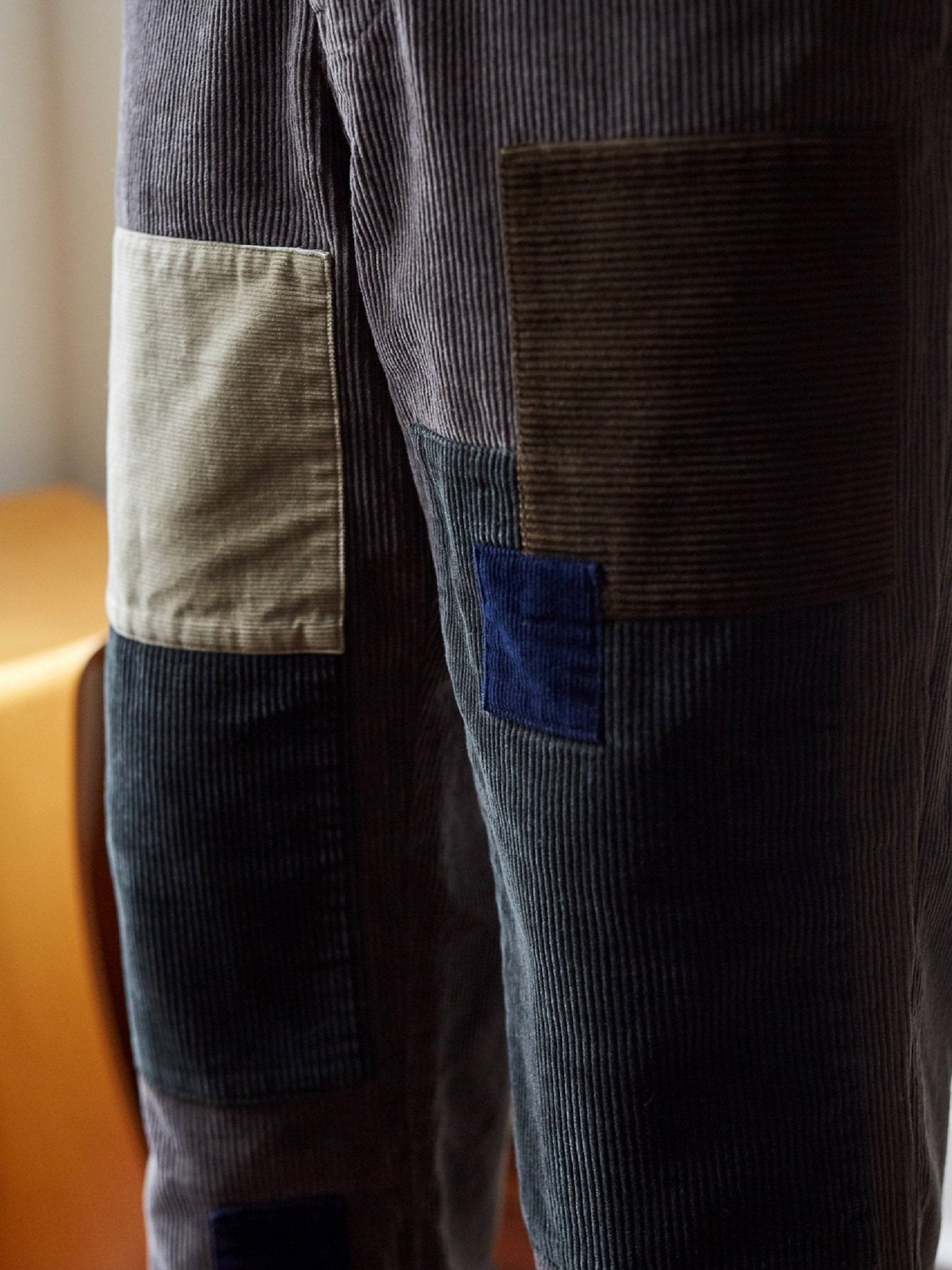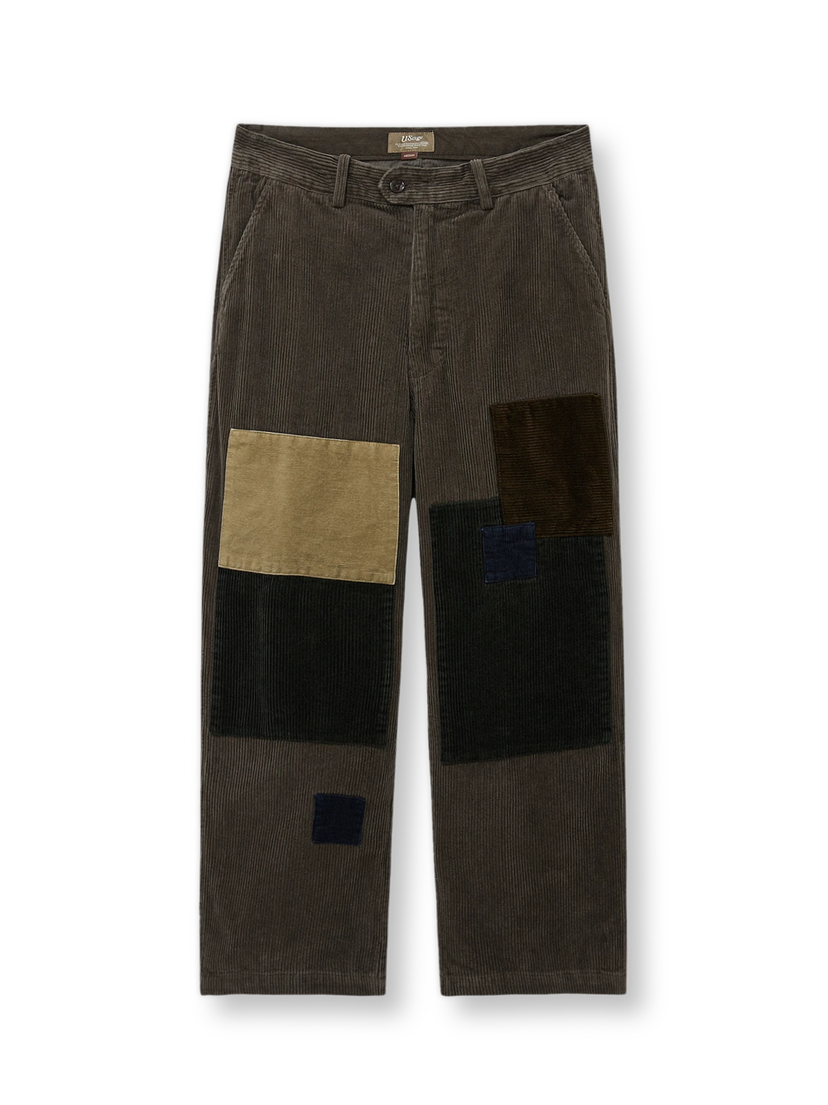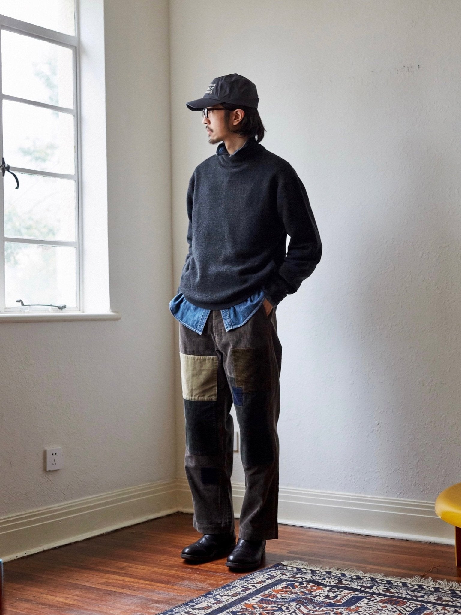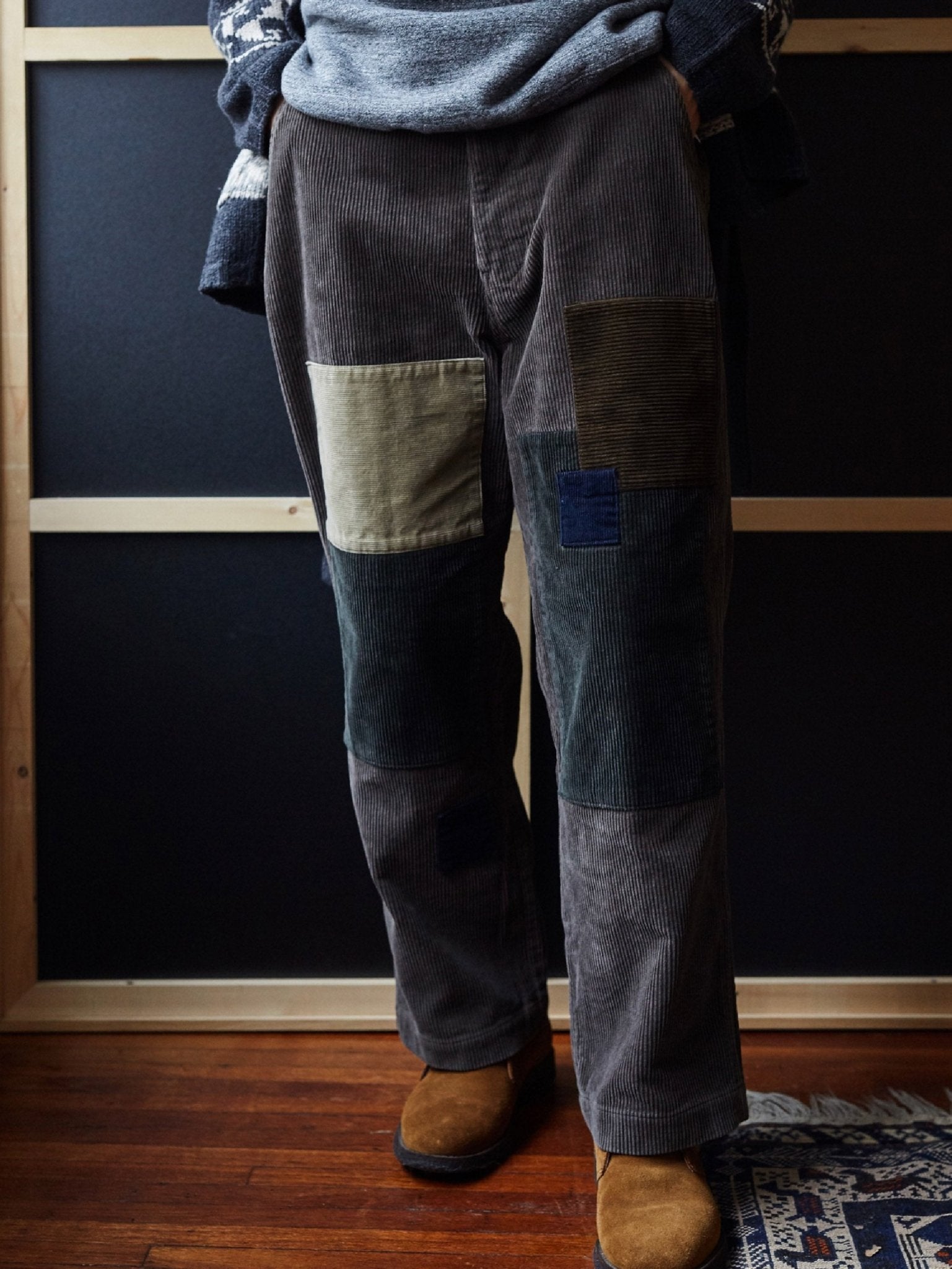 このパンツには、早期の作業服パンツのパッチ要素が取り入れられており、異なる色、サイズ、位置、およびコードバン生地の変化を組み合わせ、非対称のパッチワーク、重ね縫いなどの手法を使用して、独特なディテールを表現しています。また、カーキ色のデザインが古風なワークウェアのスタイルを演出しています。