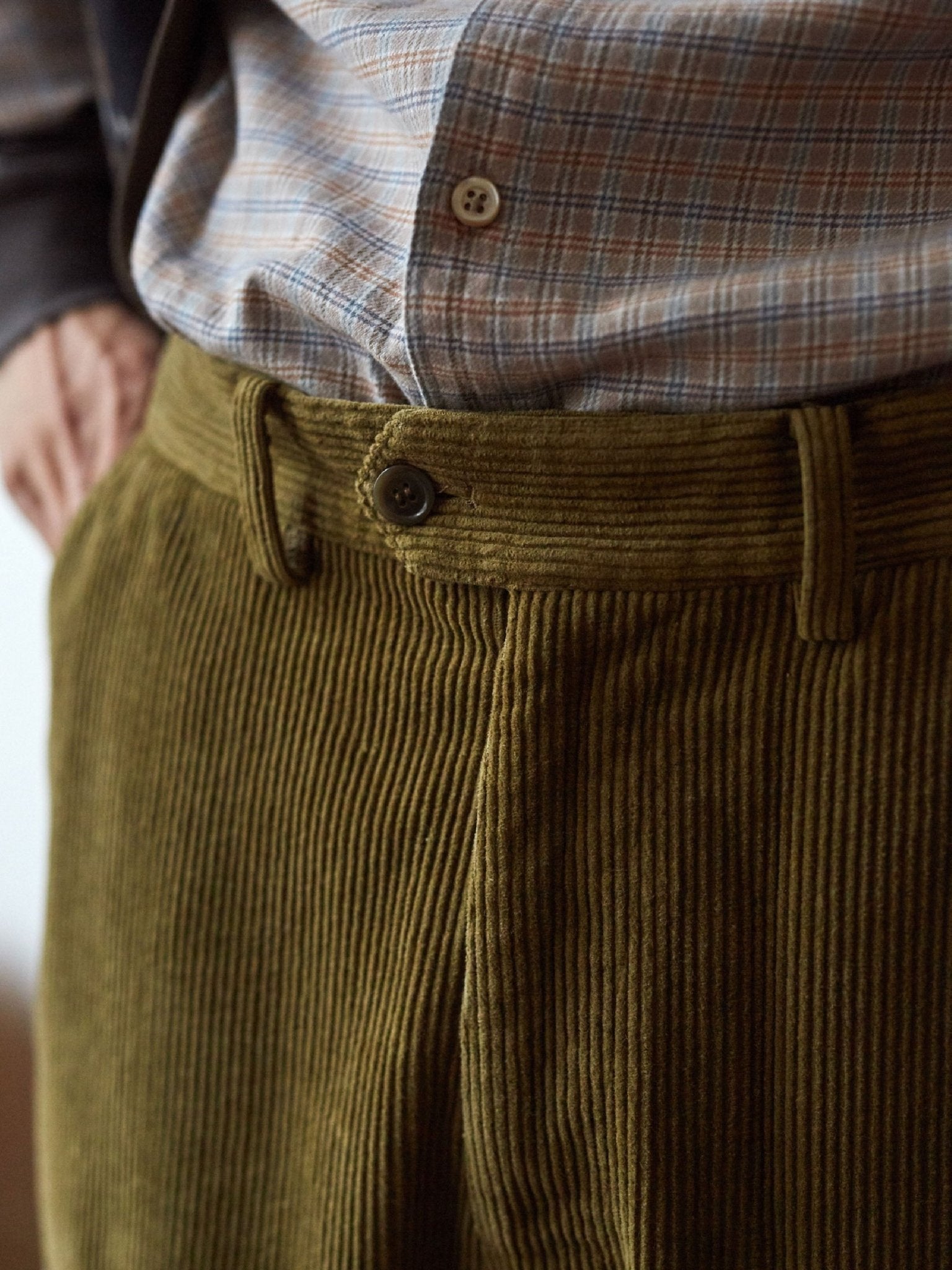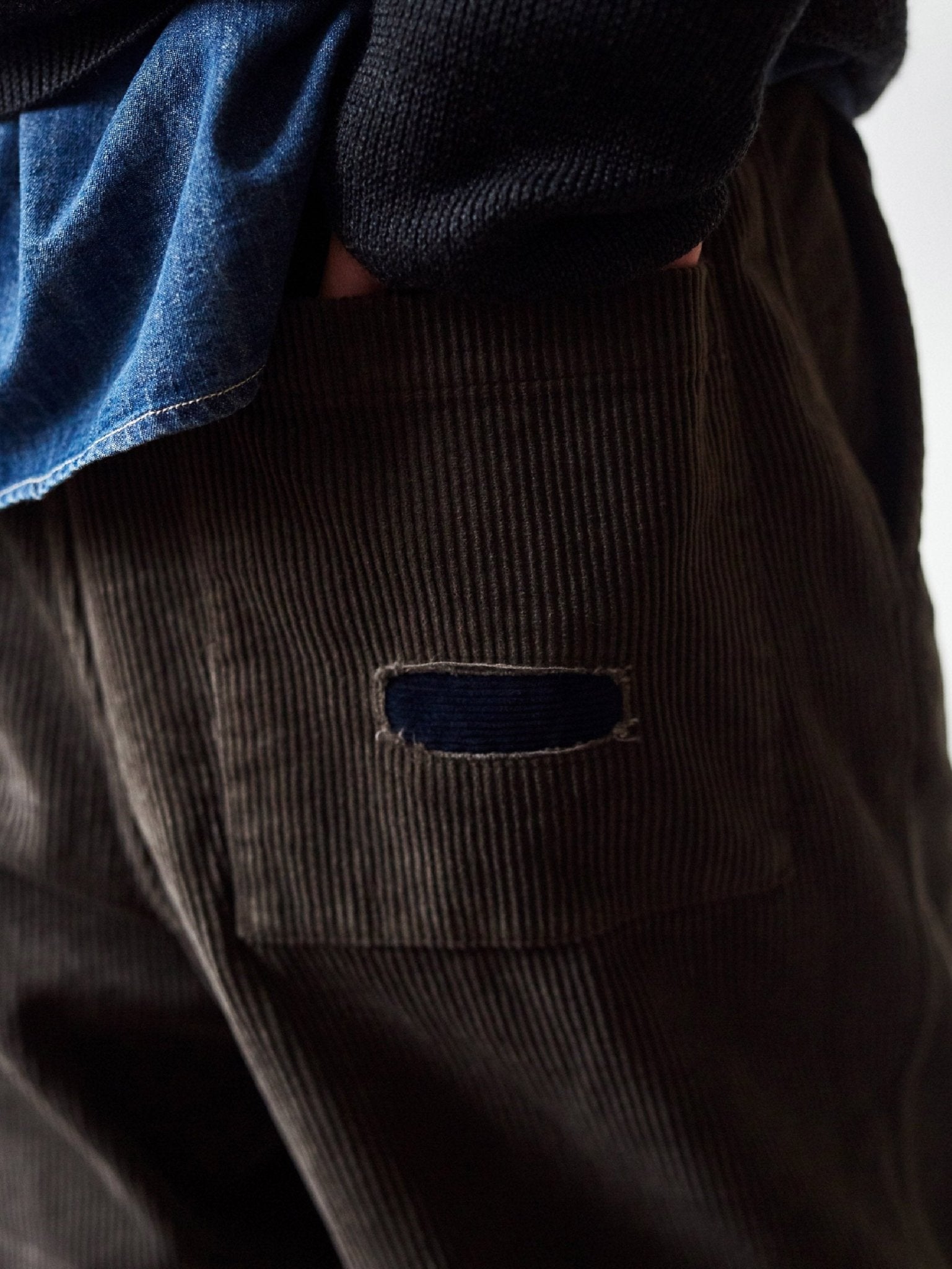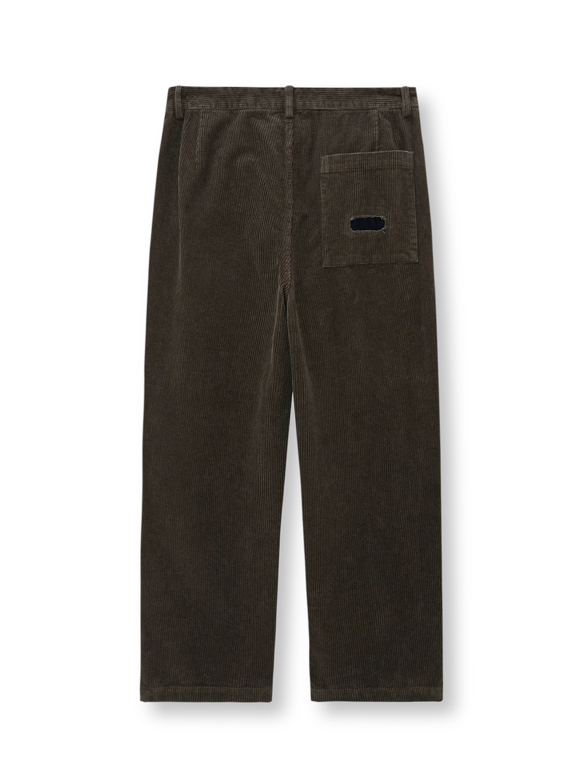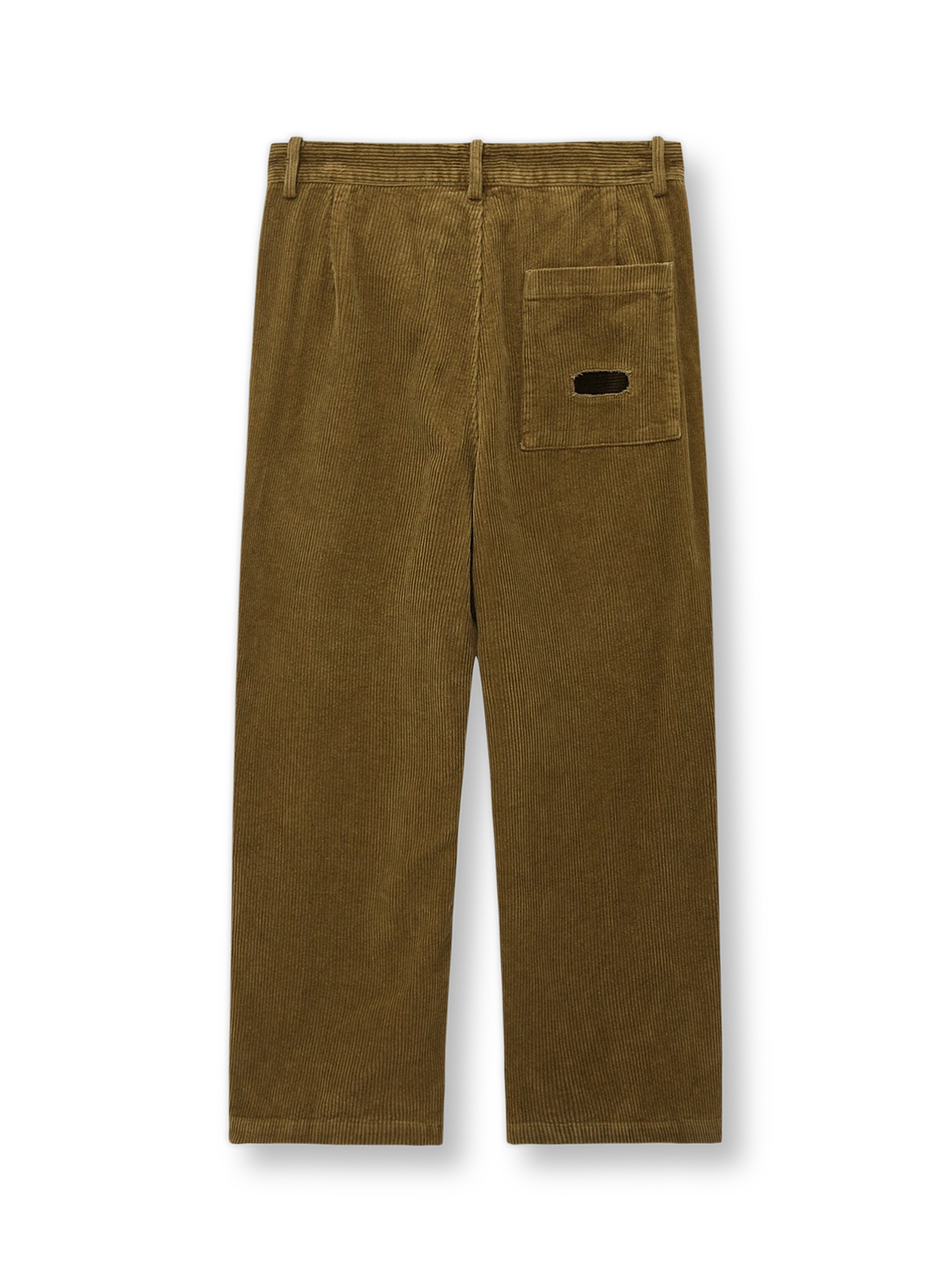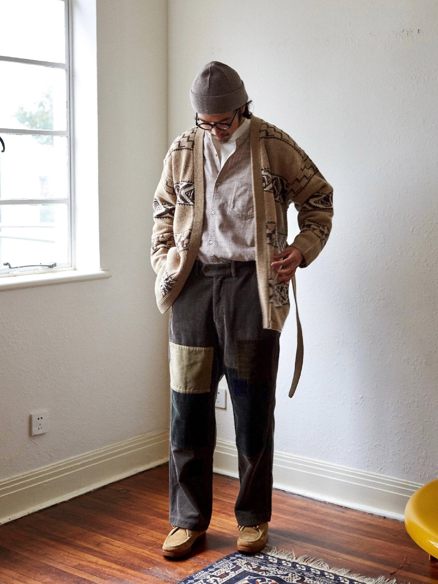 このパンツには、早期の作業服パンツのパッチ要素が取り入れられており、異なる色、サイズ、位置、およびコードバン生地の変化を組み合わせ、非対称のパッチワーク、重ね縫いなどの手法を使用して、独特なディテールを表現しています。また、カーキ色のデザインが古風なワークウェアのスタイルを演出しています。