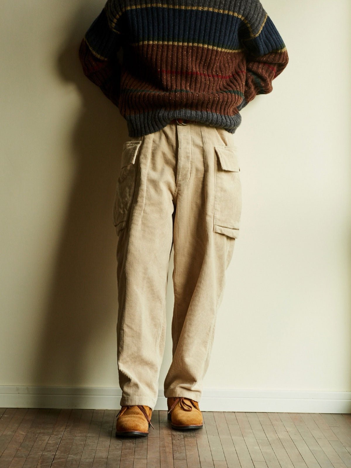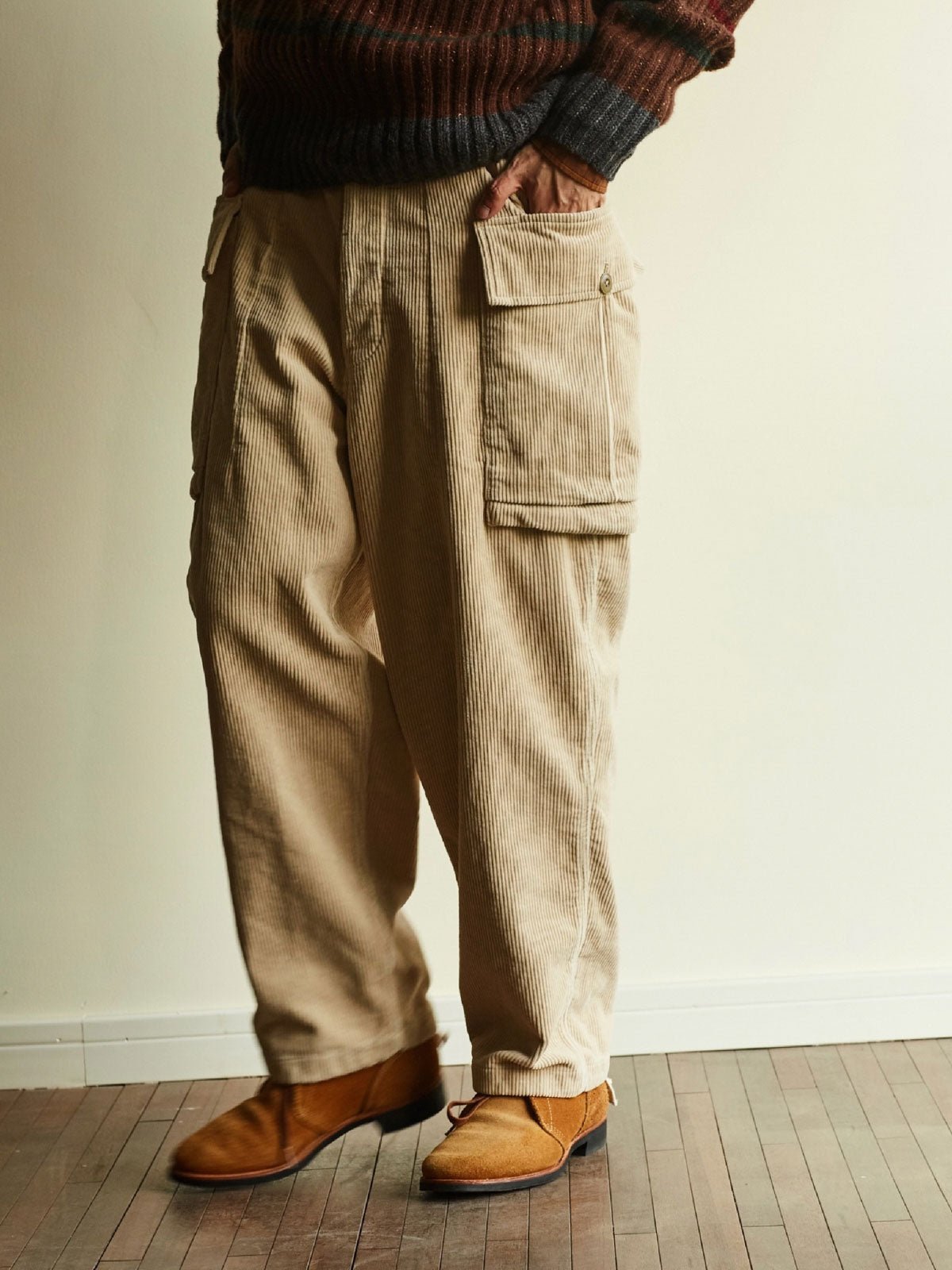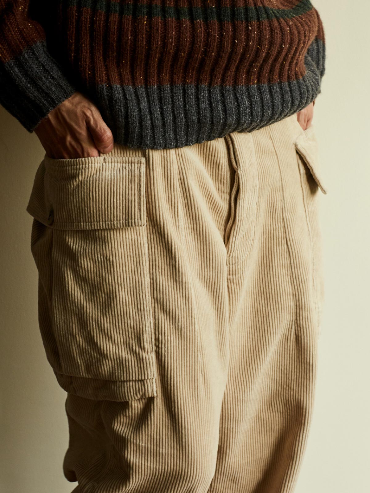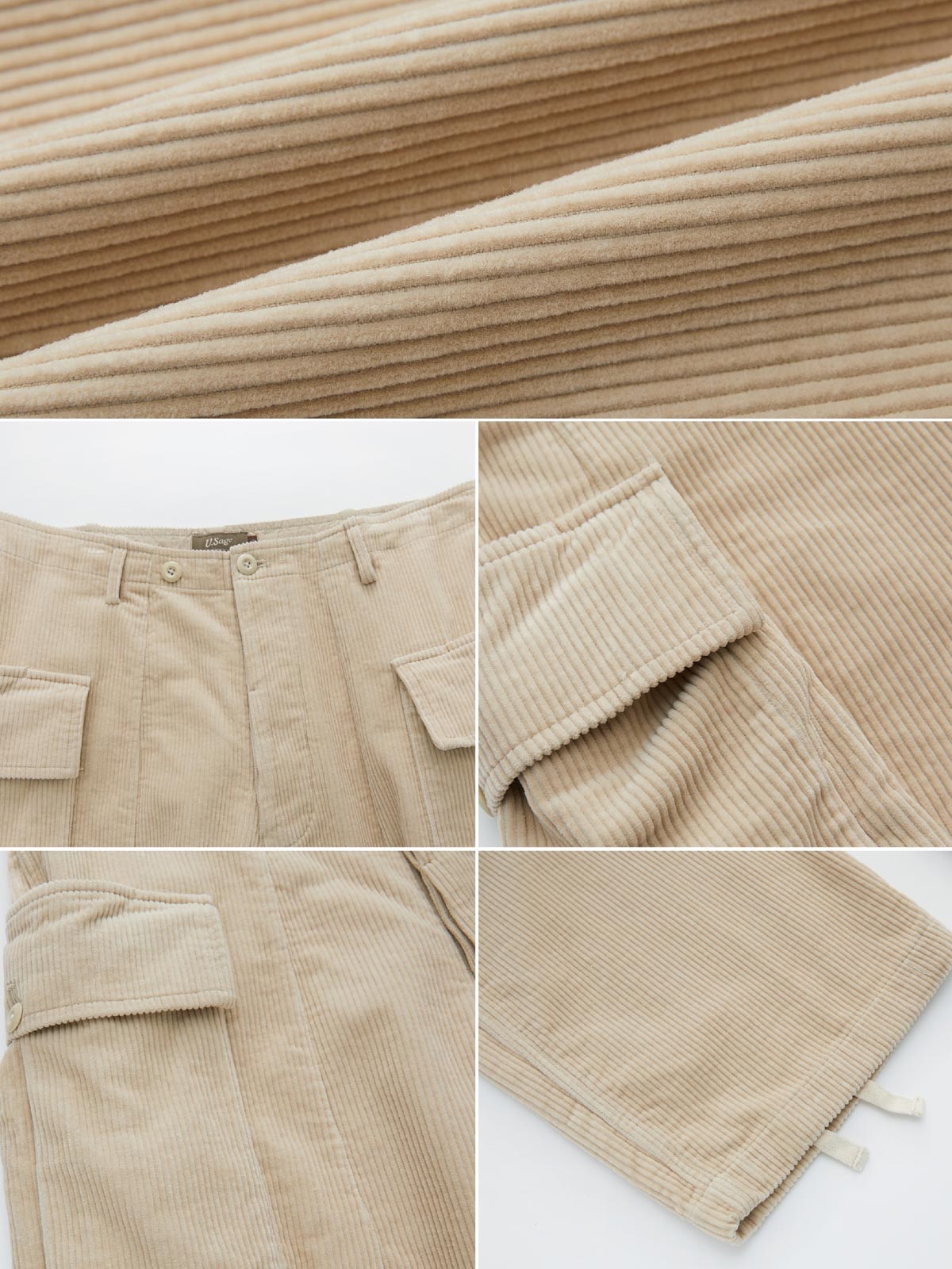 このコーデュロイパンツは、無地のTシャツやシャツ、カジュアルシューズやブーツと合わせることで、カジュアルでありながらディテールに魅力のある日常の装いを作ることができます。ベージュやブラウンのトーンは、元のミリタリーパンツの粗野さを和らげ、よりエレガントでソフトな外観を提供します。