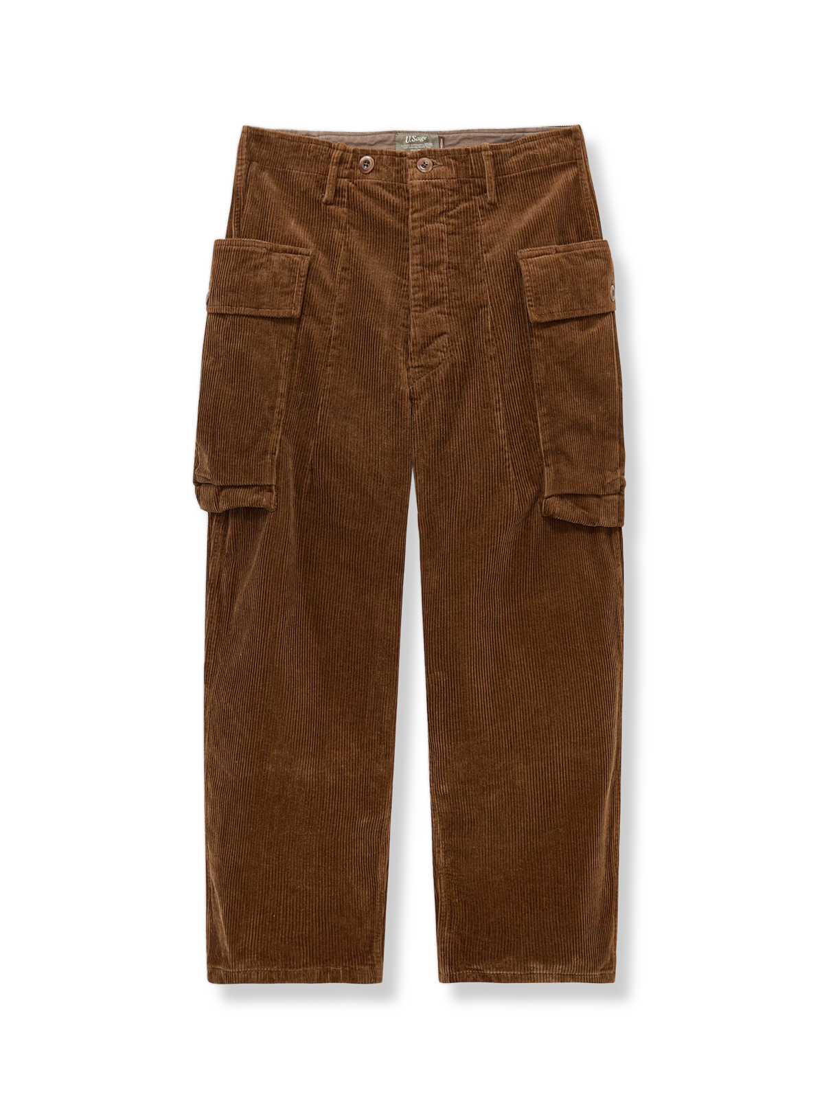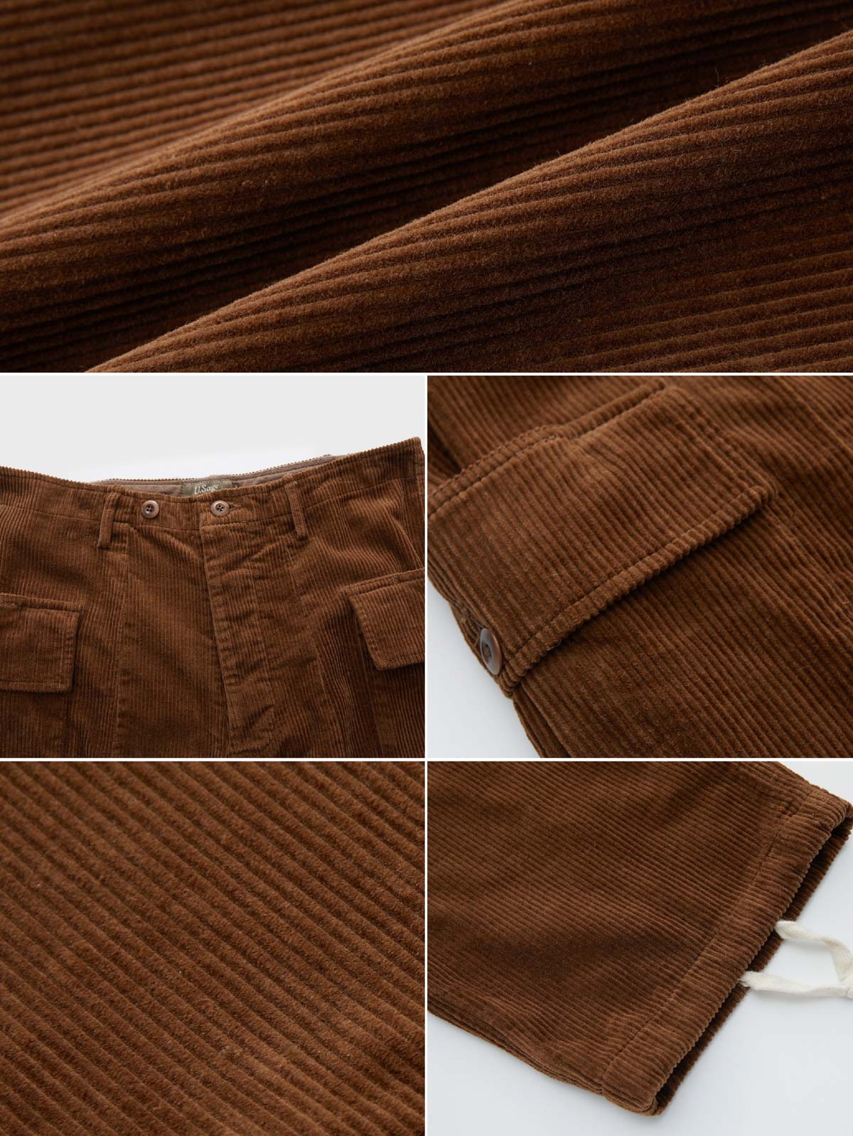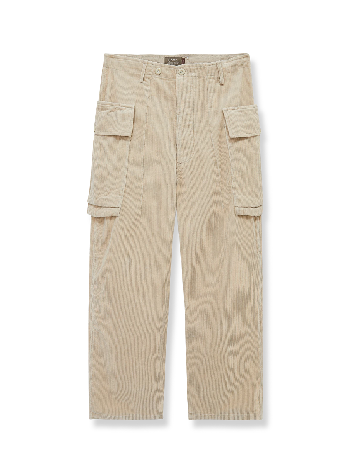 このコーデュロイパンツは、無地のTシャツやシャツ、カジュアルシューズやブーツと合わせることで、カジュアルでありながらディテールに魅力のある日常の装いを作ることができます。ベージュやブラウンのトーンは、元のミリタリーパンツの粗野さを和らげ、よりエレガントでソフトな外観を提供します。
