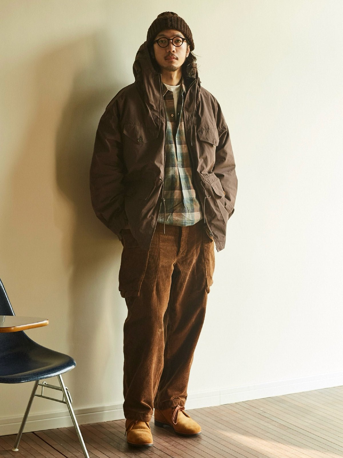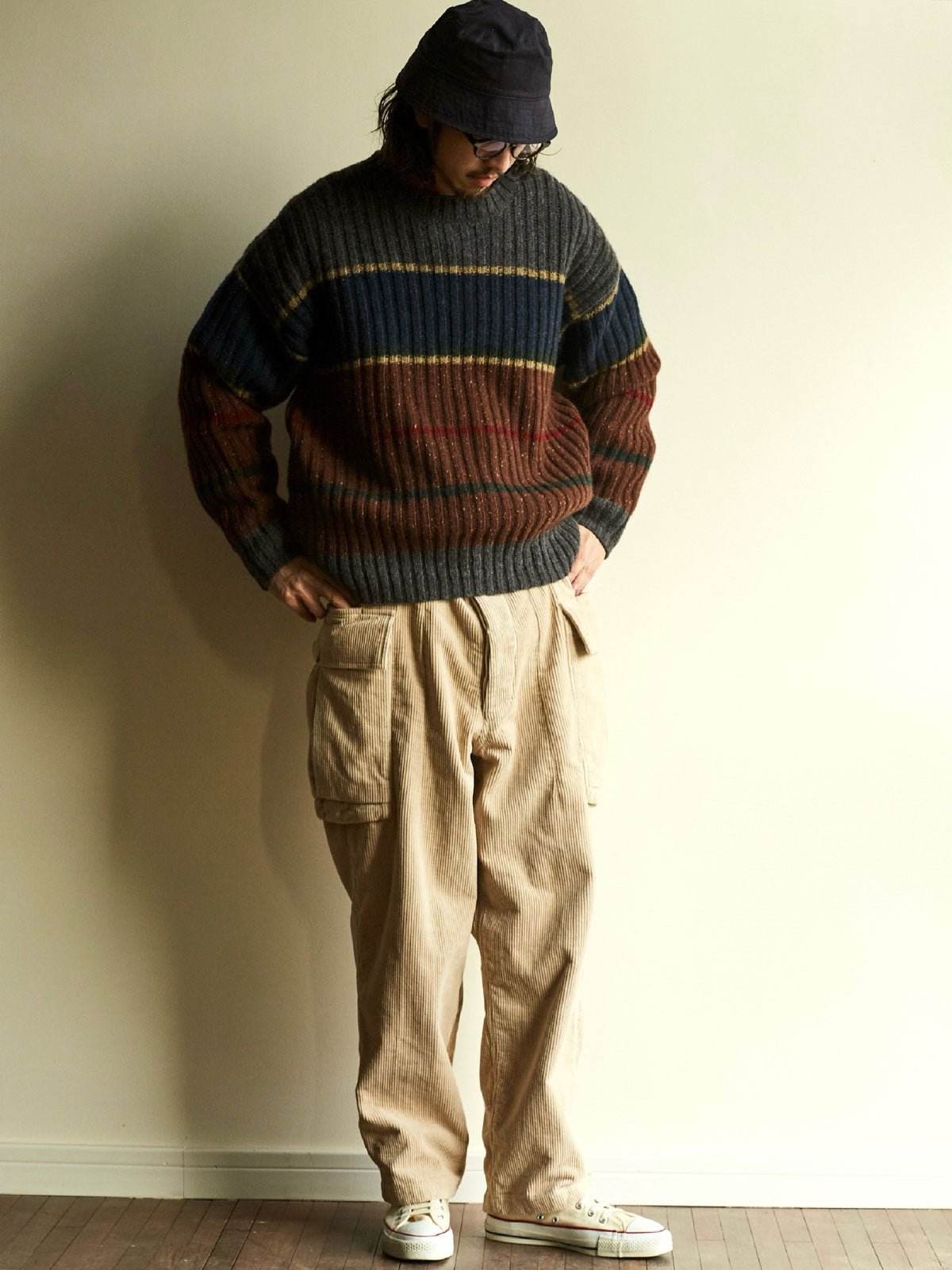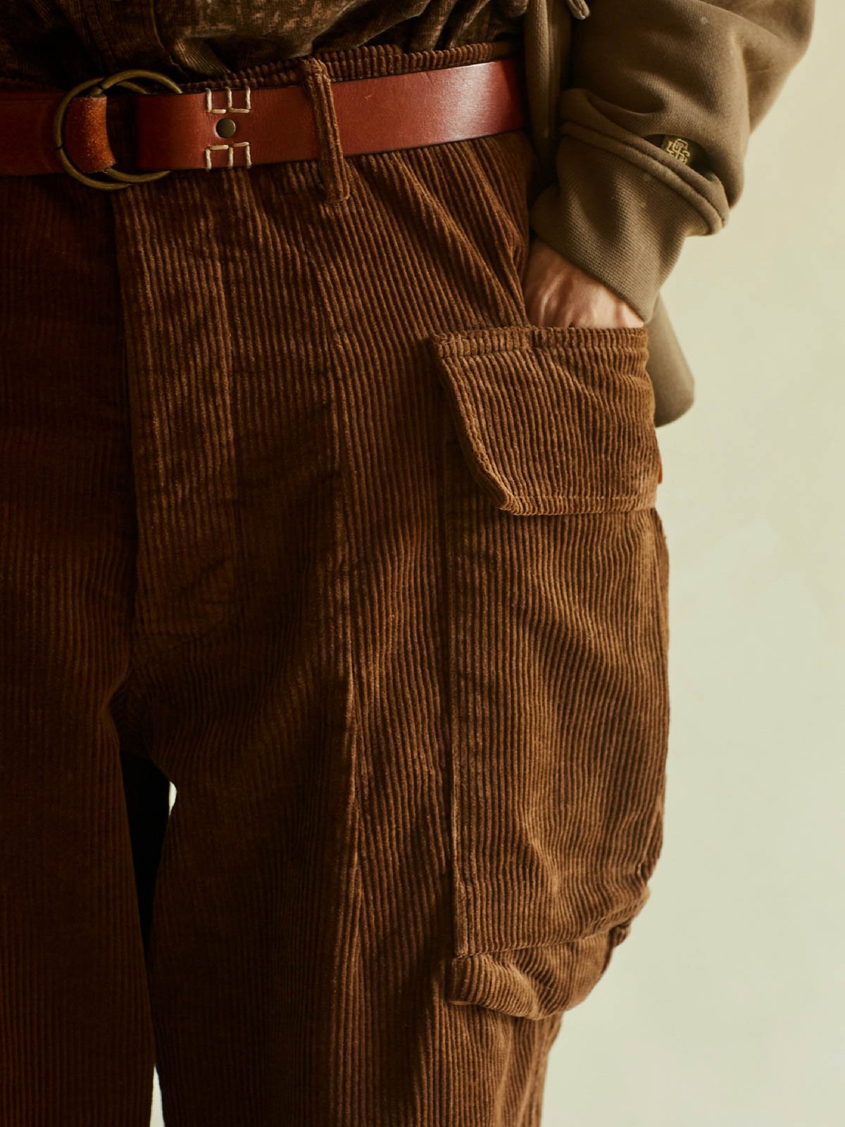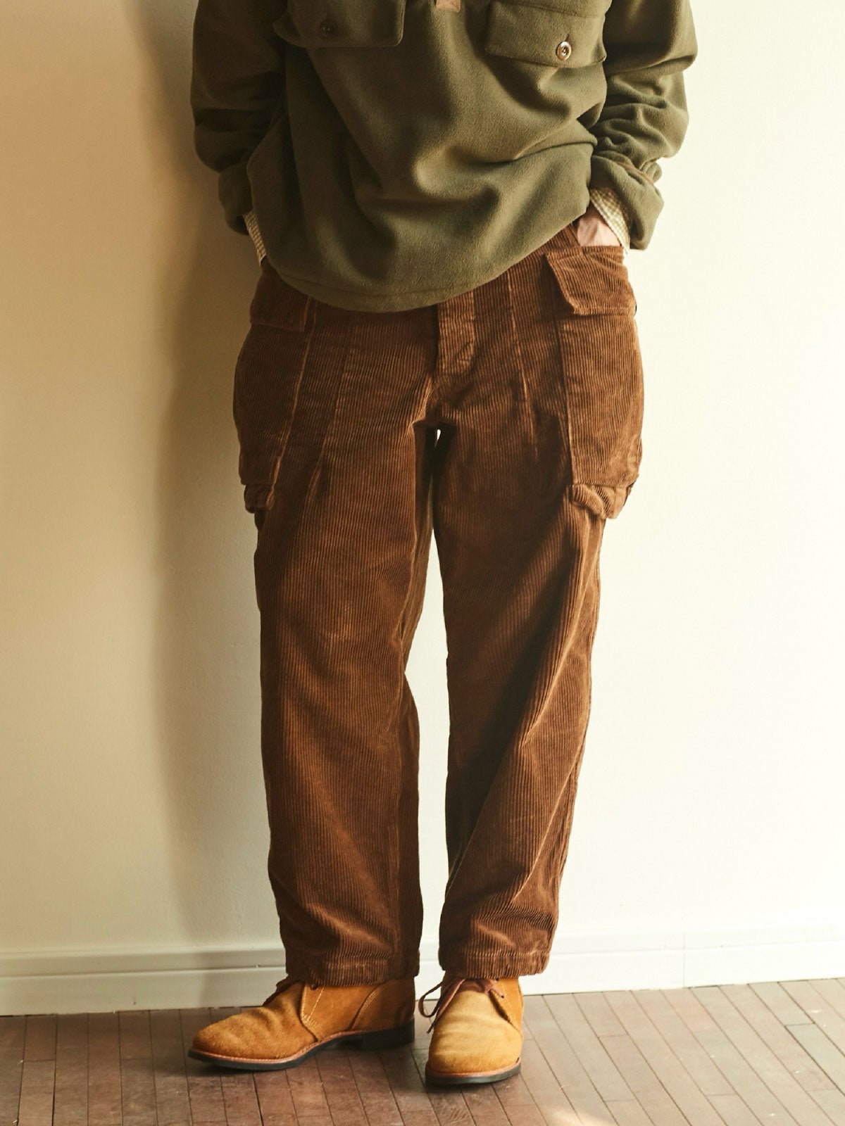 このコーデュロイパンツは、無地のTシャツやシャツ、カジュアルシューズやブーツと合わせることで、カジュアルでありながらディテールに魅力のある日常の装いを作ることができます。ベージュやブラウンのトーンは、元のミリタリーパンツの粗野さを和らげ、よりエレガントでソフトな外観を提供します。
