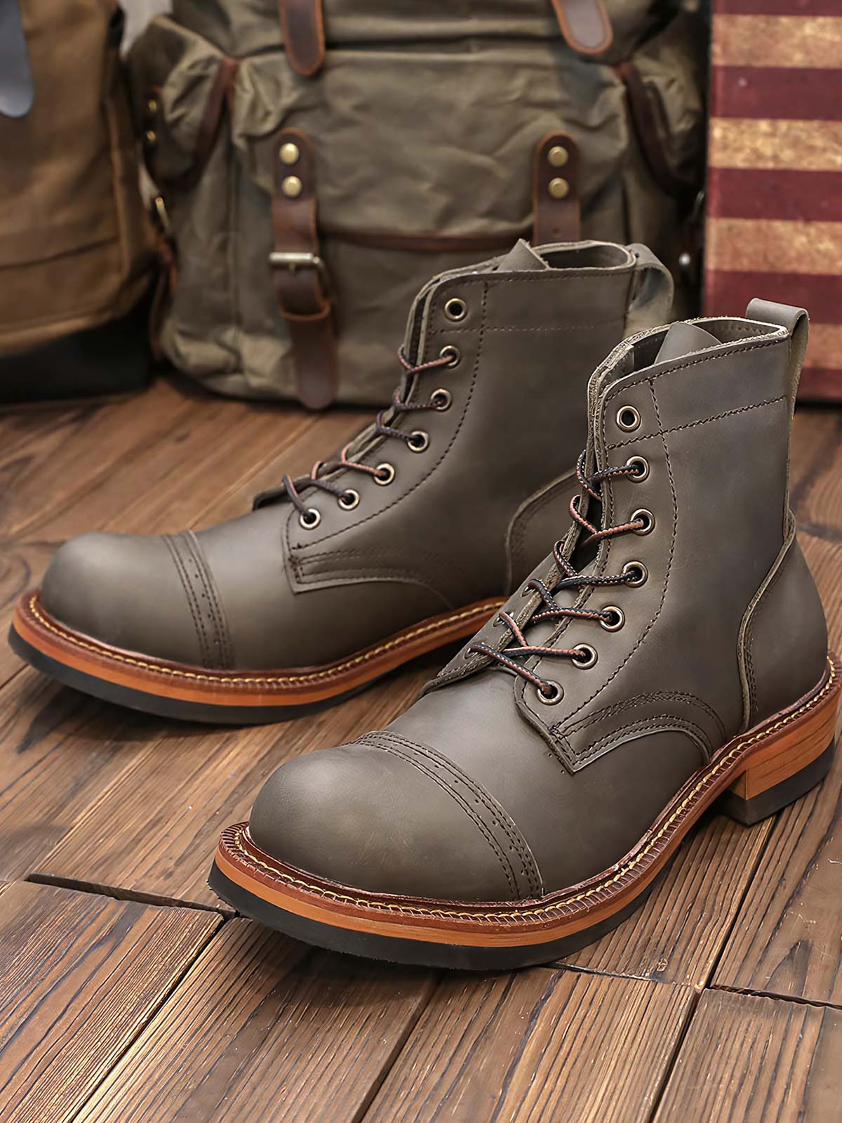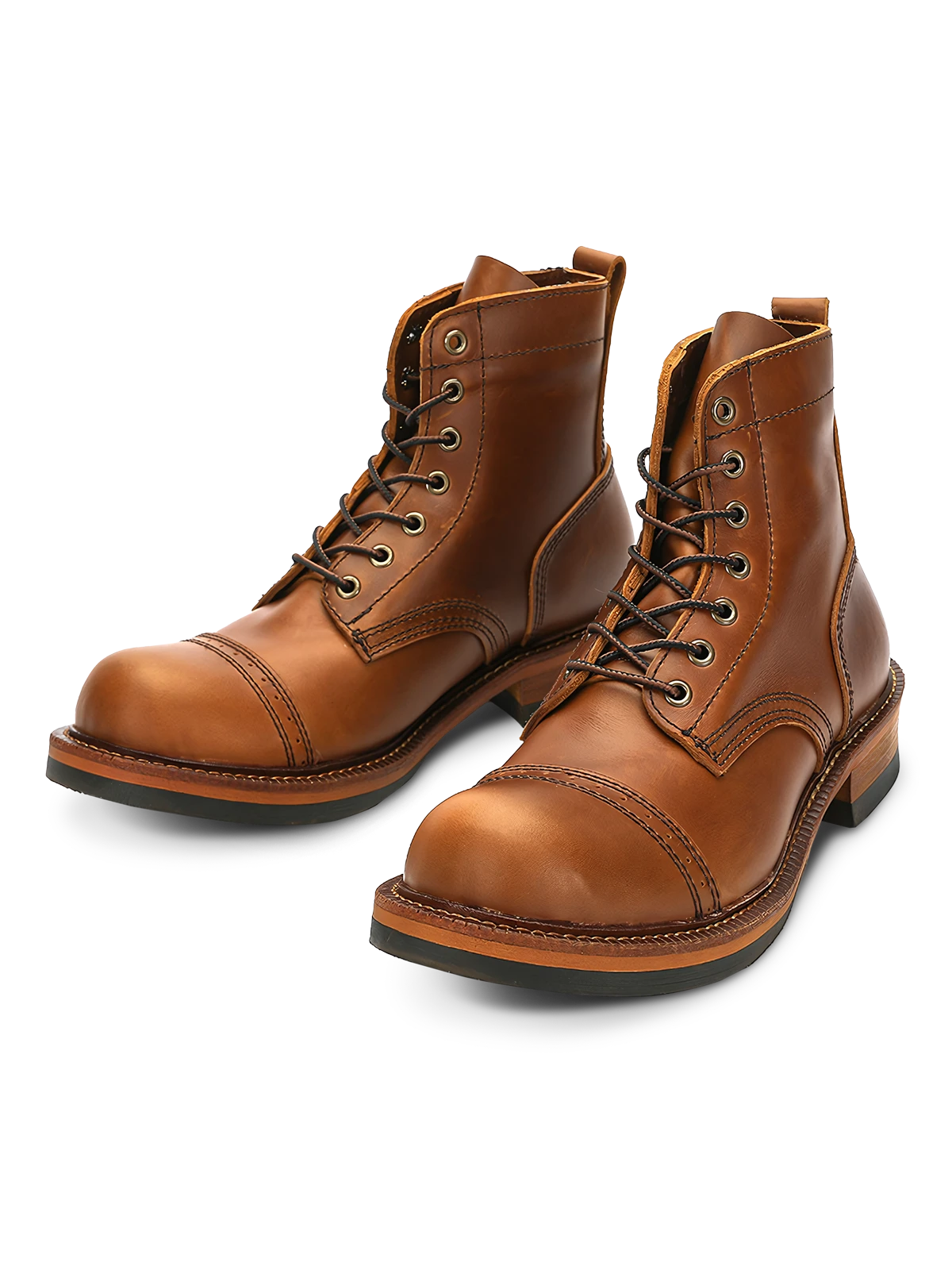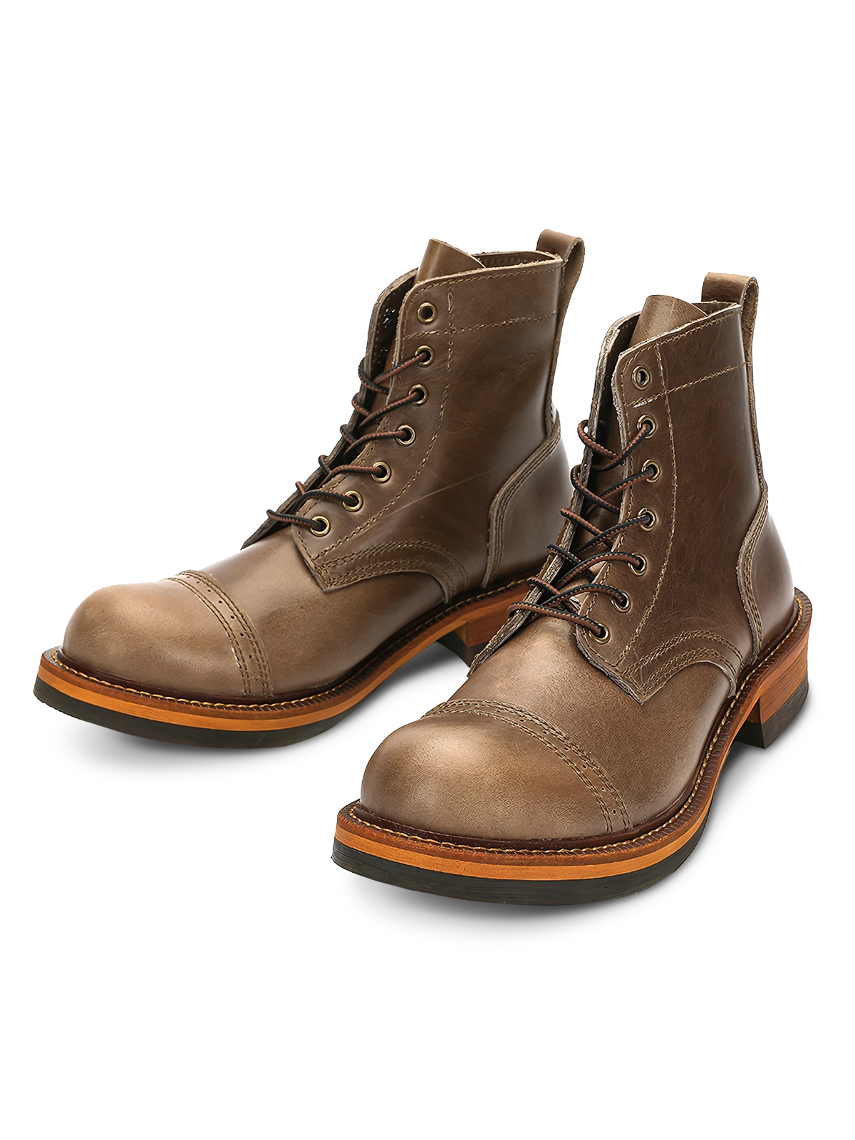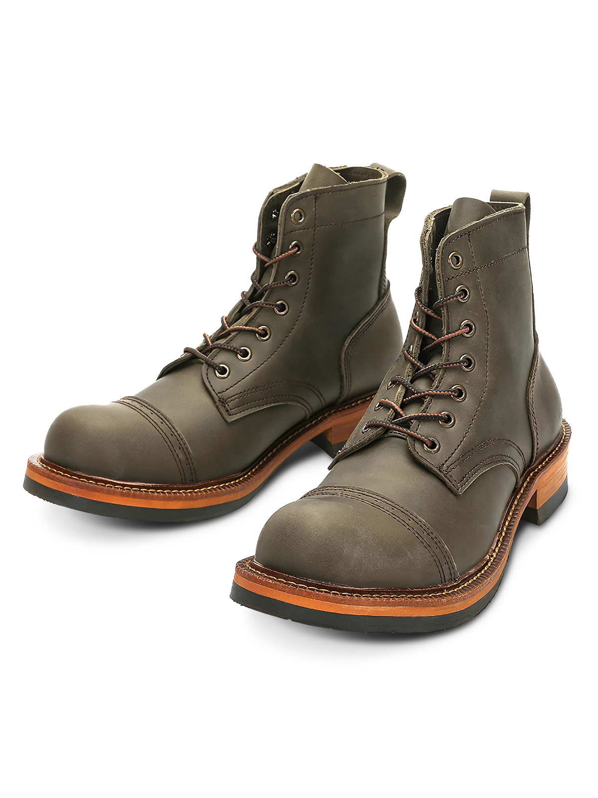 このハイカットレザーブーツは、実用性を基本とした伝統的なワークブーツのスタイルを採用しています。労働者階級の実用的な履物としての起源を持ち、耐久性と快適さを重視して設計されており、トップレイヤーの牛革は耐摩耗性に優れ、経年変化で独特の風合いを増していきます。