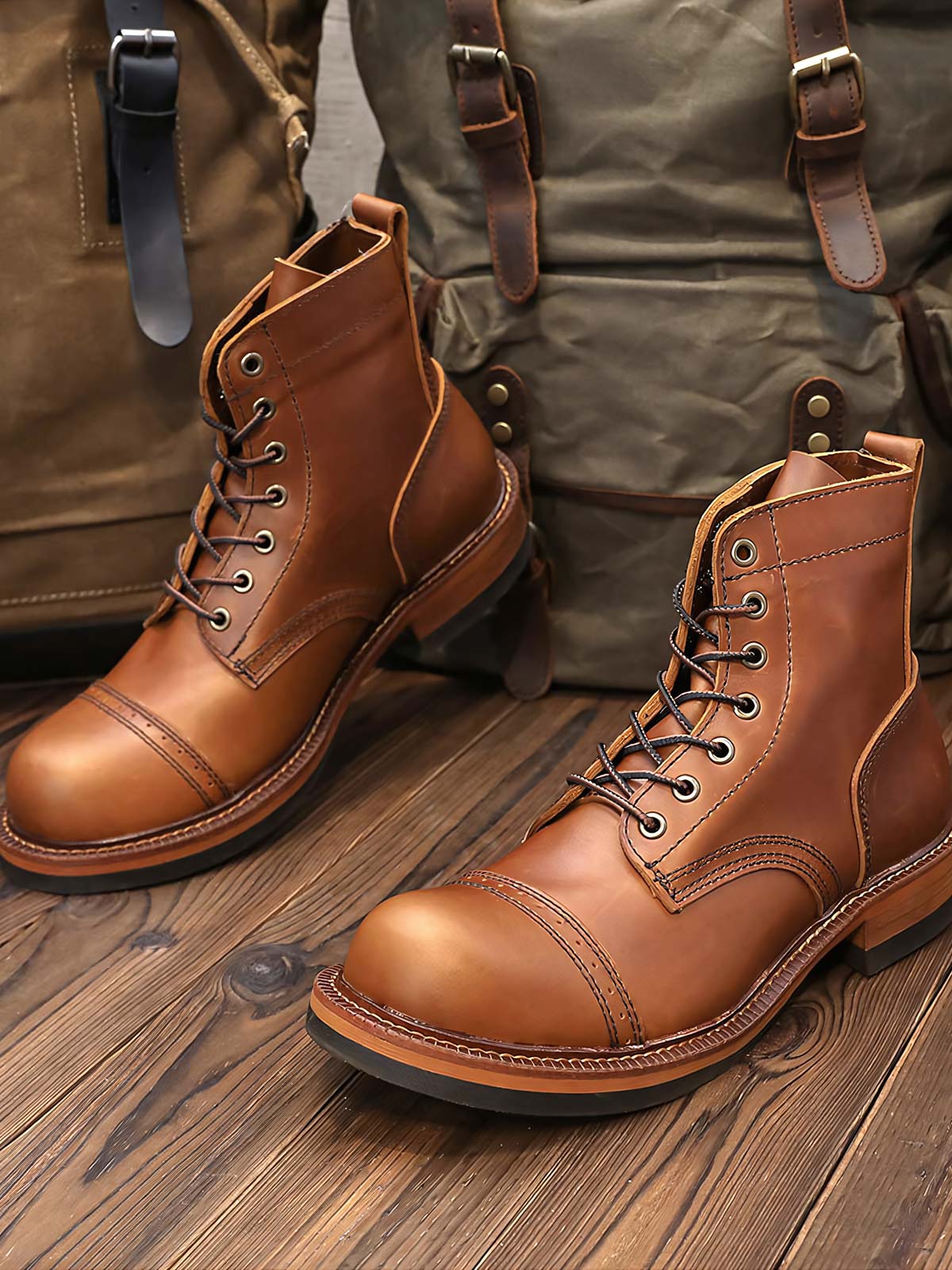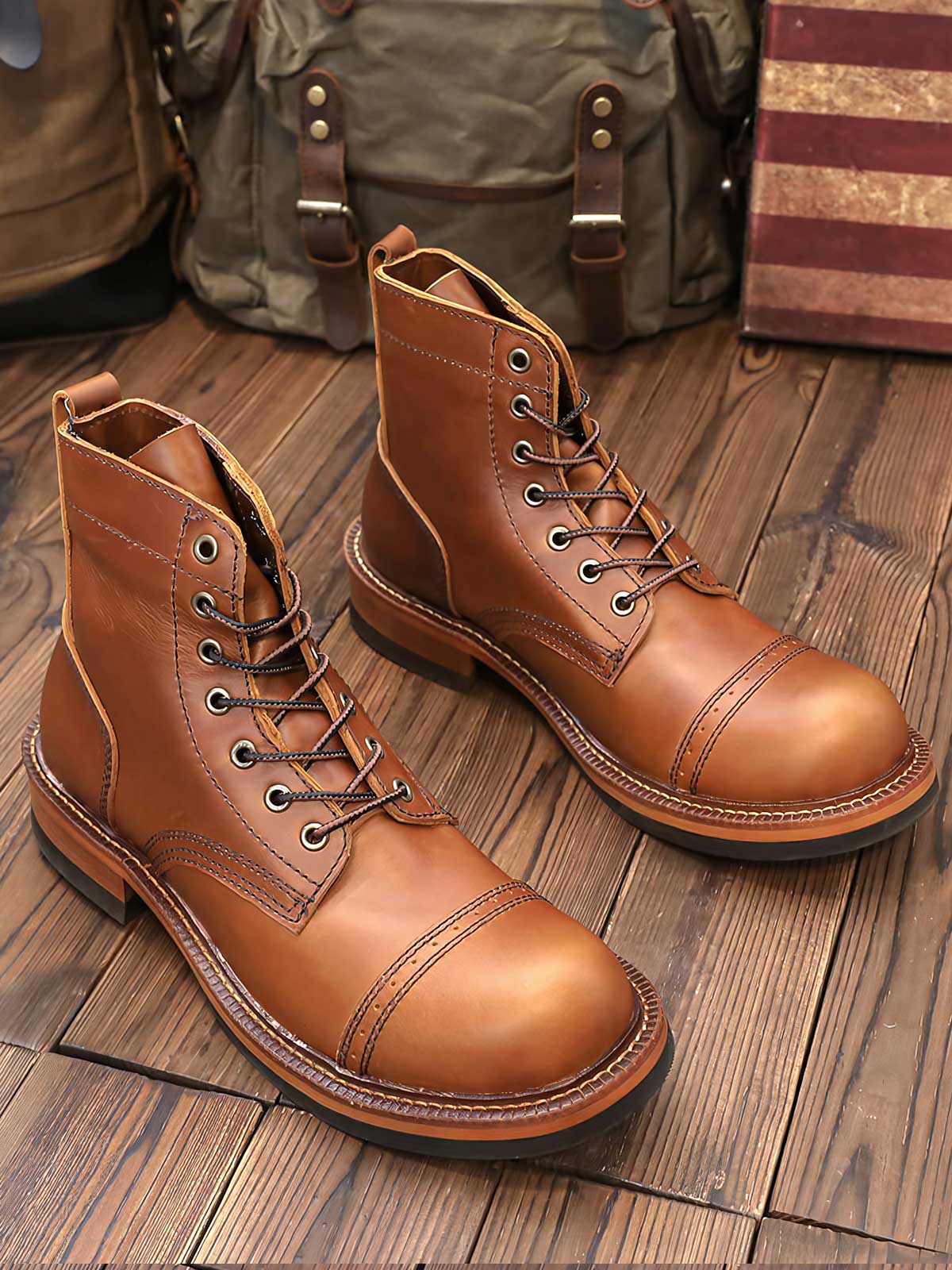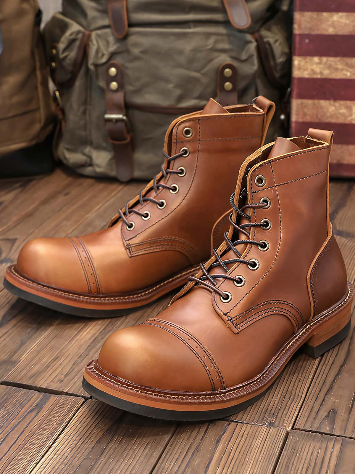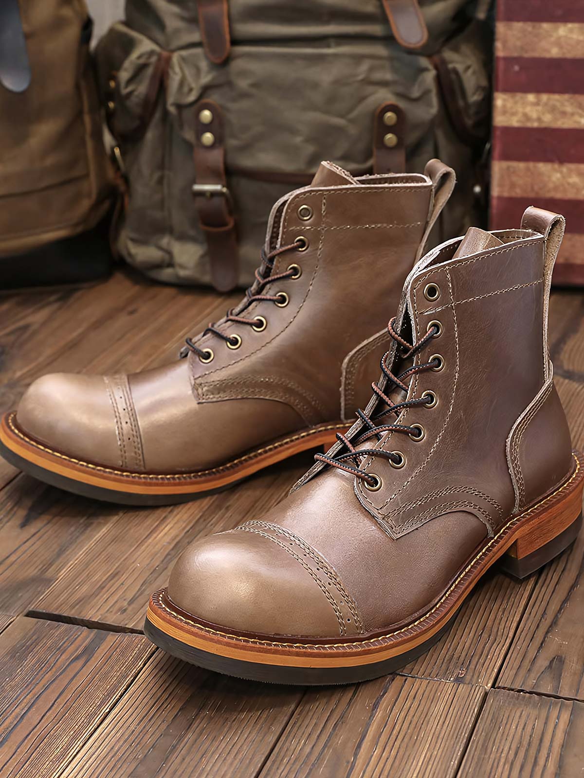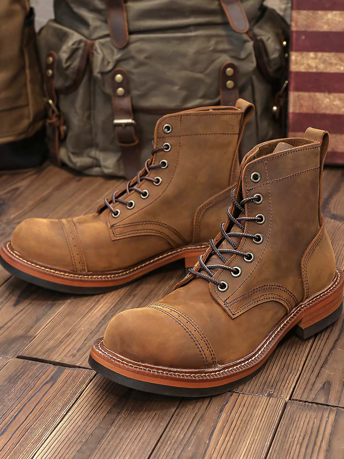このハイカットレザーブーツは、実用性を基本とした伝統的なワークブーツのスタイルを採用しています。労働者階級の実用的な履物としての起源を持ち、耐久性と快適さを重視して設計されており、トップレイヤーの牛革は耐摩耗性に優れ、経年変化で独特の風合いを増していきます。