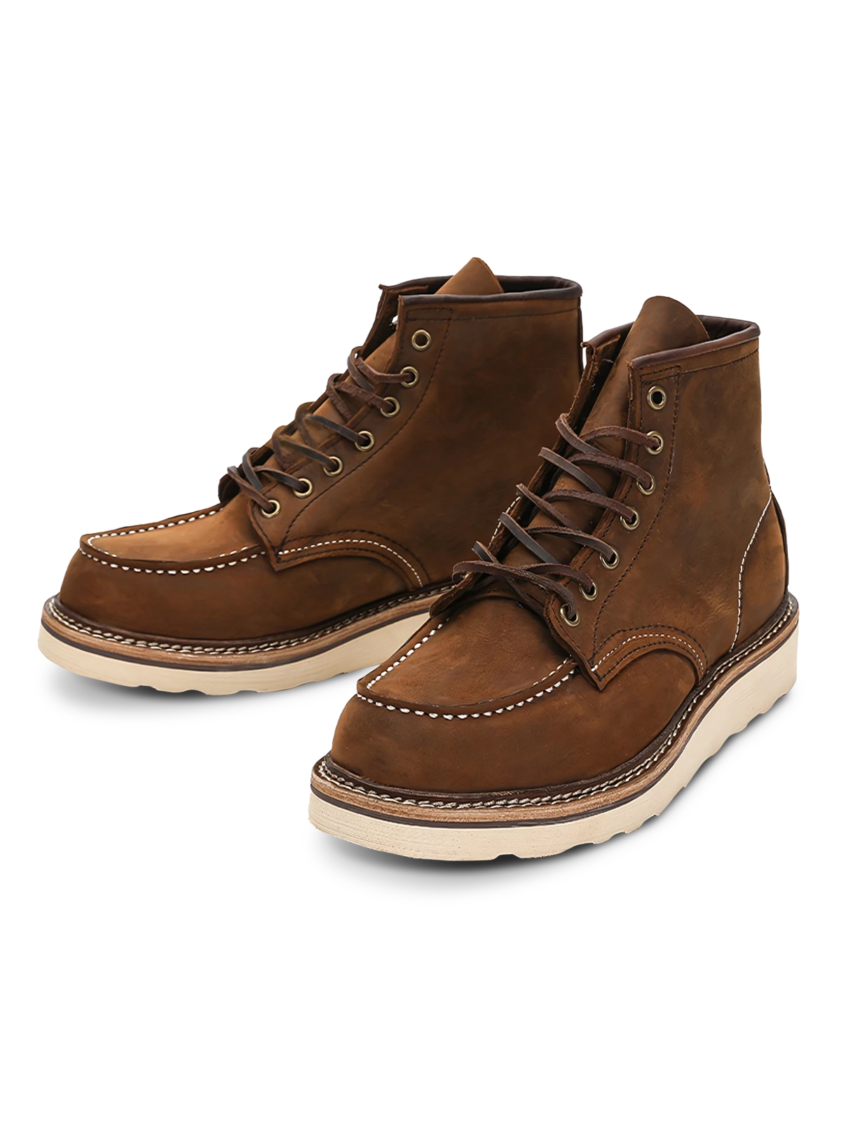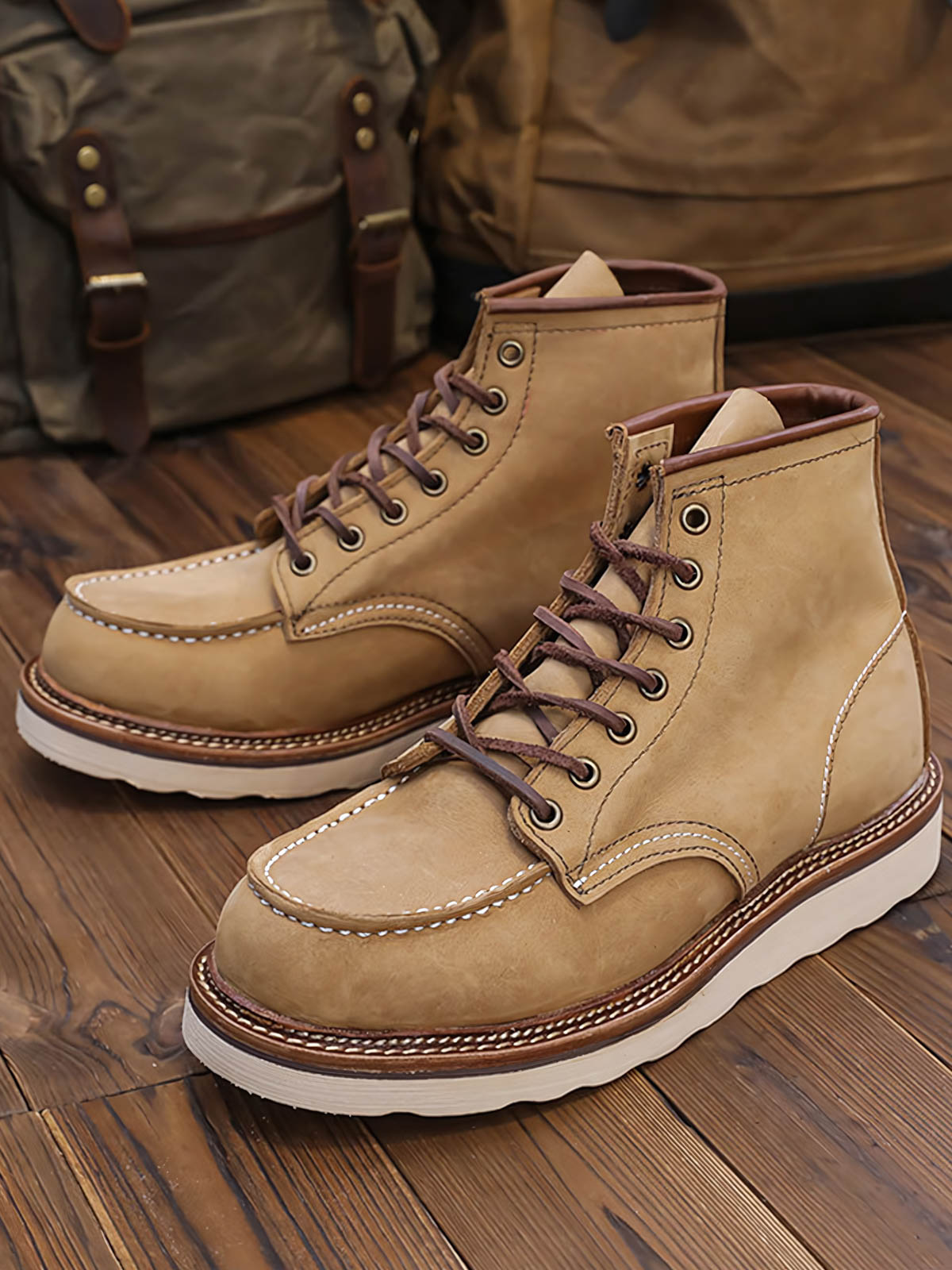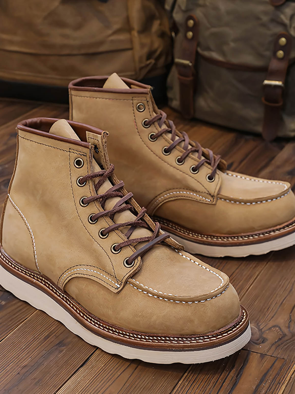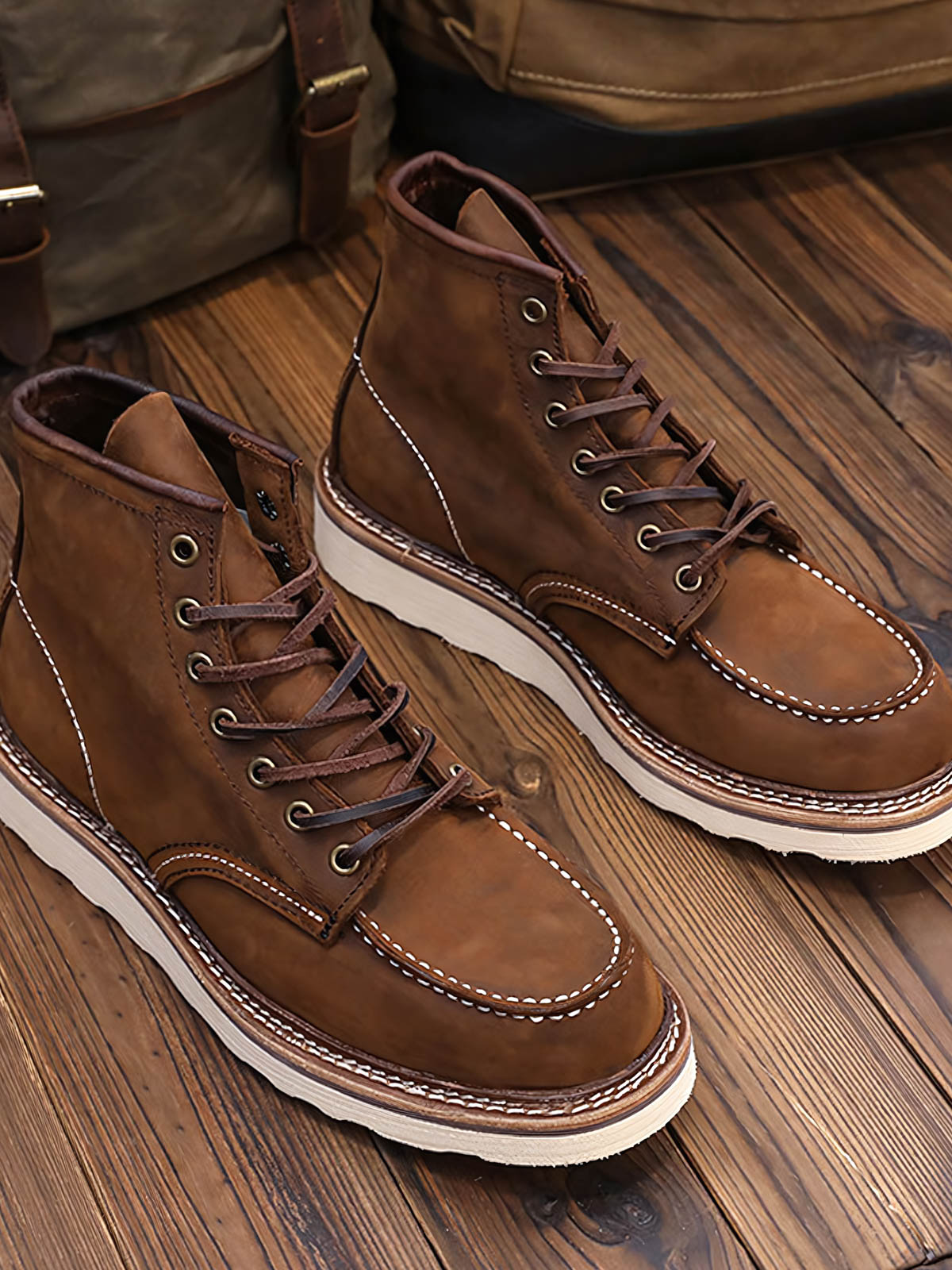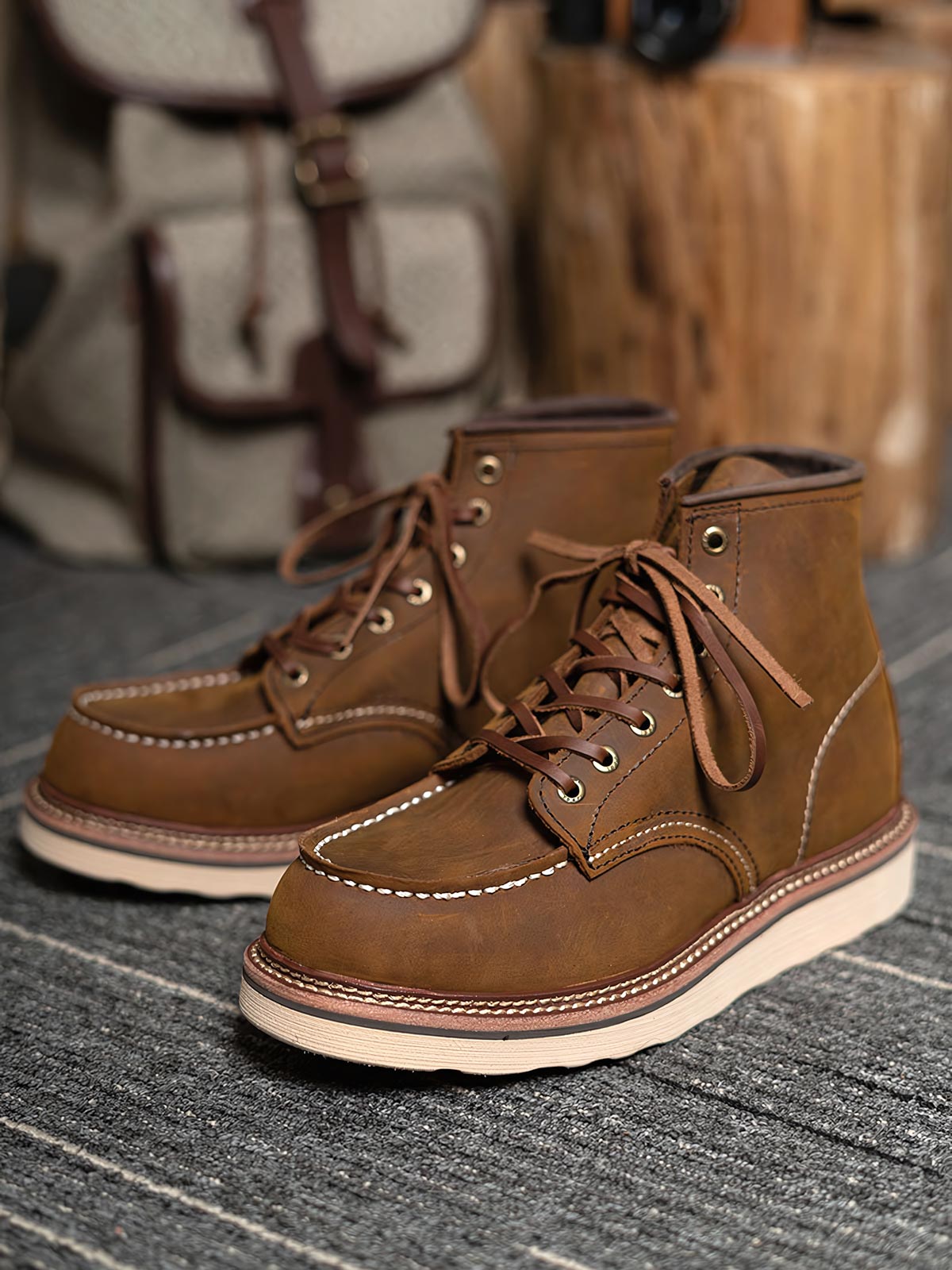 1907年のハンティングダックブーツは、一流の牛革を厳選し、精巧なカットと縫製が施されています。この革は、耐久性に優れ、着用者の歩行習慣に応じて徐々に独自のしわや色合いが現れます。深い色調の靴面に対する白いステッチは、ディテールの美しさを引き立てます。荒々しい外観と精巧な手作業による縫製技術が相まって、職人精神を表現しています。このブーツは、デニムやカジュアルパンツとの相性が良く、パンツの裾をブーツの中に入れても外に出しても、自由奔放なアメリカンカジュアルスタイルを演出できます。