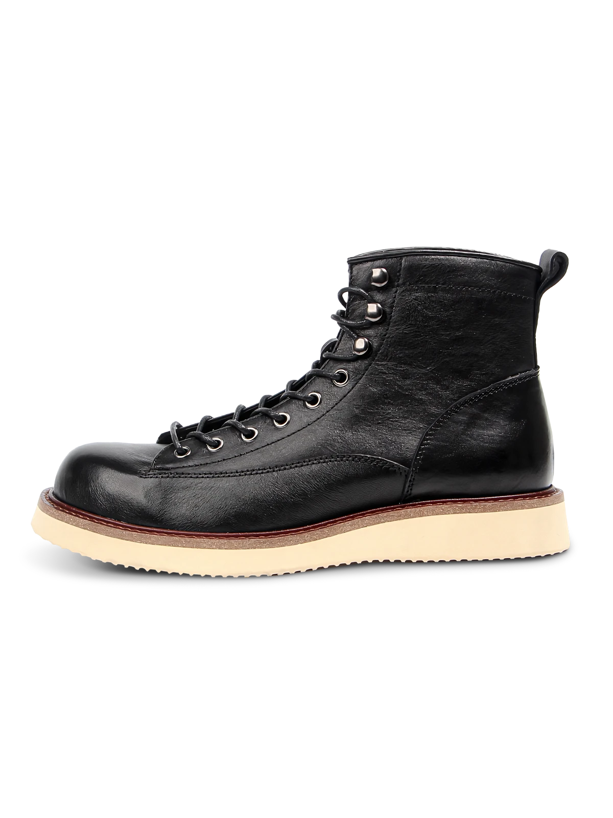 このハイカット登山ブーツは、伝統的な登山靴のデザインを取り入れています。ブーツのハイカットデザインは優れた足首のサポートを提供し、さまざまなアウトドア活動に適しています。使用されている高品質のレザーは時間とともにパーソナライズされた跡が現れ、堅牢な構造のソールは長期間の耐久性を保証します。